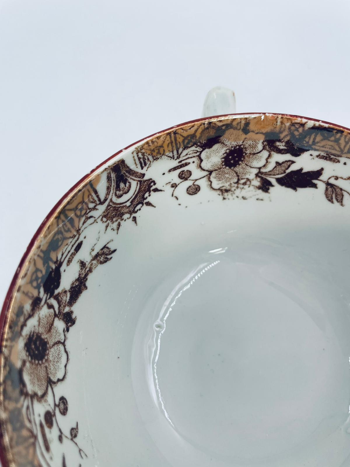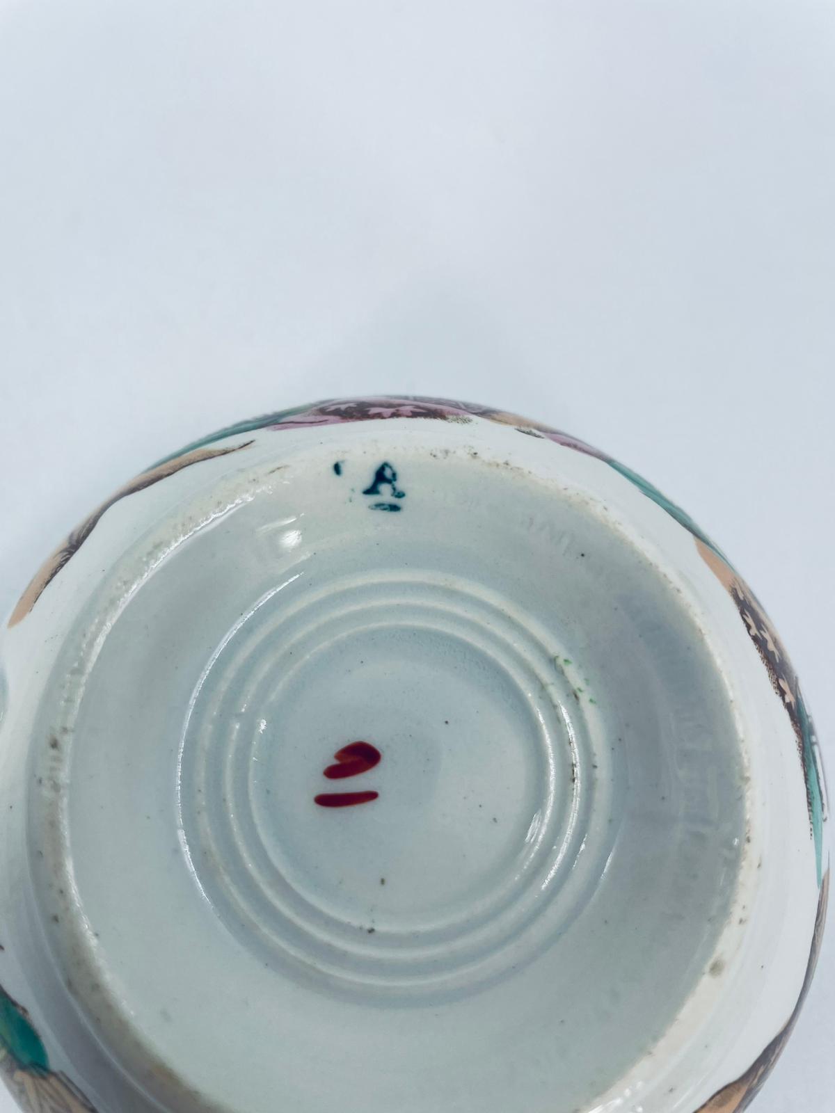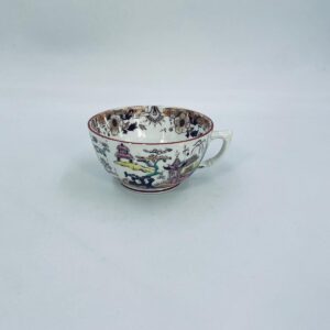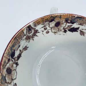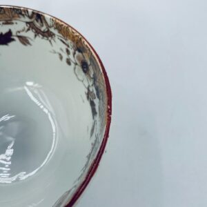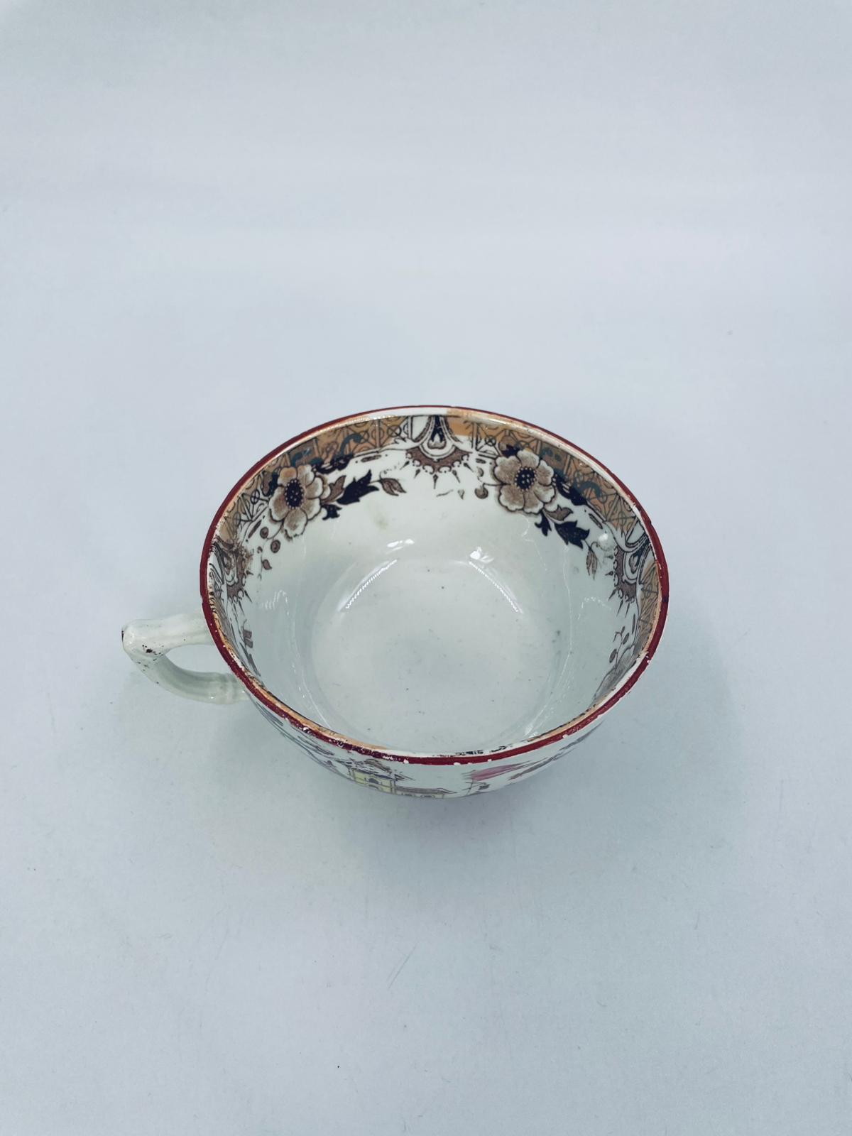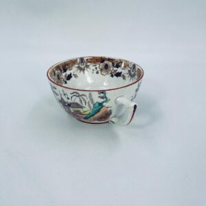 Filiżanka kolekcjonerska, antyczna, francuskiej wytwórni Opaque de Sarreguemines która została założona w 1790r, a filiżanka tego typu datuje się na przełom XIX i XX w. Filiżanka dekorowana ręcznie kolorowa kalkomanią w stylu orientalnym, wykończona na rantach kolorem bordowym. Posiada przetarcia, przebarwienia.