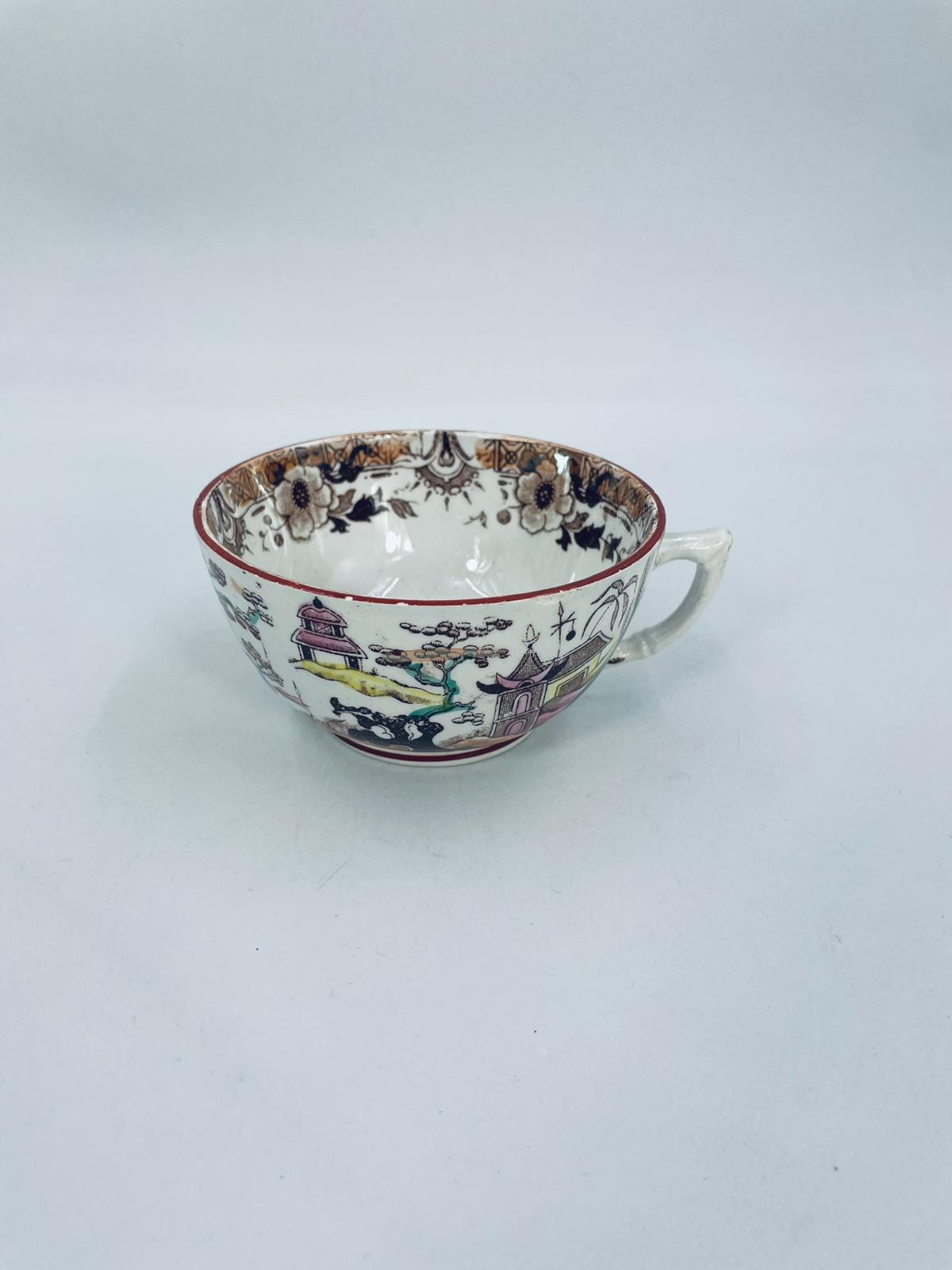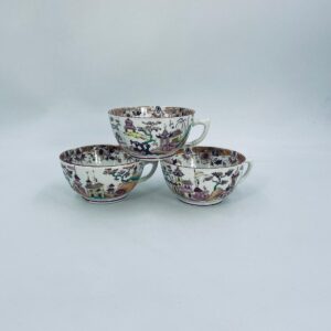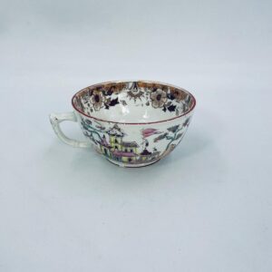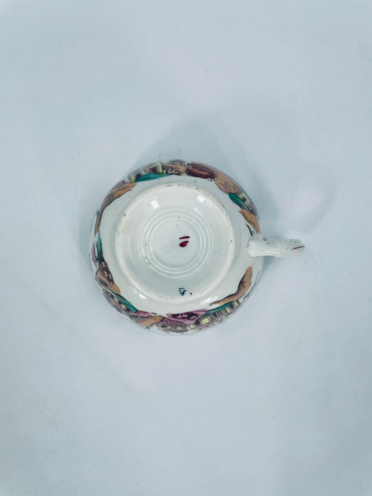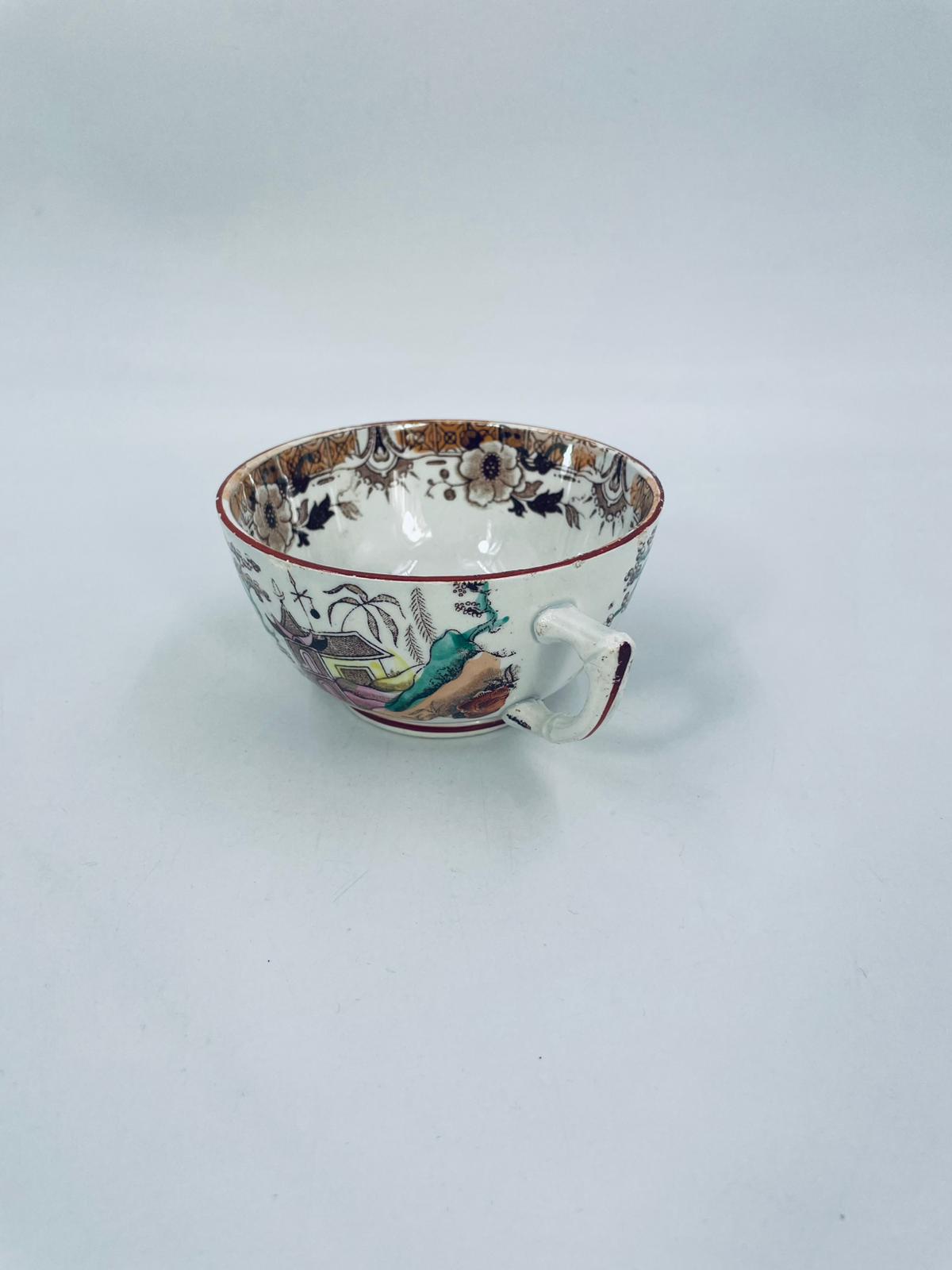 Filiżanka kolekcjonerska, antyczna, francuskiej wytwórni Opaque de Sarreguemines która została założona w 1790r, a filiżanka tego typu datuje się na przełom XIX i XX w. Filiżanka dekorowana ręcznie kolorowa kalkomanią w stylu orientalnym, wykończona na rantach kolorem bordowym. Posiada przetarcia, przebarwienia.