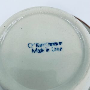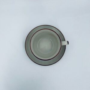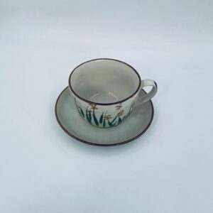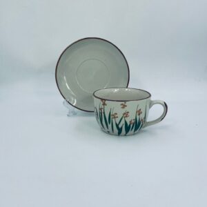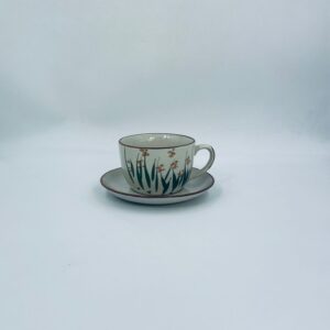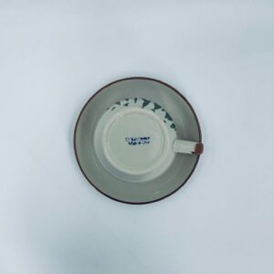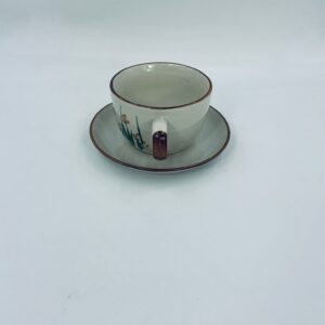 Filiżanka kolekcjonerska w zestawie duo wytwórni ChiKiang Stoneware, wykonana z ceramiki w kolorze ecru. Filiżanka z ręcznie malowanym wzorem roślinnym. Filiżanka jak i spodek wykończona kolorem brązowym na rancie. Posiada uszczerbek.