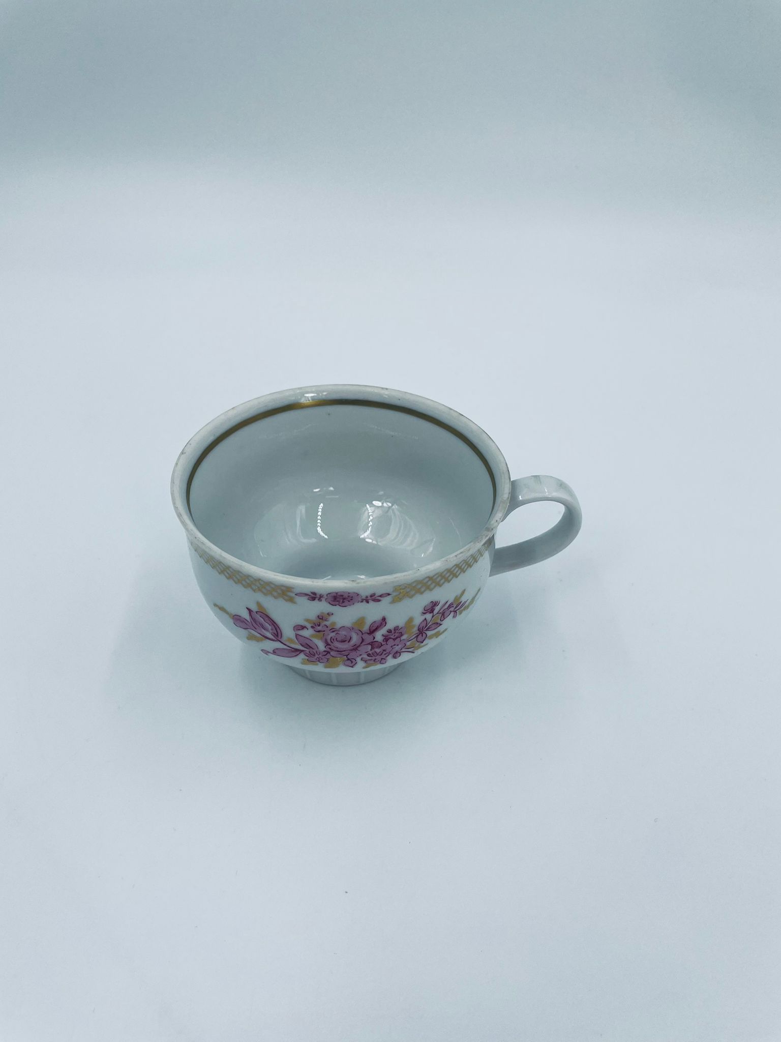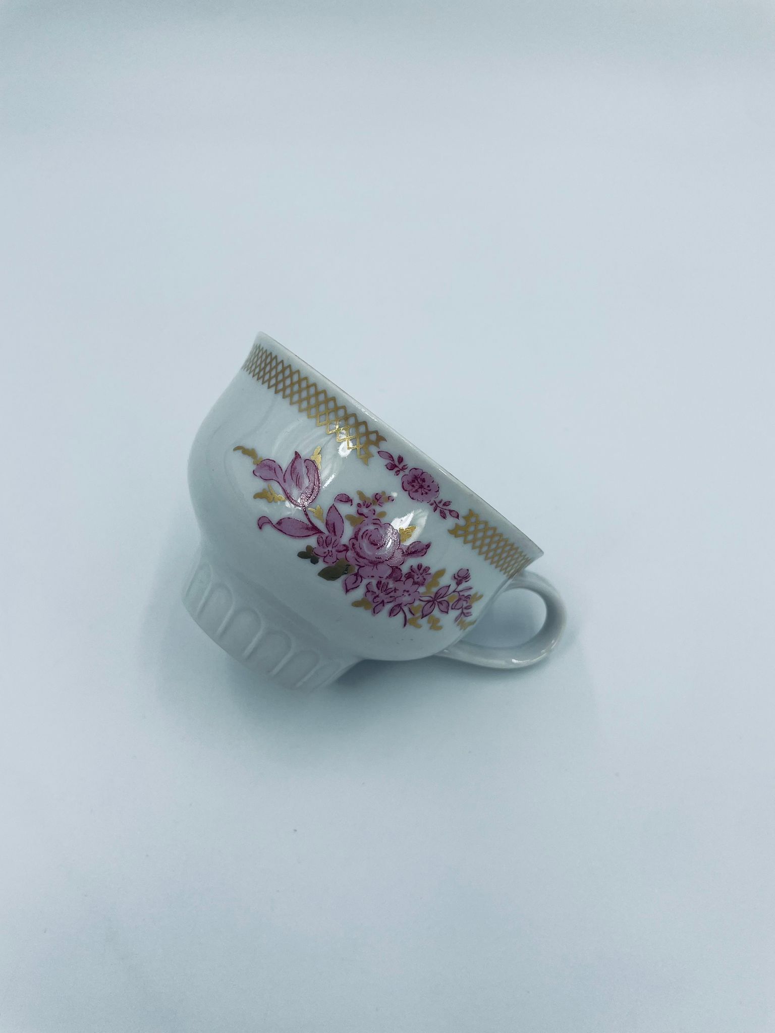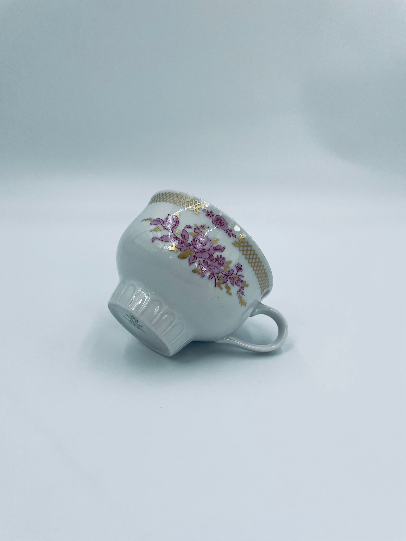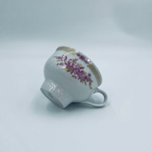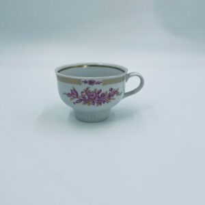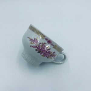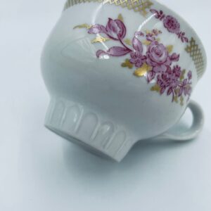 Filiżanka kolekcjonerska wytwórni Graf Von Henneberg, wykonana z wysokiej jakości białej porcelany. Filiżanka ozdobiona motywem różowych kwiatów, złotym kratkowanym pasem wzdłuż górnej krawędzi oraz żebrowaną faktura w dolnej części. Posiada przetarcie na rancie.