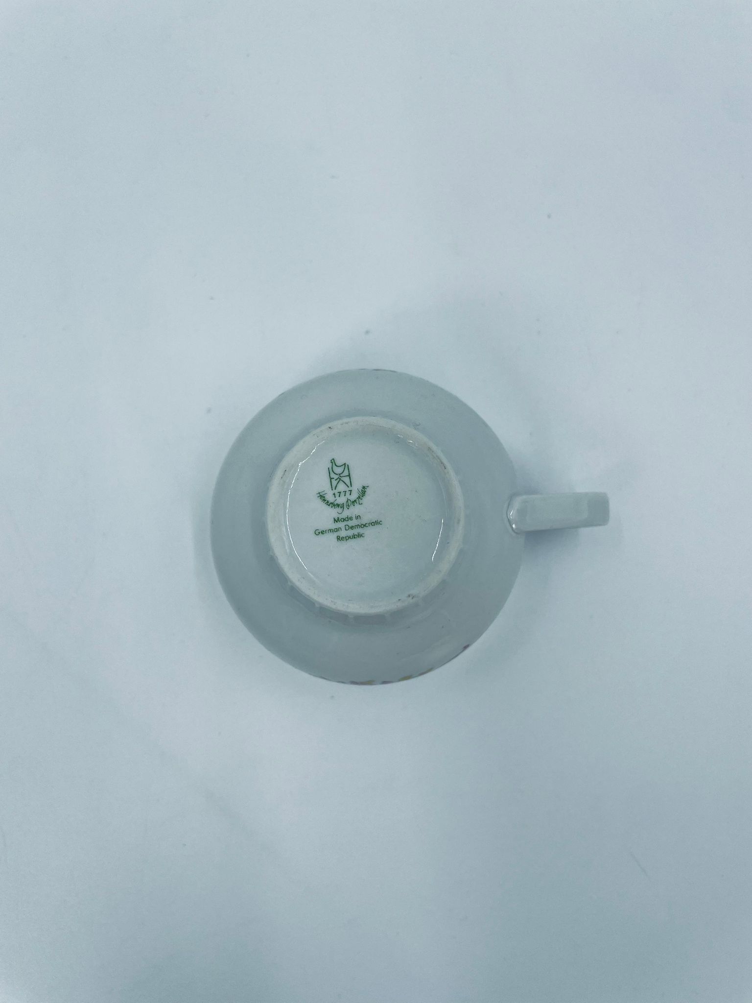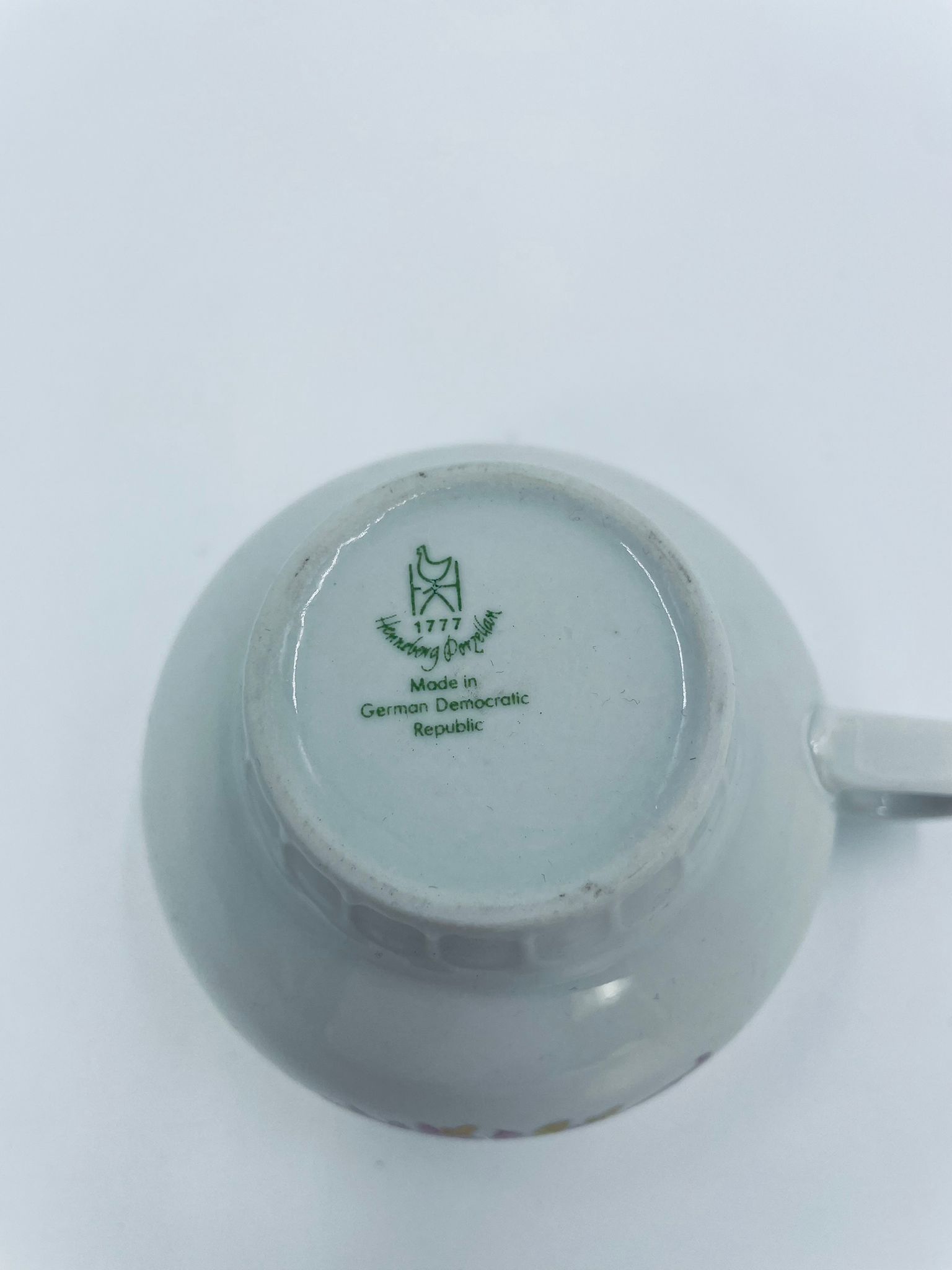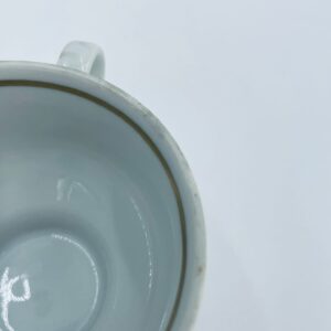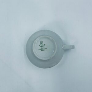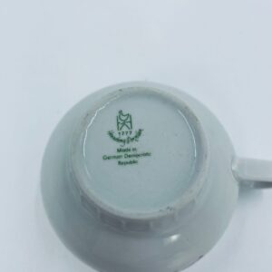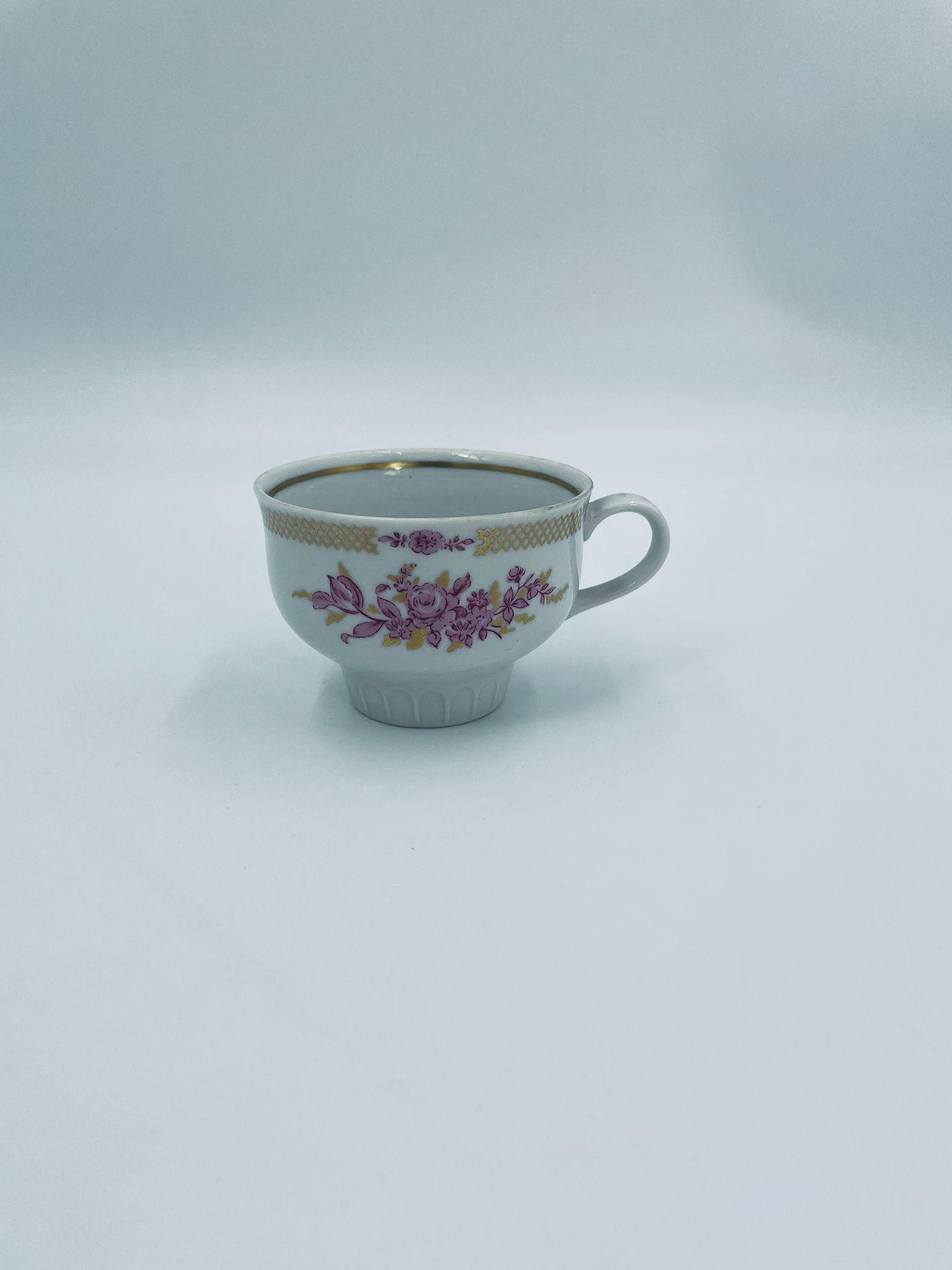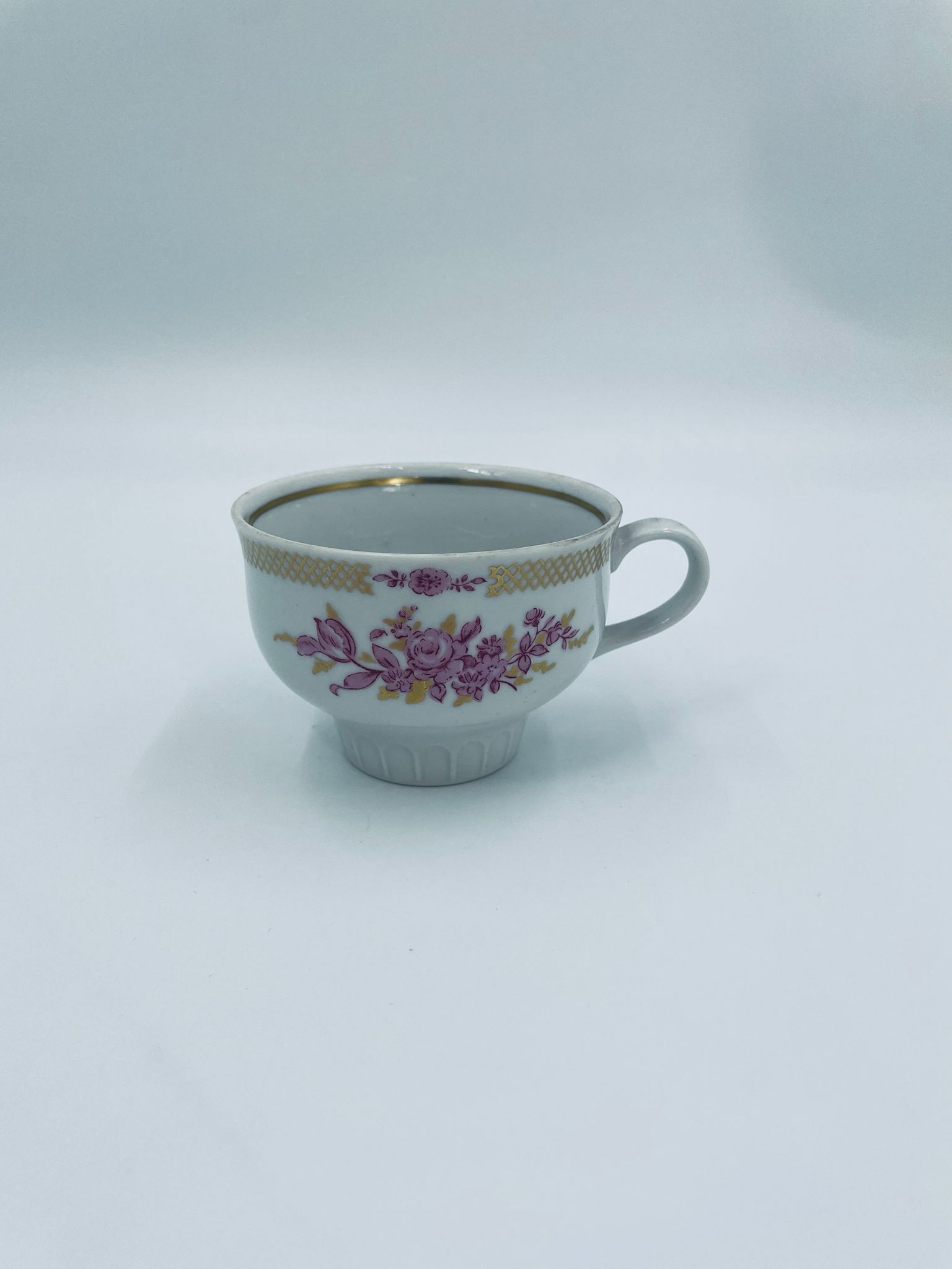Filiżanka kolekcjonerska wytwórni Graf Von Henneberg, wykonana z wysokiej jakości białej porcelany. Filiżanka ozdobiona motywem różowych kwiatów, złotym kratkowanym pasem wzdłuż górnej krawędzi oraz żebrowaną faktura w dolnej części. Posiada przetarcie na rancie.
