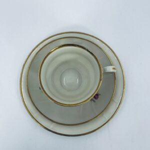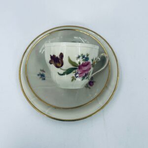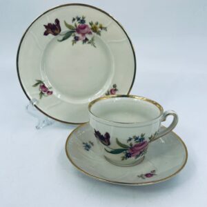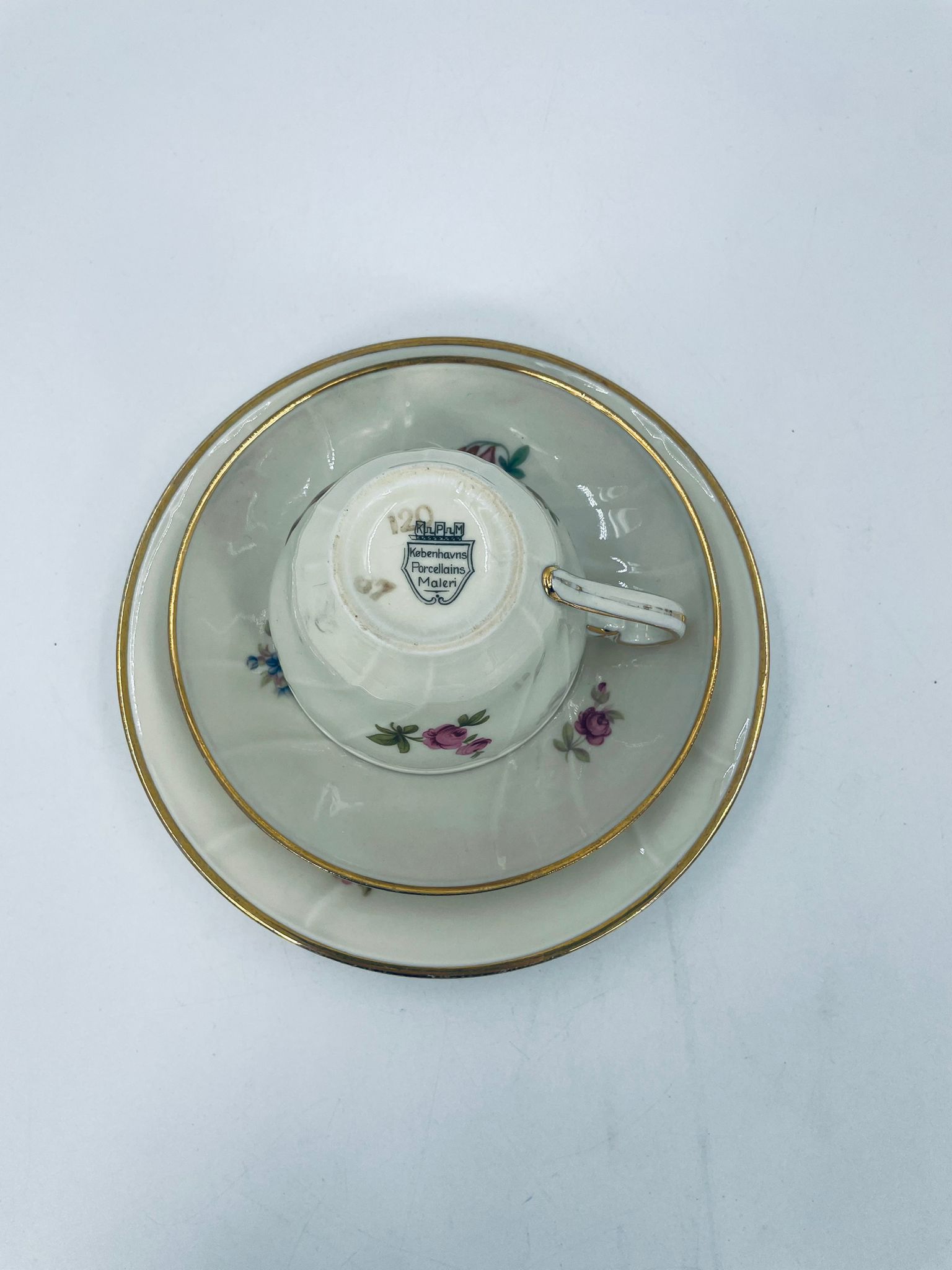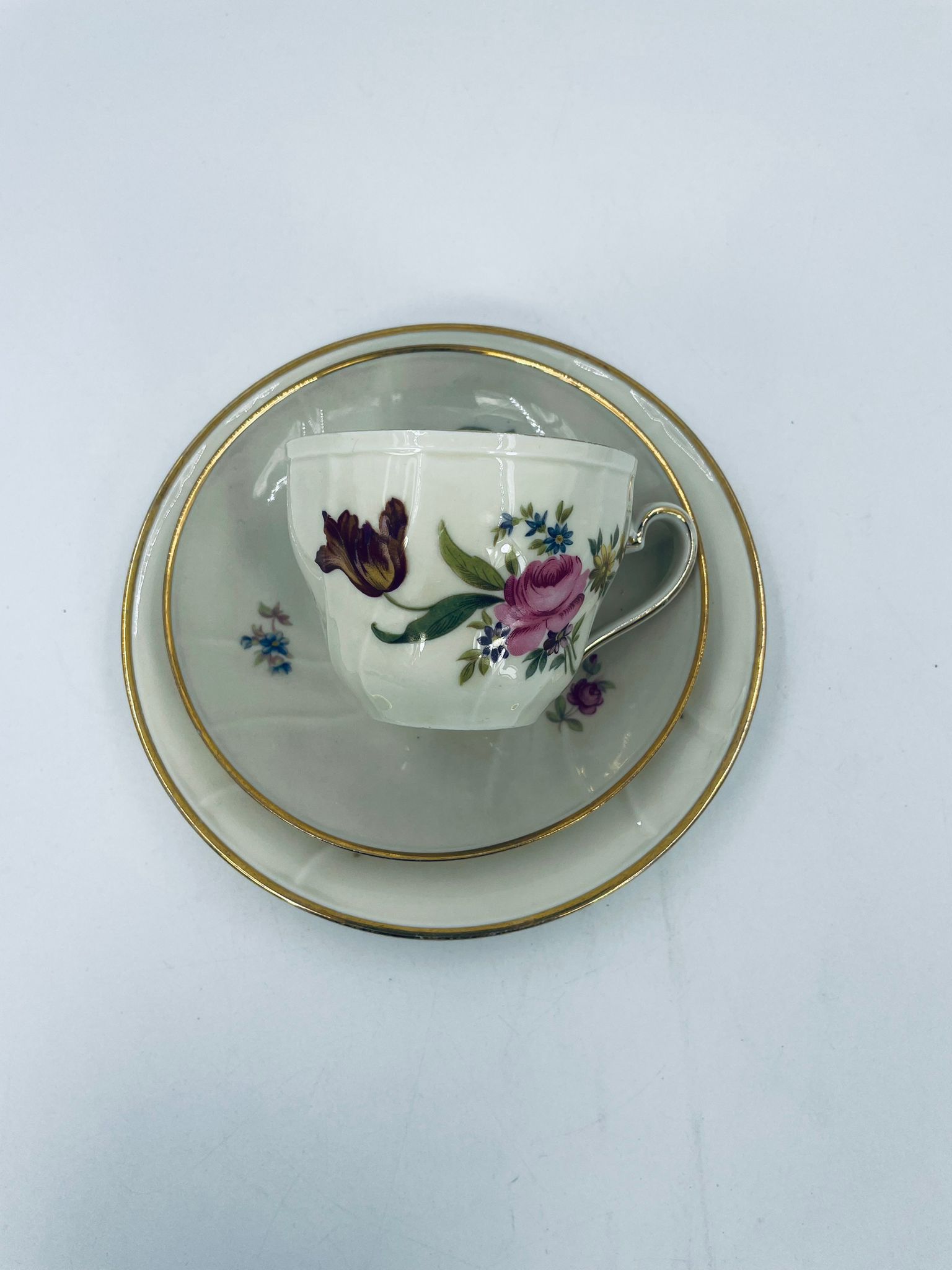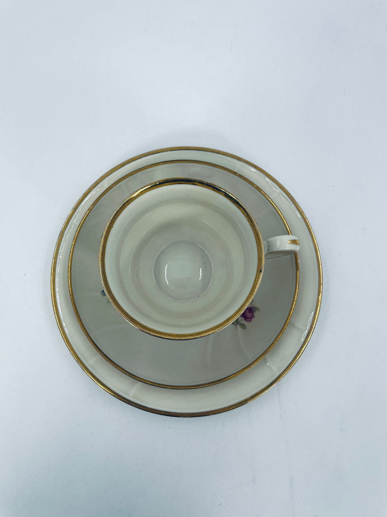 Zestaw śniadaniowy trio wytwórni kobenhavns porcellains maleri KPM. Lata 50te. Porcelana w kolorze ecru z motywem kwiatowym, wykończona złoceniami.