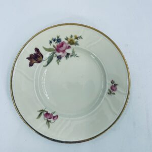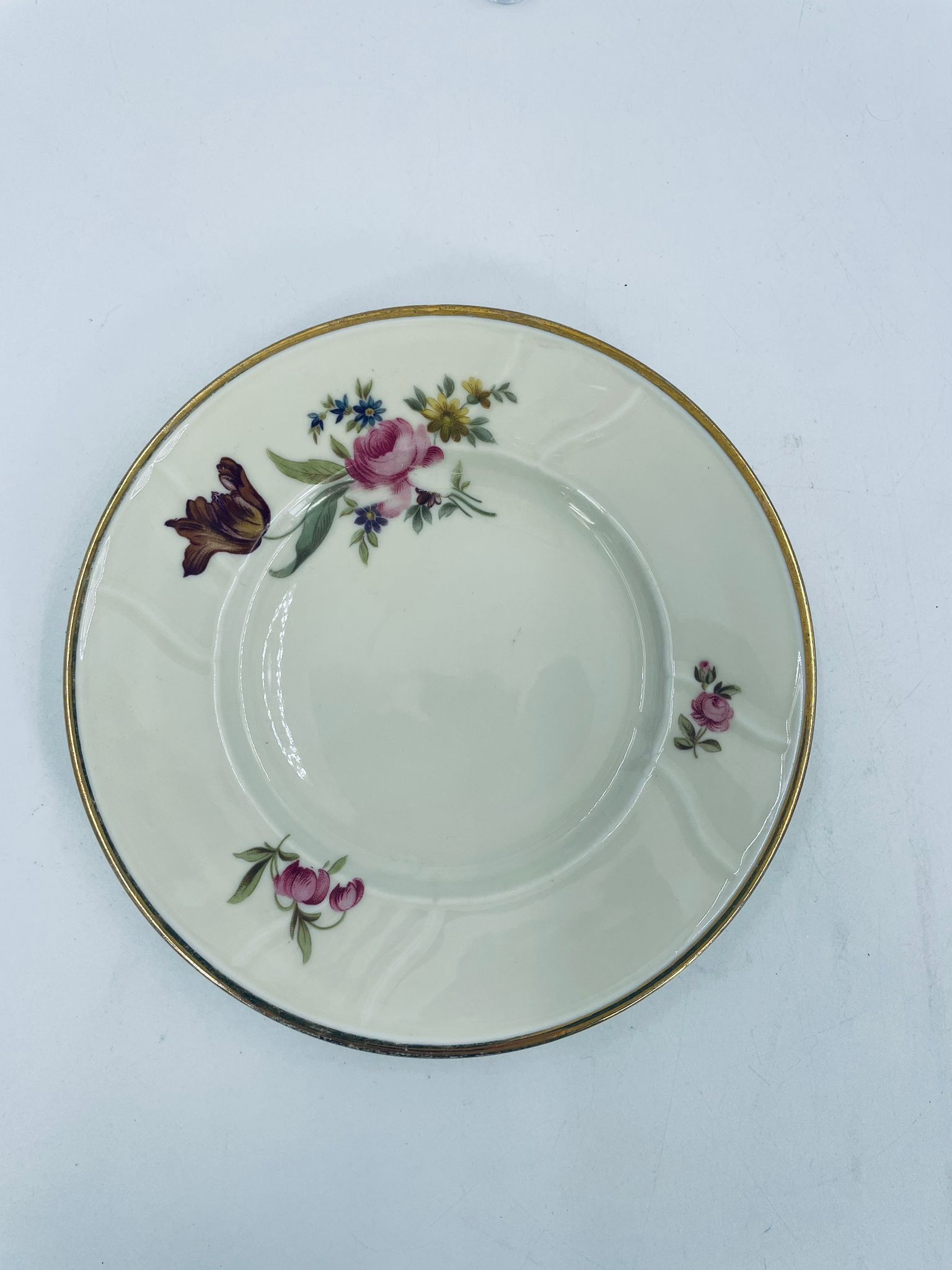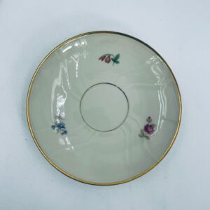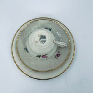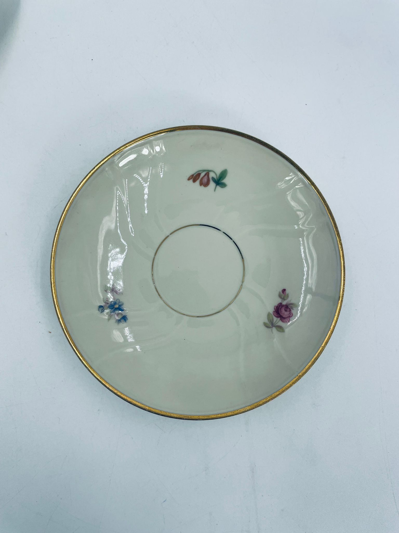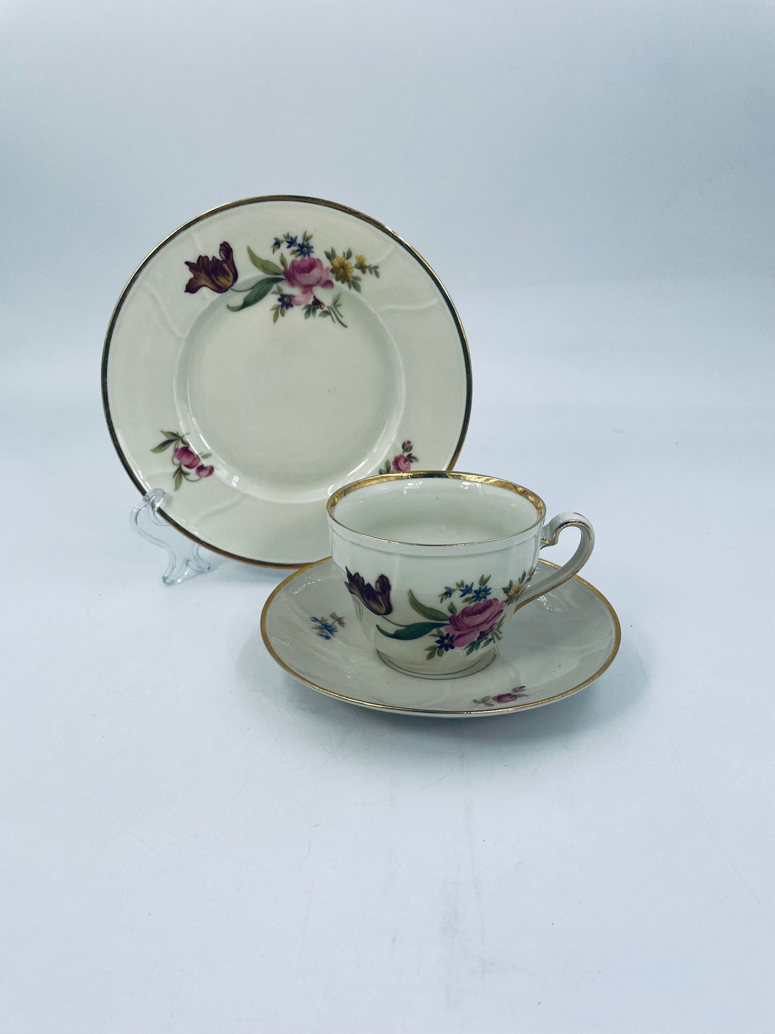 Zestaw śniadaniowy trio wytwórni kobenhavns porcellains maleri KPM. Lata 50te. Porcelana w kolorze ecru z motywem kwiatowym, wykończona złoceniami.