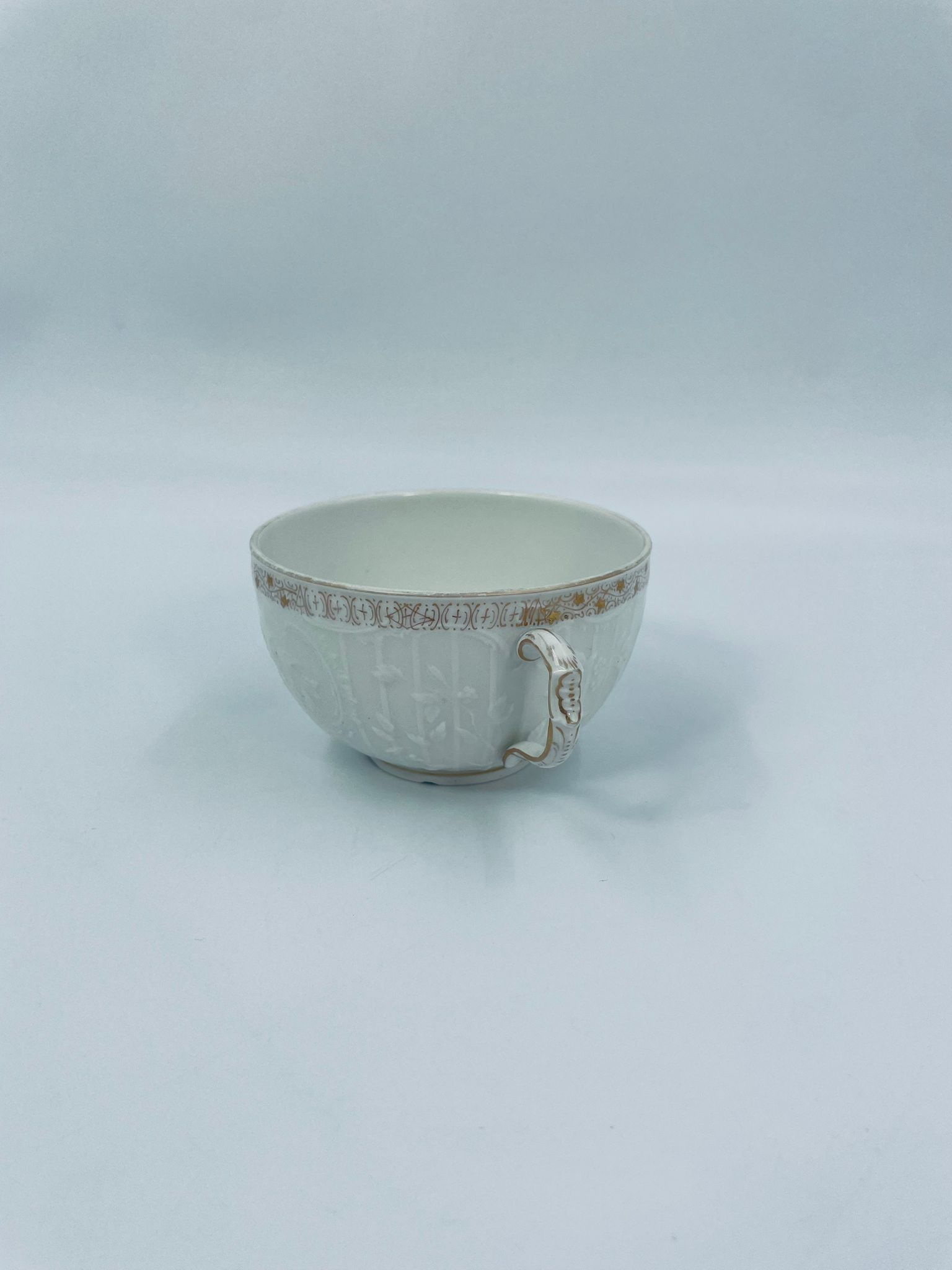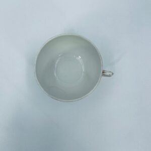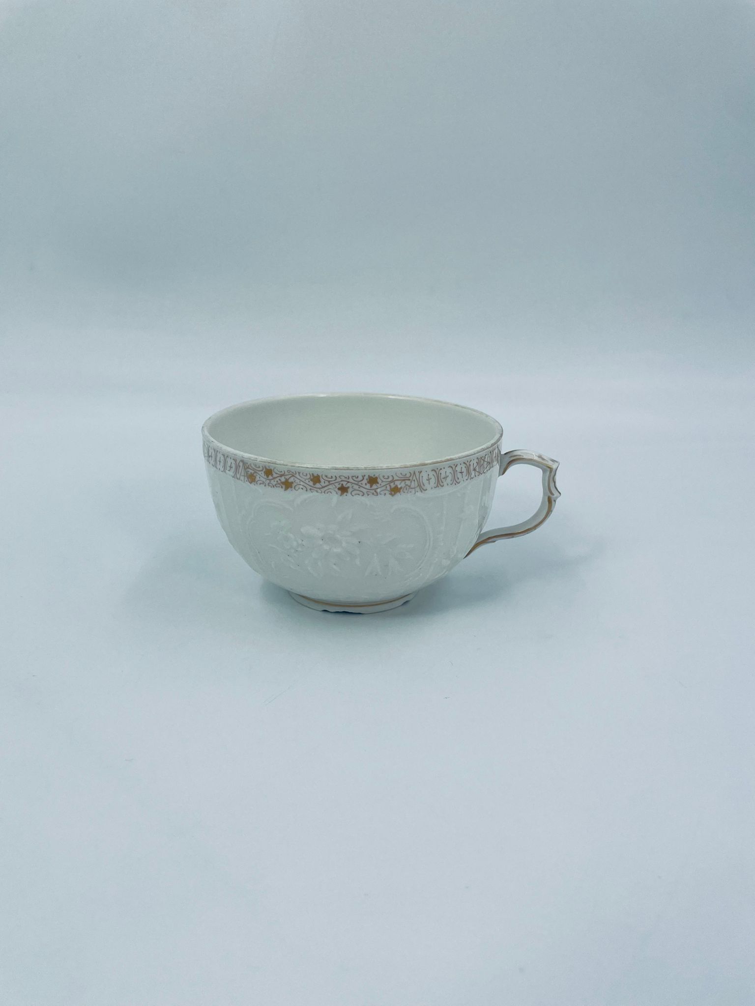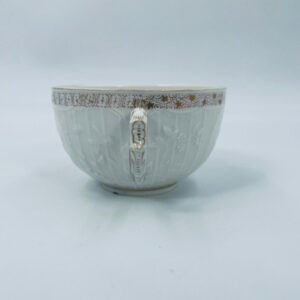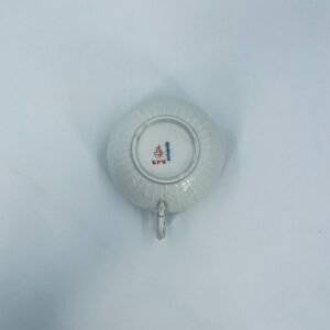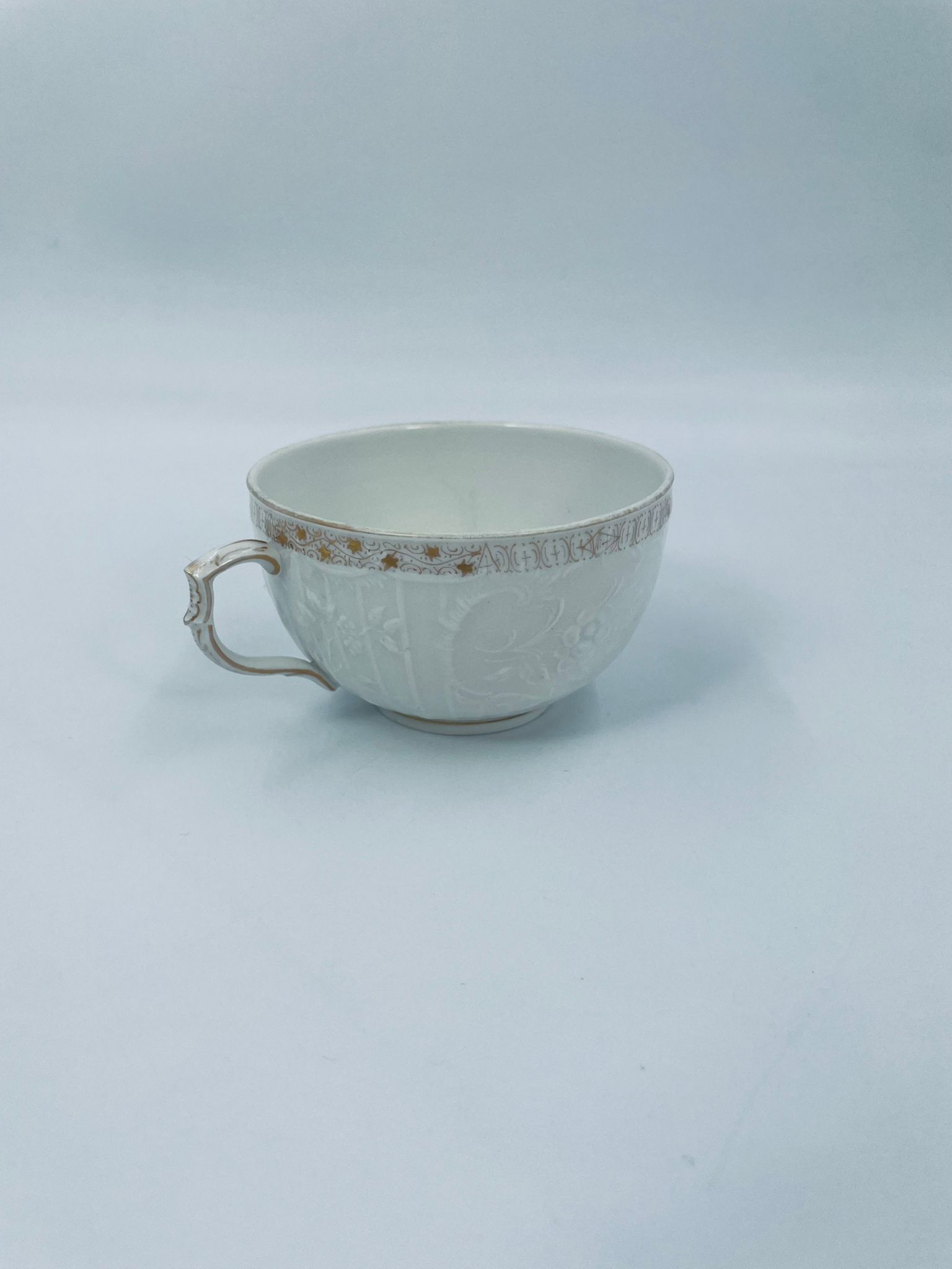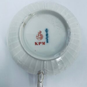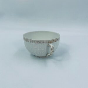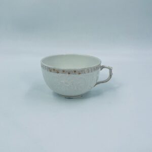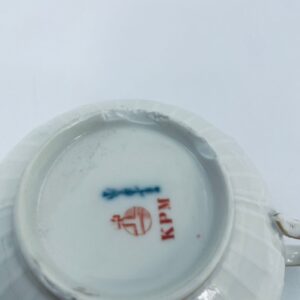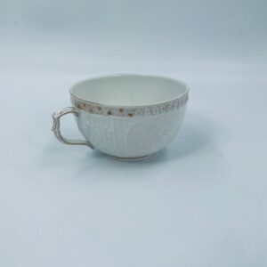 Filiżanka kolekcjonerska wytwórni KPM, wykonana z wysokiej jakości porcelany w kolorze ecru. Filiżanka posiada tłoczony dekor roślinny, zdobiona jest złotym ornamentem wokół górnej krawędzi. Posiada uszczerbek na podstawie.
