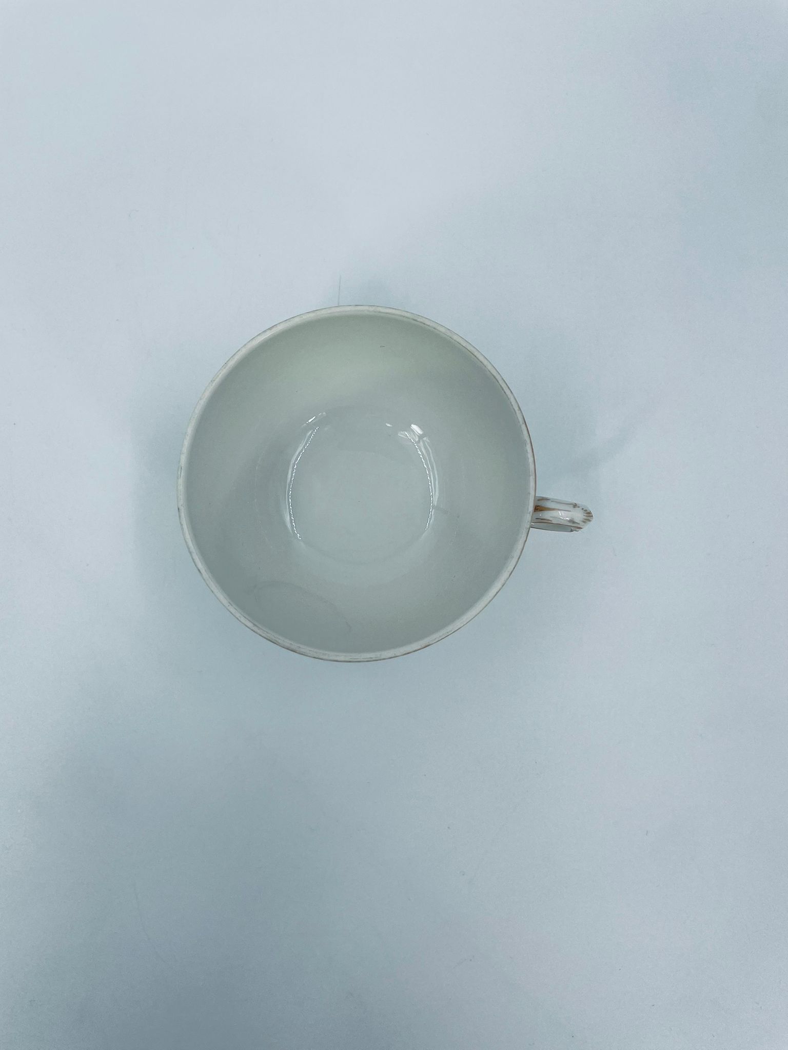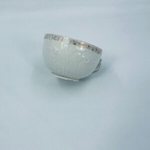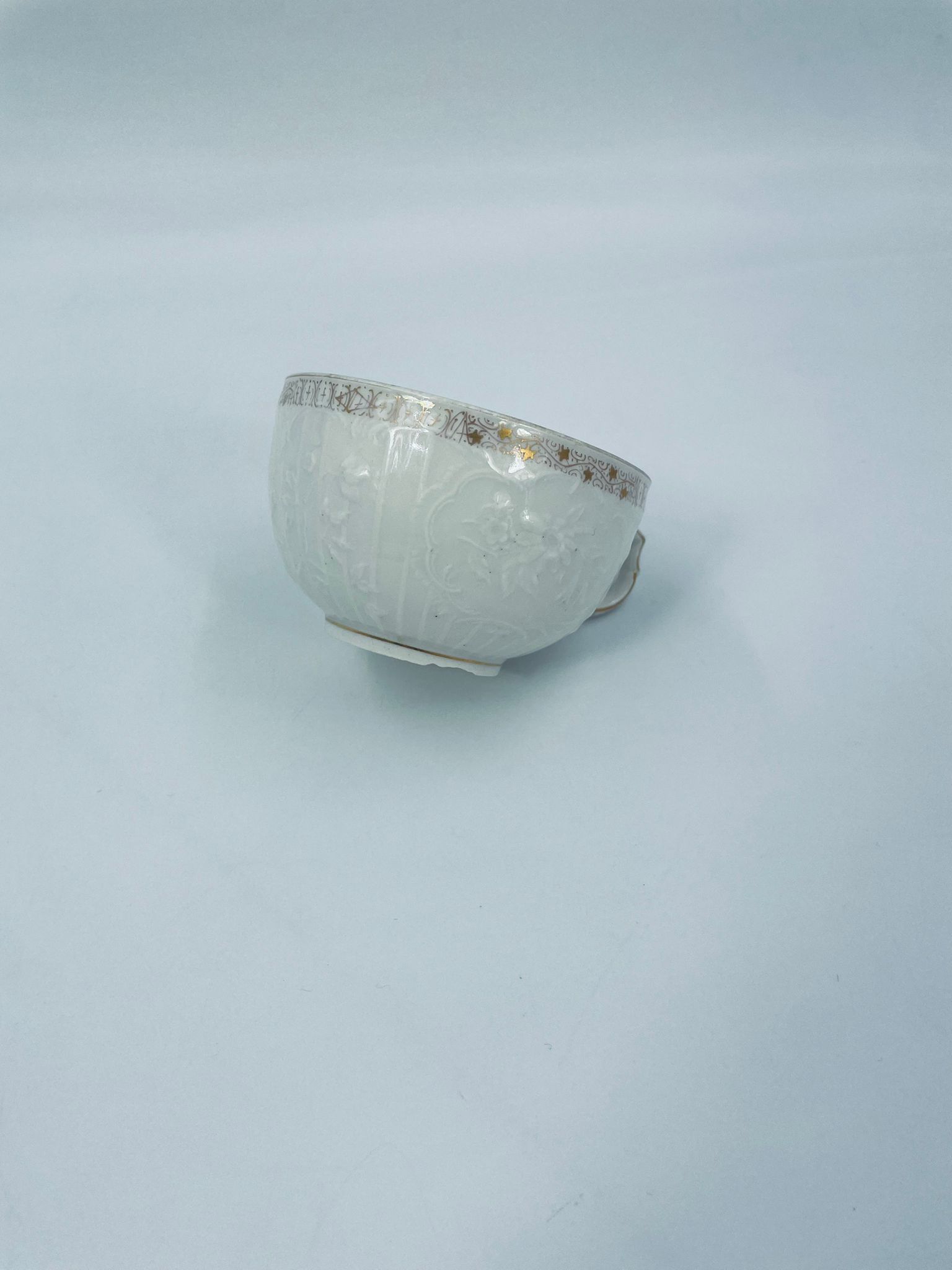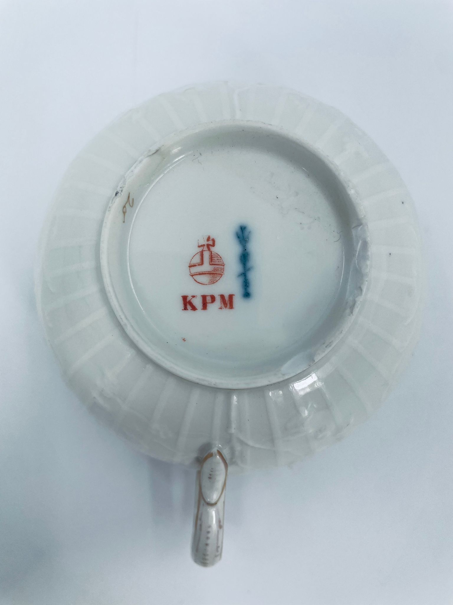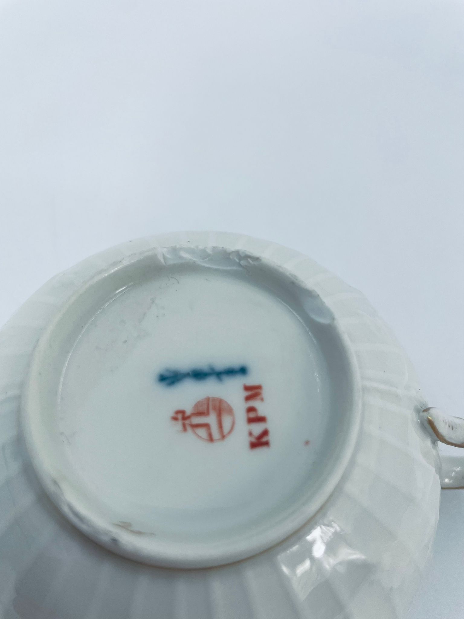 Filiżanka kolekcjonerska wytwórni KPM, wykonana z wysokiej jakości porcelany w kolorze ecru. Filiżanka posiada tłoczony dekor roślinny, zdobiona jest złotym ornamentem wokół górnej krawędzi. Posiada uszczerbek na podstawie.