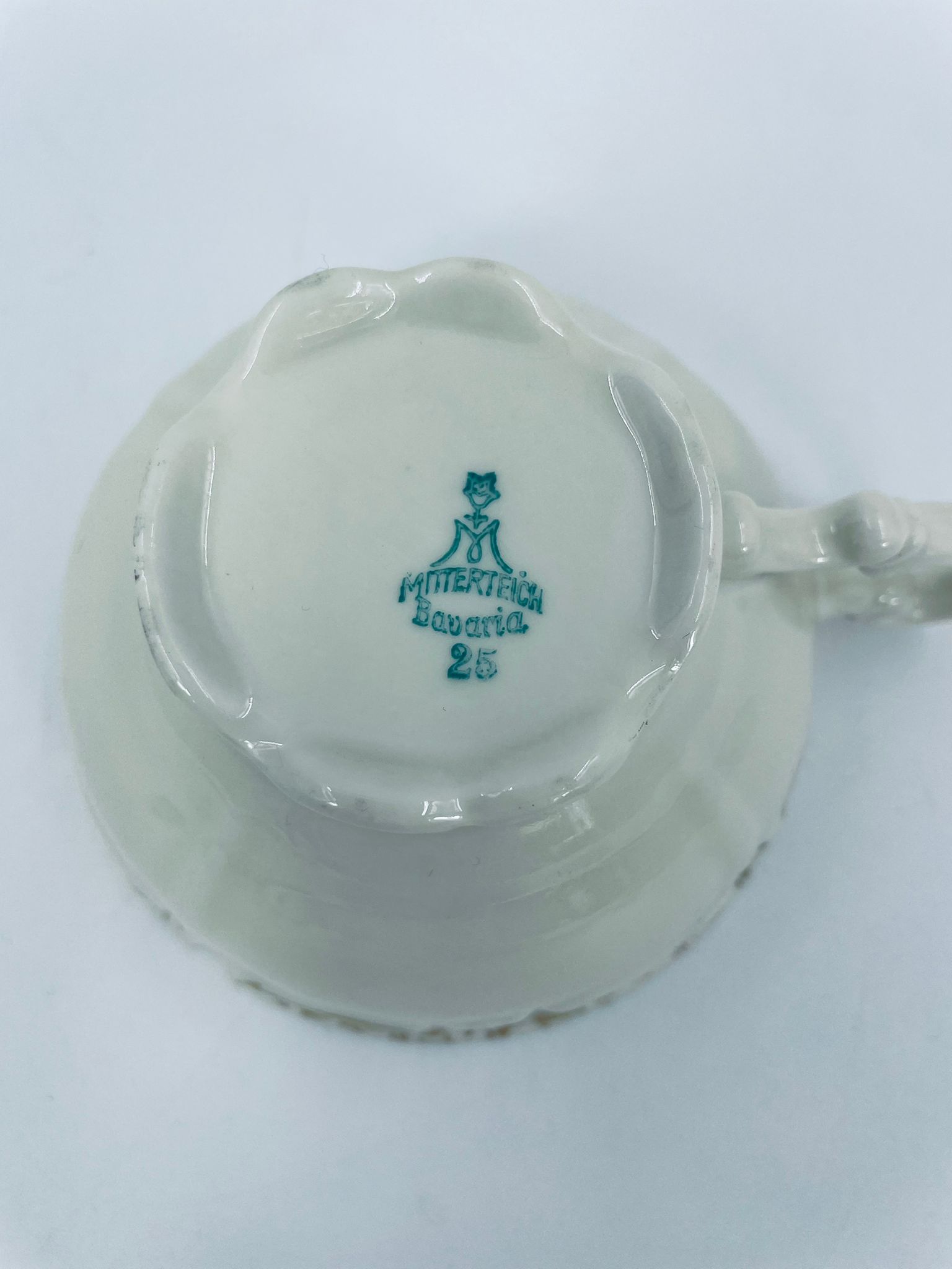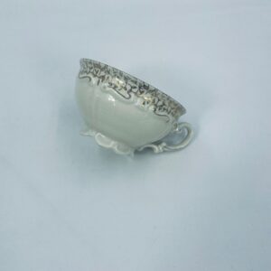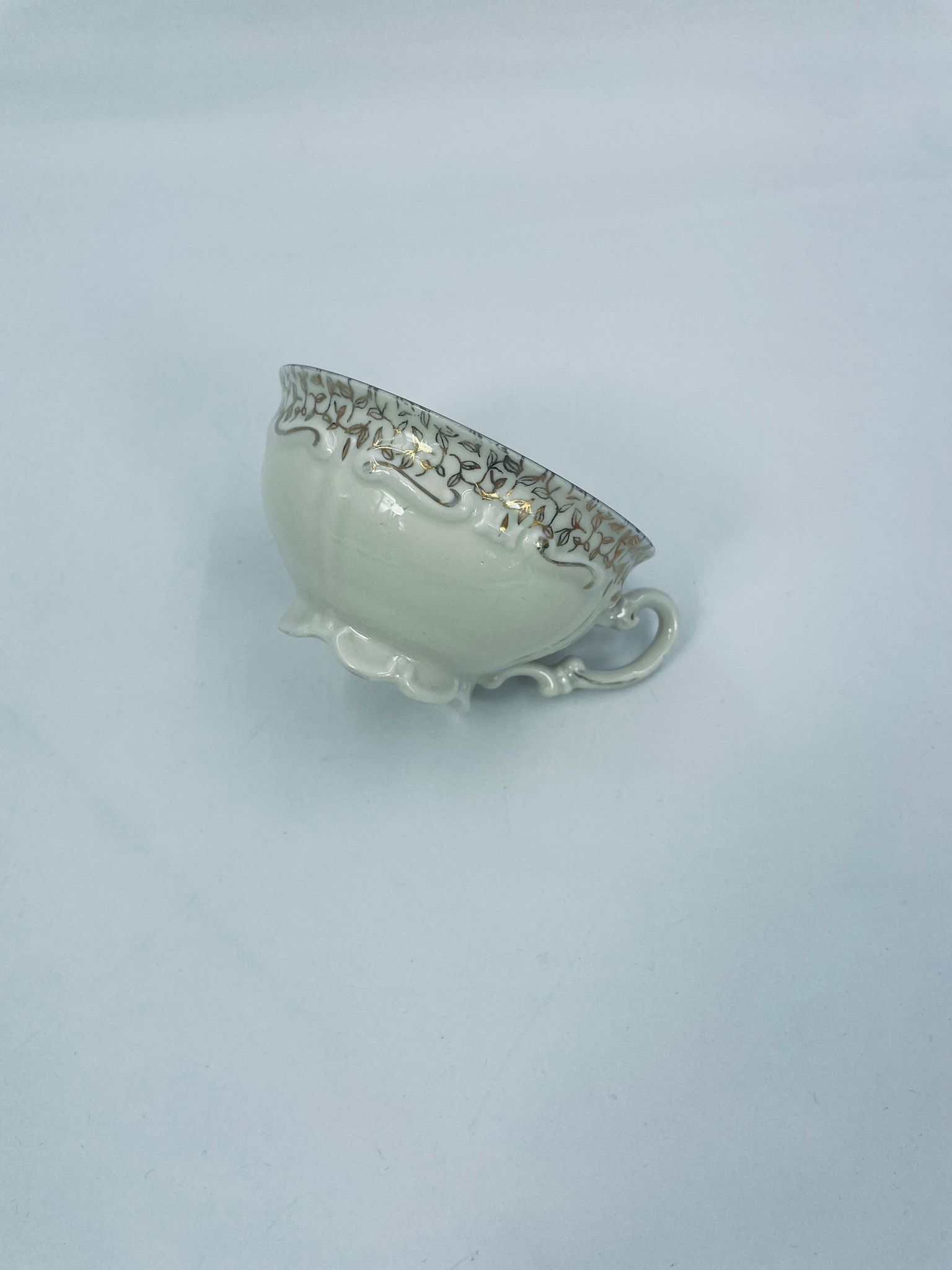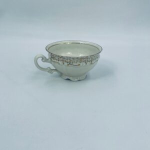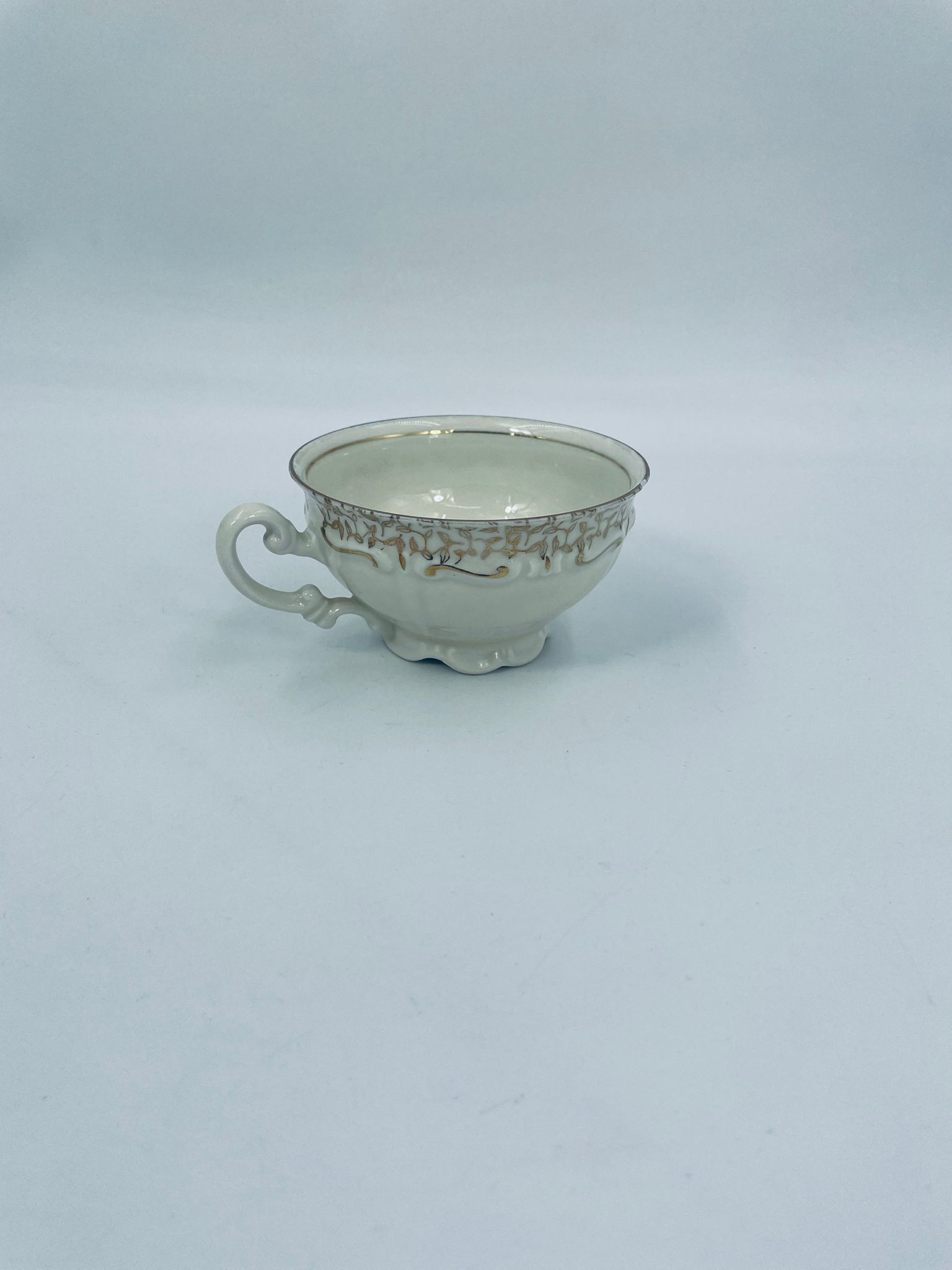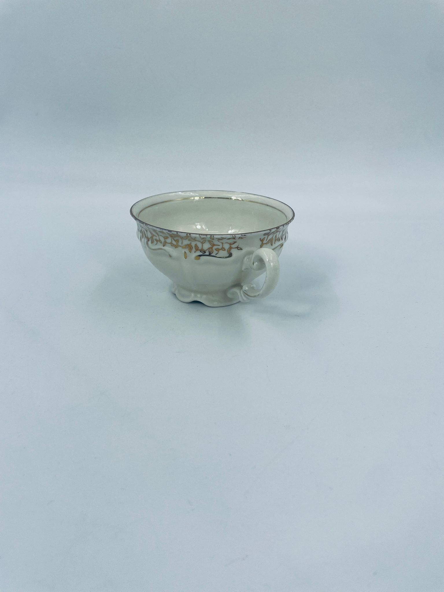 Filiżanka kolekcjonerska wytwórni Mitterteich Bavaria, wykonana z wysokiej jakości porcelany w kolorze ecru. Filiżanka charakteryzuje się reliefowymi wzorami, ozdobiona złotymi motywami roślinnymi wokół górnej krawędzi oraz ozdobna falista podstawa i ozdobnym uchwytem. Posiada uszczerbek przy górnej krawędzi.
