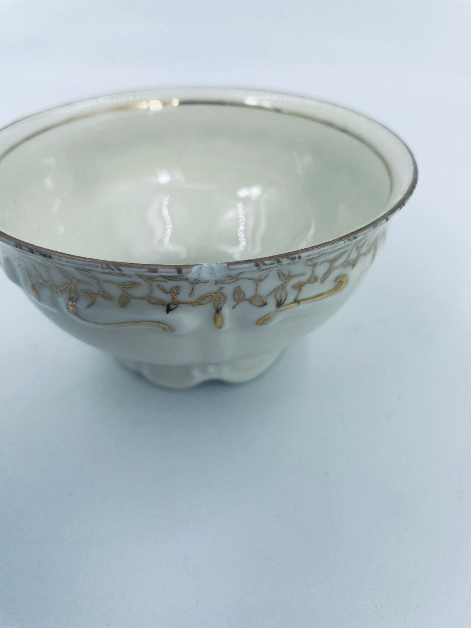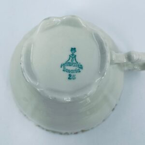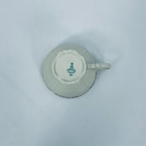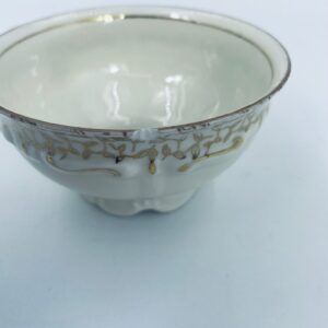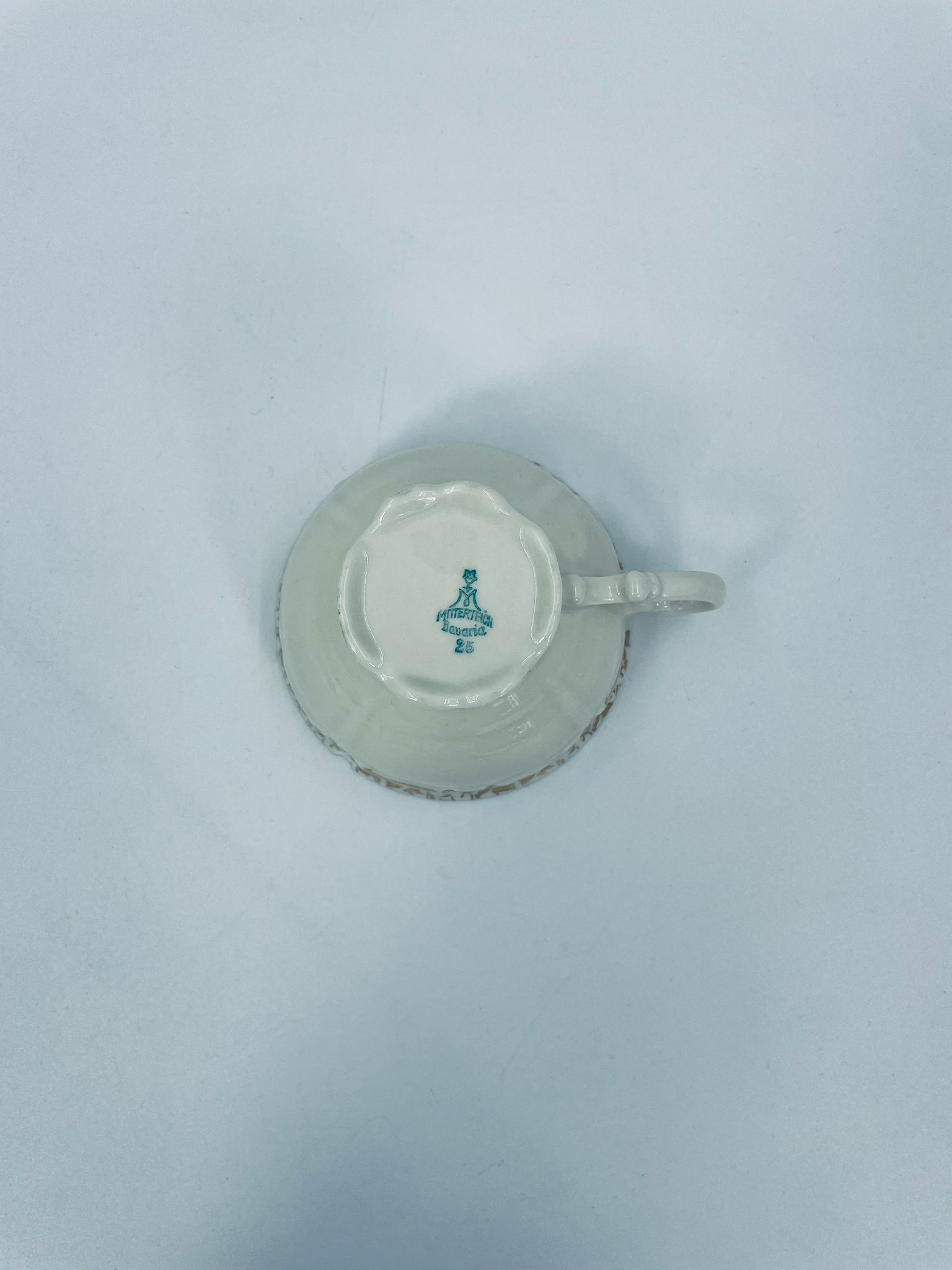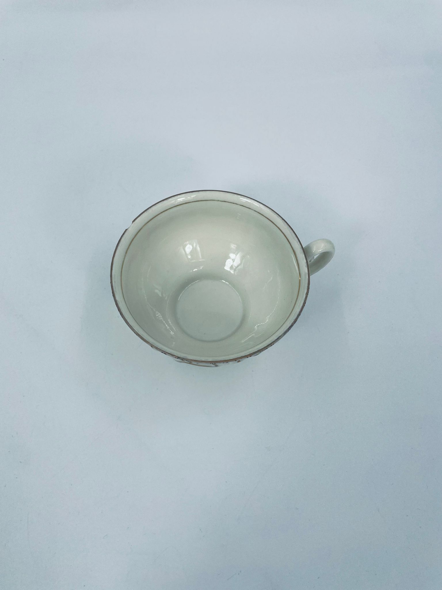 Filiżanka kolekcjonerska wytwórni Mitterteich Bavaria, wykonana z wysokiej jakości porcelany w kolorze ecru. Filiżanka charakteryzuje się reliefowymi wzorami, ozdobiona złotymi motywami roślinnymi wokół górnej krawędzi oraz ozdobna falista podstawa i ozdobnym uchwytem. Posiada uszczerbek przy górnej krawędzi.