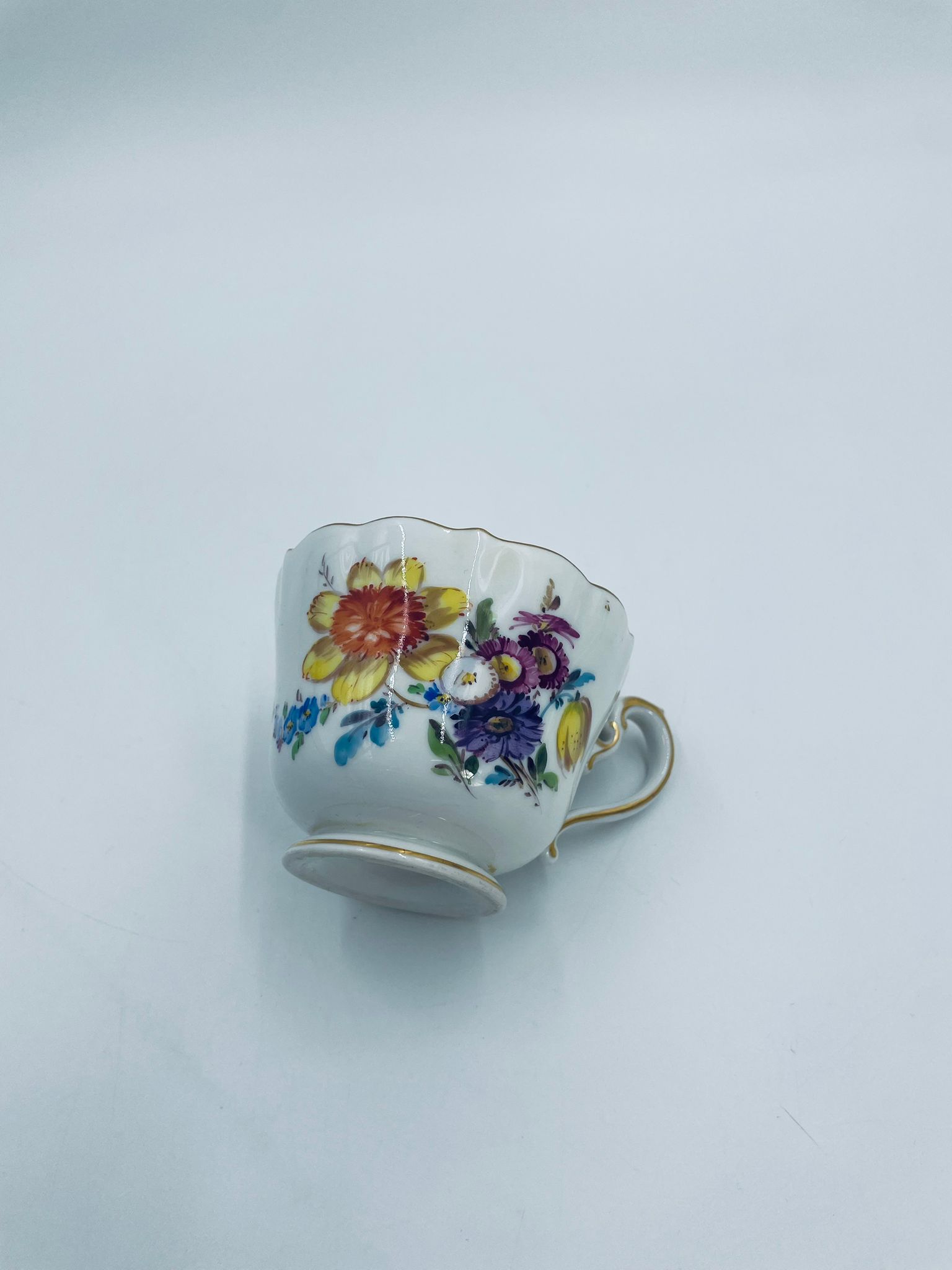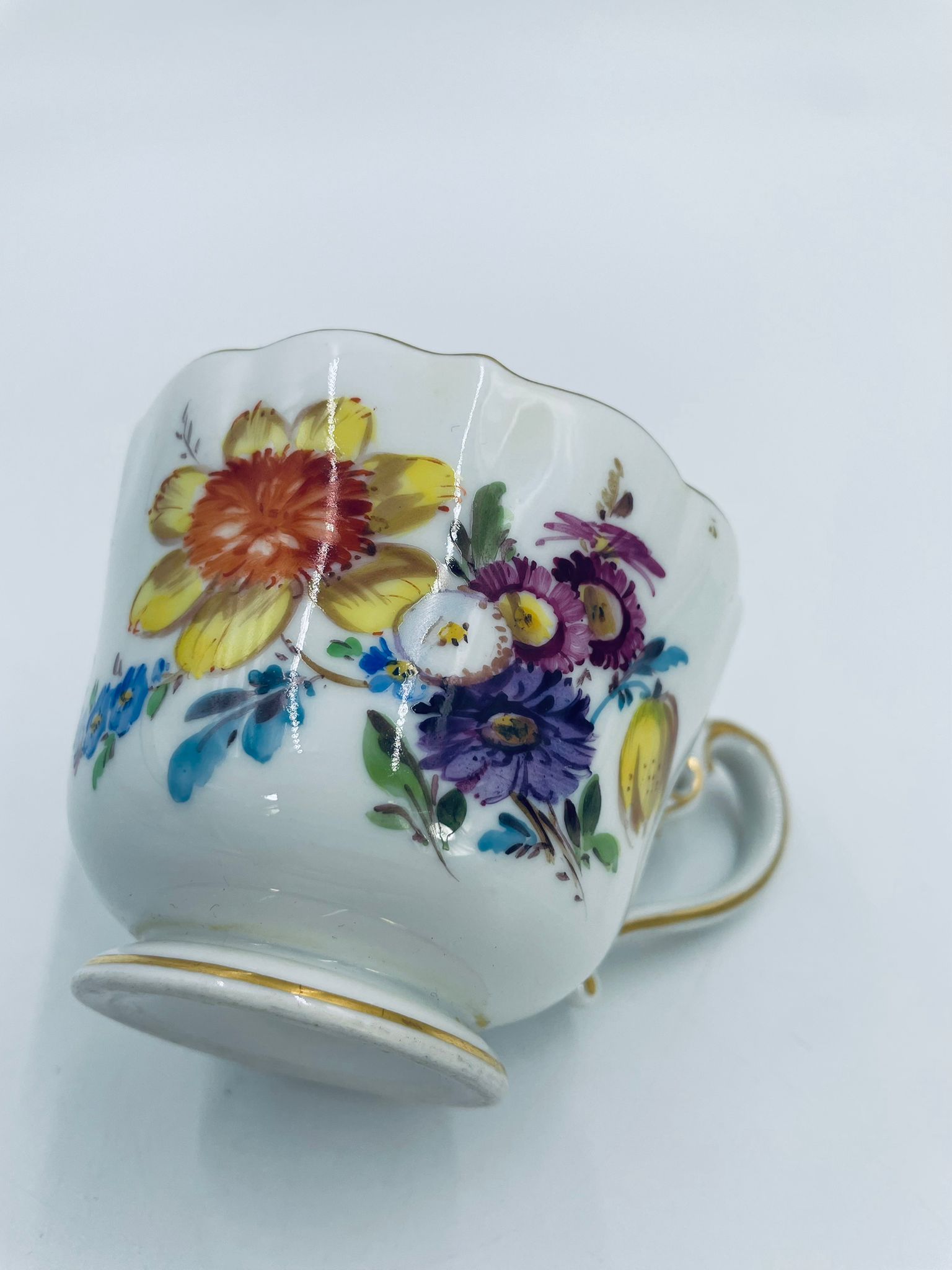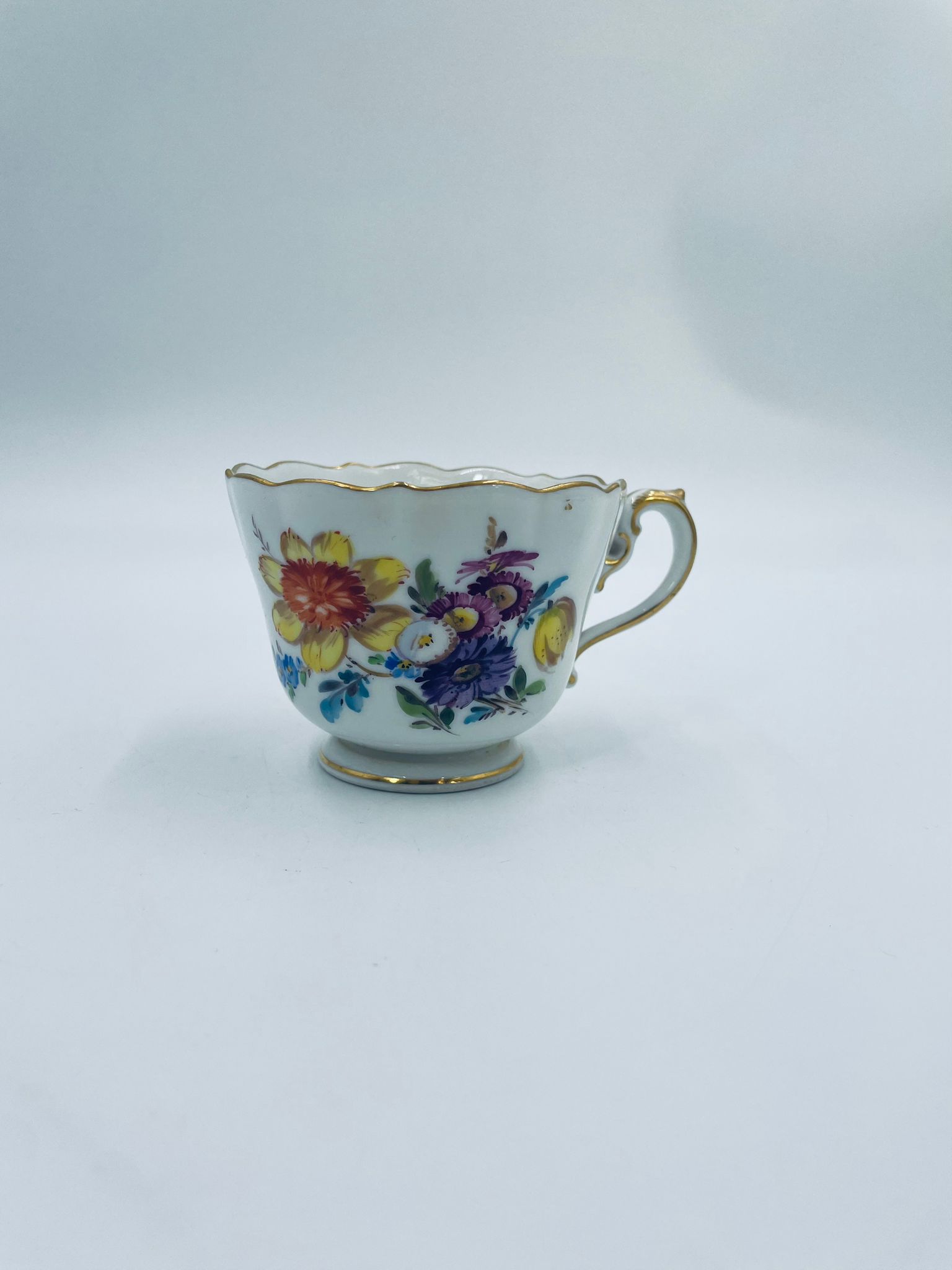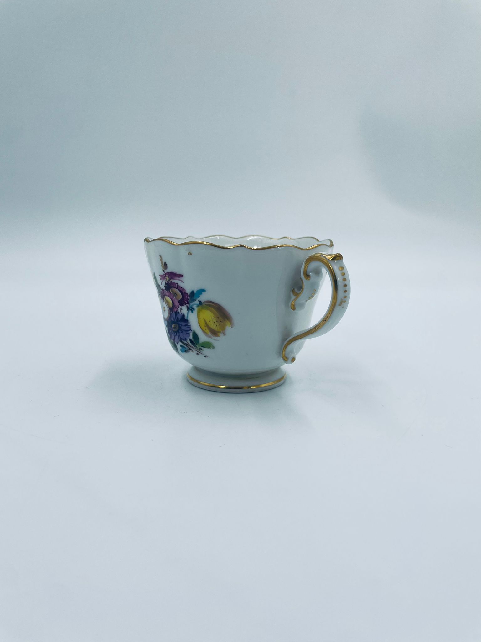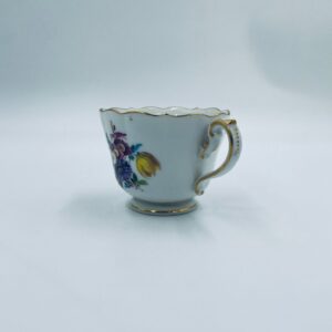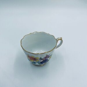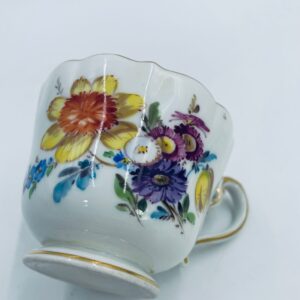 Filiżanka kolekcjonerska królewskiej manufaktury Miśnieńskiej, wykonana z najwyższej jakości białej porcelany. Filiżanka ręcznie malowana w piękny, nasycony dekor kwiatowy, wykończona złoceniem na falistym rancie oraz ozdobnym uchwycie. Posiada małe przetarcie na złoceniu.