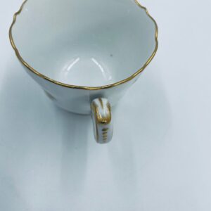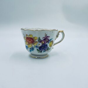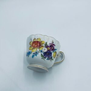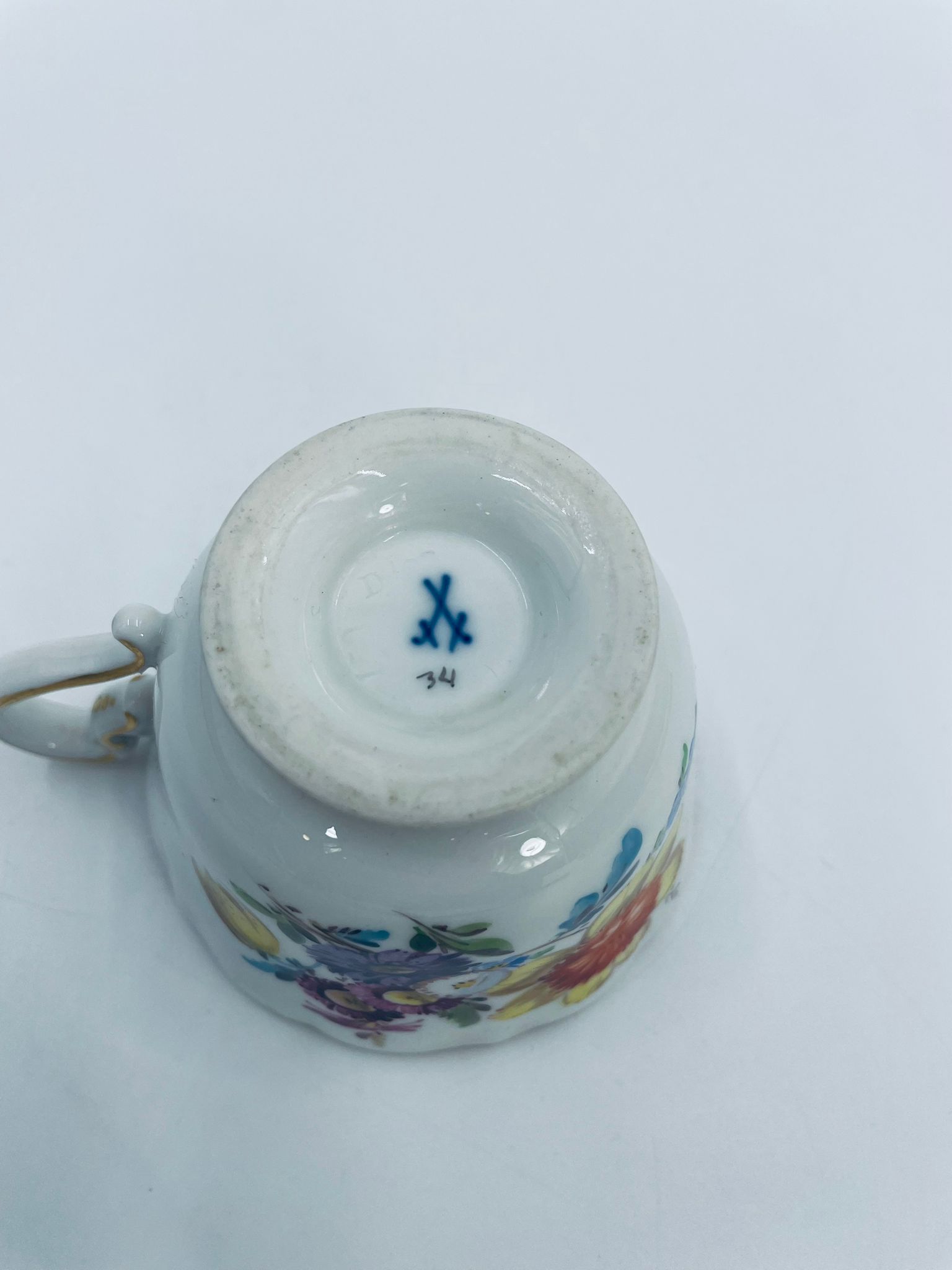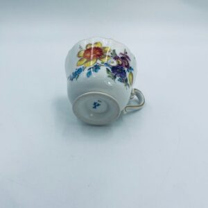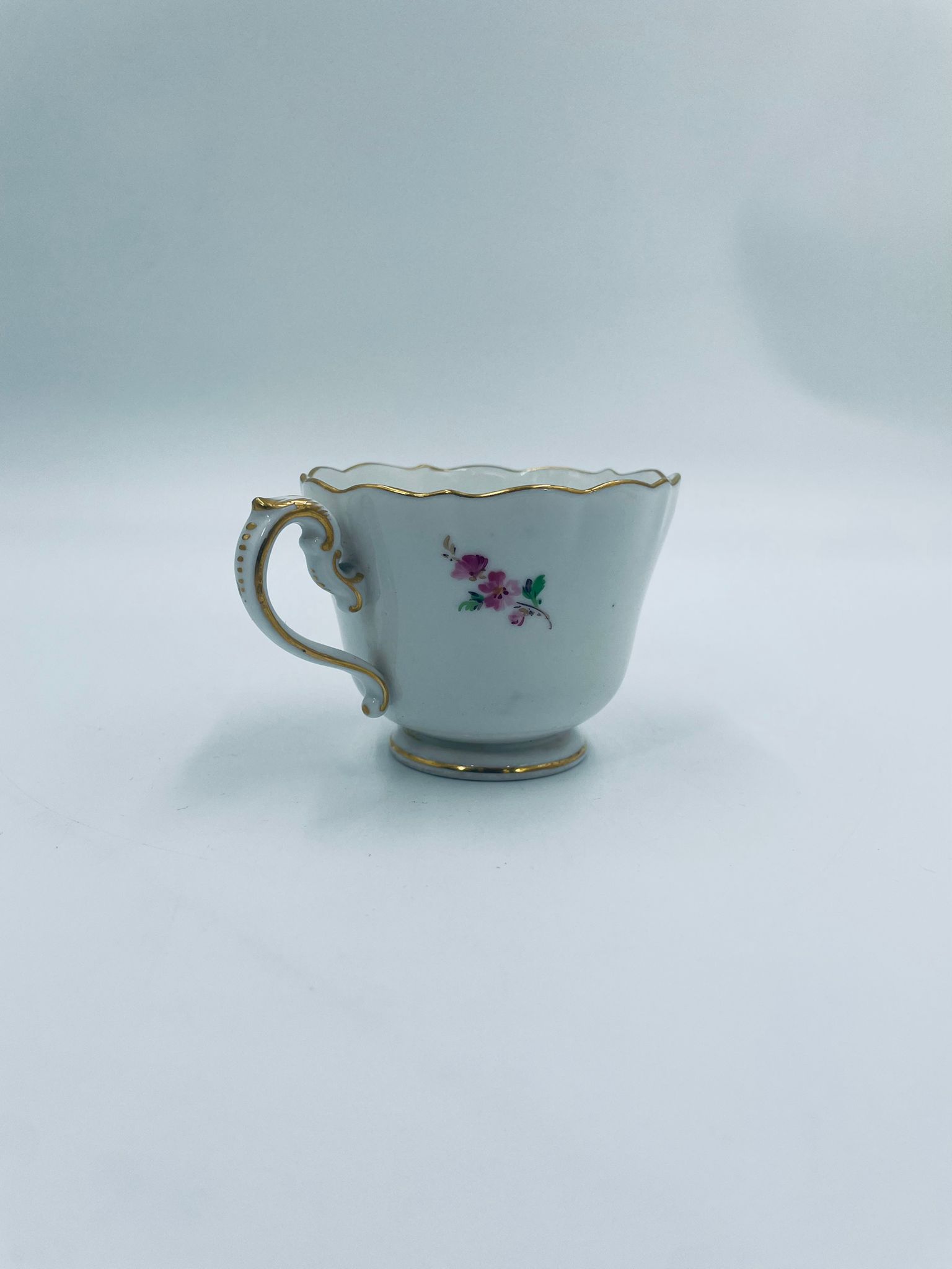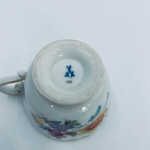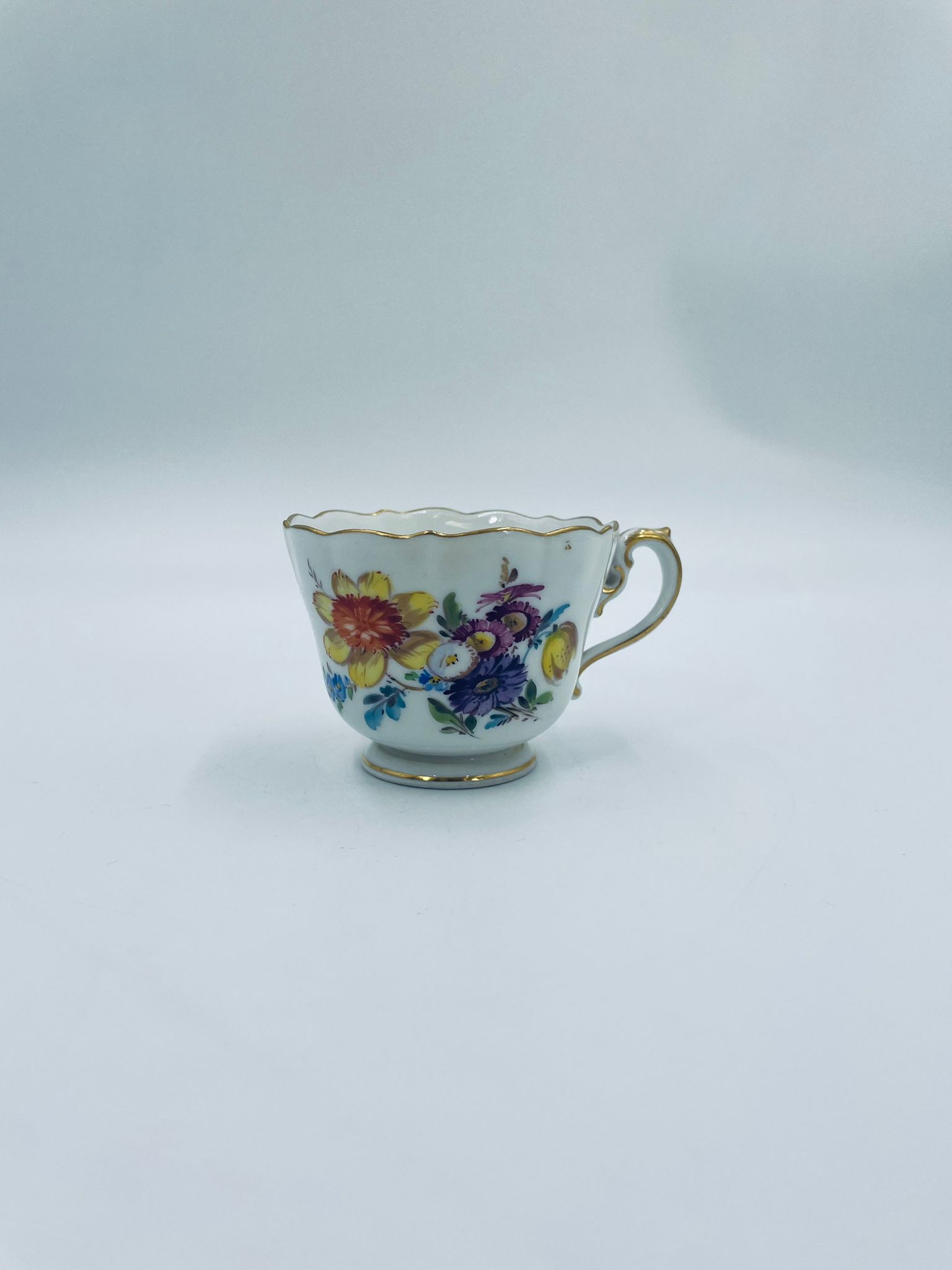 Filiżanka kolekcjonerska królewskiej manufaktury Miśnieńskiej, wykonana z najwyższej jakości białej porcelany. Filiżanka ręcznie malowana w piękny, nasycony dekor kwiatowy, wykończona złoceniem na falistym rancie oraz ozdobnym uchwycie. Posiada małe przetarcie na złoceniu.