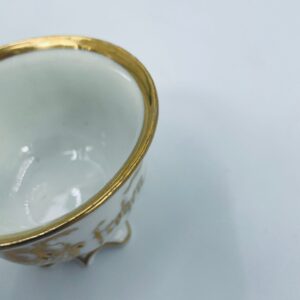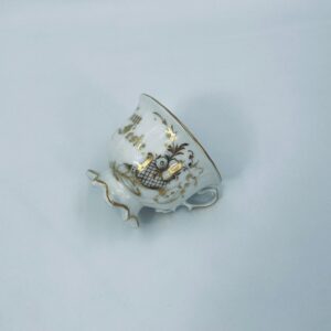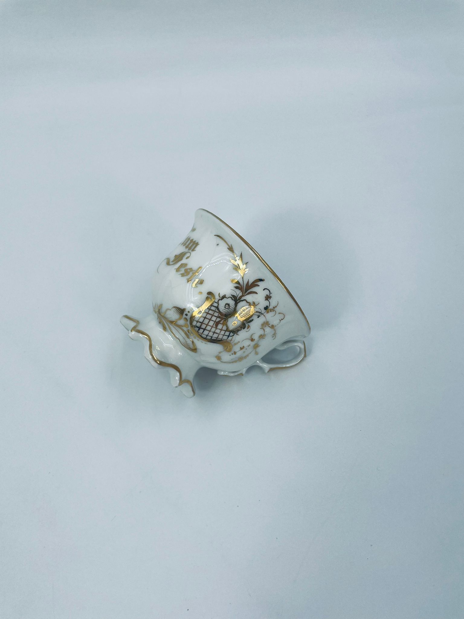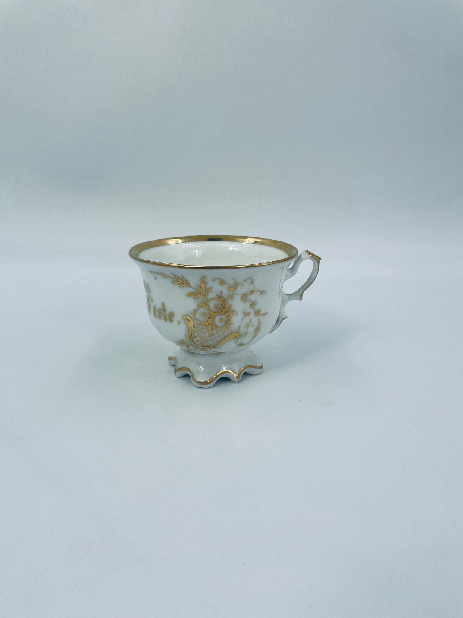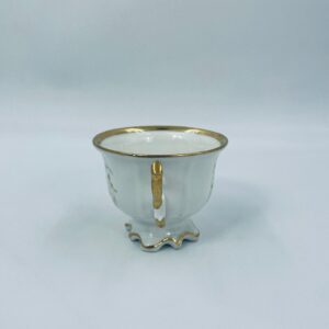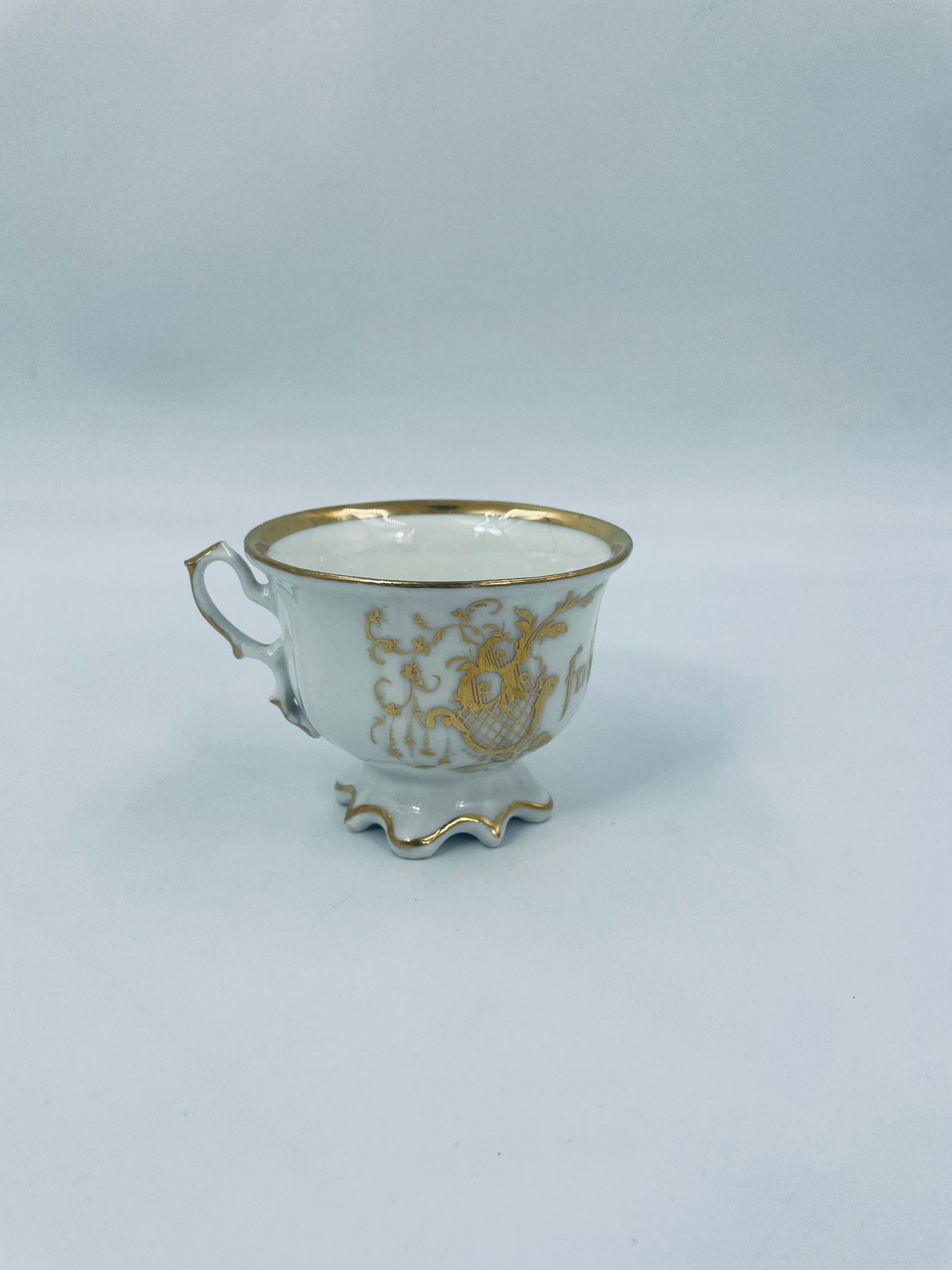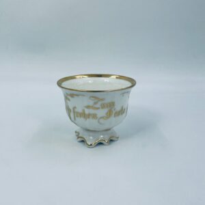 Filiżanka porcelanowa w stylu Vintage, wykonana z wysokiej jakości porcelany w kolorze ecru. Filiżanka charakteryzuje się złotymi zdobieniami, kaligraficznym napisem w złotym kolorze, ozdobnym uchwytem i podstawa, wykończona złoceniem na rantach. Posiada przetarcie na złoceniu.