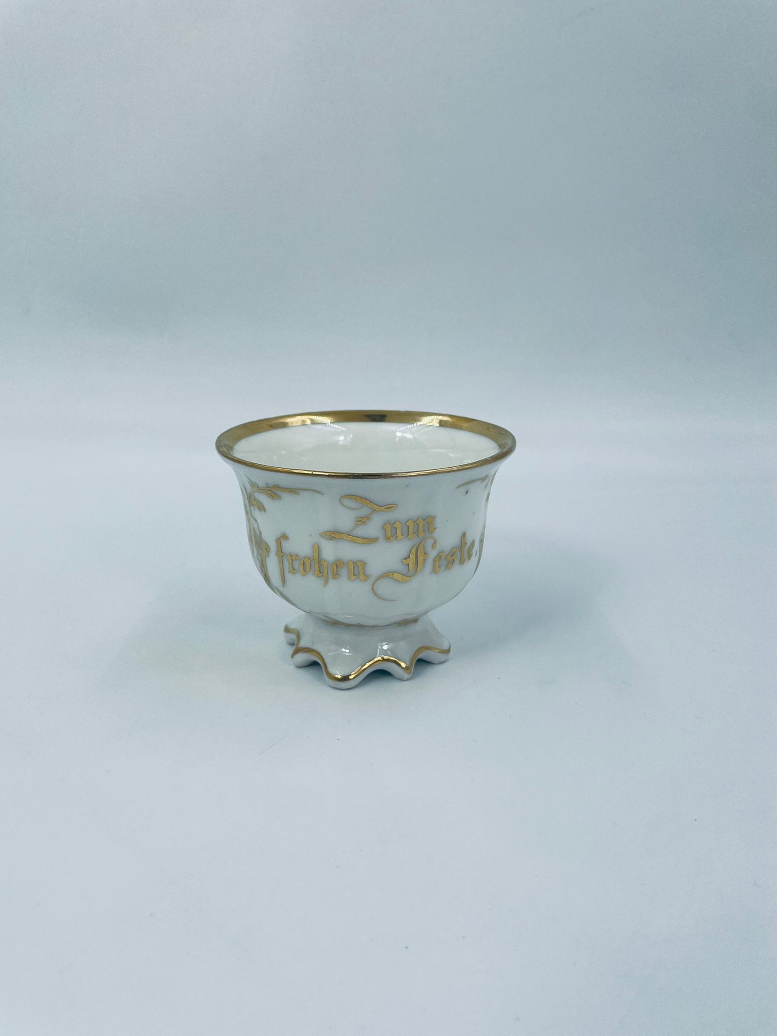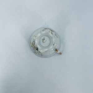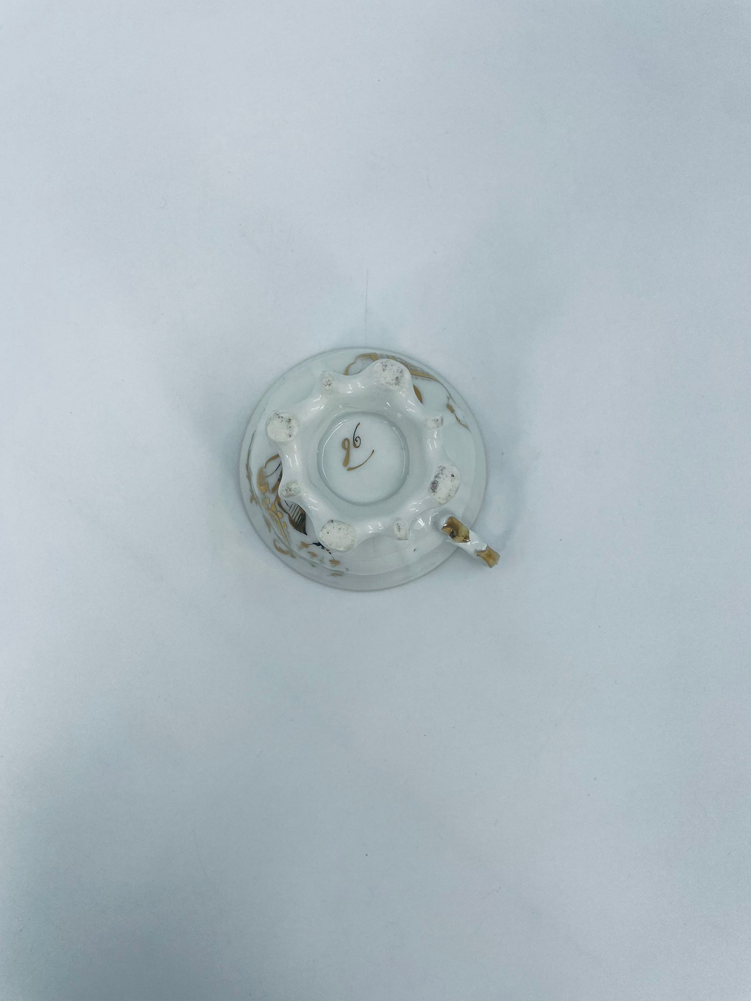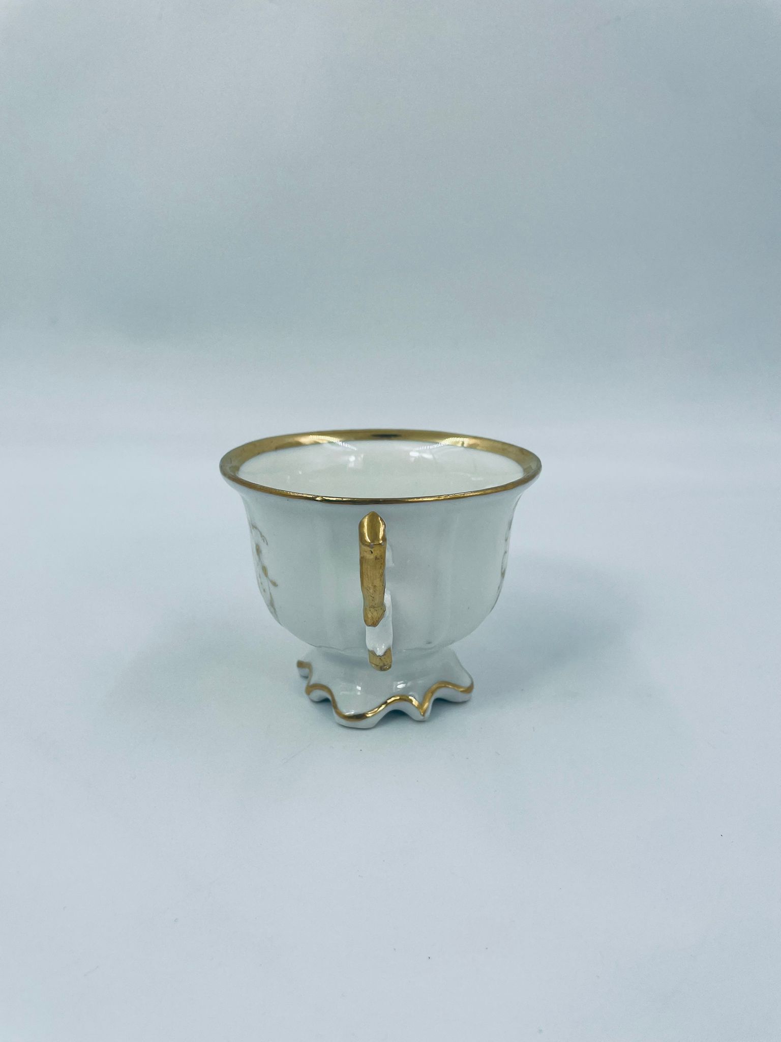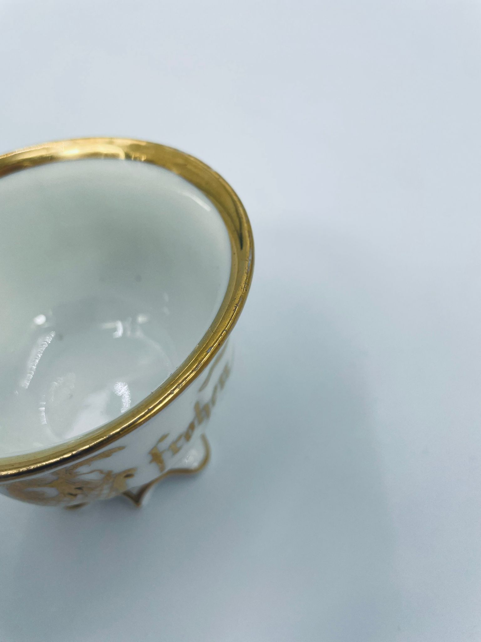 Filiżanka porcelanowa w stylu Vintage, wykonana z wysokiej jakości porcelany w kolorze ecru. Filiżanka charakteryzuje się złotymi zdobieniami, kaligraficznym napisem w złotym kolorze, ozdobnym uchwytem i podstawa, wykończona złoceniem na rantach. Posiada przetarcie na złoceniu.