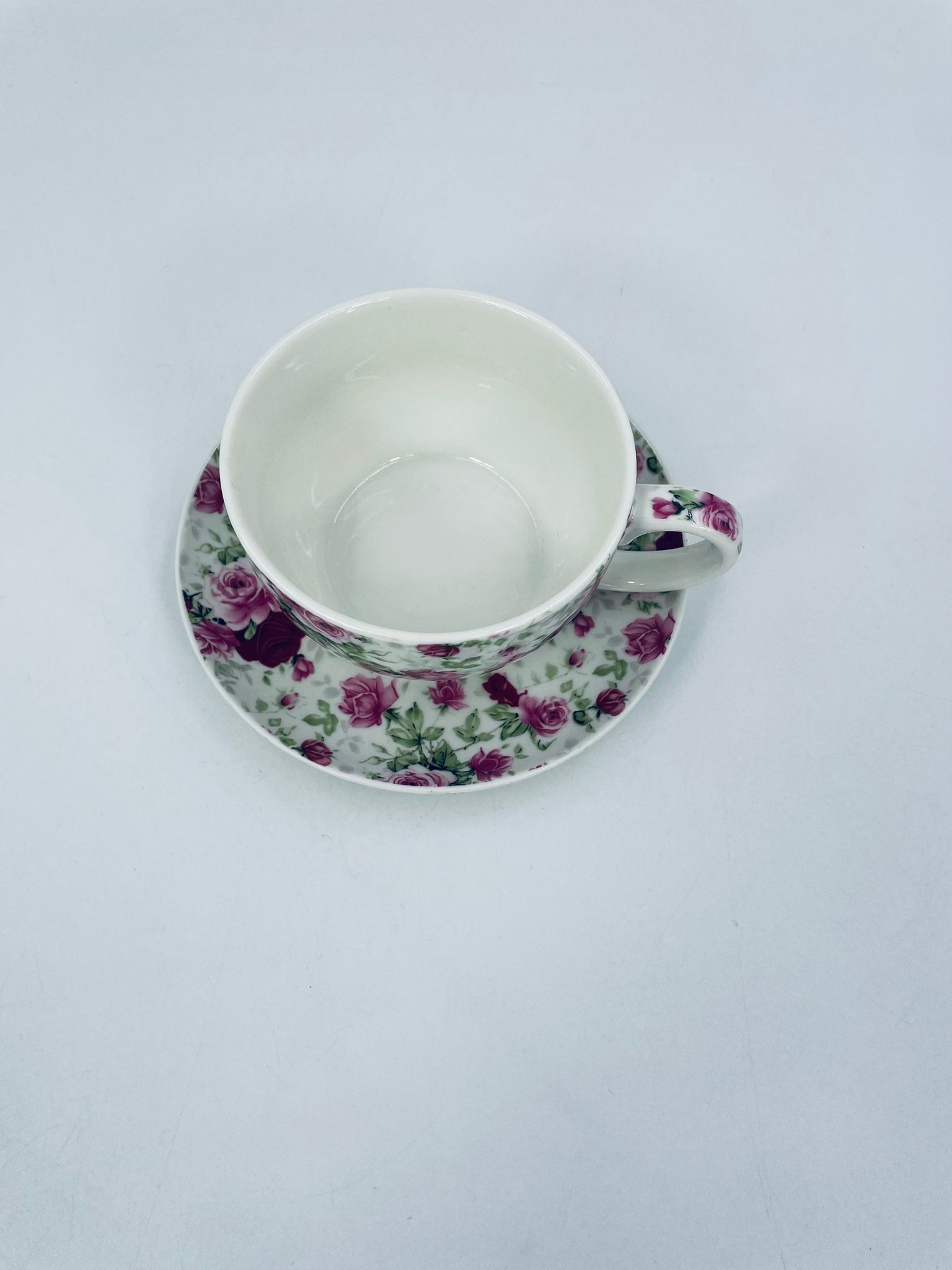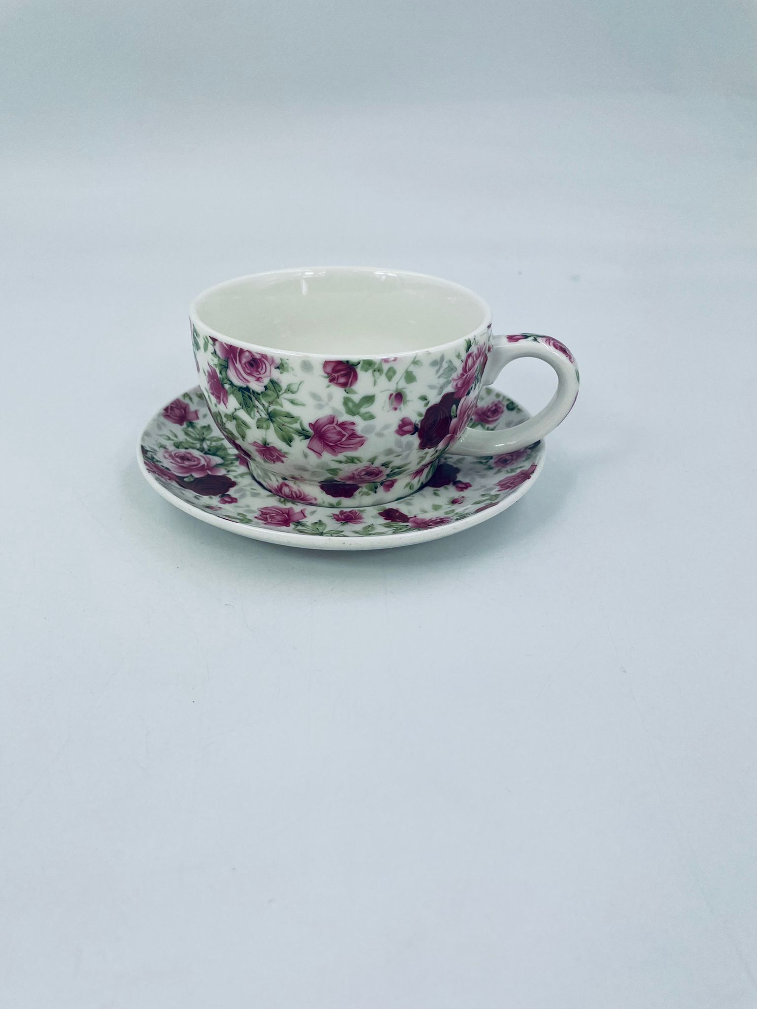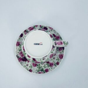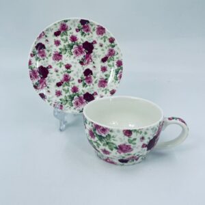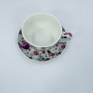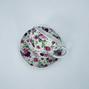 Filiżanka porcelanowa ze spodkiem, charakteryzuje się biały tłem, na którym jest piękny wzór różowych i bordowych róż z zielonymi listkami. Ceniona elegancja i piękna struktura.