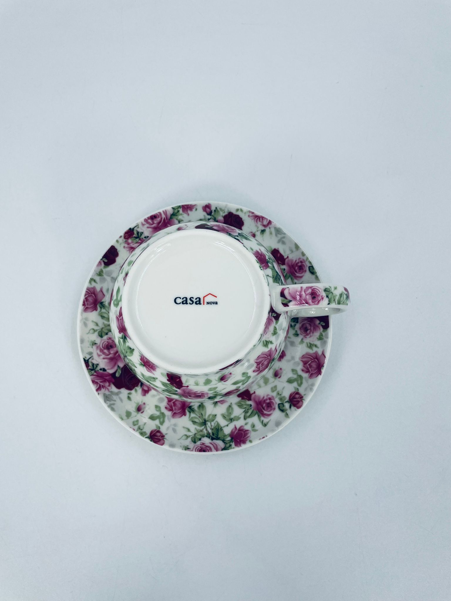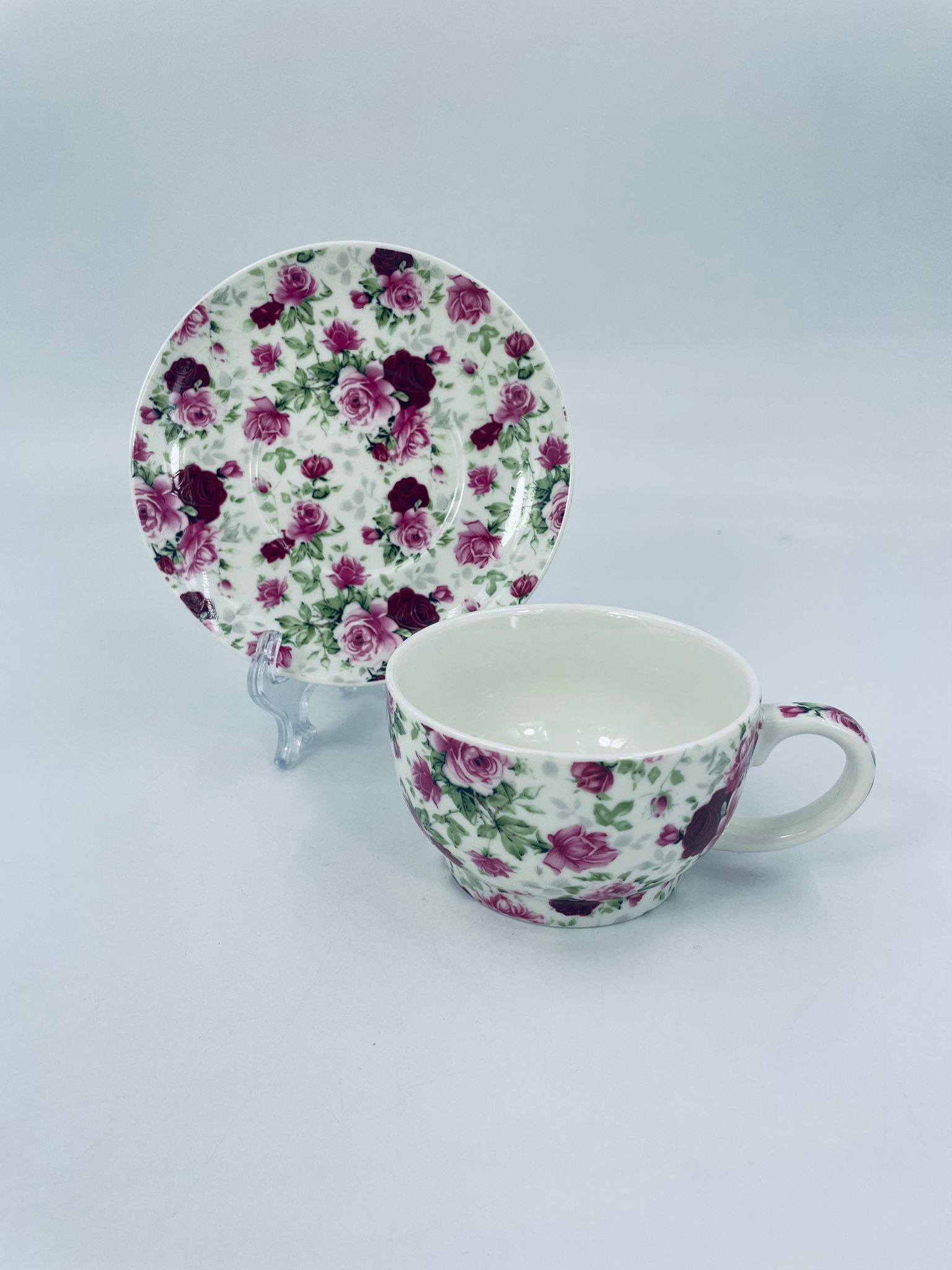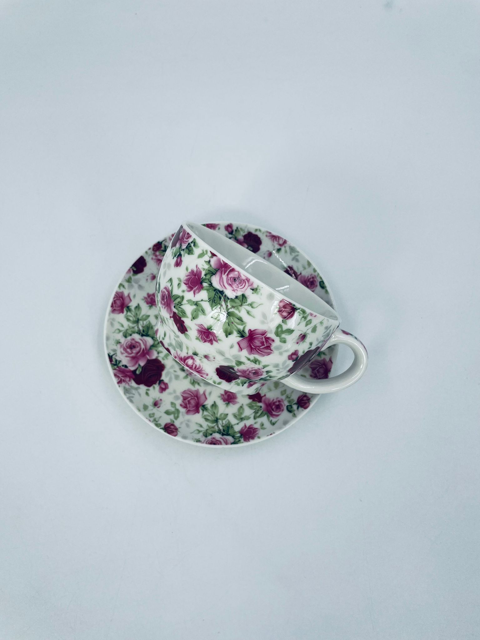 Filiżanka porcelanowa ze spodkiem, charakteryzuje się biały tłem, na którym jest piękny wzór różowych i bordowych róż z zielonymi listkami. Ceniona elegancja i piękna struktura.
