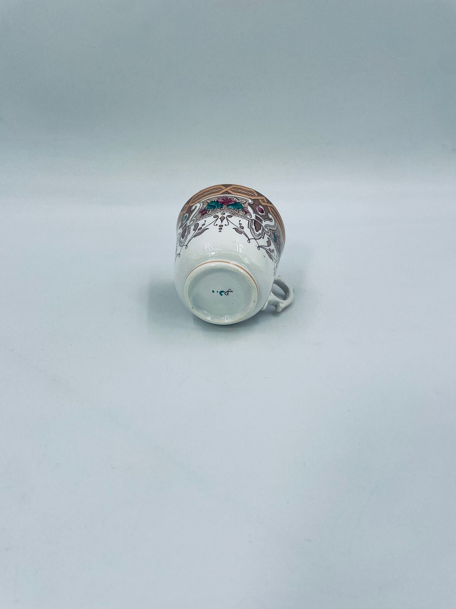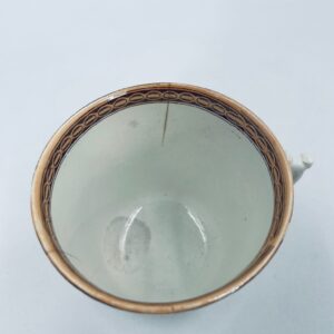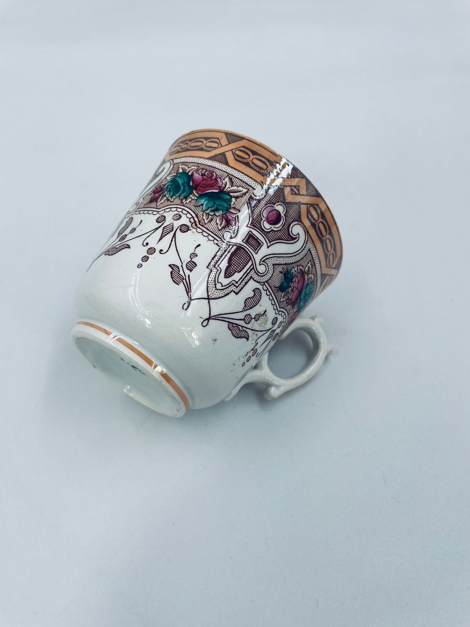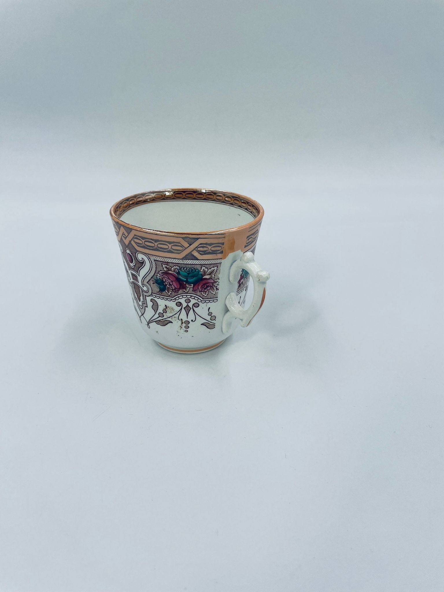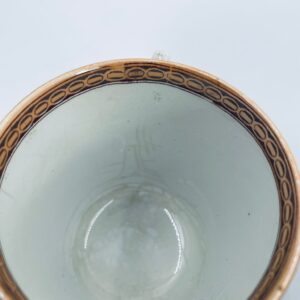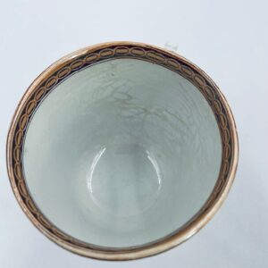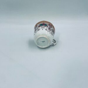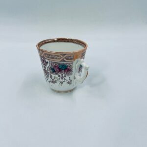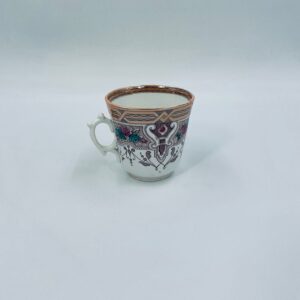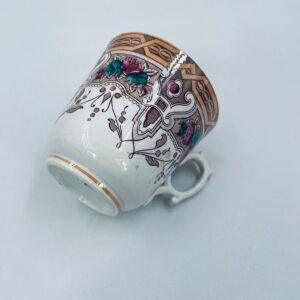 Filiżanka kolekcjonerska francuskiej wytworni Sarreguemines, wykonana z porcelany w kolorze ecru. Filizanka charakteryzuje się recznie malowanym, bogatym, wielokolorowym wzorem, który obejmuje zarówno motywy geometryczne, jak i kwiatowe, wykończona wzorem przy krawędzi. Posiada przetarcia, przebarwienia i pęknięcia.