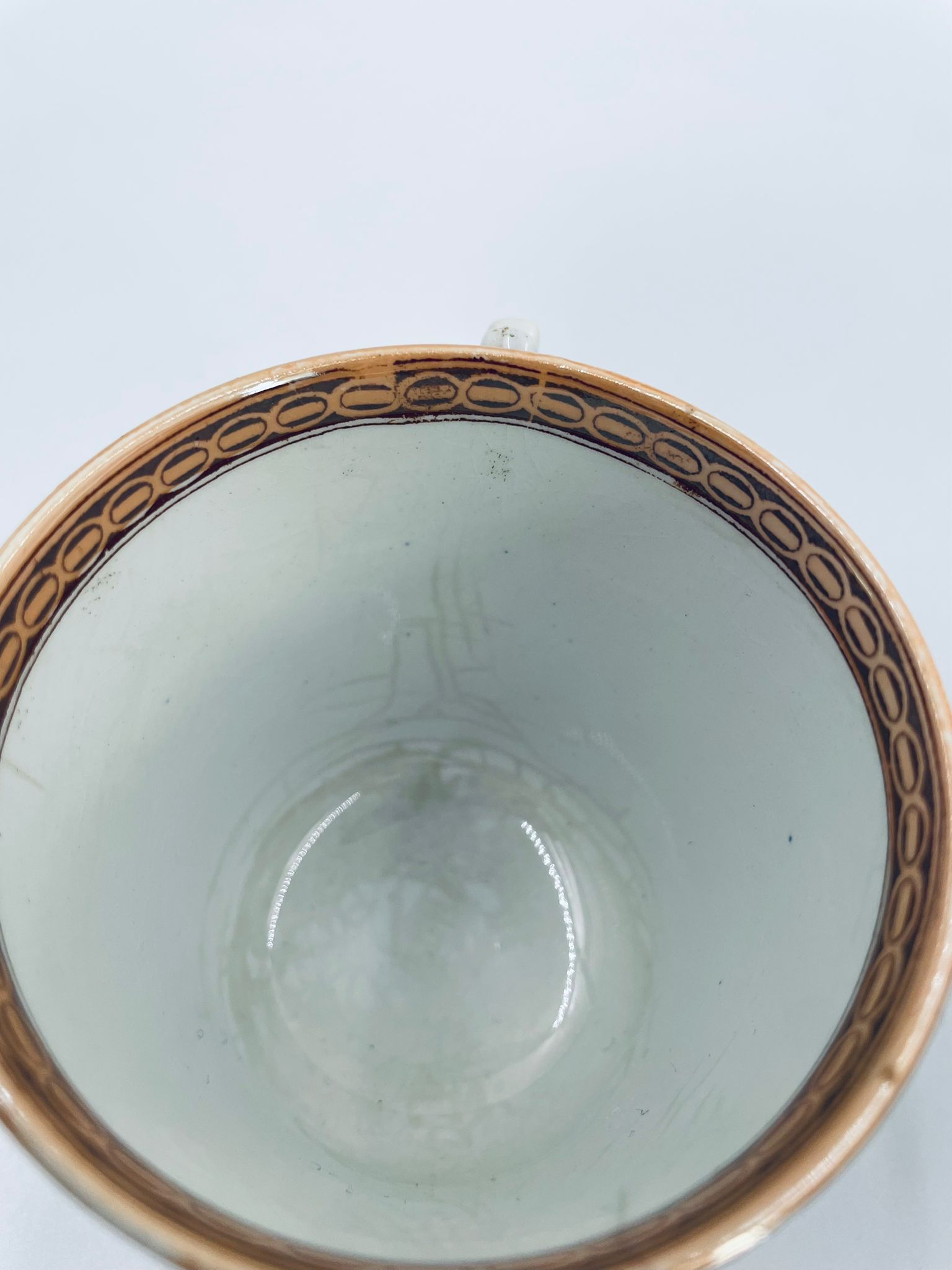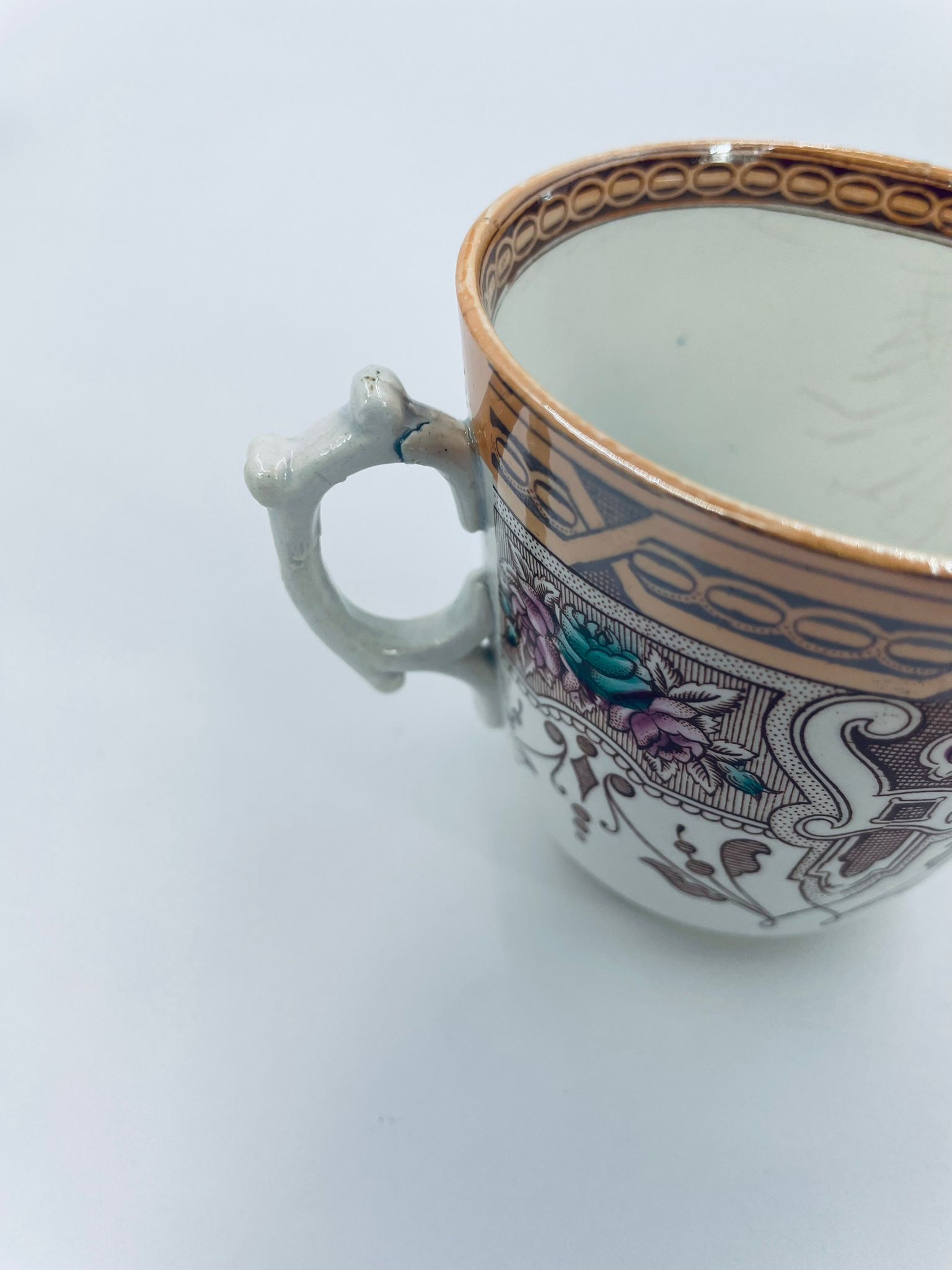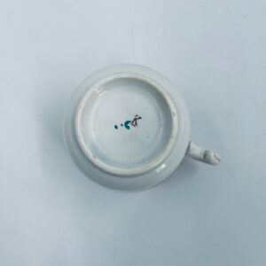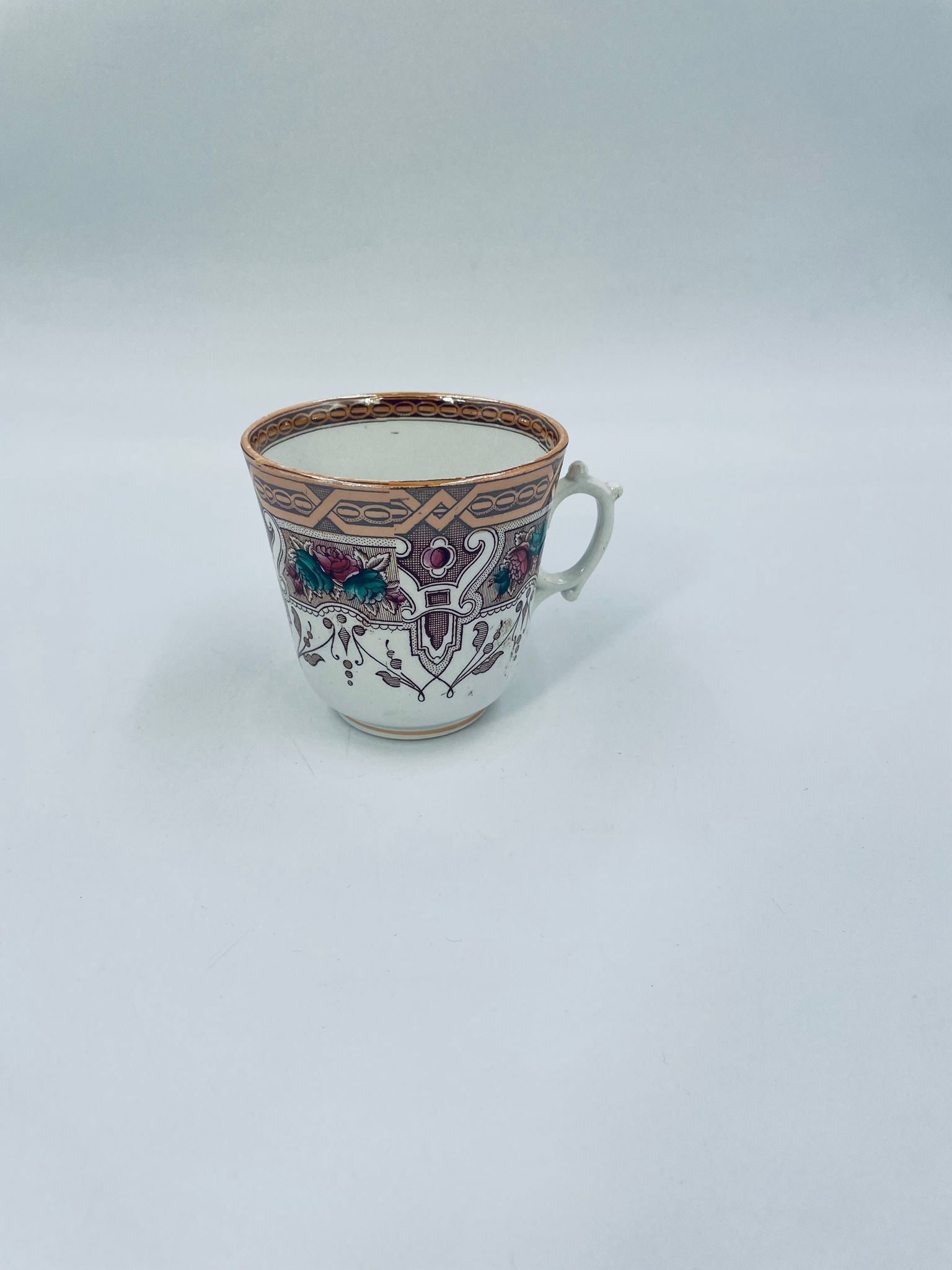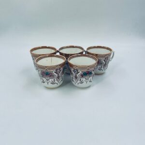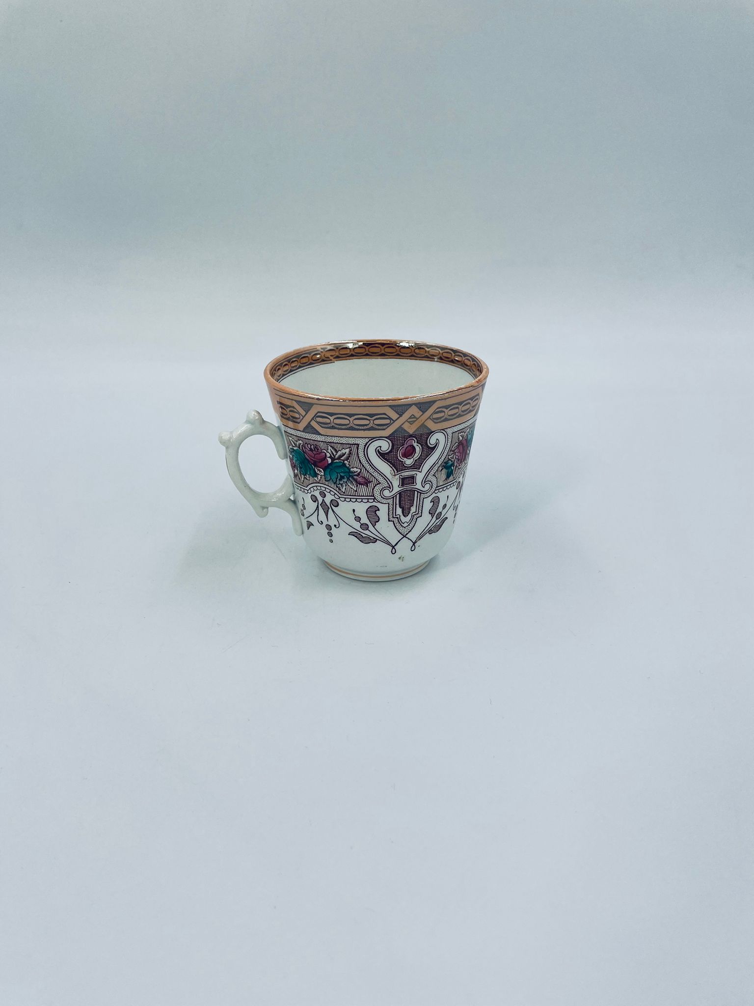 Filiżanka kolekcjonerska francuskiej wytworni Sarreguemines, wykonana z porcelany w kolorze ecru. Filizanka charakteryzuje się recznie malowanym, bogatym, wielokolorowym wzorem, który obejmuje zarówno motywy geometryczne, jak i kwiatowe, wykończona wzorem przy krawędzi. Posiada przetarcia, przebarwienia i pęknięcia.