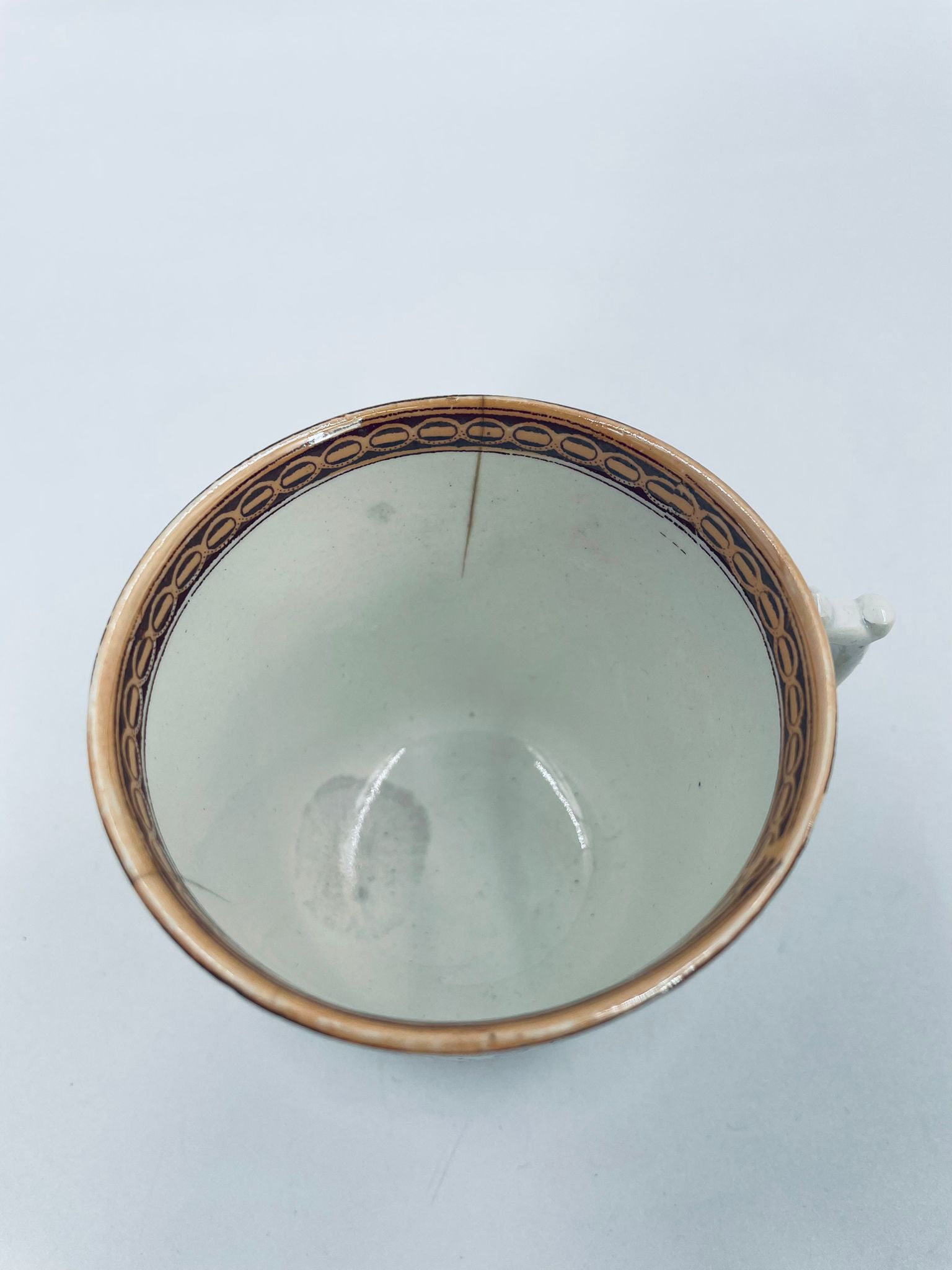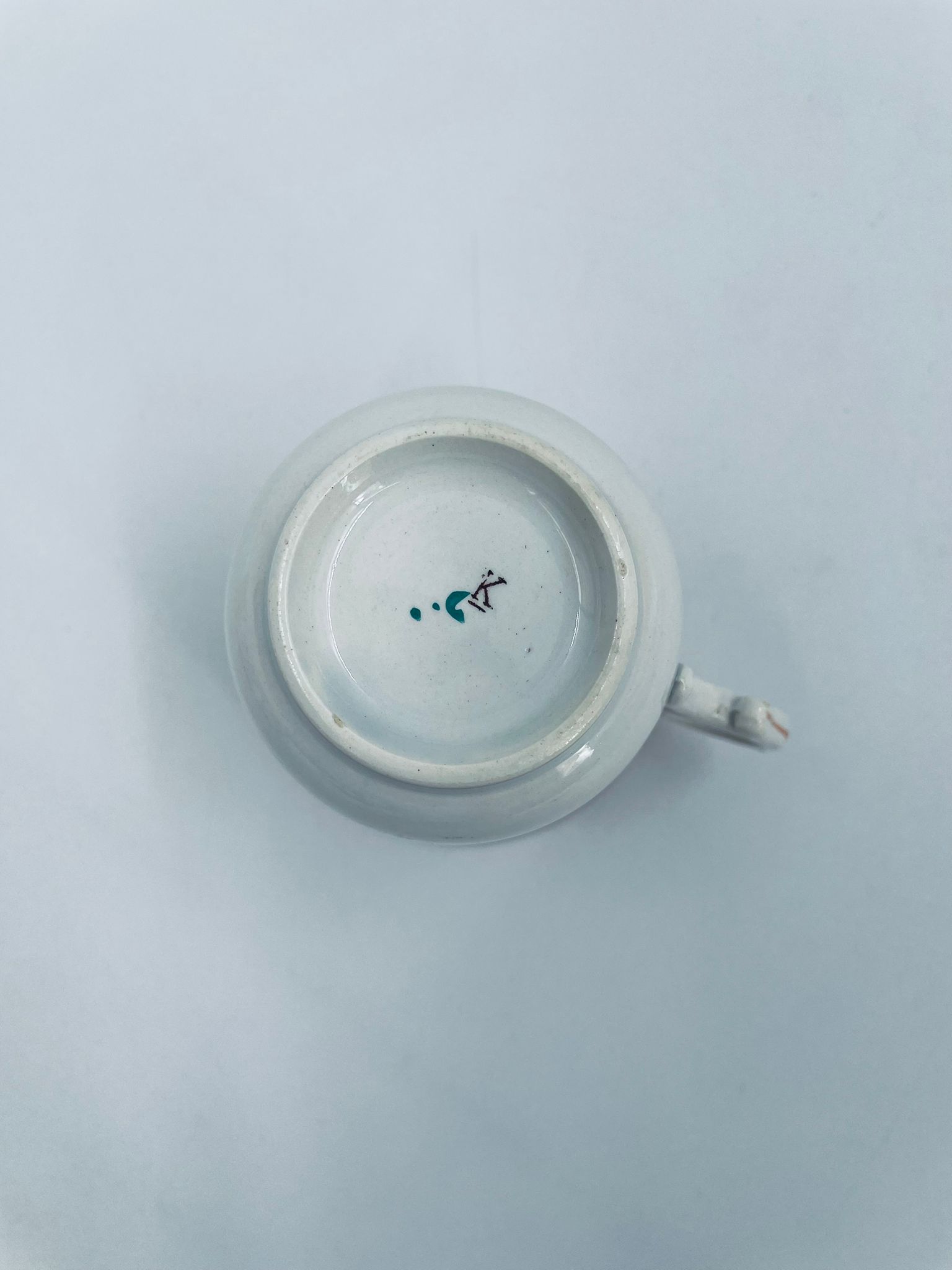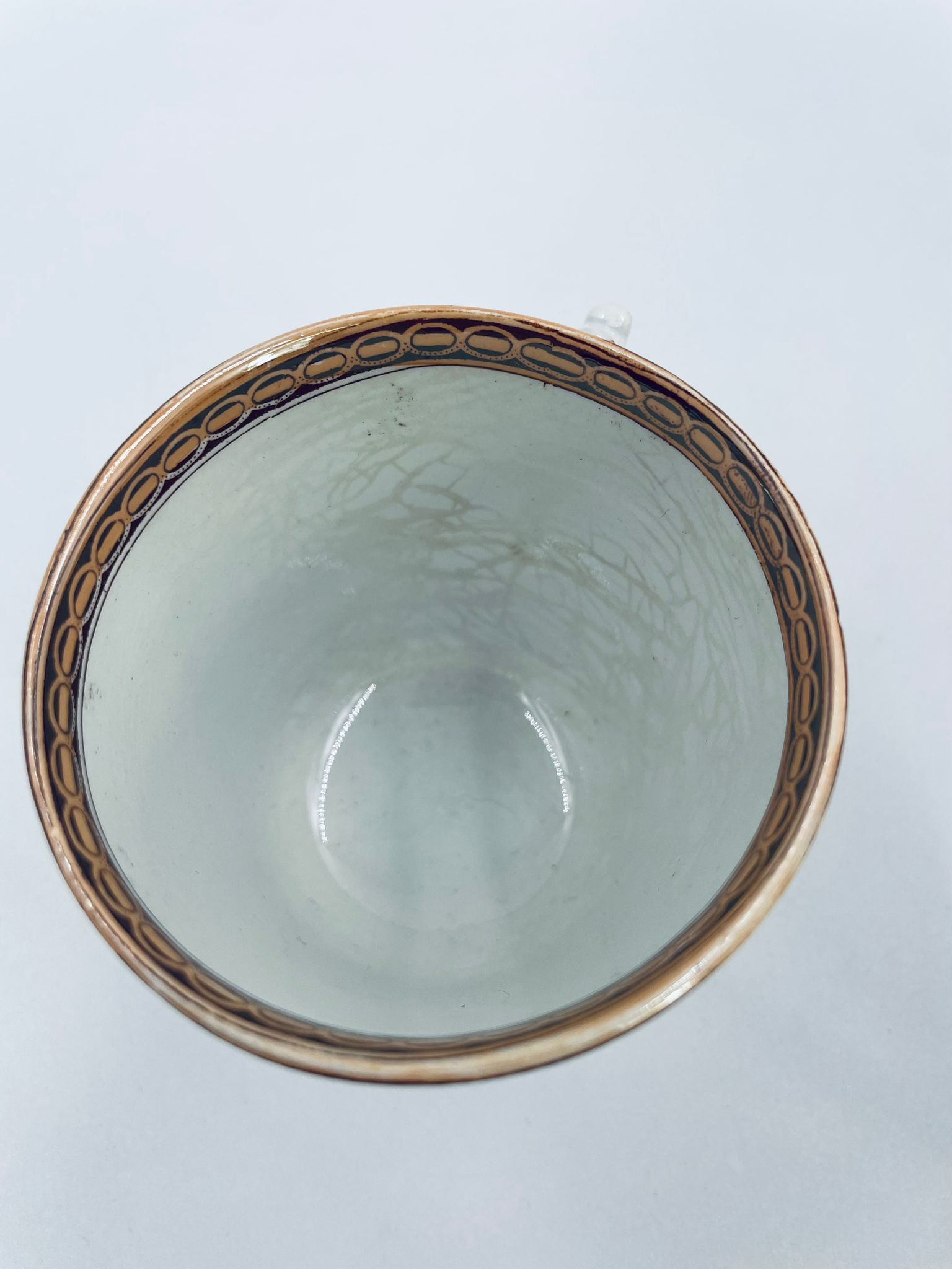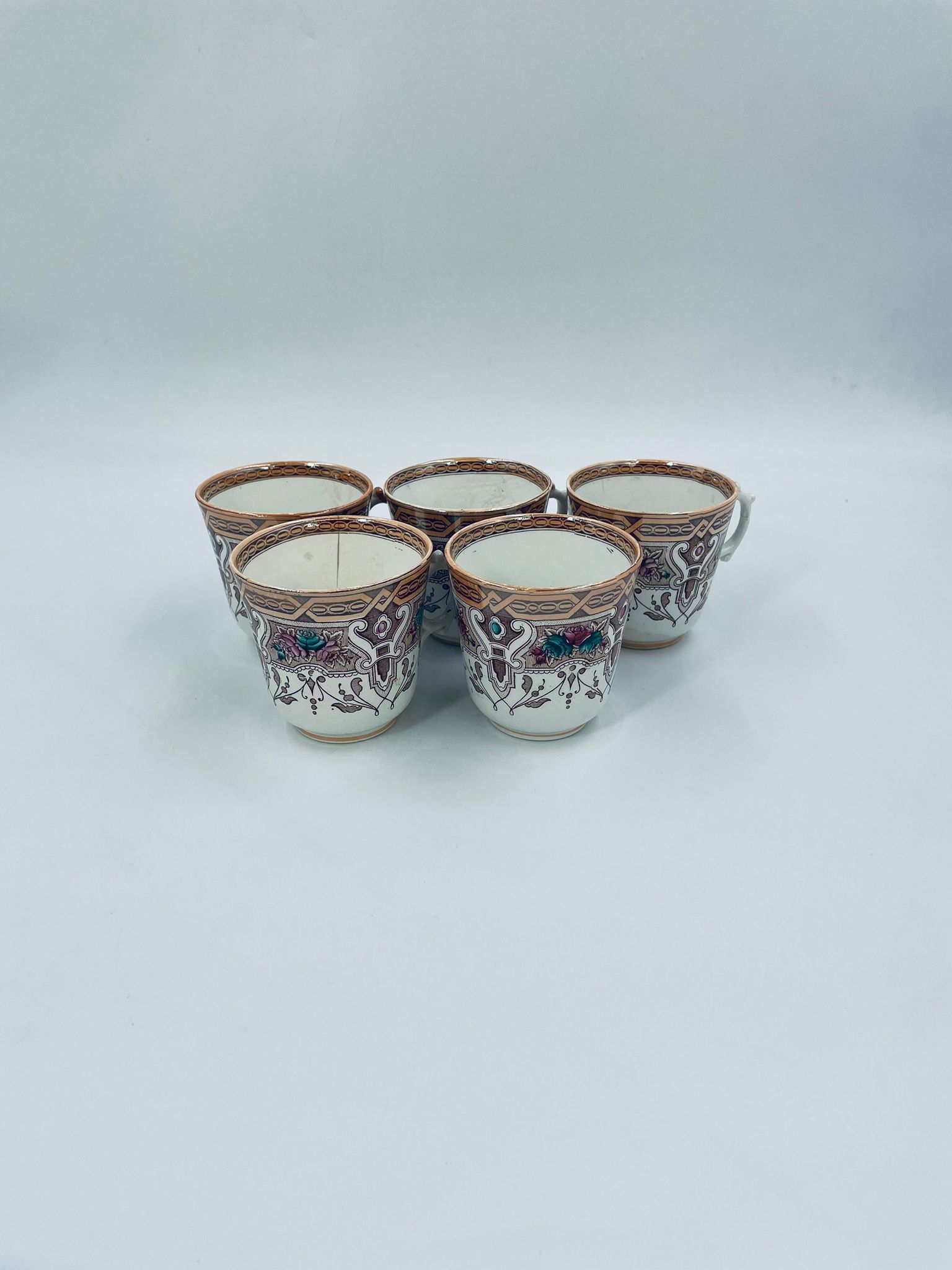 Filiżanka kolekcjonerska francuskiej wytworni Sarreguemines, wykonana z porcelany w kolorze ecru. Filizanka charakteryzuje się recznie malowanym, bogatym, wielokolorowym wzorem, który obejmuje zarówno motywy geometryczne, jak i kwiatowe, wykończona wzorem przy krawędzi. Posiada przetarcia, przebarwienia i pęknięcia.