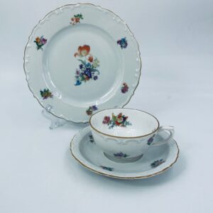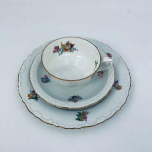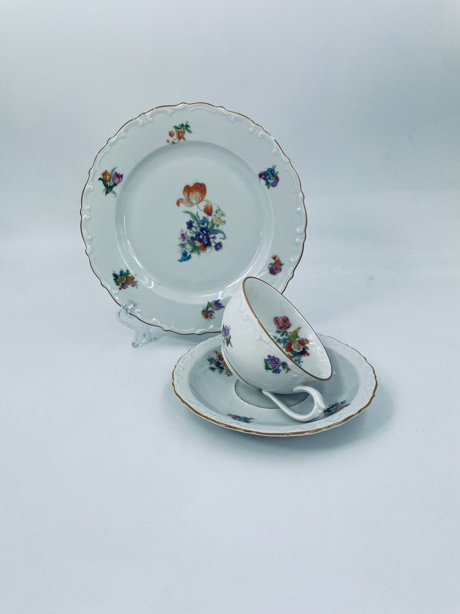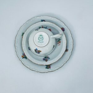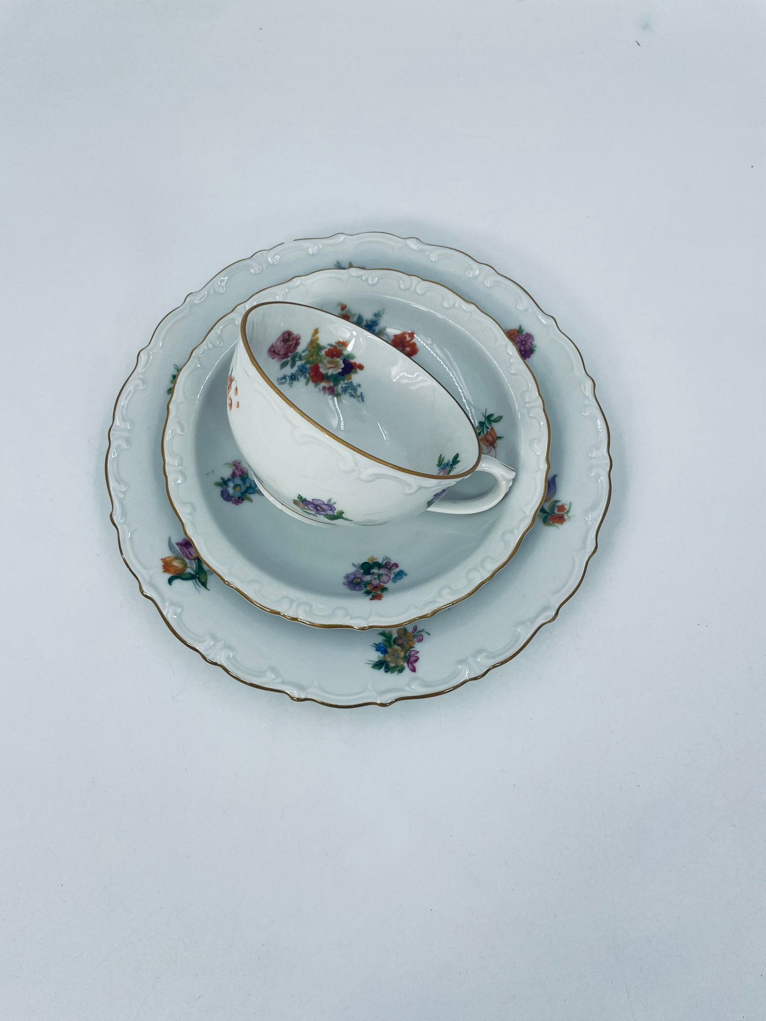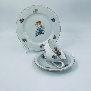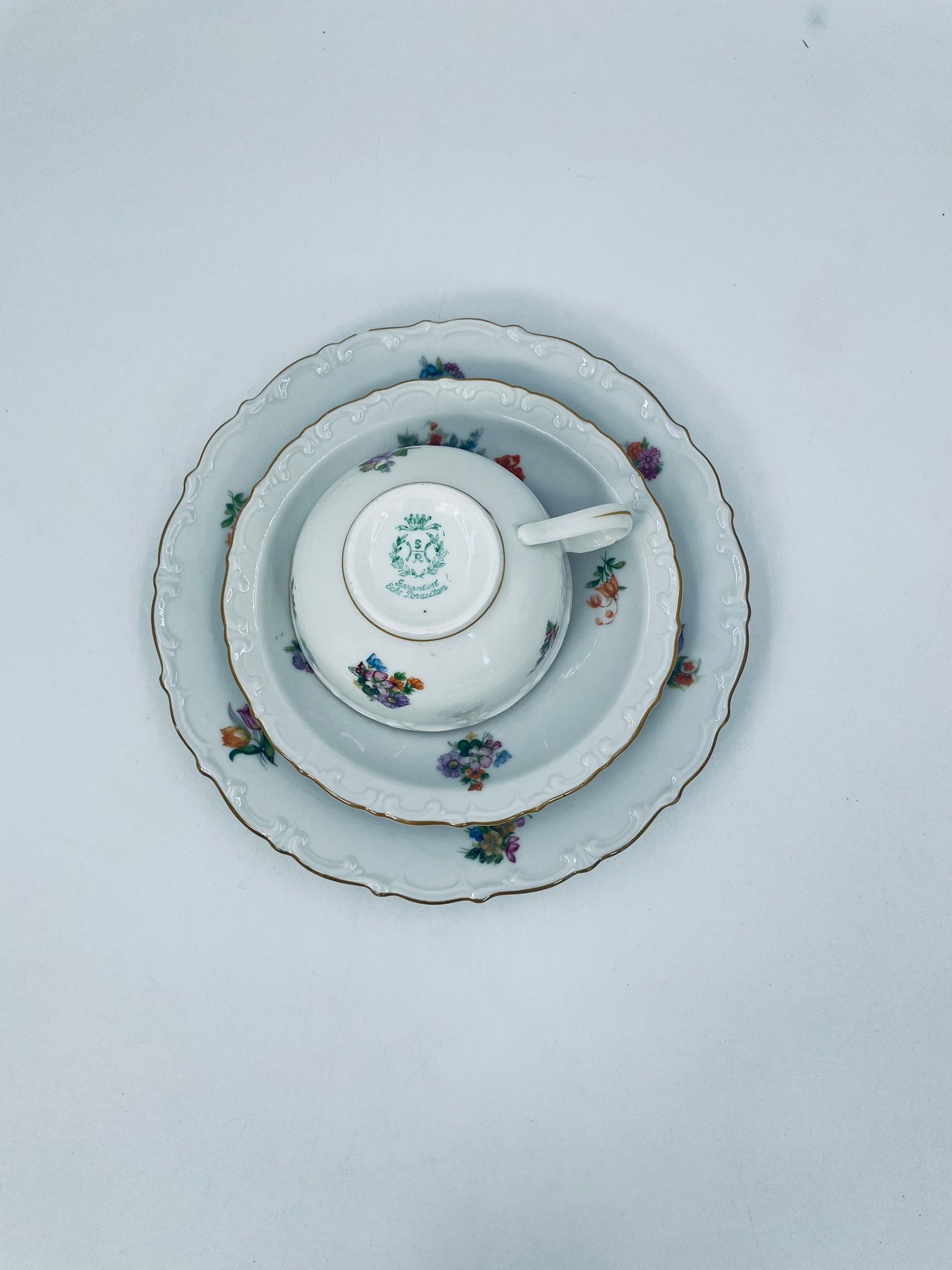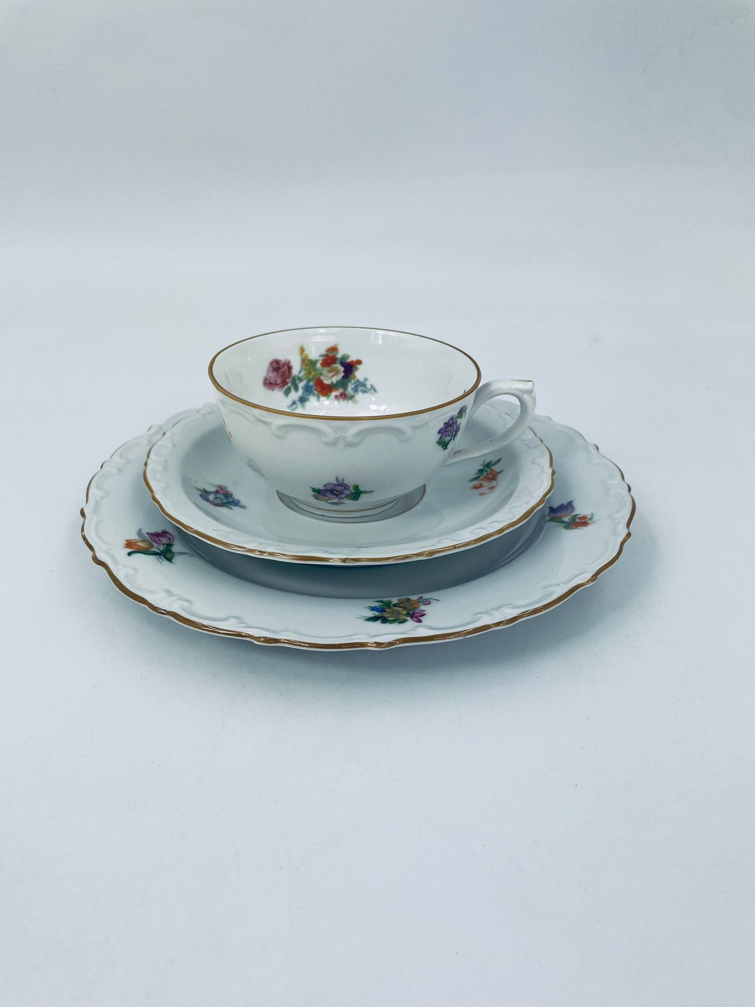 Filiżanka kolekcjonerska SR Echt Porzellan w zestawie trio, porcelana w białym kolorze charakteryzuje sie delikatnymi zdobieniami kwiatowymi i złoconymi detalami, wykończona złoceniami na rantach.