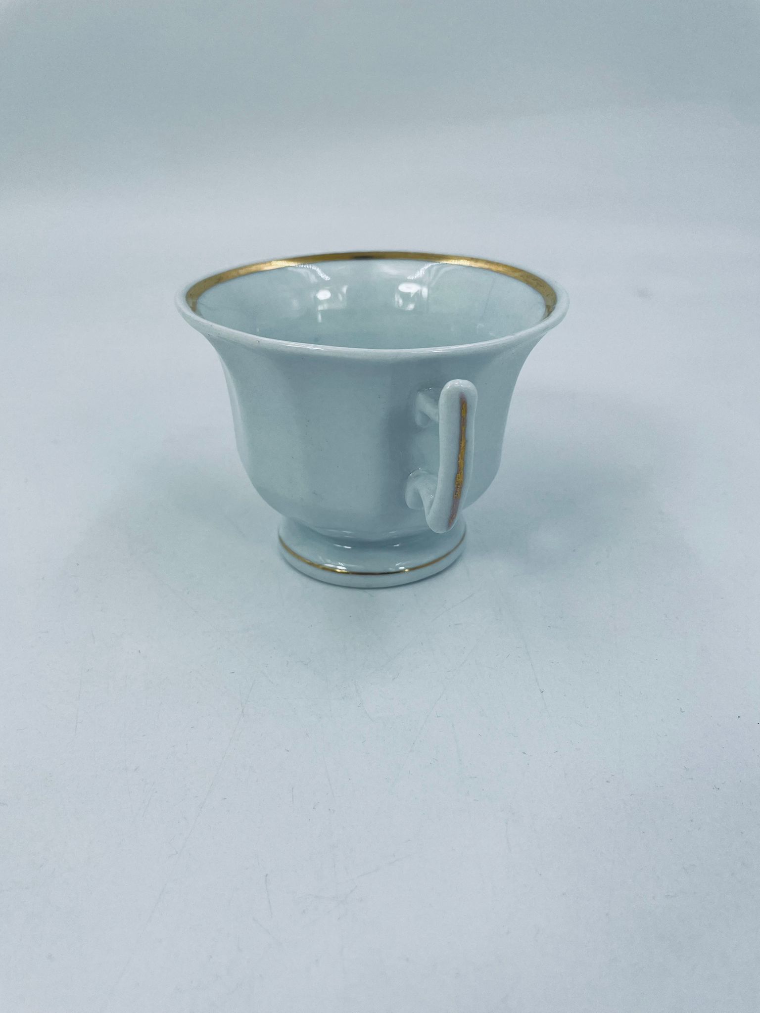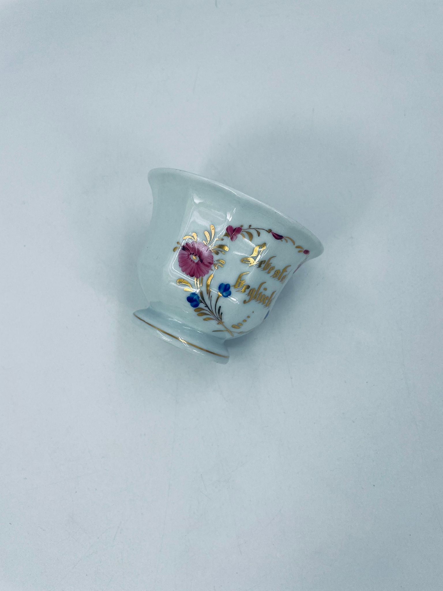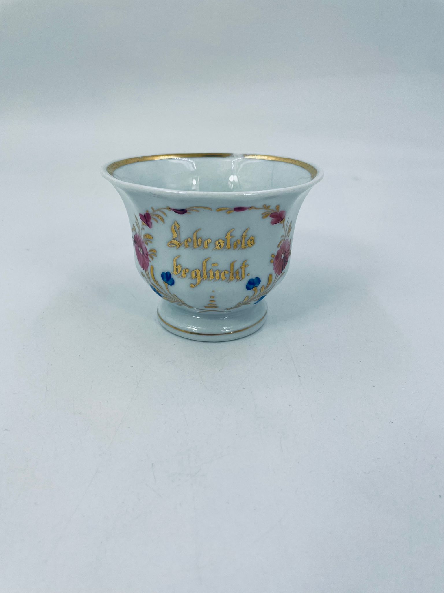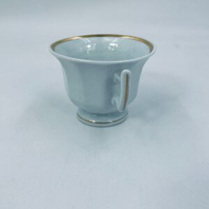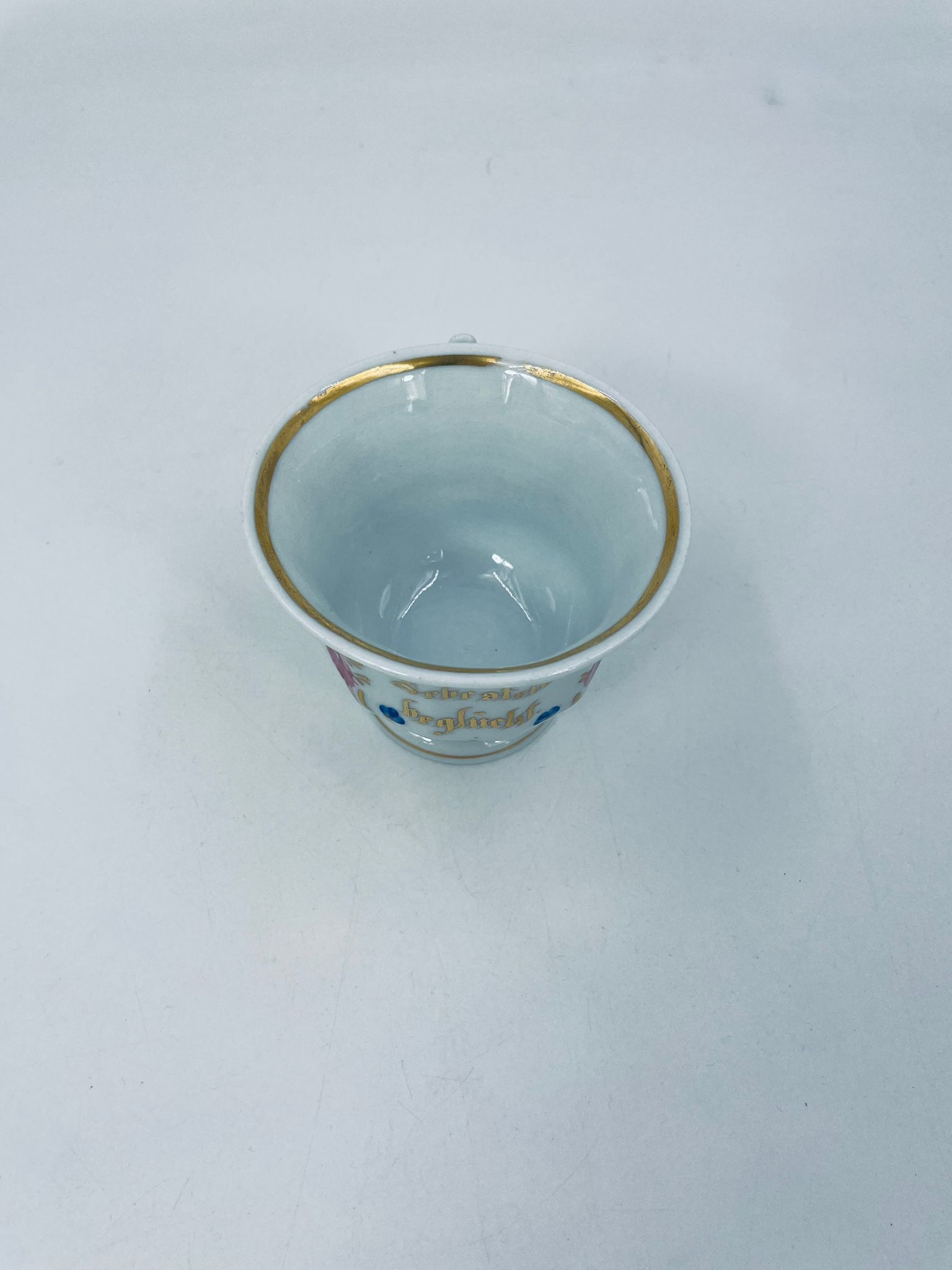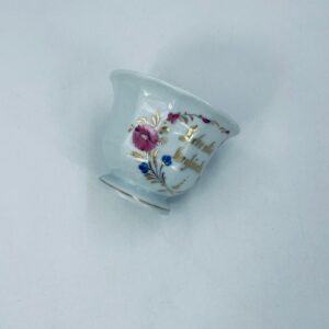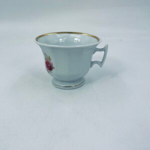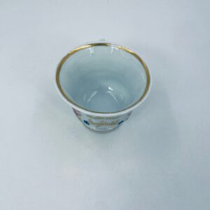 Filiżanka kolekcjonerska w stylu Vintage z białej porcelany. Filiżanka ma kaligraficzne napisy oraz kwiatowe zdobienia, wykończona złoceniami na górnym rancie w środku filiżanki i na podstawie. Delikatne przetarcia na złoceniach.