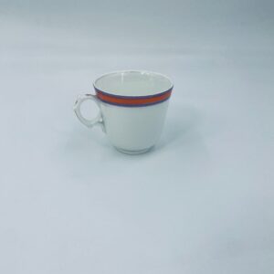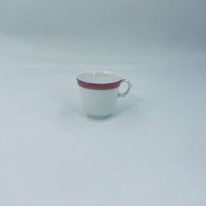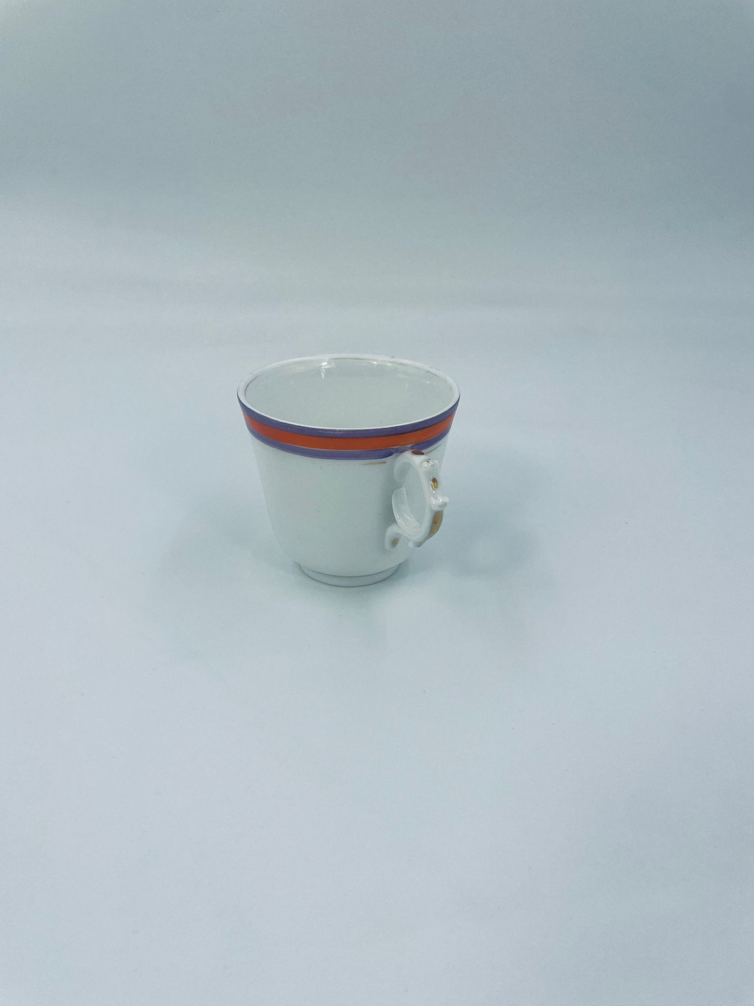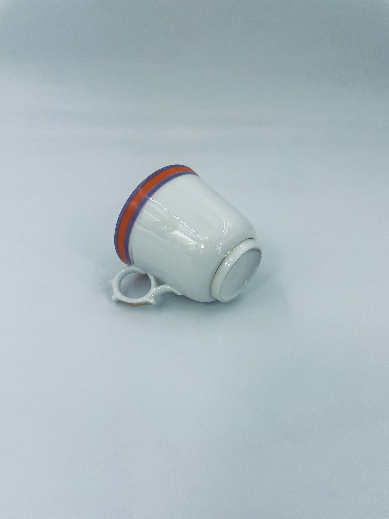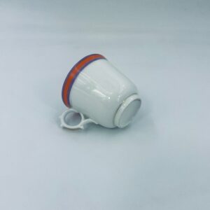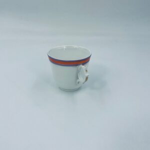 Filiżanka kolekcjonerska wykonana z białej porcelany ze wzorem pasków w kolorze fioletu i pomarańczy. Krawędź filiżanki, podstawa oraz uchwyt wykończony złoceniem. Filiżanka posiada przetarcia na złoceniach i na paskach.