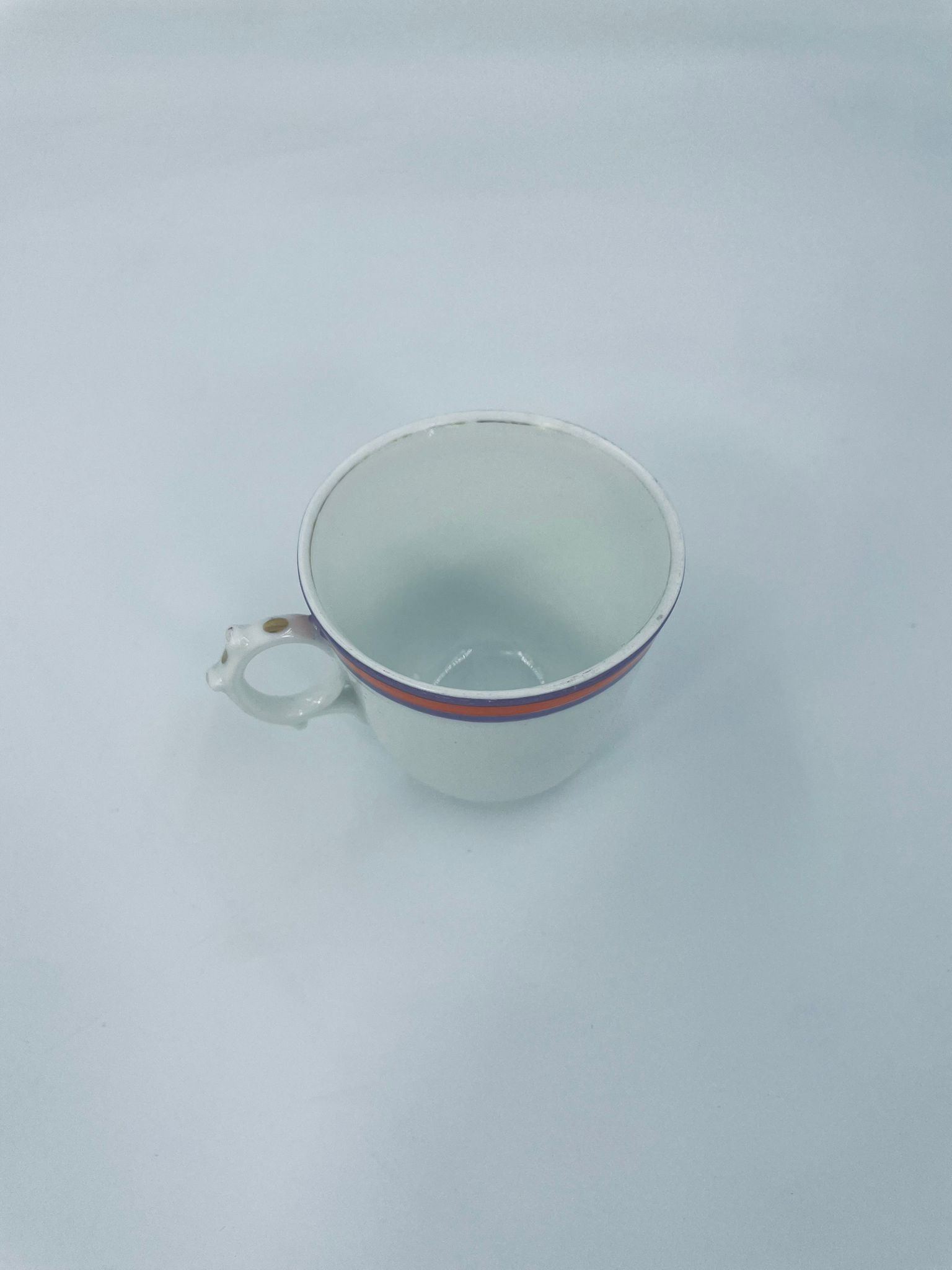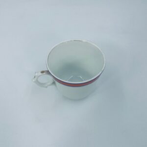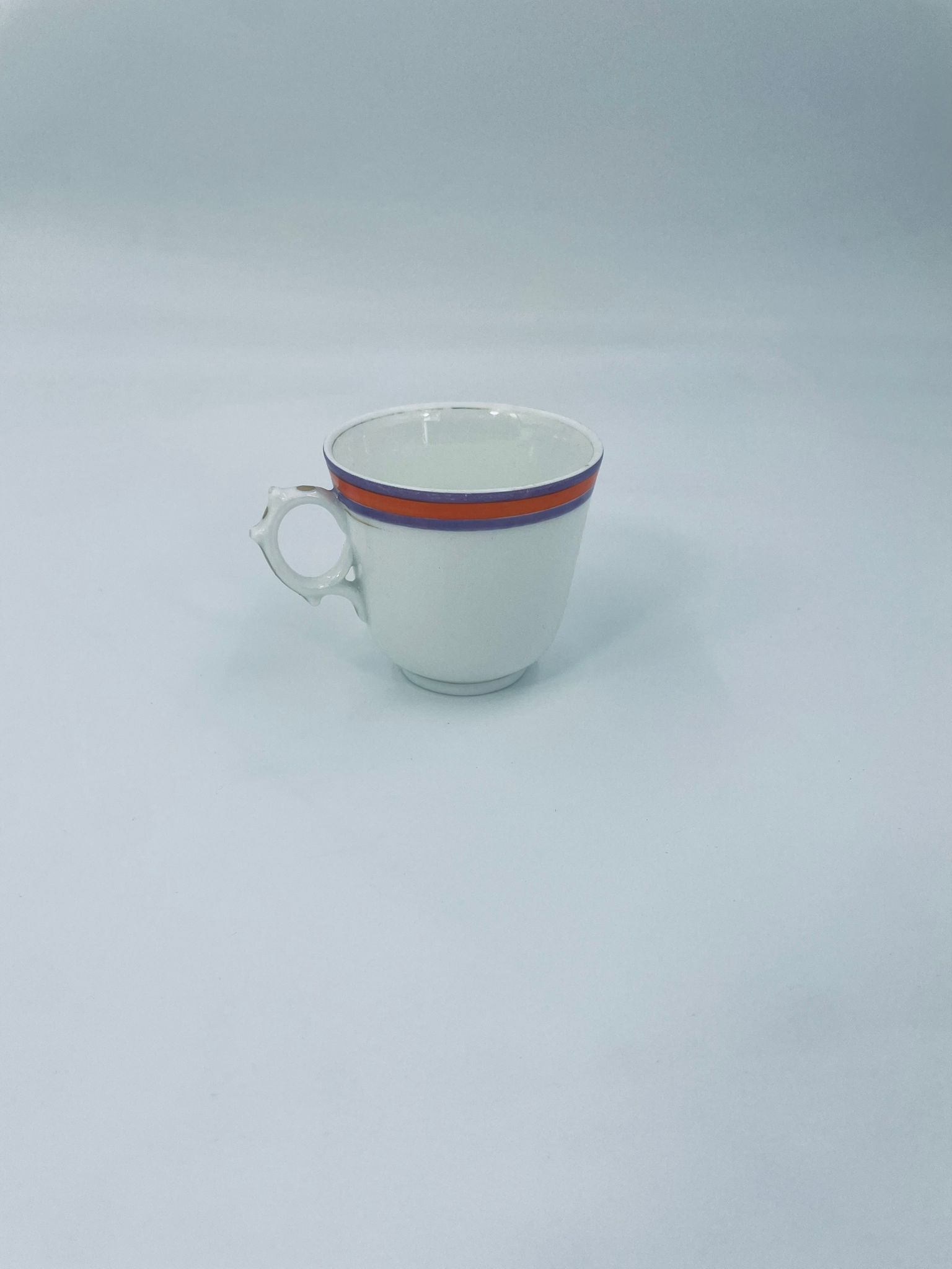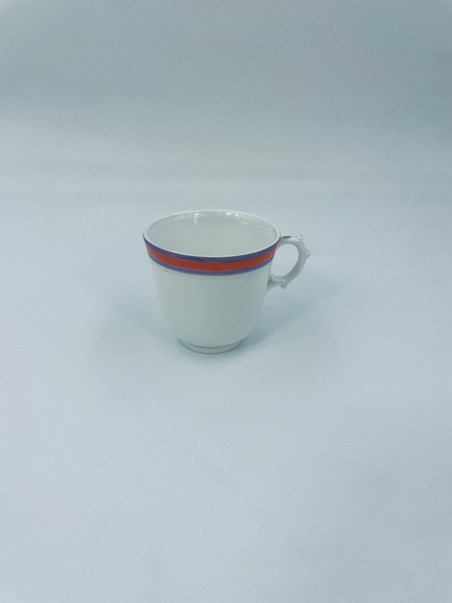 Filiżanka kolekcjonerska wykonana z białej porcelany ze wzorem pasków w kolorze fioletu i pomarańczy. Krawędź filiżanki, podstawa oraz uchwyt wykończony złoceniem. Filiżanka posiada przetarcia na złoceniach i na paskach.