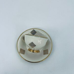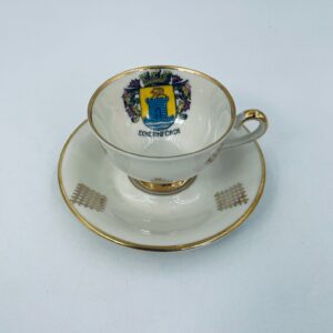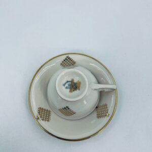 Filiżanka porcelanowa w zestawie duo wytwórni Handausgemalt. Porcelana w kolorze ercu ze złotymi wzorami, wykończona złoceniami na rantach. Filiżanka w środku posiada zdobienie w postaci herbu z napisem „Eckernförde” oraz złocenie na podstawie.