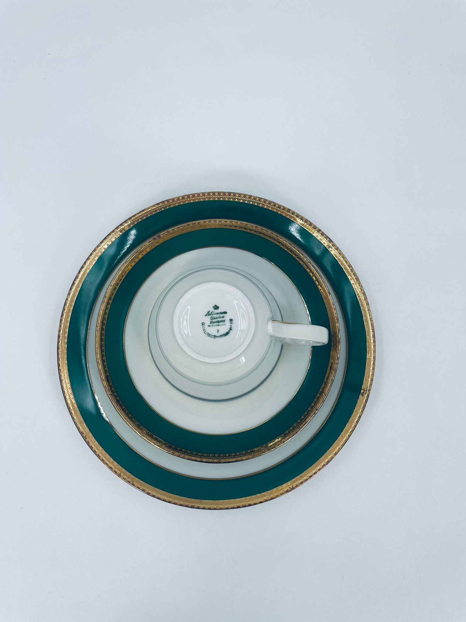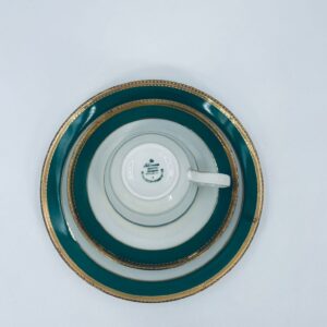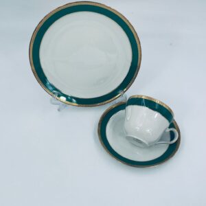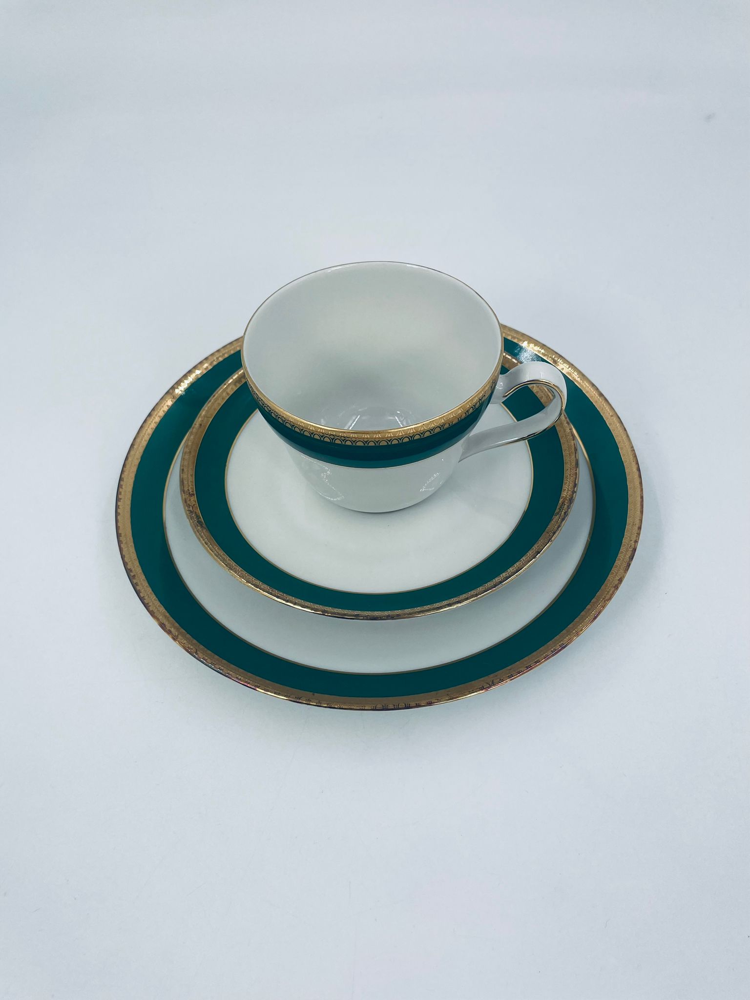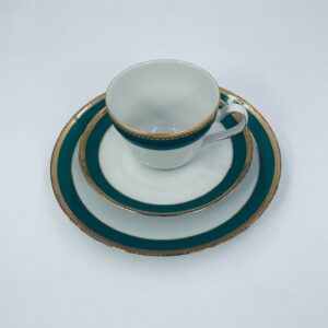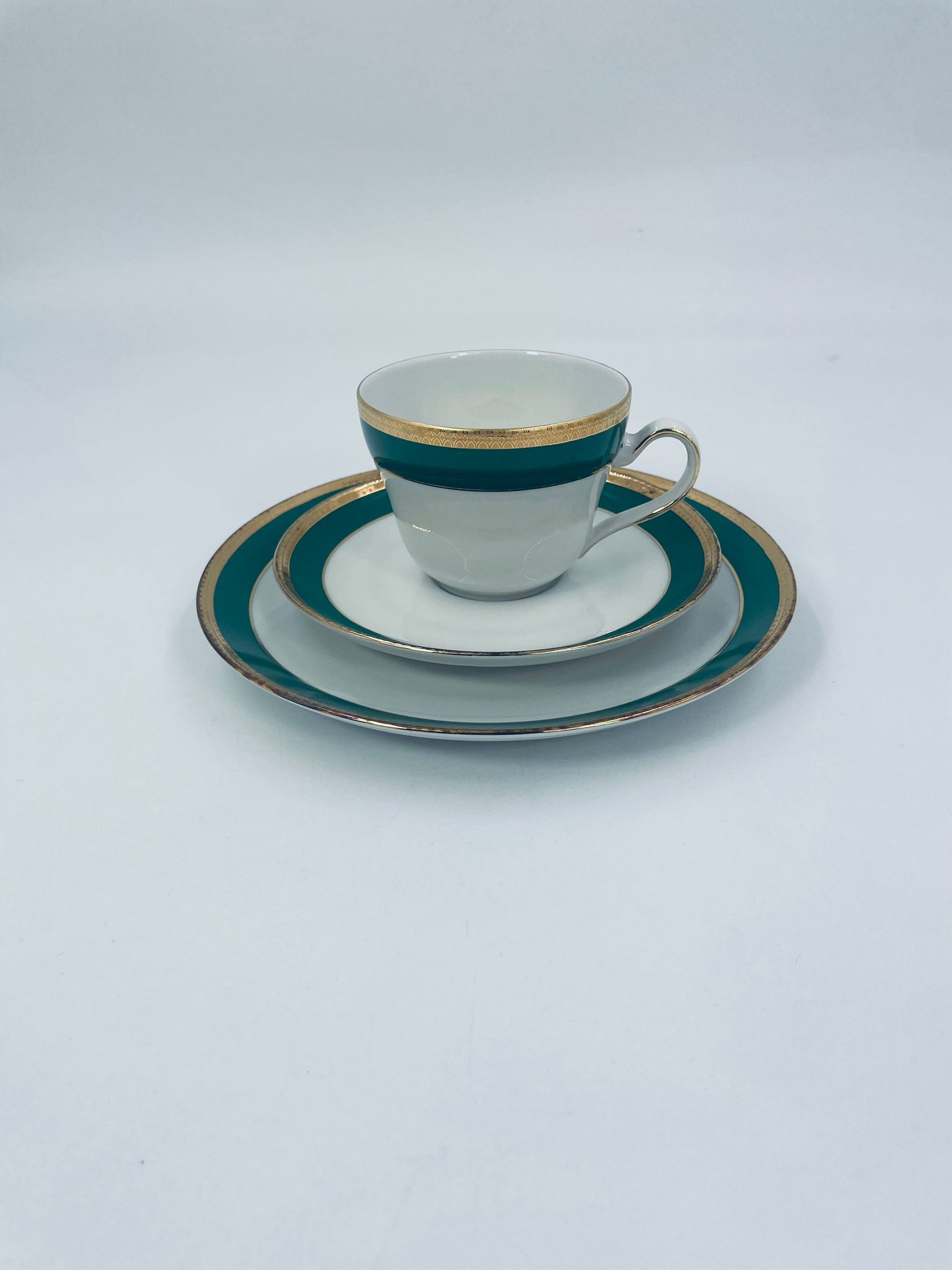 Filiżanka w zestawie trio wytwórni Seltmann Weiden. Porcelana w kolorze białym, wykończona kolorem zielonym oraz złoceniami z wzorem.