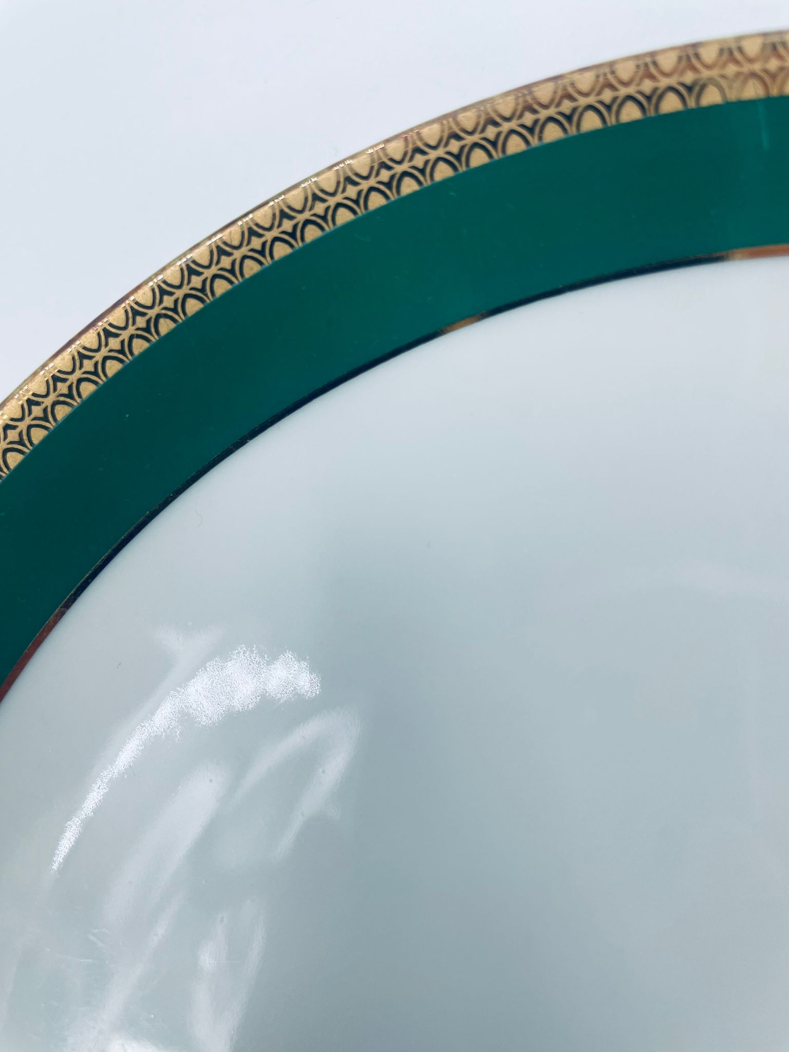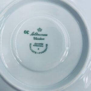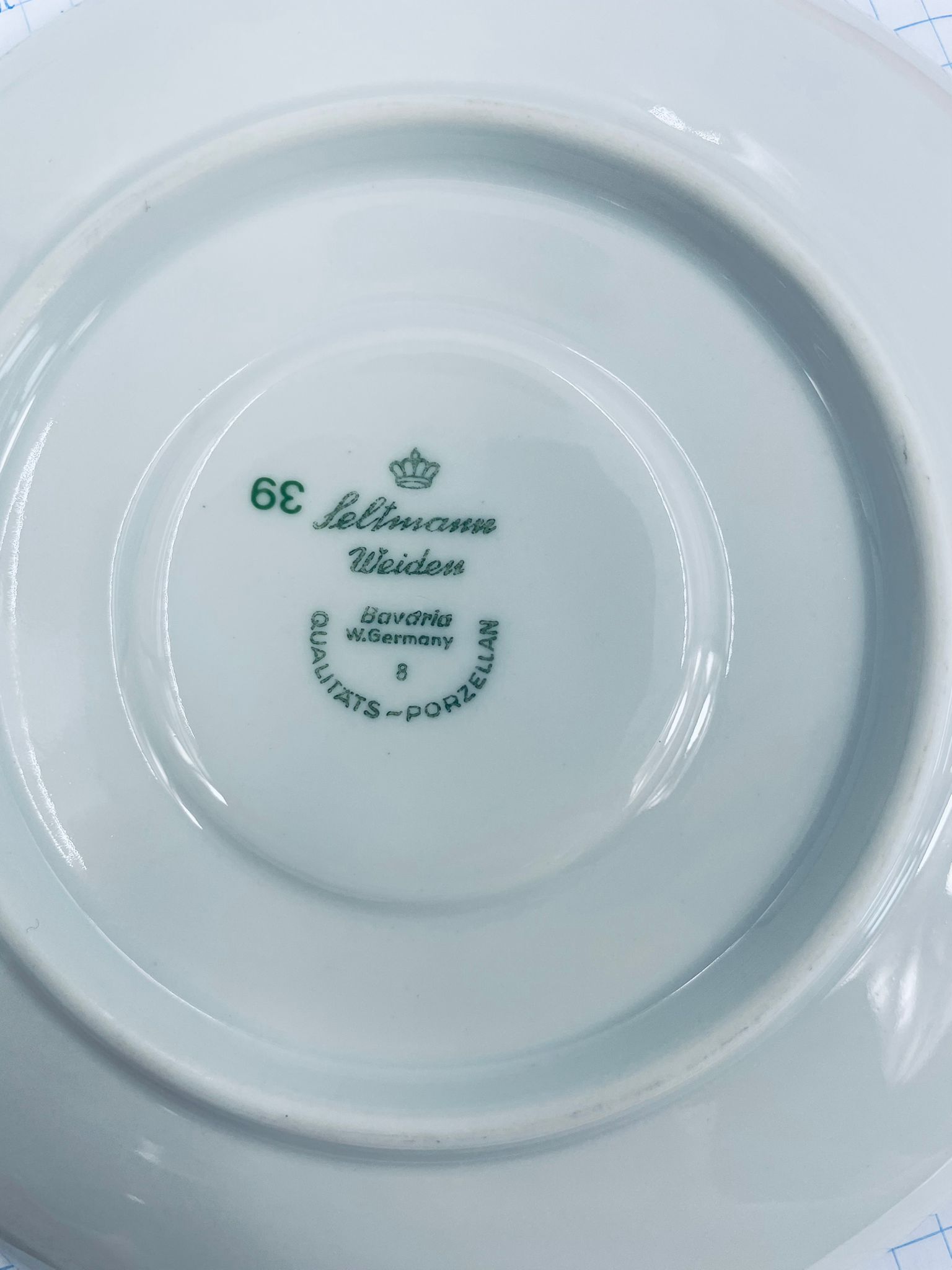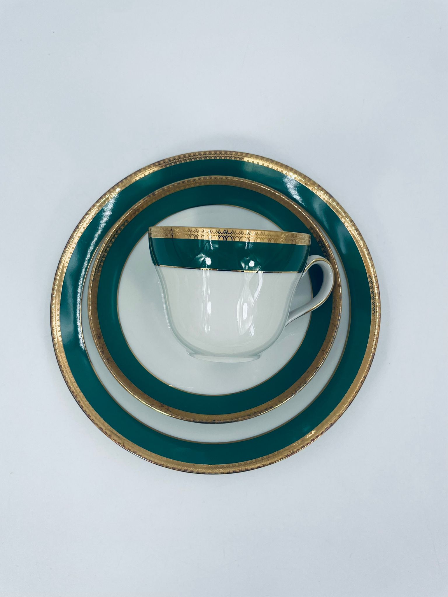 Filiżanka w zestawie trio wytwórni Seltmann Weiden. Porcelana w kolorze białym, wykończona kolorem zielonym oraz złoceniami z wzorem.