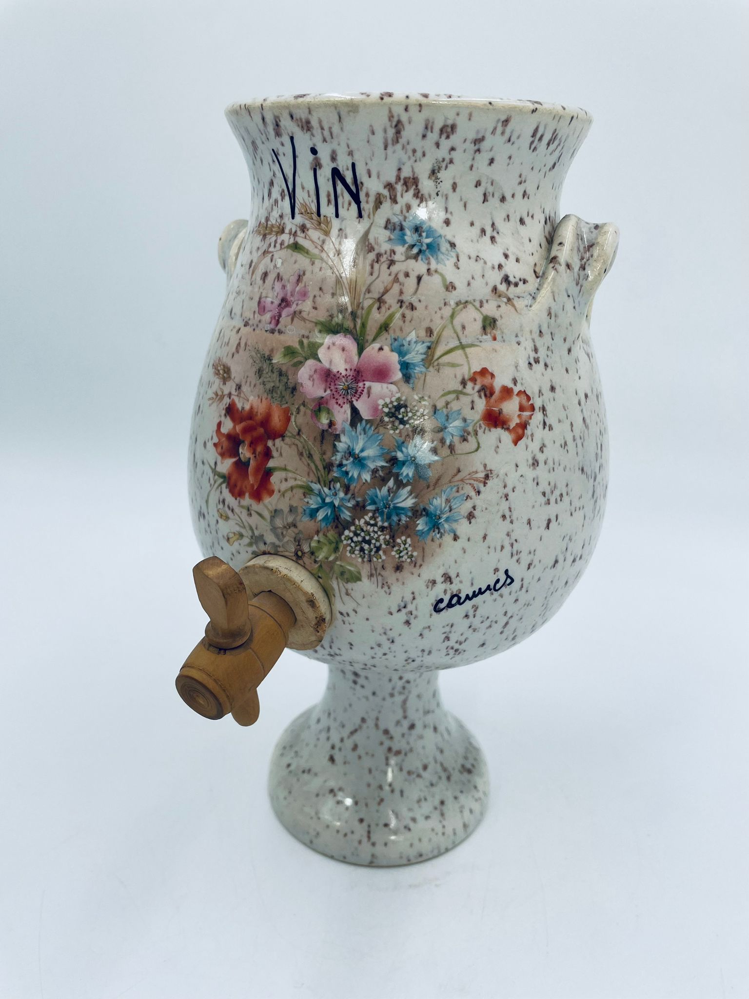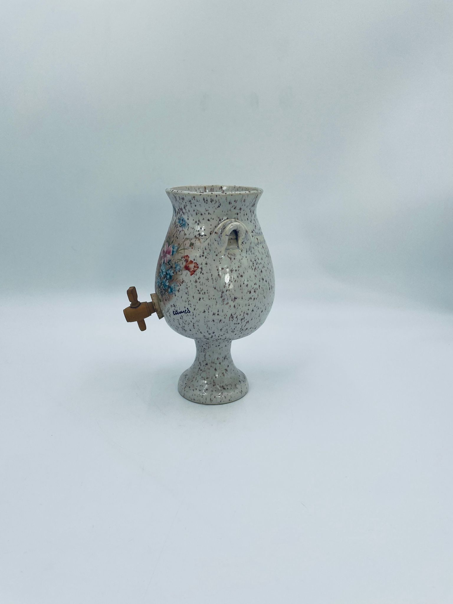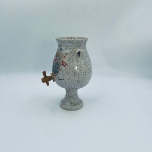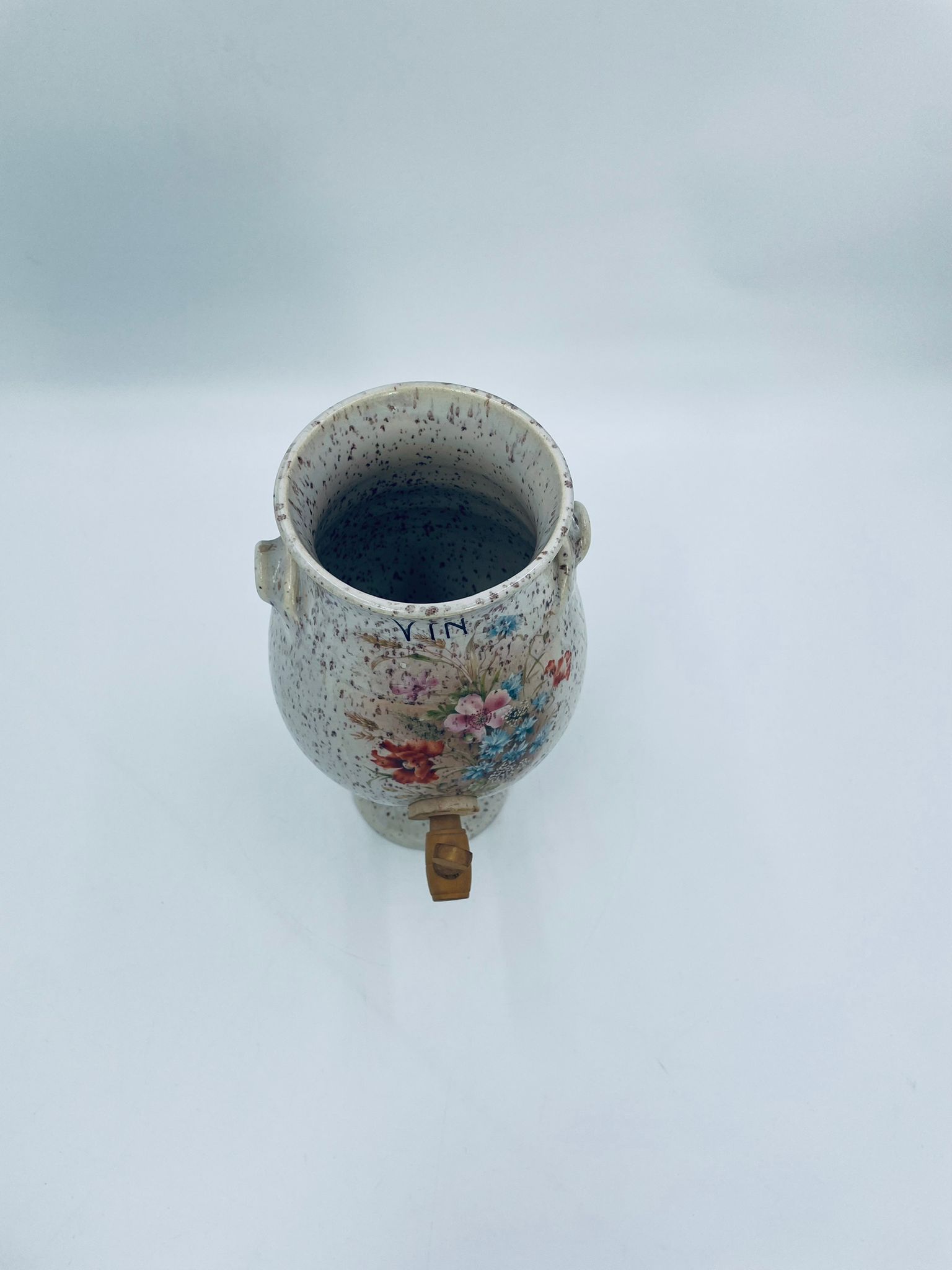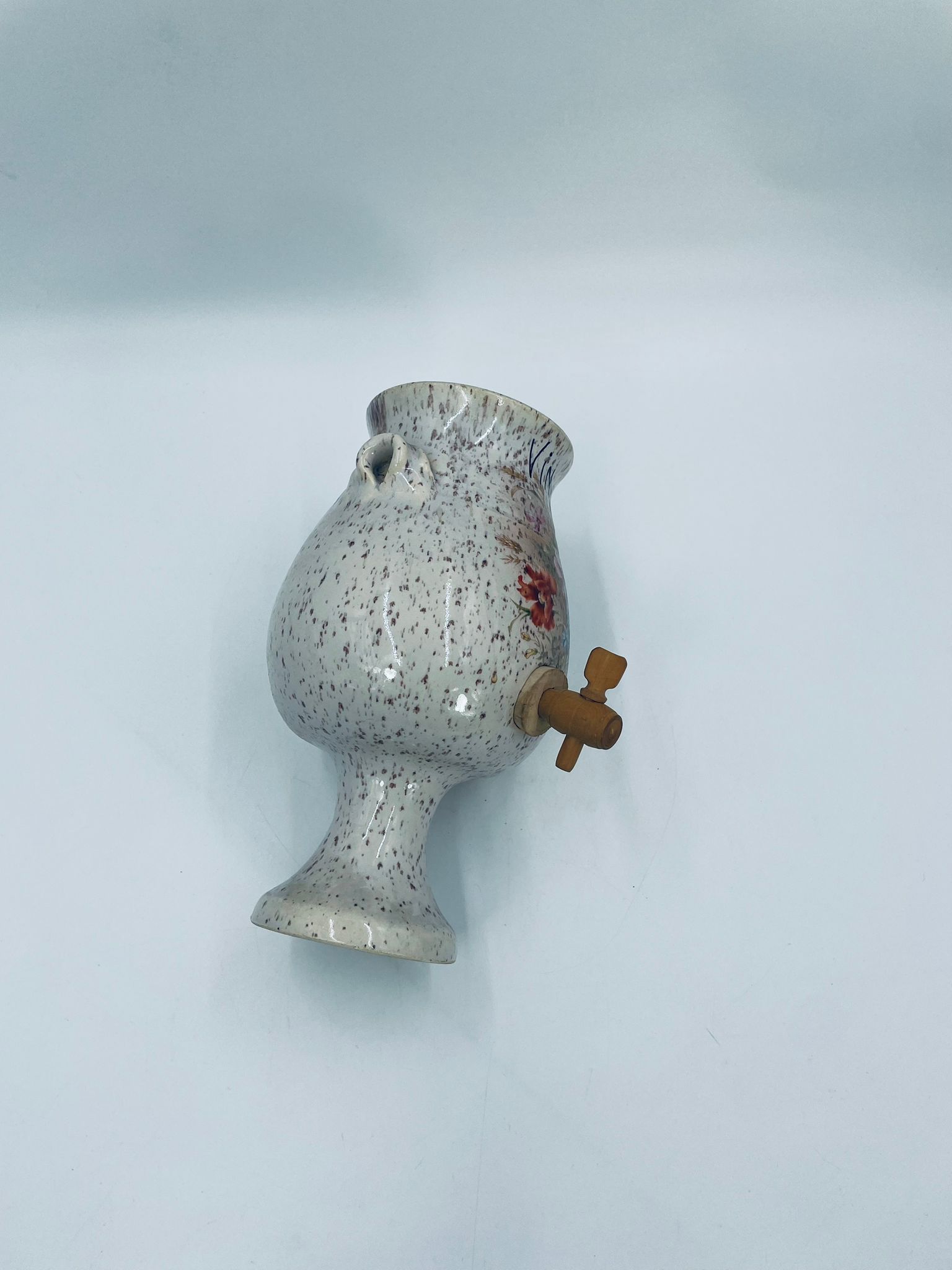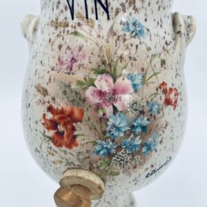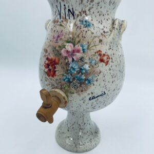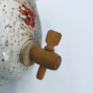 Fontanna do wina, karafka do wina z kranikiem w stylu Vintage, wykonana z wysokie jakości ceramiki. Karafka z ozdobnym nakrapianiem, dekorowana wzorem kwiatowym, wyposażona w mały, drewniany kranik oraz dwa małe , ozdobne uchwyty. Brak przykrycia górnego.