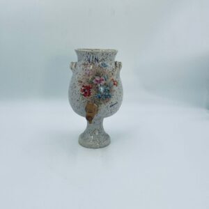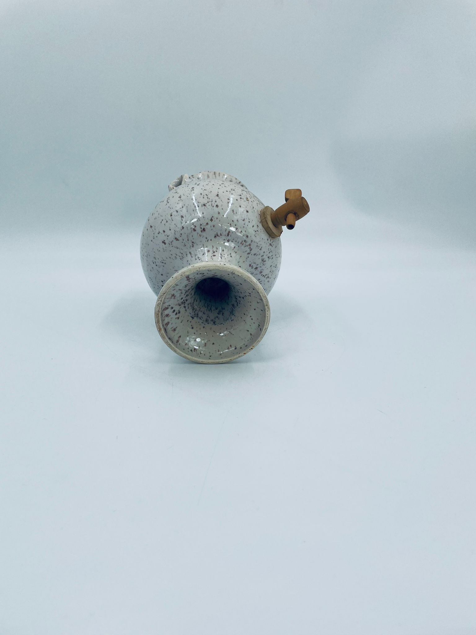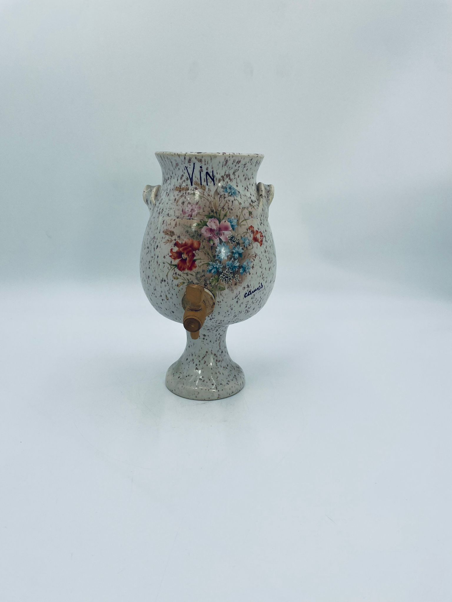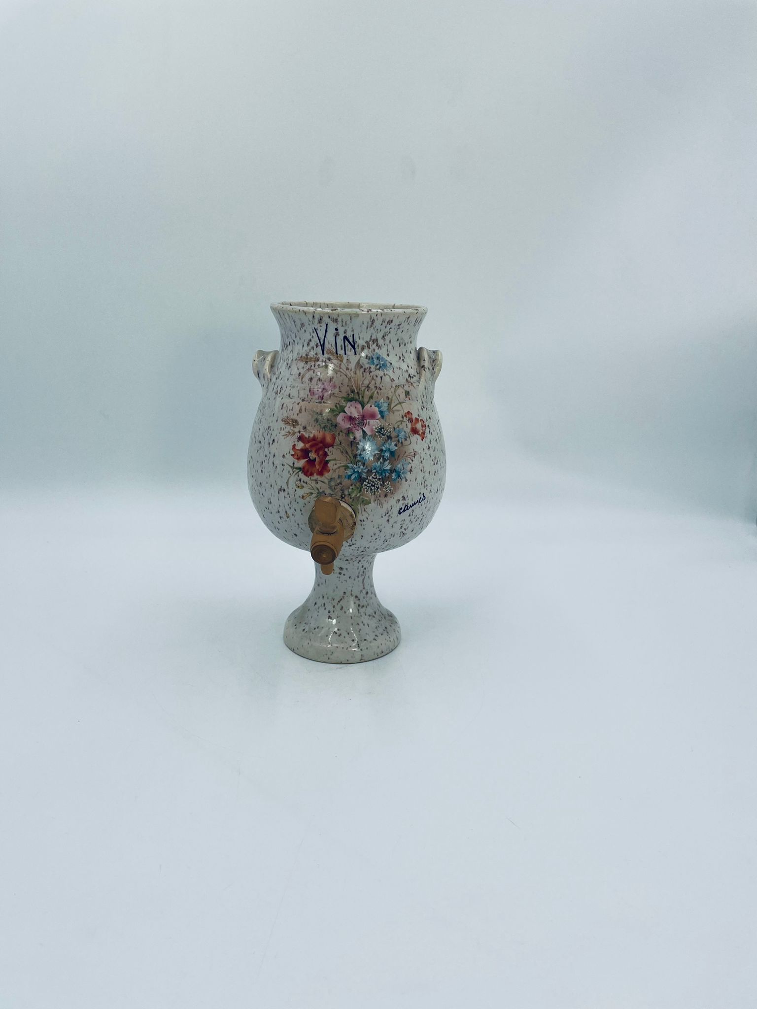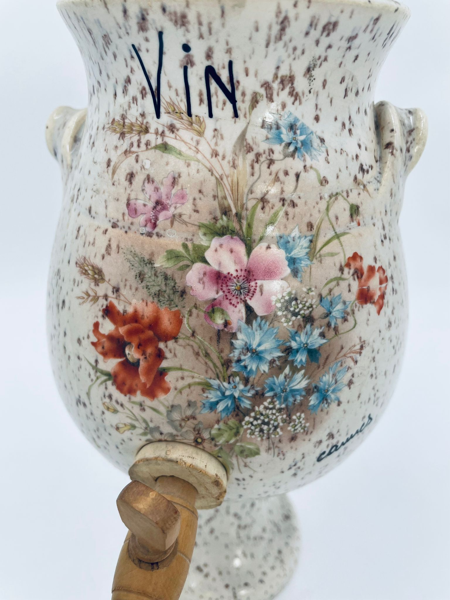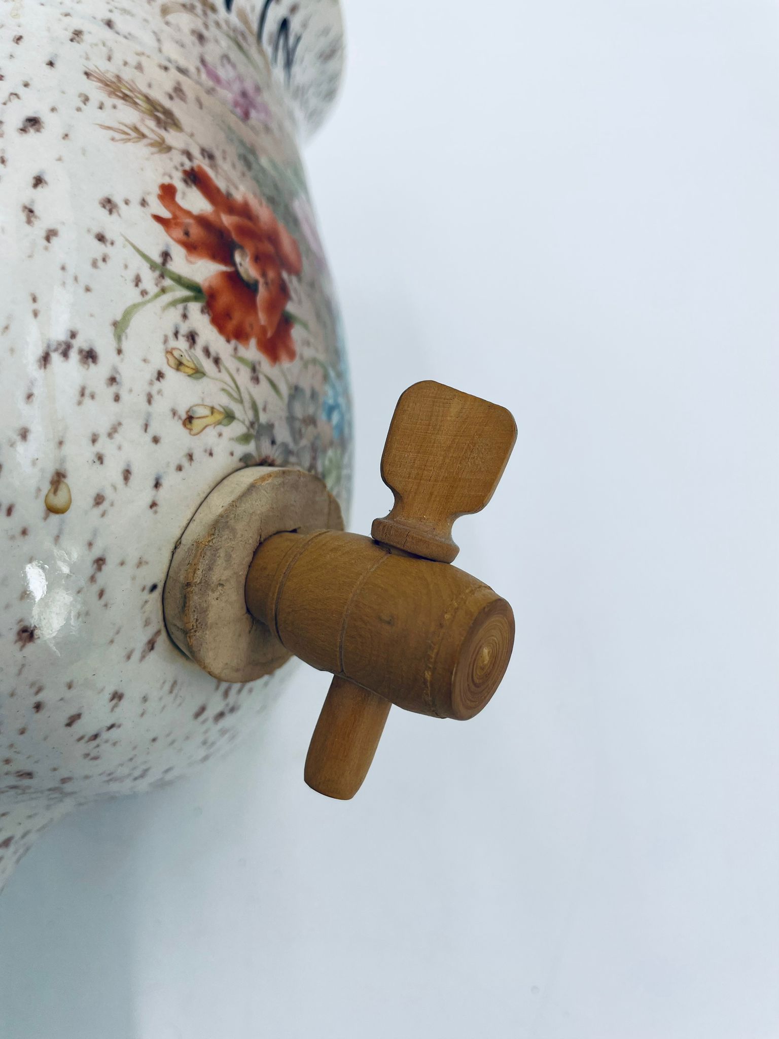 Fontanna do wina, karafka do wina z kranikiem w stylu Vintage, wykonana z wysokie jakości ceramiki. Karafka z ozdobnym nakrapianiem, dekorowana wzorem kwiatowym, wyposażona w mały, drewniany kranik oraz dwa małe , ozdobne uchwyty. Brak przykrycia górnego.