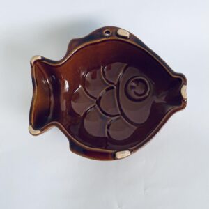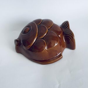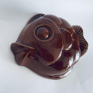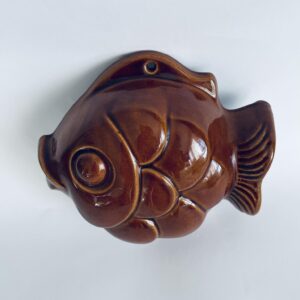 Foremka ceramiczna w kształcie ryby w jasno brązowym kolorze. Rybka z lat 60-tych XX w. W stylu vintage. Forma używana do przekąsek, galareta na zimno oraz można w niej zapiekać. Dodatkowo ma możliwość zawieszenia na ścianie jako dekoracja w naszych kuchniach.