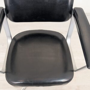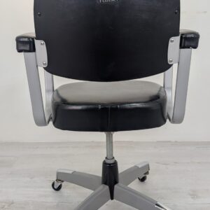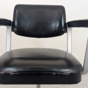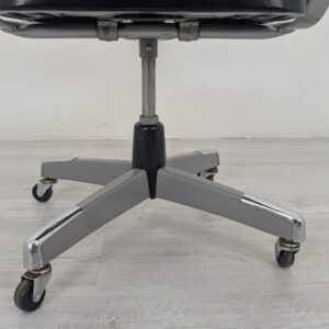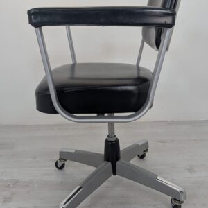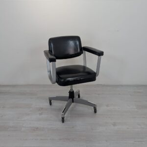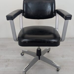 Wygodny, obrotowy fotel biurowy w kolorze czarnym, pochodzący z drugiej połowy XX wieku. Posiada kółka obrotowe ułatwiające przemieszczanie się. Fotel jest w stanie używanym, ale nadal w dobrym stanie technicznym i wizualnym.