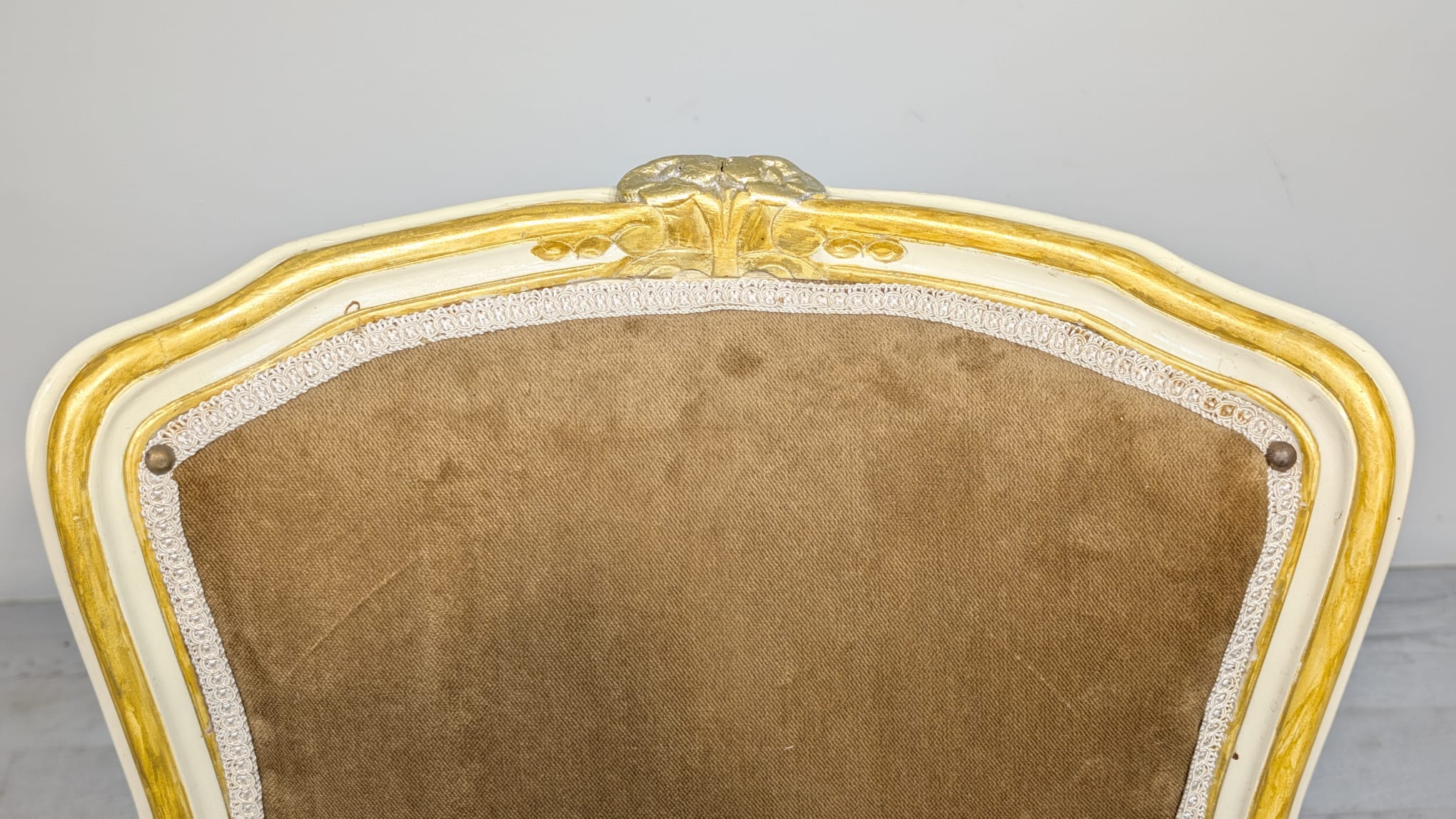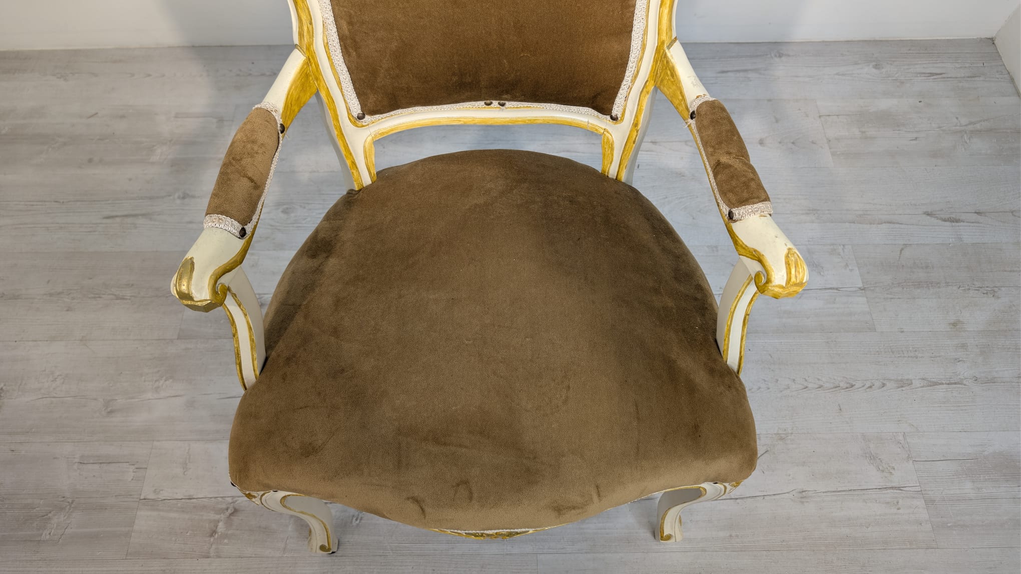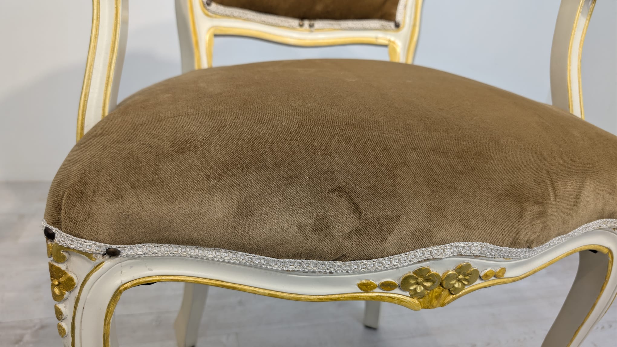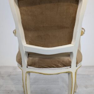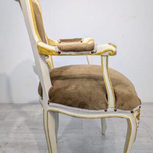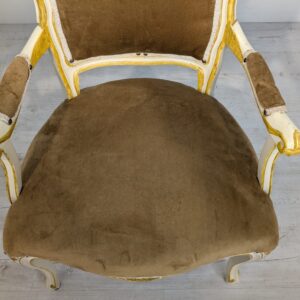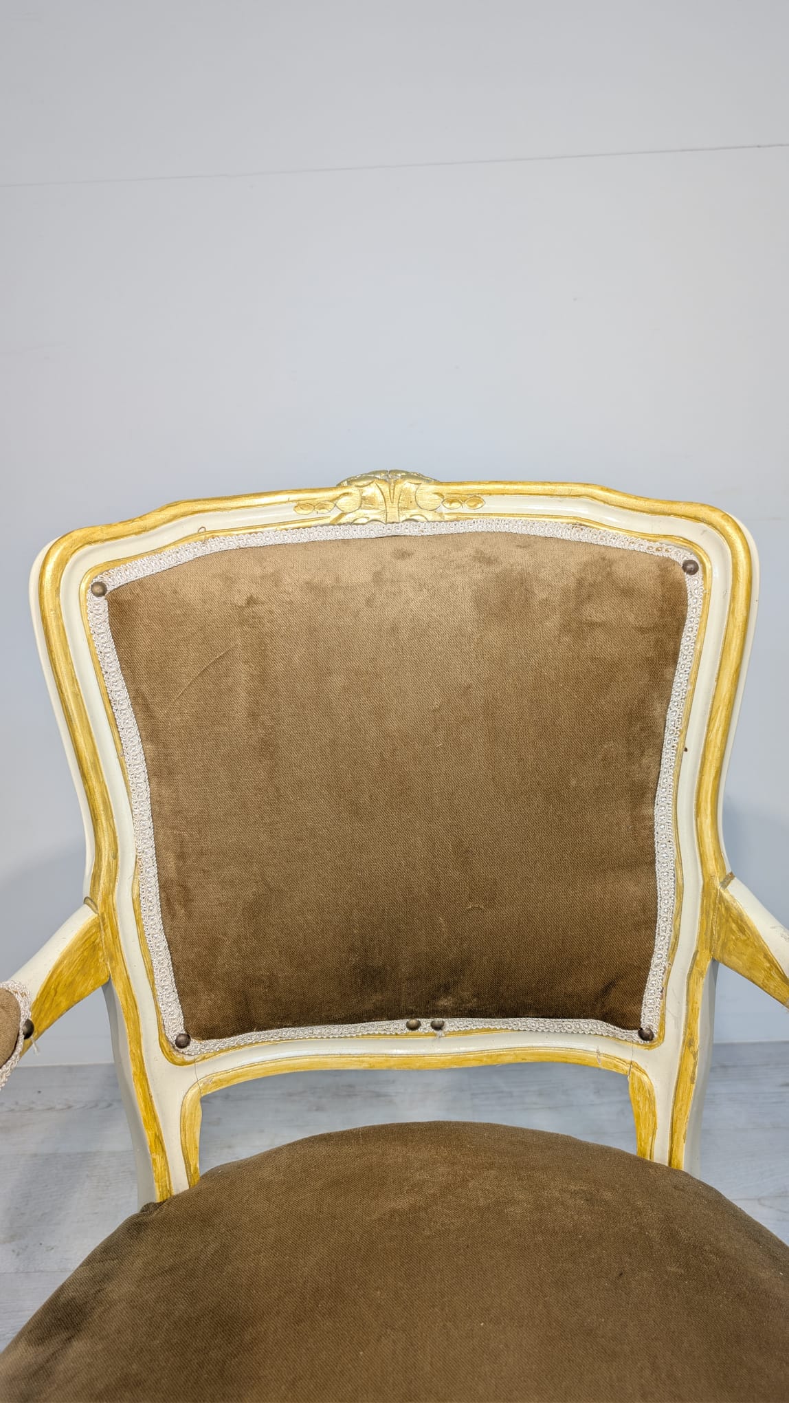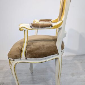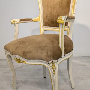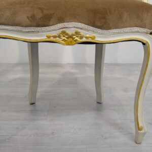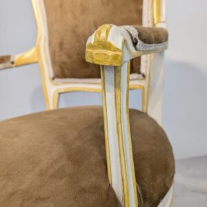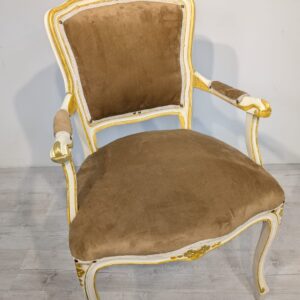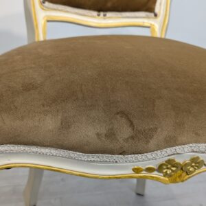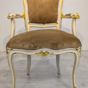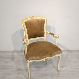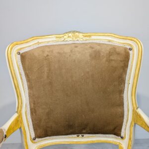 Stylowy fotel w stylu Ludwika XV z początku XX wieku. Drewniana konstrukcja w złotej ramie, tapicerowany miękkim, aksamitnym materiałem w odcieniu brązu. Mebel zachowany w dobrym stanie, z widocznymi śladami użytkowania. Idealny jako dodatek do klasycznego lub vintage’owego wnętrza.