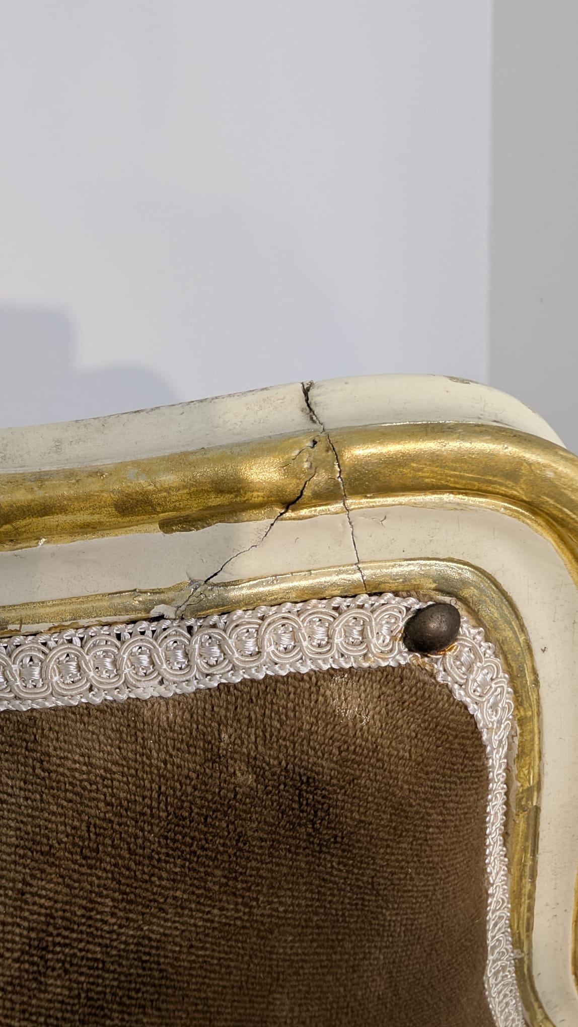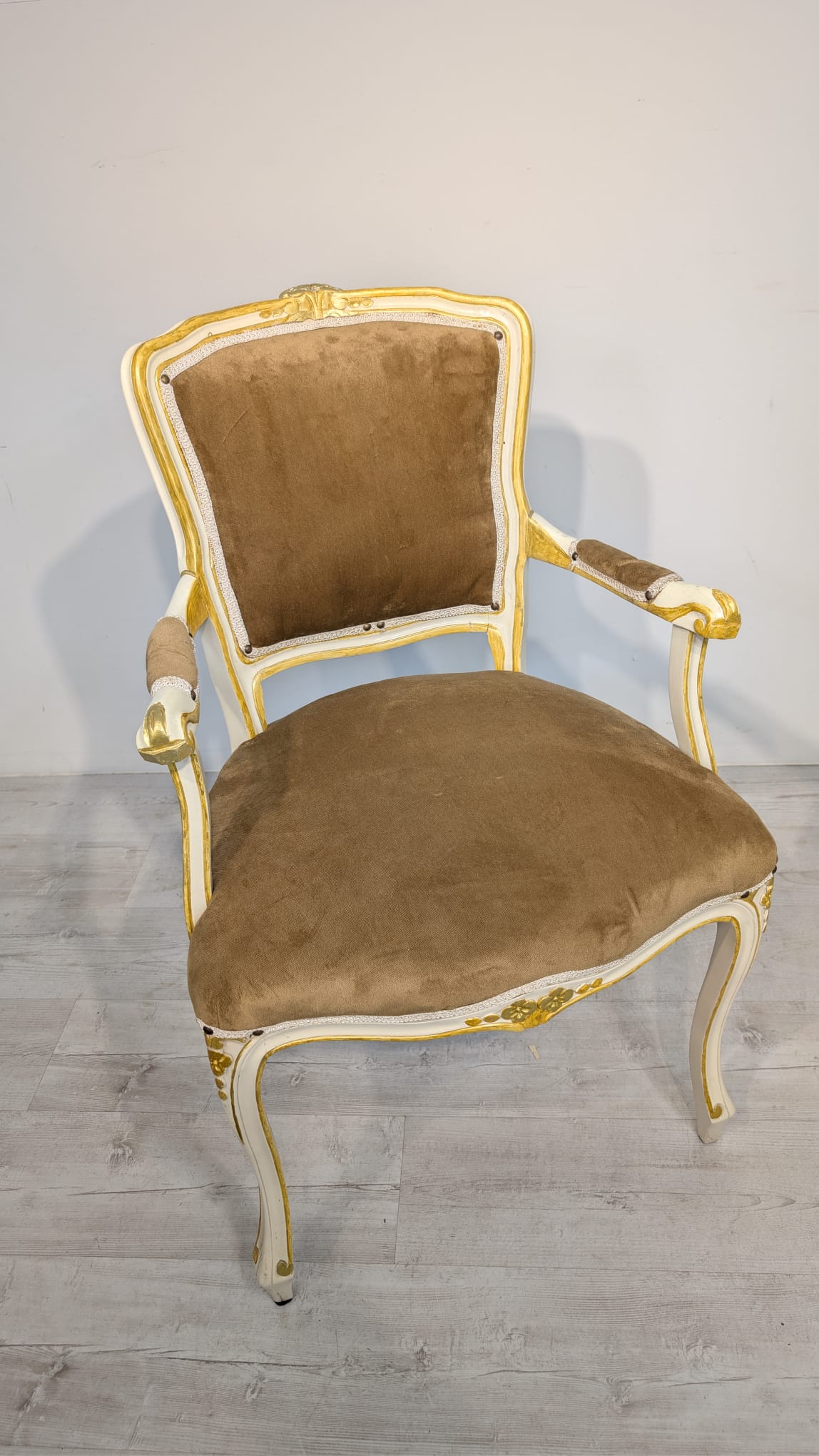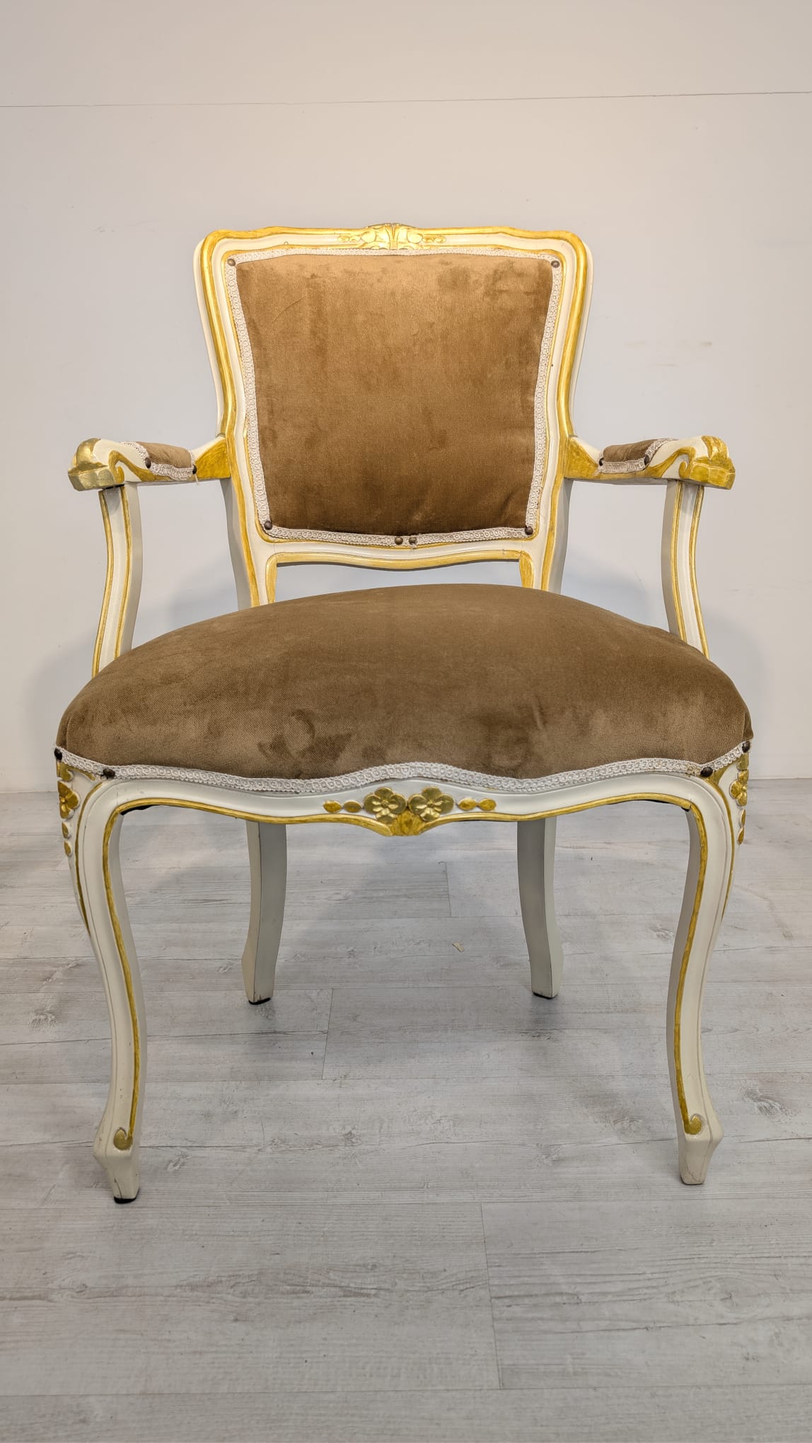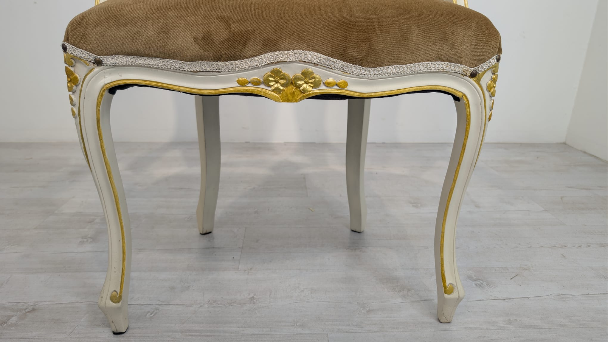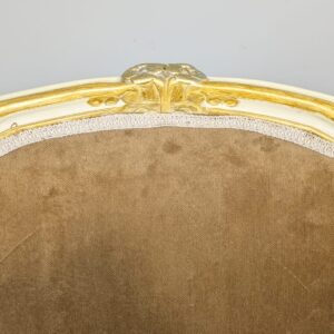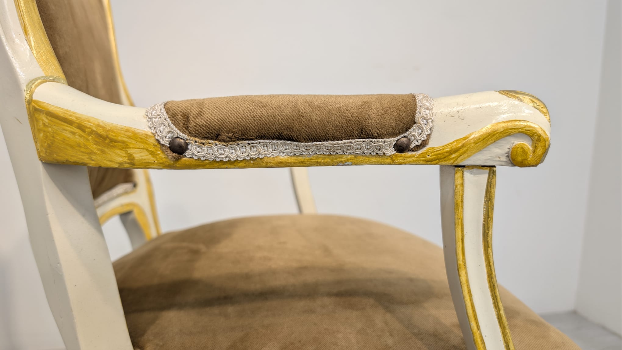 Stylowy fotel w stylu Ludwika XV z początku XX wieku. Drewniana konstrukcja w złotej ramie, tapicerowany miękkim, aksamitnym materiałem w odcieniu brązu. Mebel zachowany w dobrym stanie, z widocznymi śladami użytkowania. Idealny jako dodatek do klasycznego lub vintage’owego wnętrza.