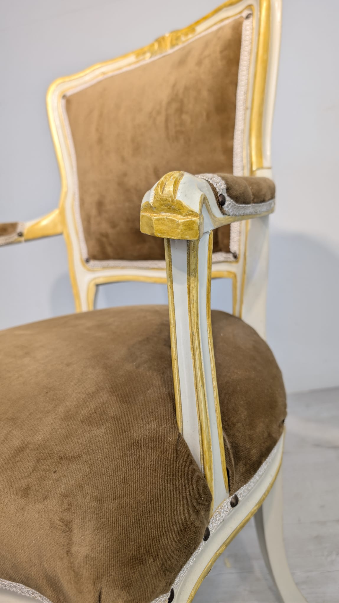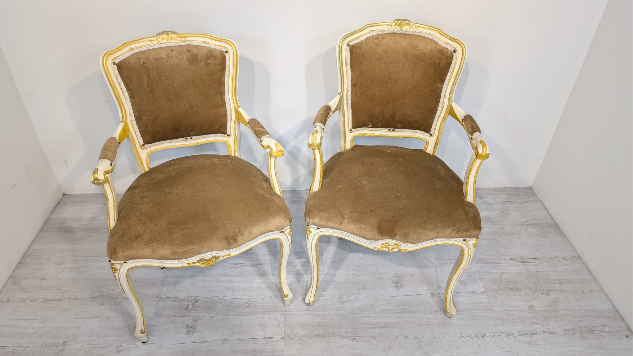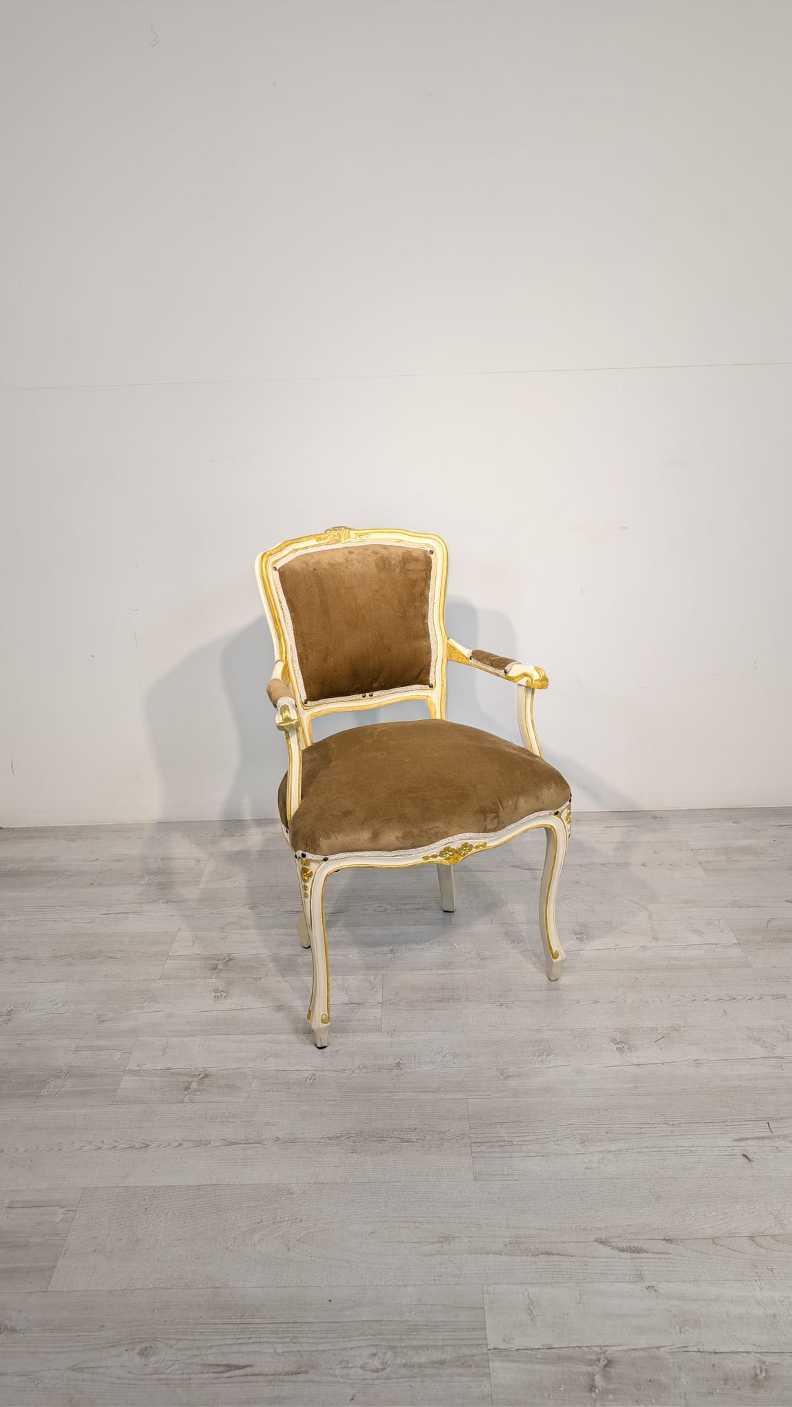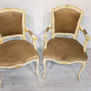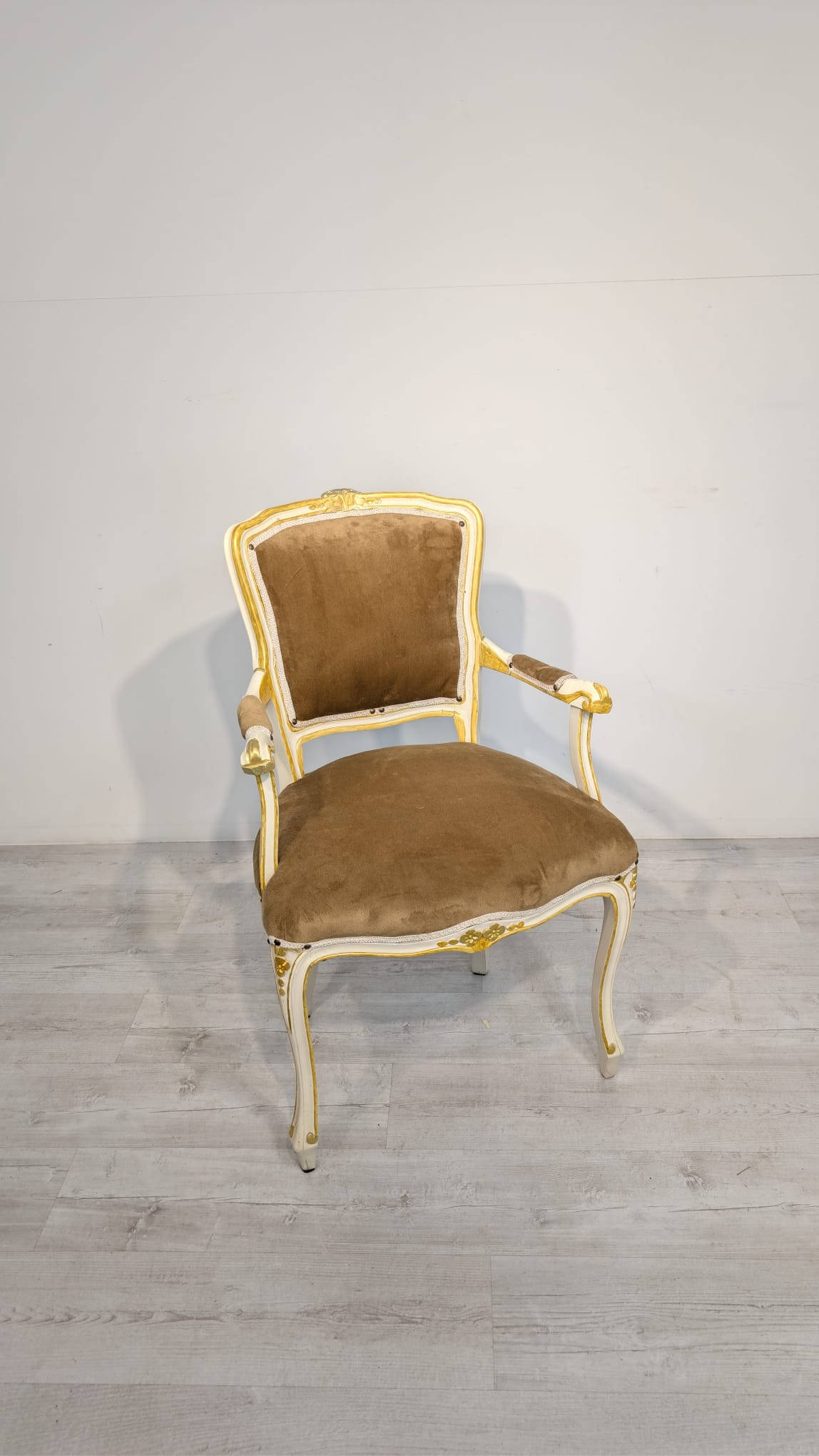 Stylowy fotel w stylu Ludwika XV z początku XX wieku. Drewniana konstrukcja w złotej ramie, tapicerowany miękkim, aksamitnym materiałem w odcieniu brązu. Mebel zachowany w dobrym stanie, z widocznymi śladami użytkowania. Idealny jako dodatek do klasycznego lub vintage’owego wnętrza.