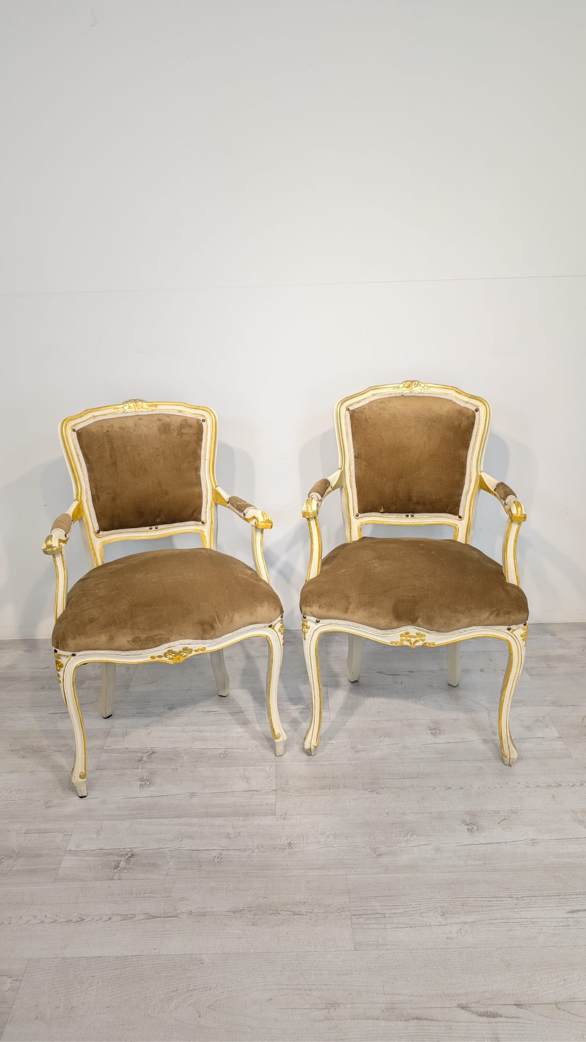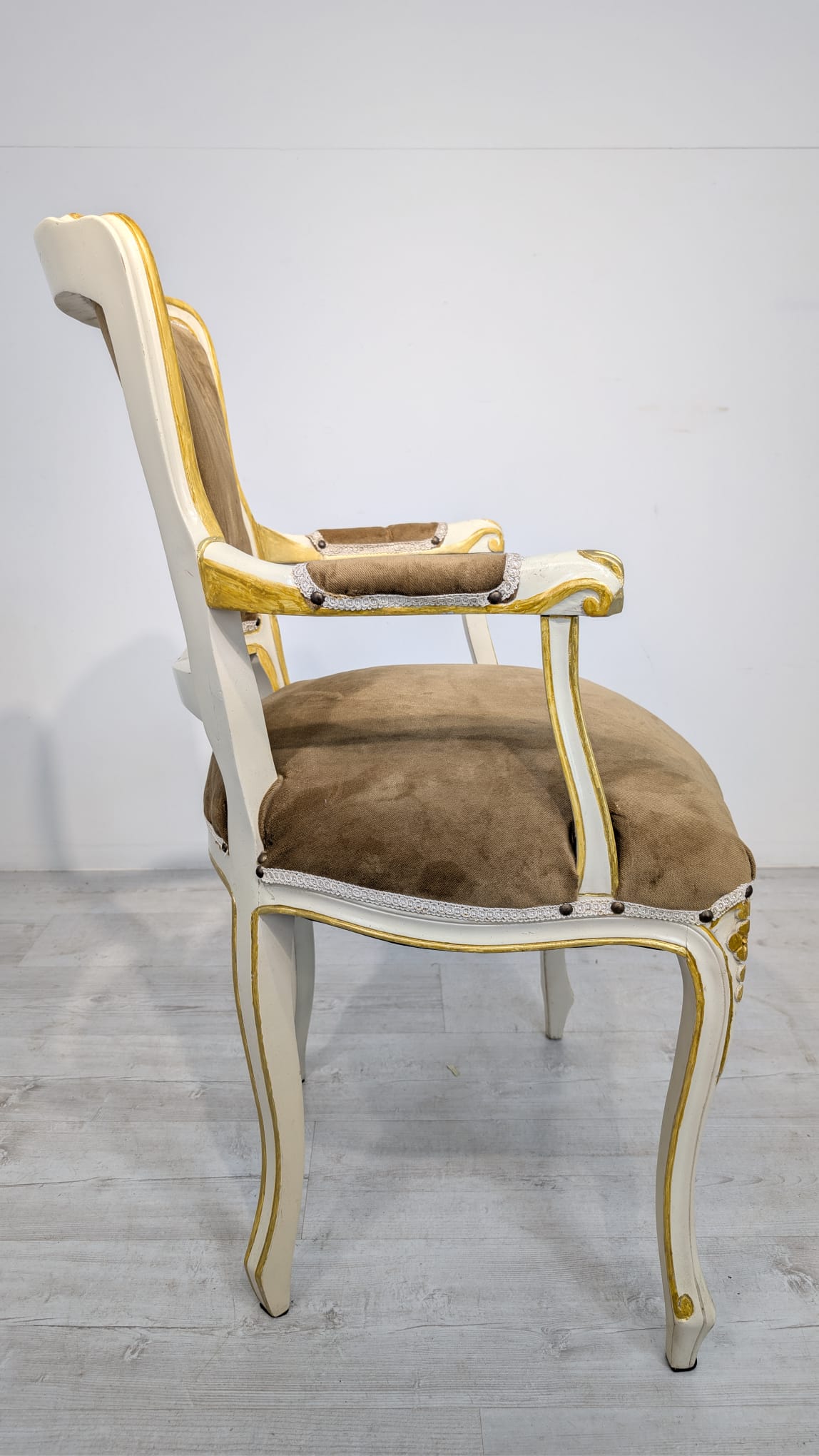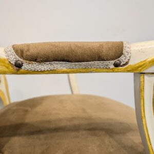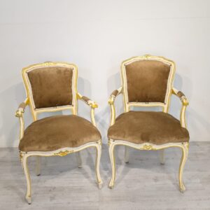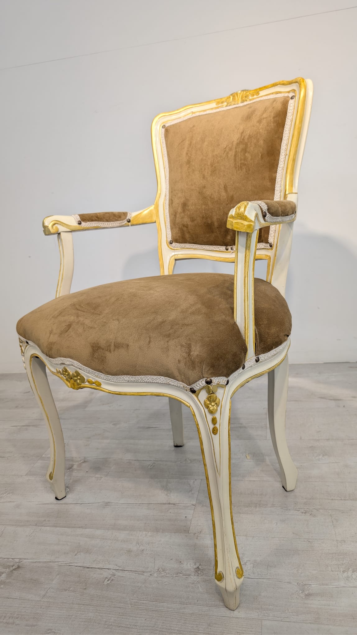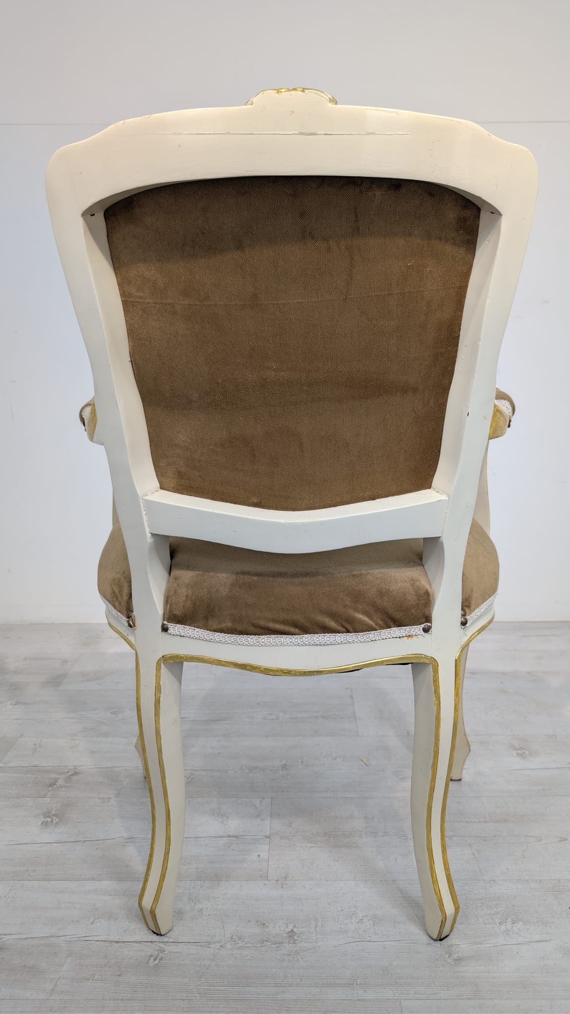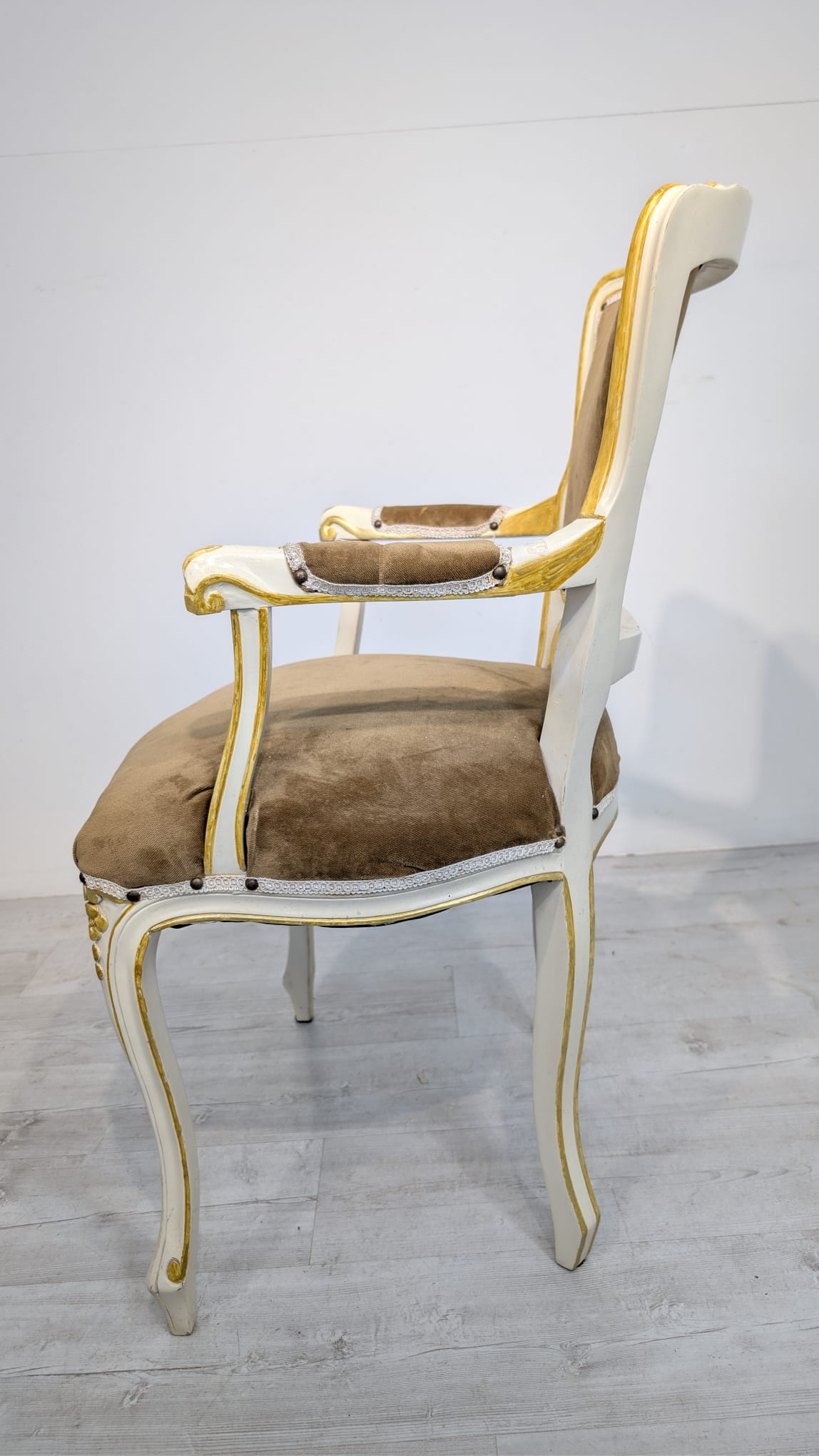 Stylowy fotel w stylu Ludwika XV z początku XX wieku. Drewniana konstrukcja w złotej ramie, tapicerowany miękkim, aksamitnym materiałem w odcieniu brązu. Mebel zachowany w dobrym stanie, z widocznymi śladami użytkowania. Idealny jako dodatek do klasycznego lub vintage’owego wnętrza.