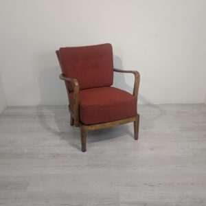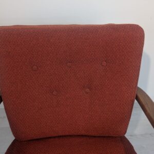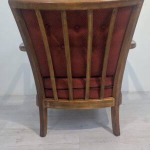 Stylowy fotel w stylu art deco z lat 60./70. XX wieku. Mebel posiada charakterystyczne wygięte podłokietniki oraz tapicerkę w ciemnoczerwonej barwie. Fotel jest używany, ale w dobrym stanie zachowania. Stanowi ciekawą propozycję do aranżacji wnętrz w stylu Art-Deco.