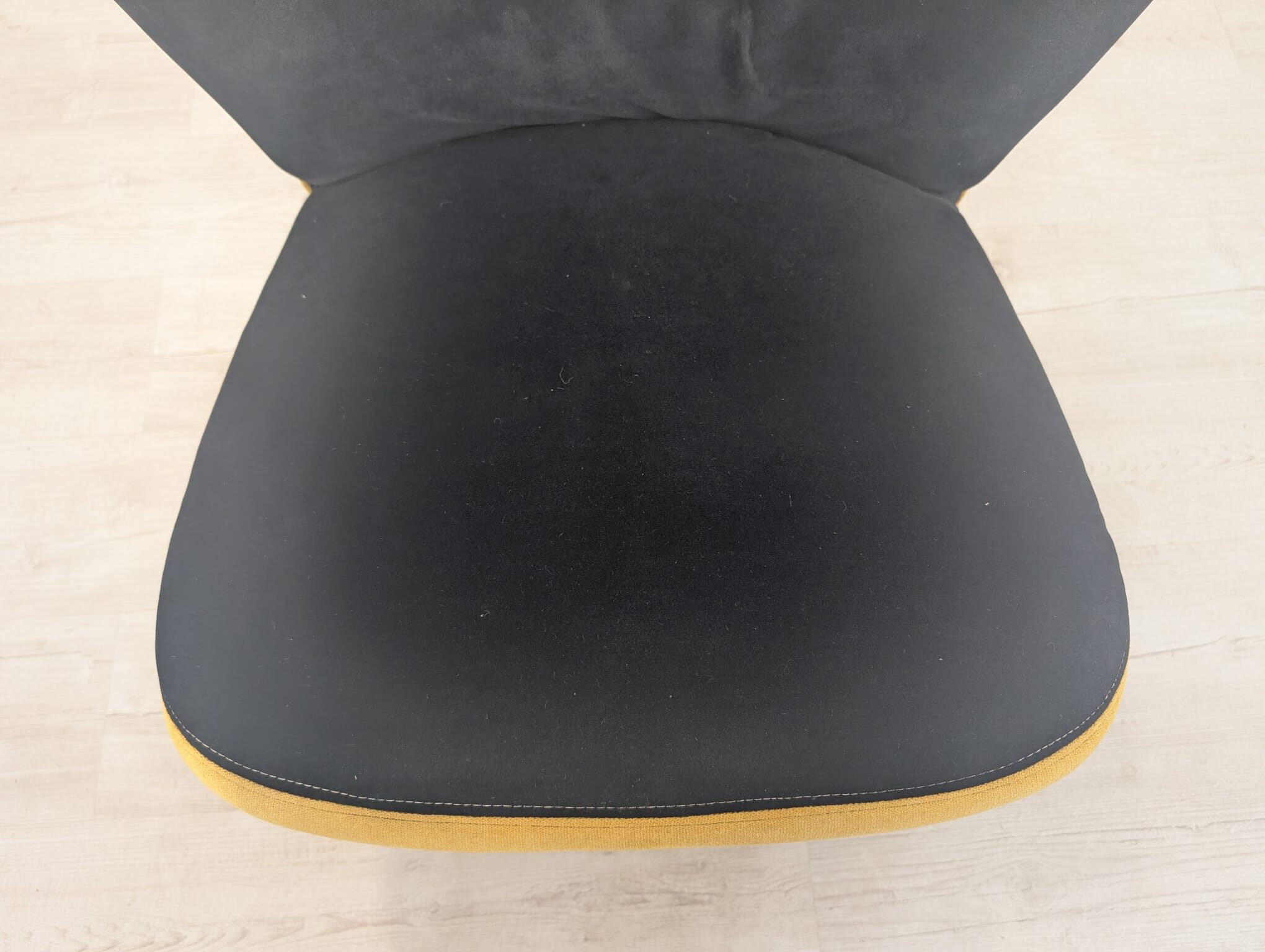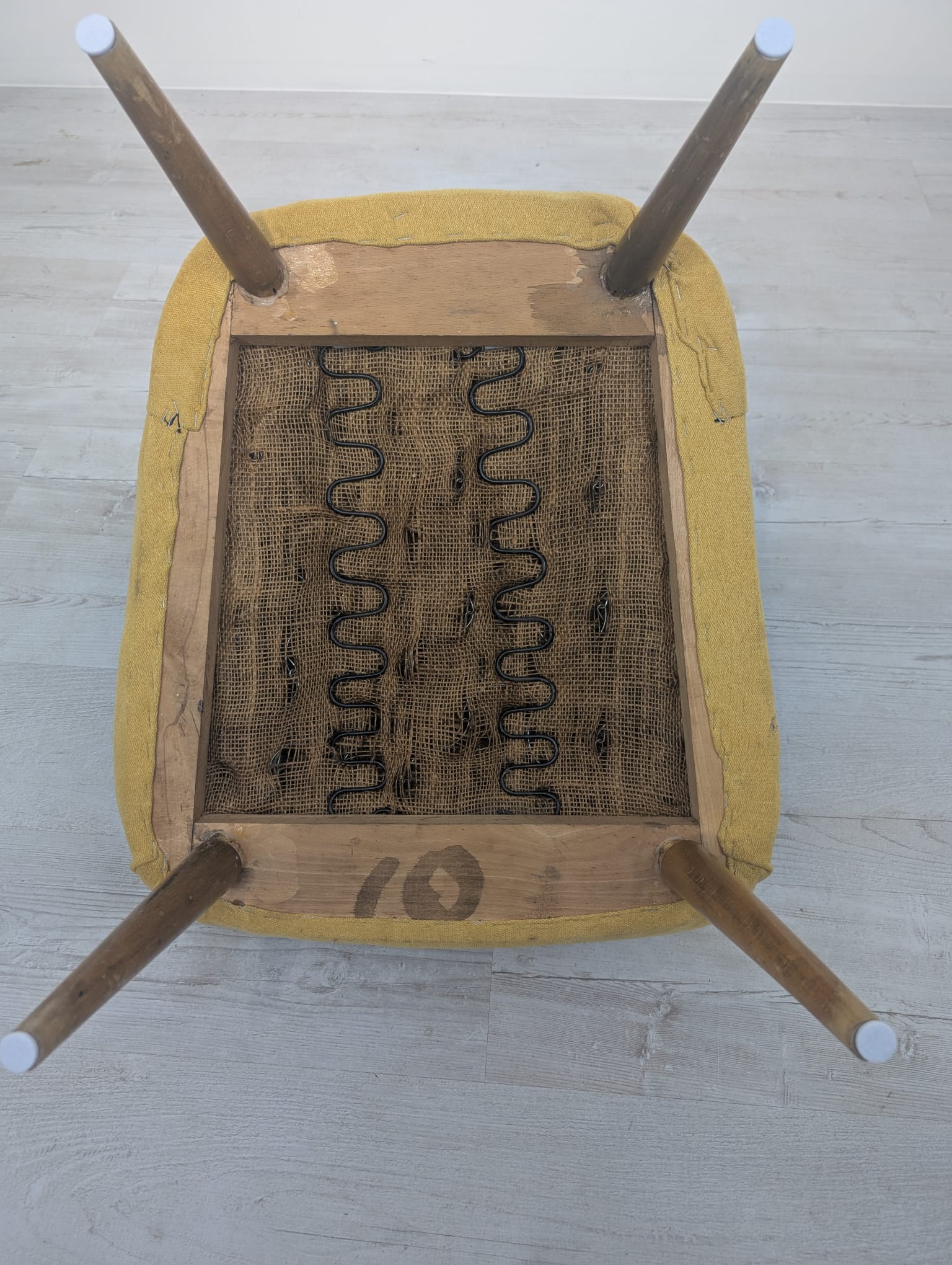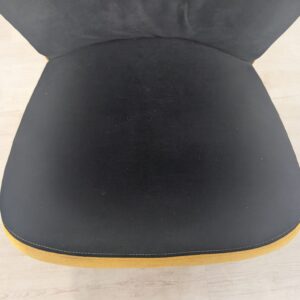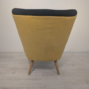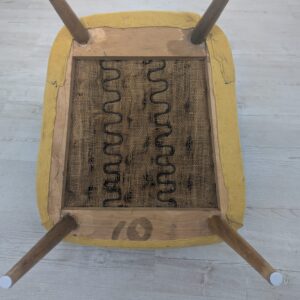Stylowy fotel wypoczynkowy w stylu vintage, pochodzący z czasów PRL-u. Mebel posiada sprężyny, zapewniające wygodne siedzenie. Fotel ma charakterystyczny, żółty kolor, który nadaje mu niepowtarzalnego charakteru.