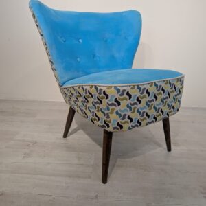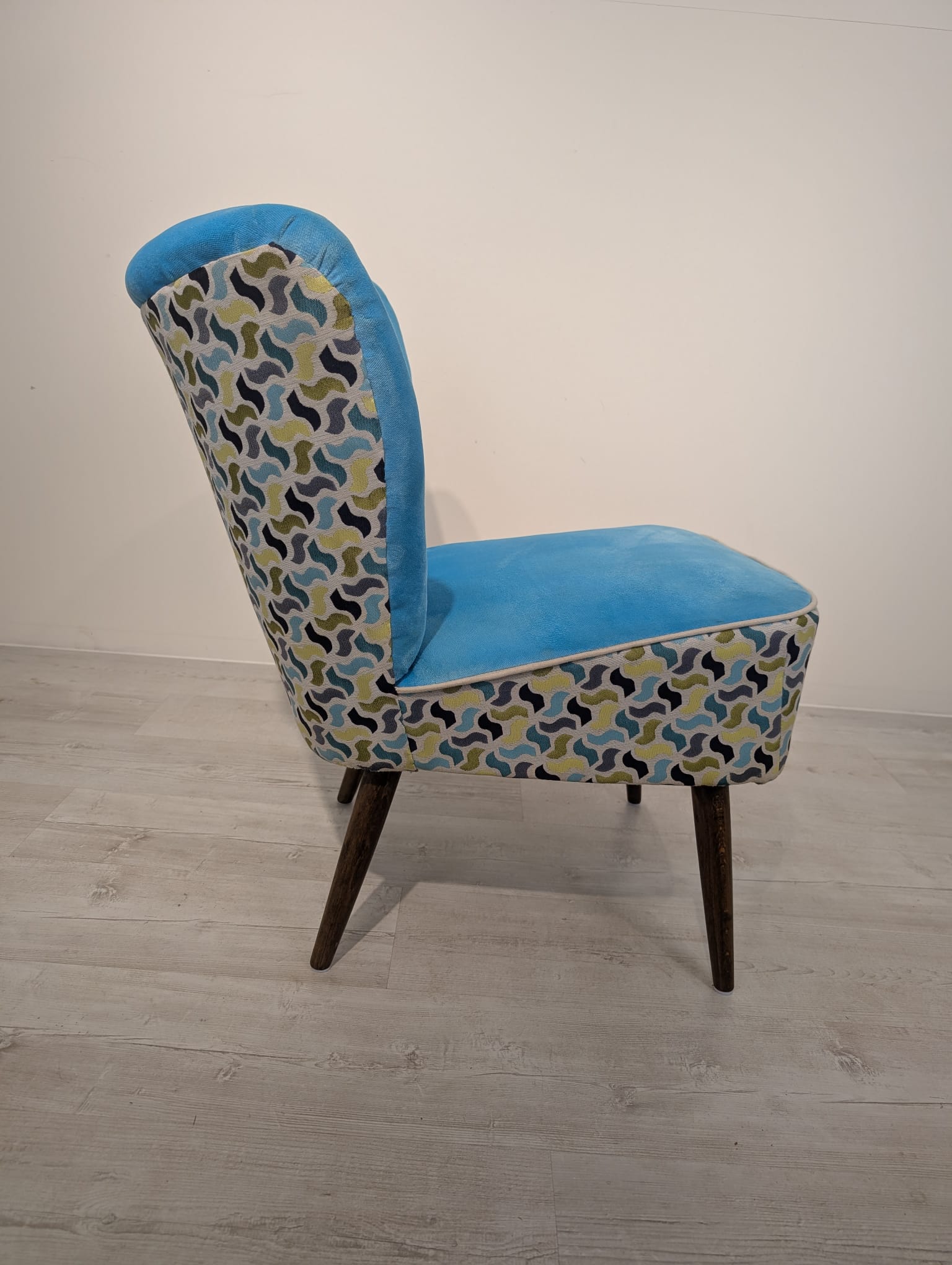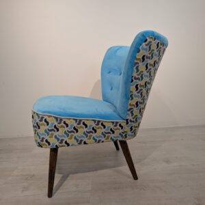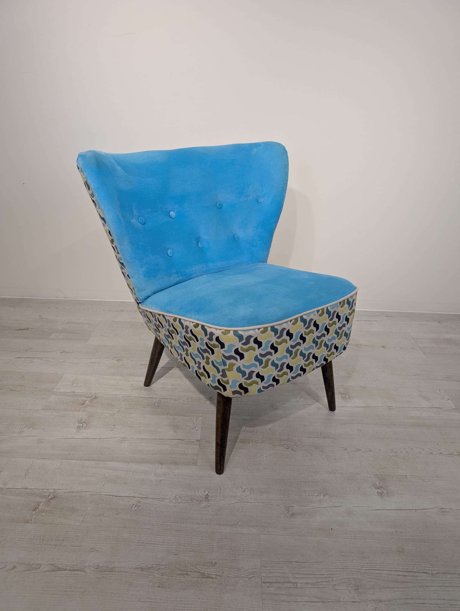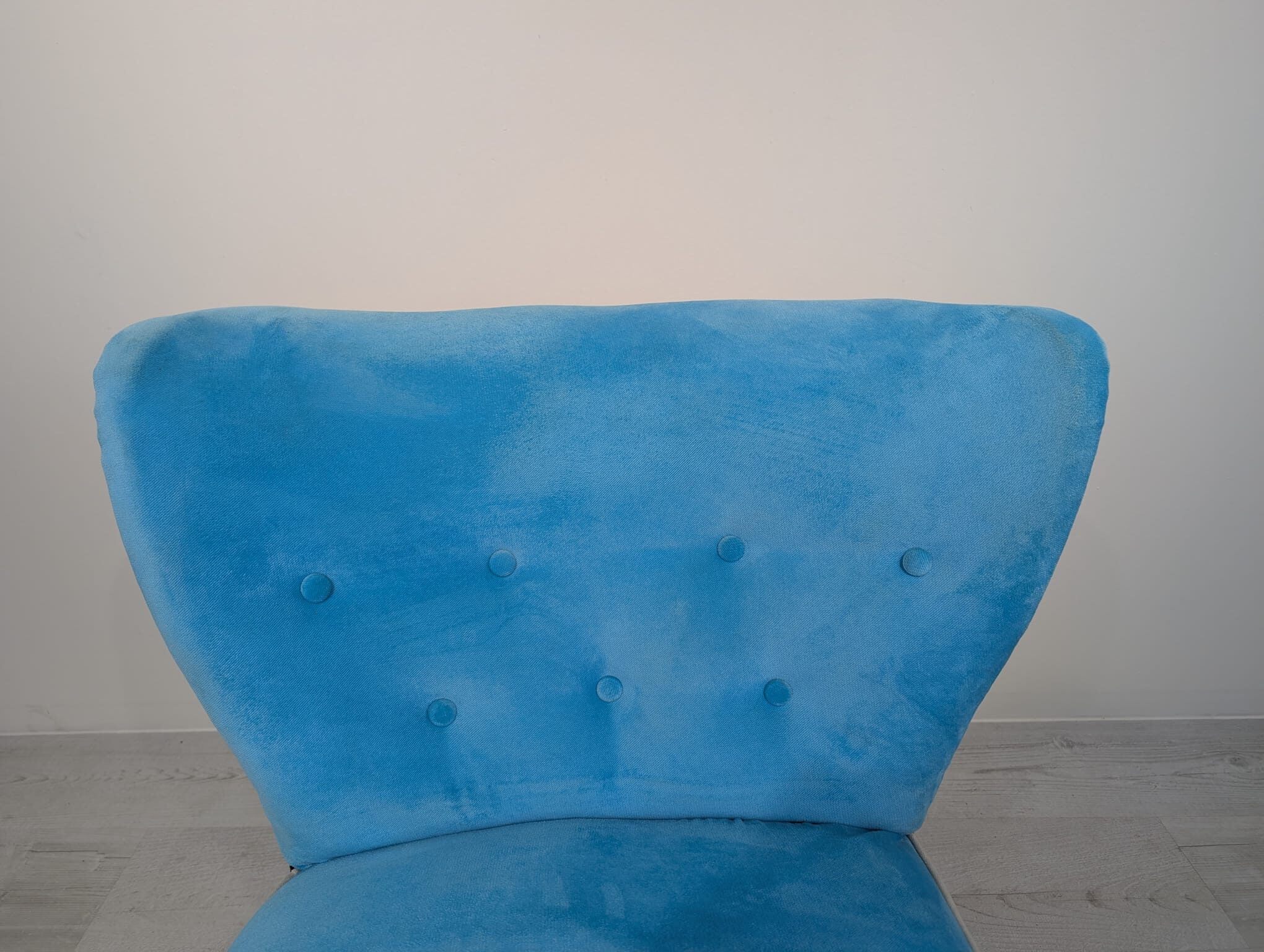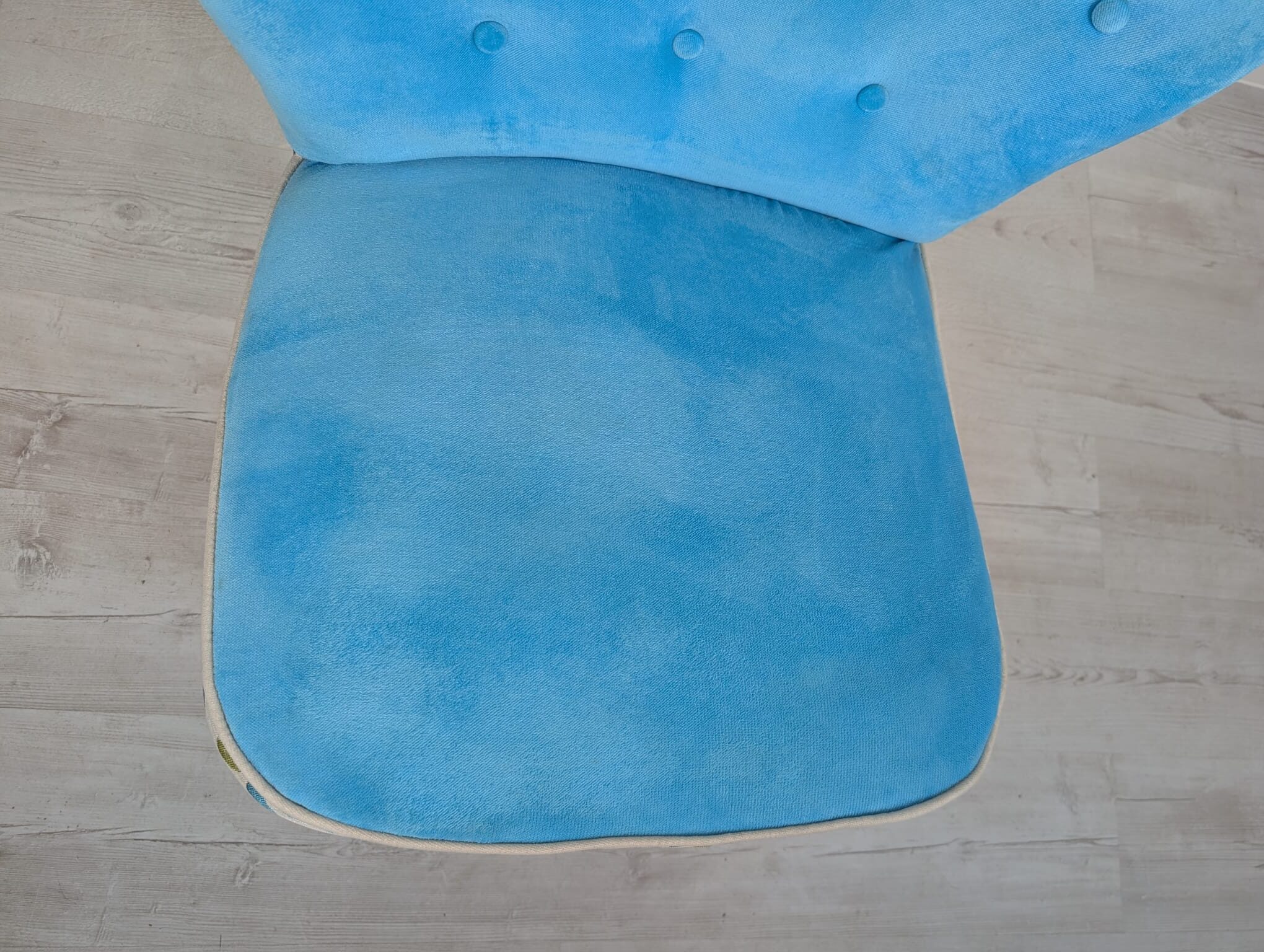 Stylowy fotel wypoczynkowy w stylu vintage, pochodzący z czasów PRL-u. Mebel posiada sprężyny, zapewniające wygodne siedzenie. Fotel ma charakterystyczny, niebieski kolor, który nadaje mu niepowtarzalnego charakteru.