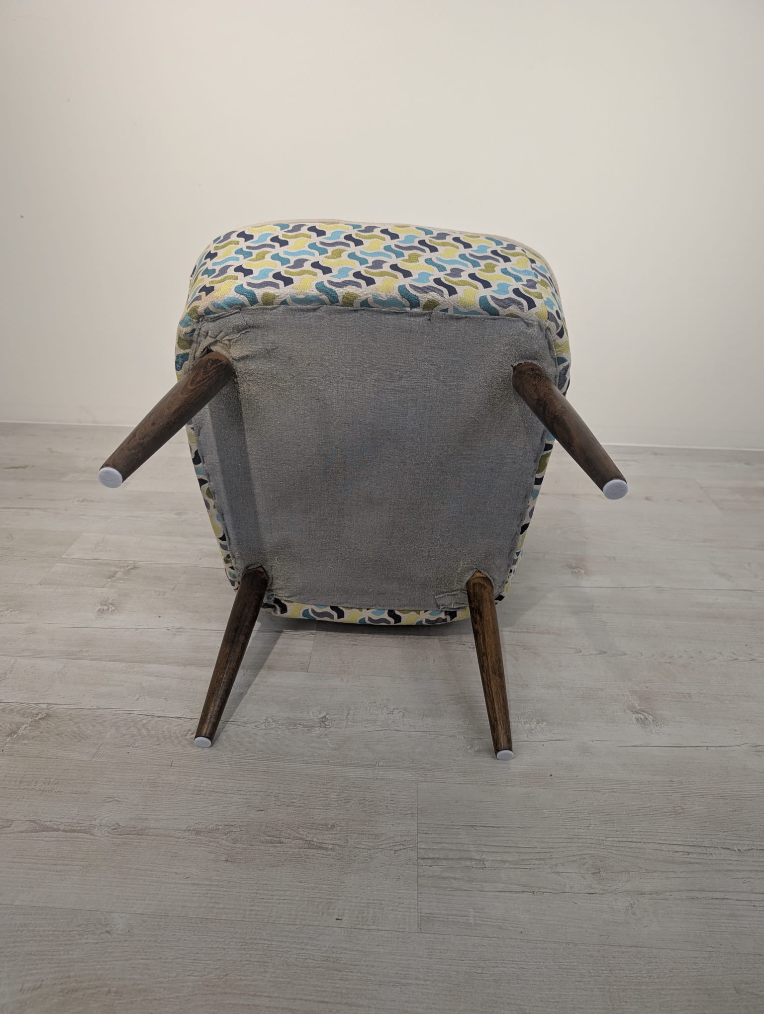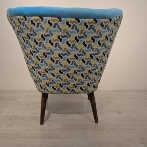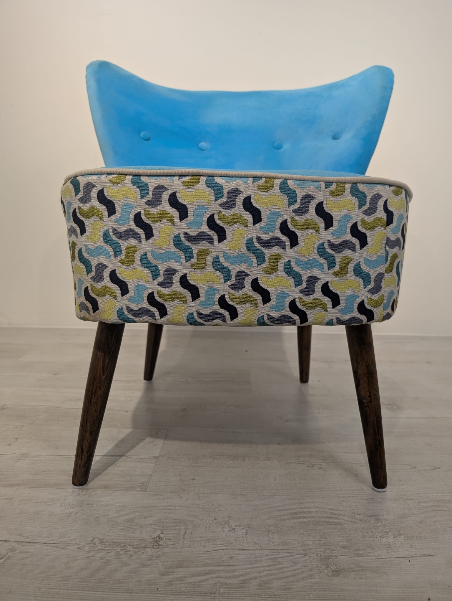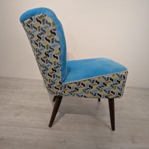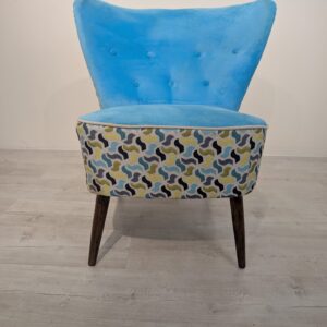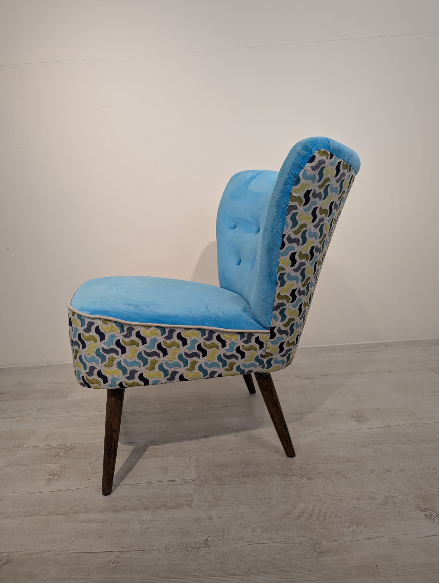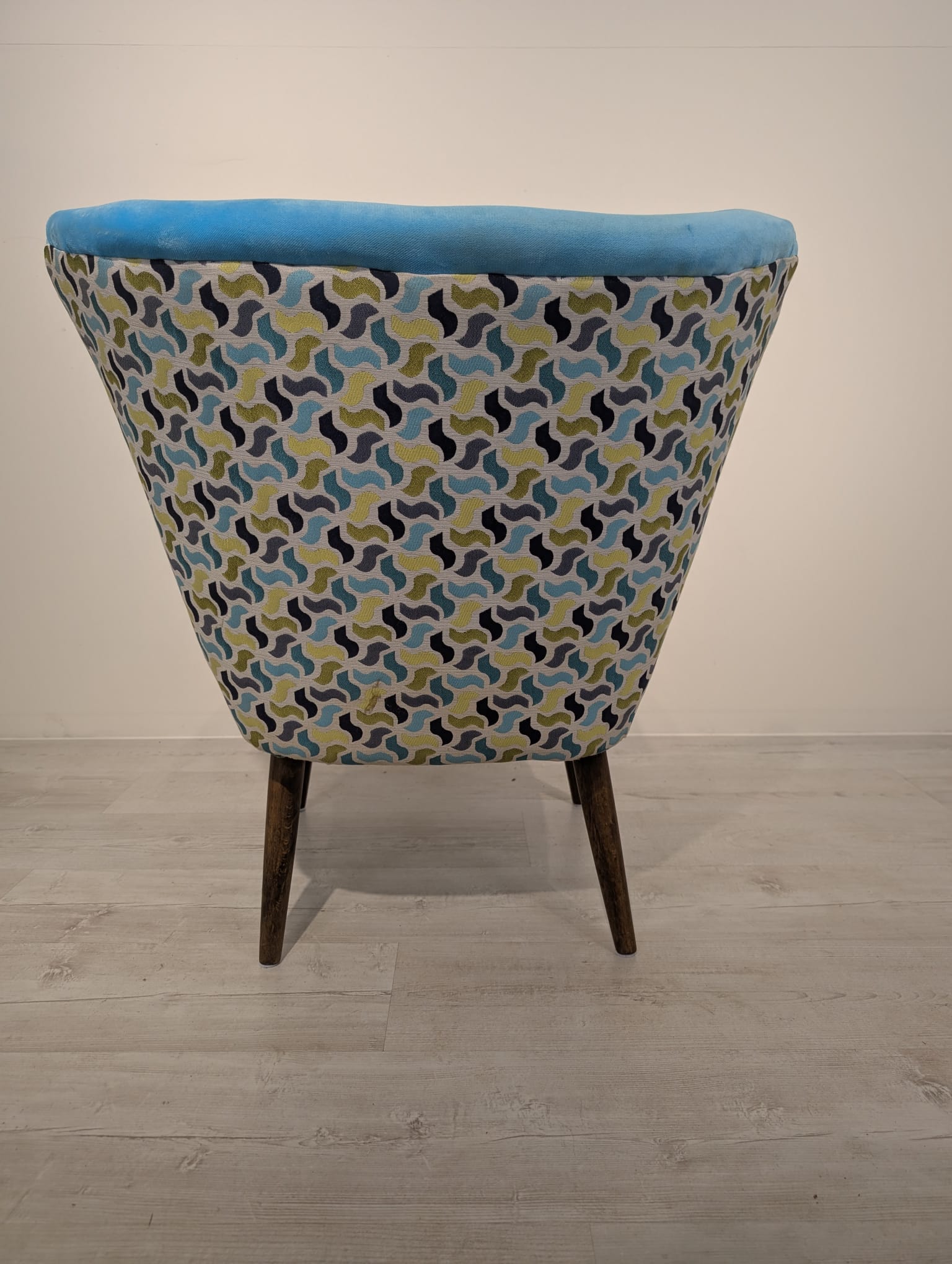 Stylowy fotel wypoczynkowy w stylu vintage, pochodzący z czasów PRL-u. Mebel posiada sprężyny, zapewniające wygodne siedzenie. Fotel ma charakterystyczny, niebieski kolor, który nadaje mu niepowtarzalnego charakteru.