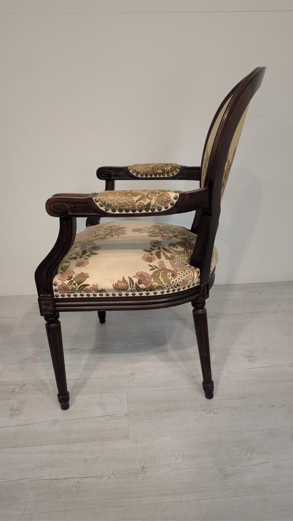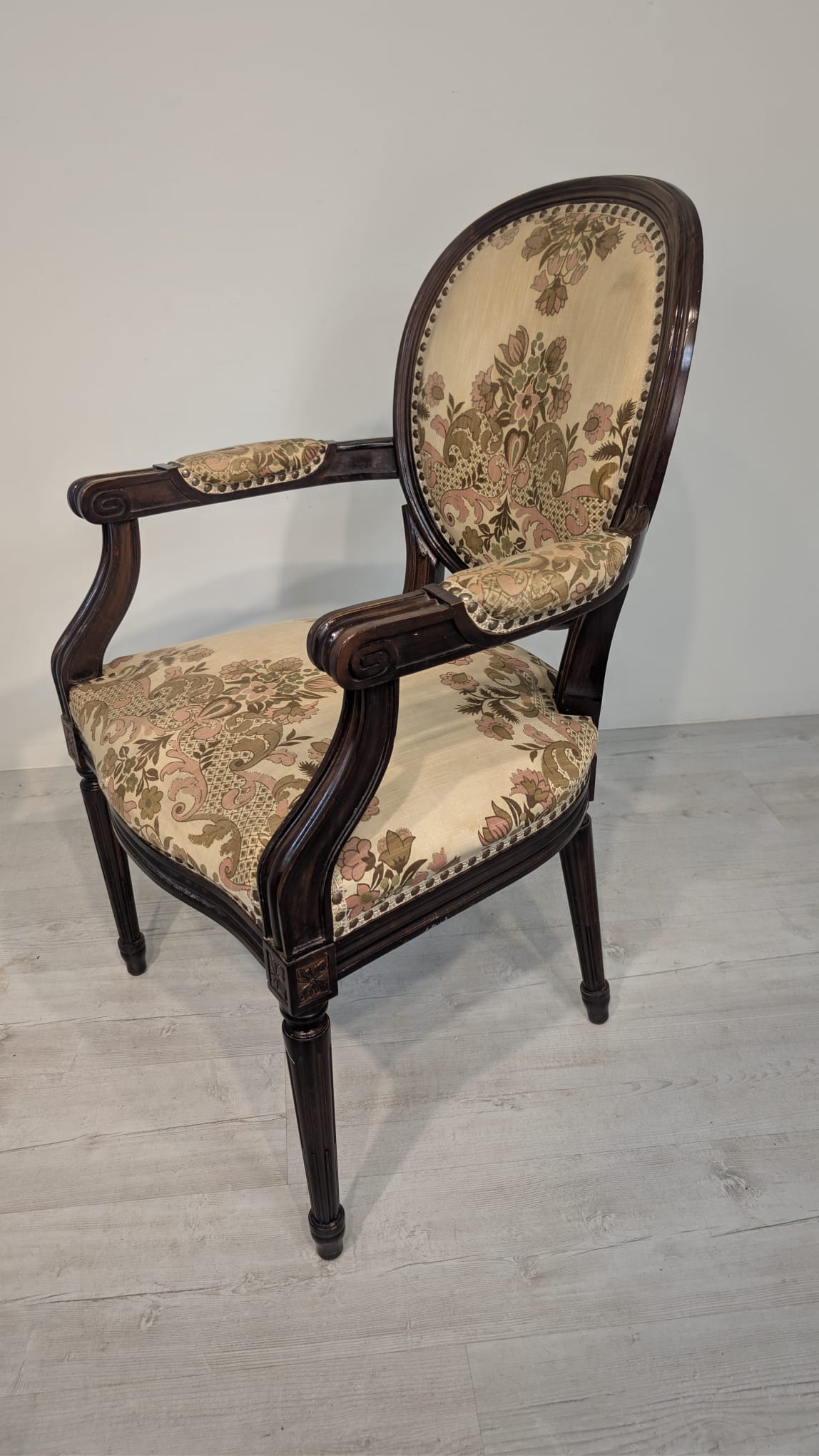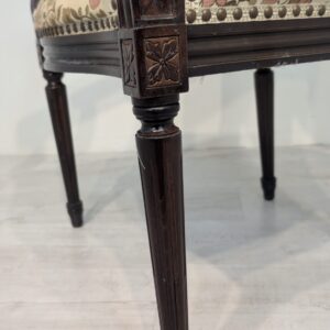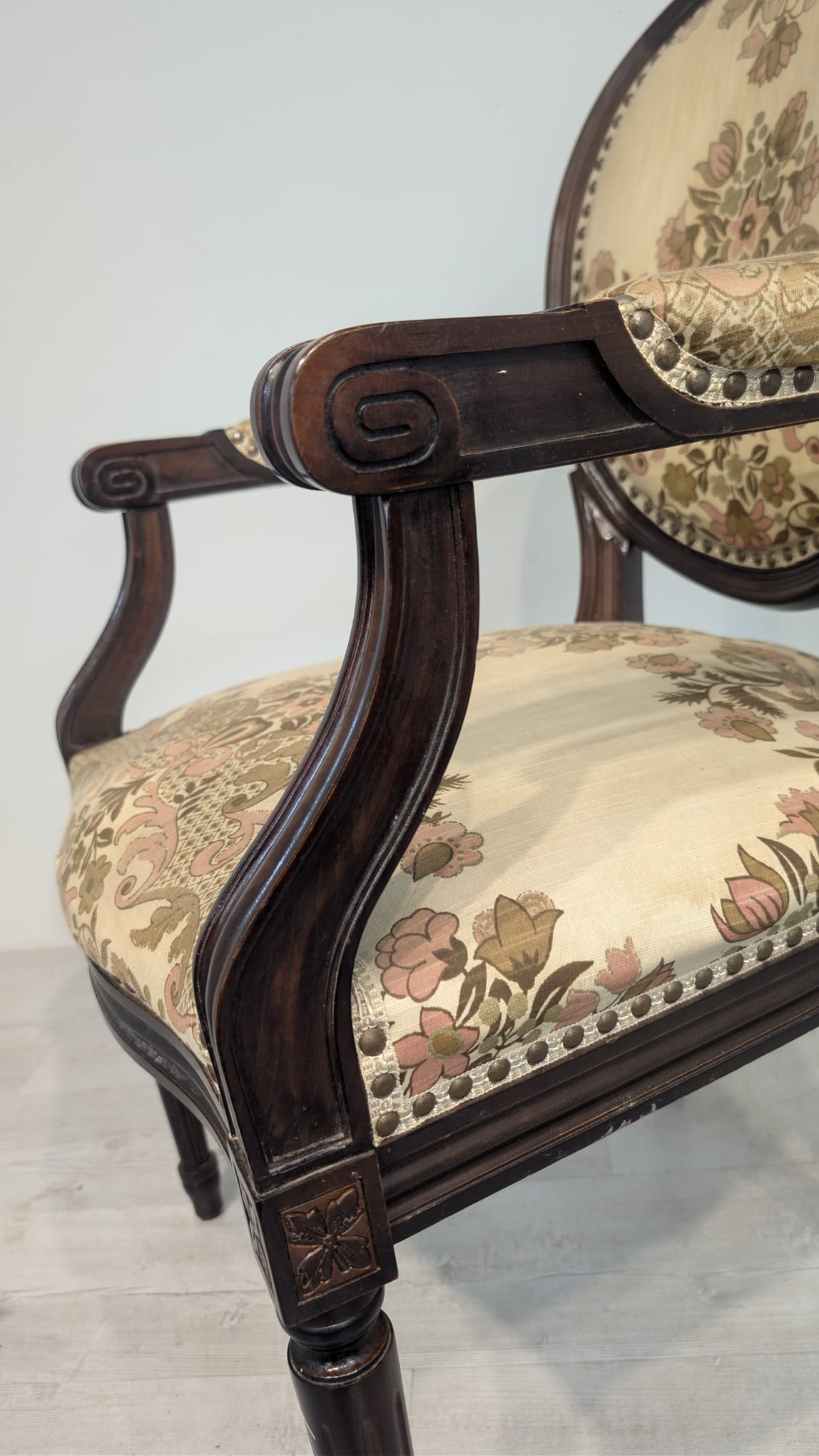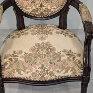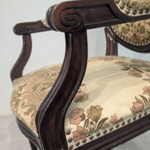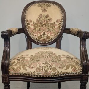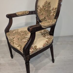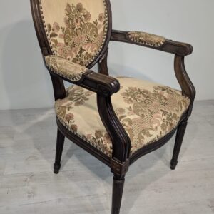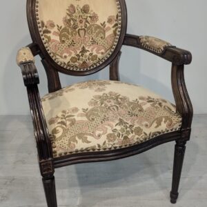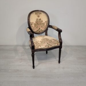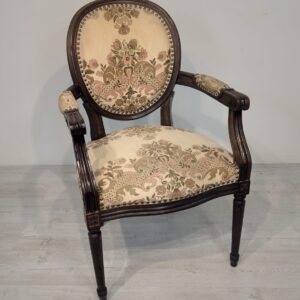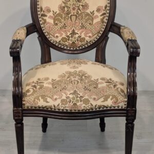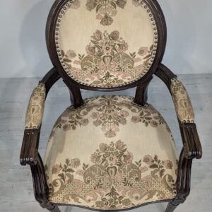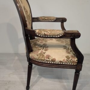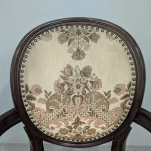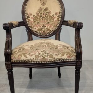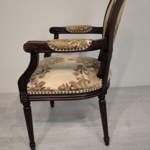 Stylowy fotel w stylu Ludwika XVI, wykonany z drewna orzechowego. Posiada okrągły, wytłaczany wzór na oparciu oraz tapicerkę w kwiatowy wzór. Mebel jest używany, ale w dobrym stanie. Idealny do uzupełnienia klasycznego wystroju wnętrza.
