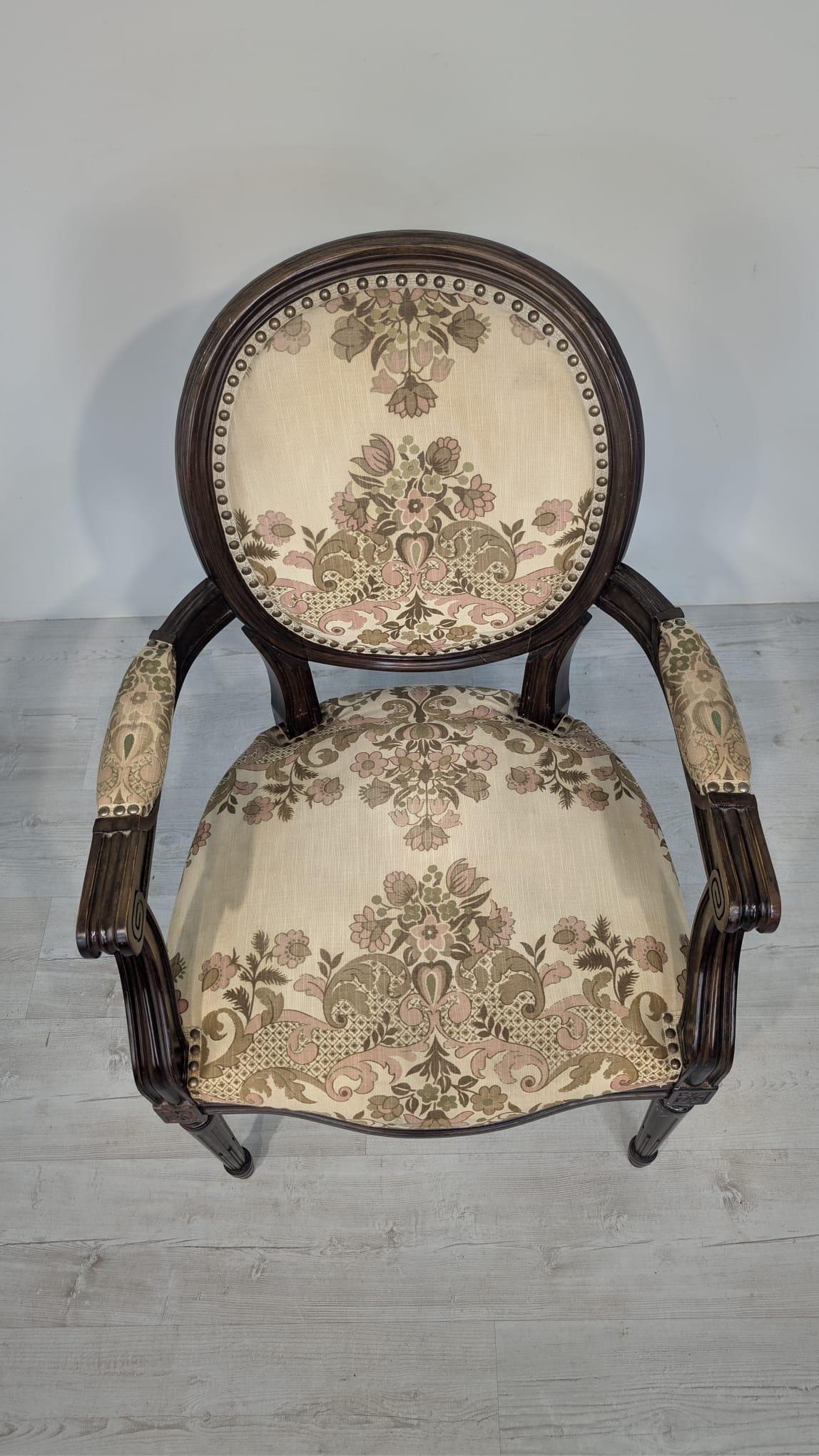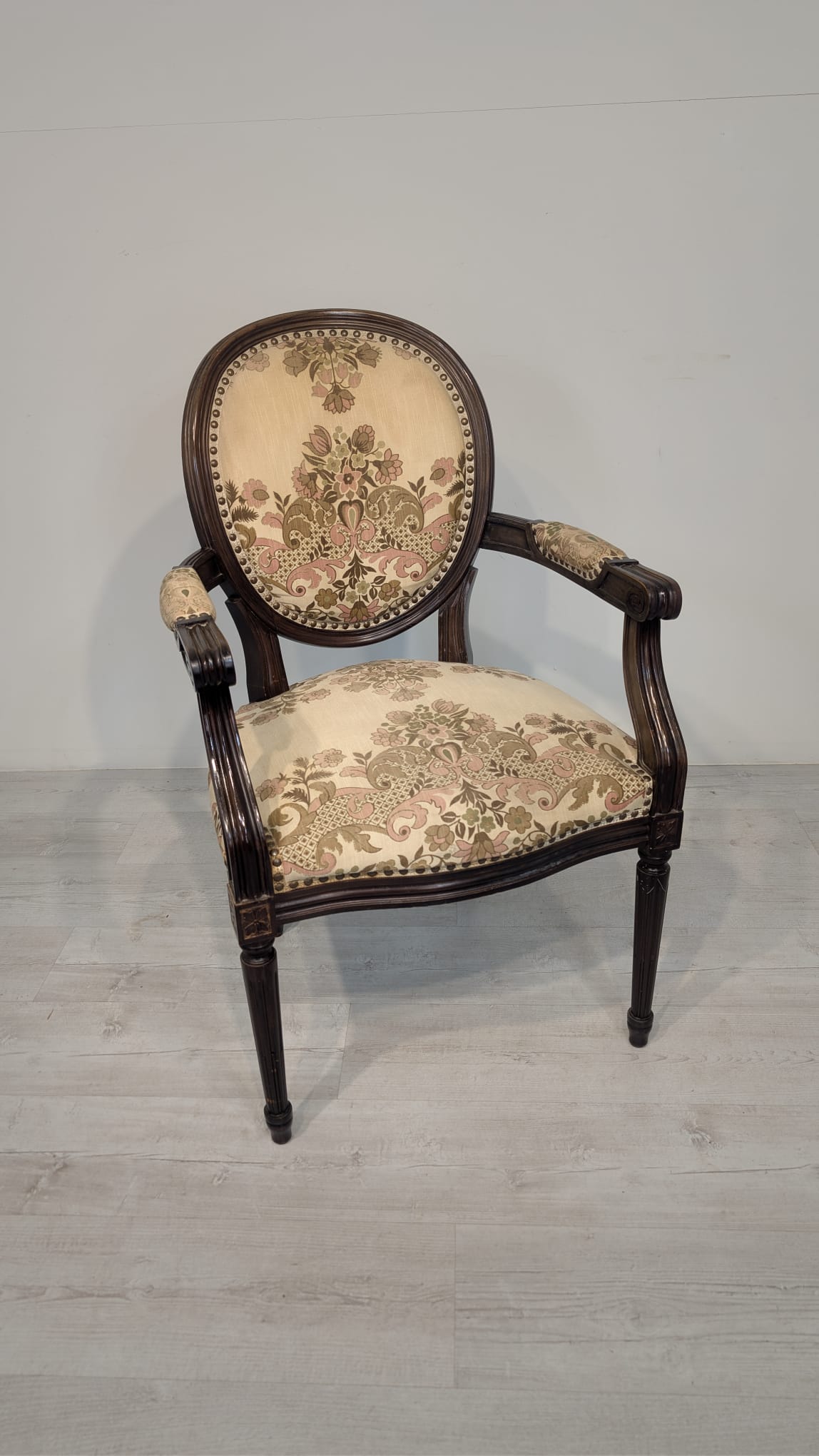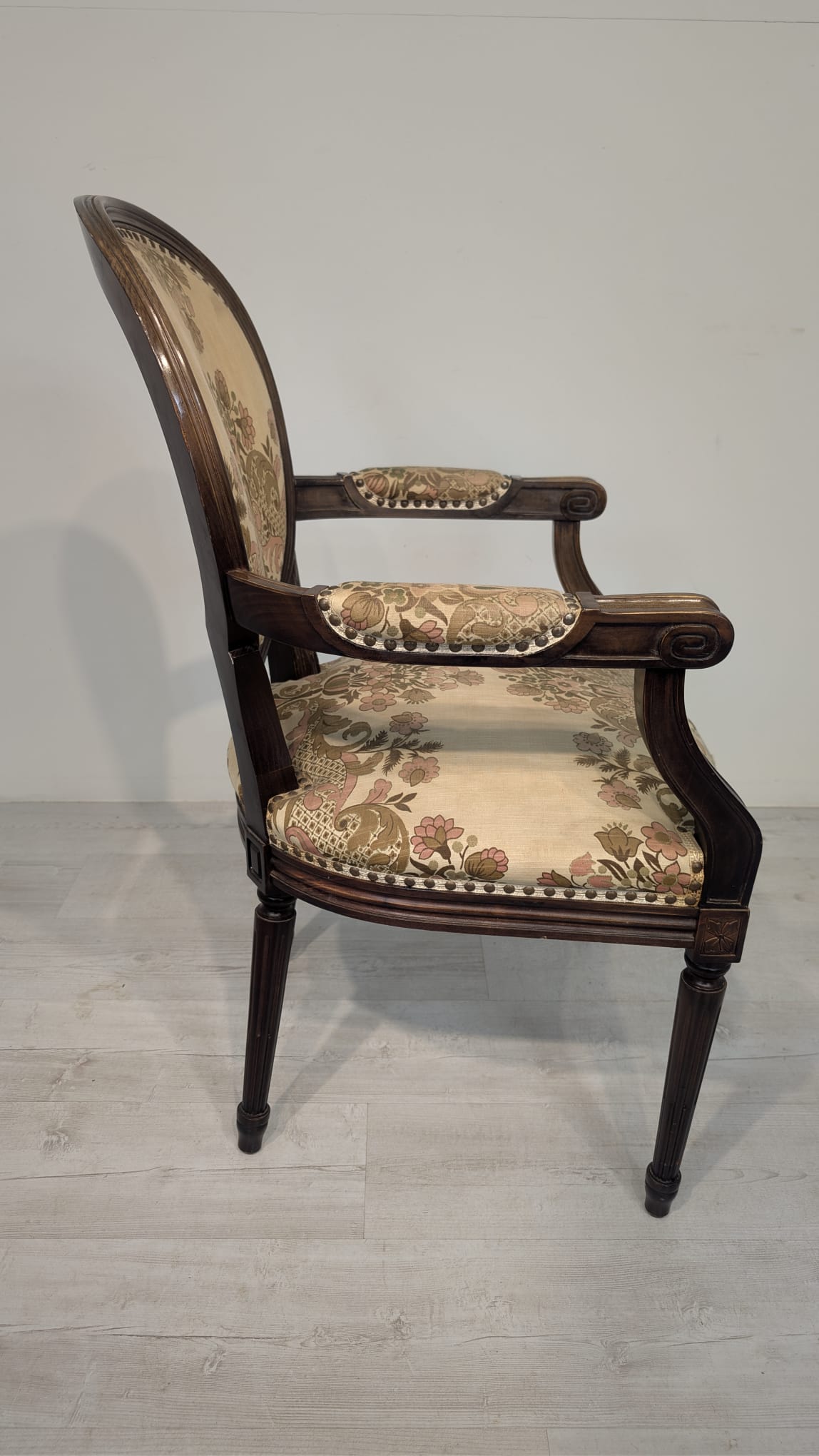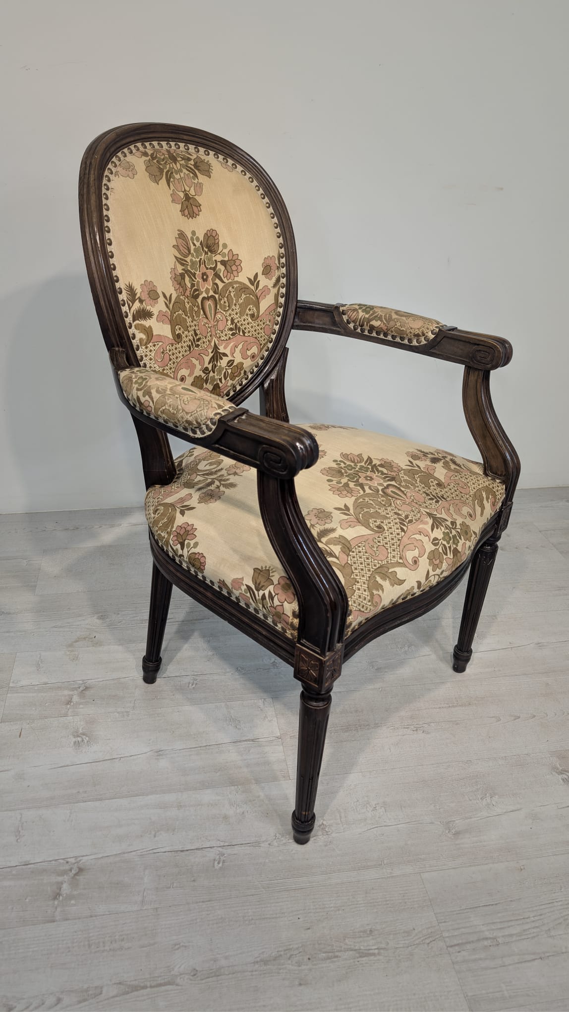 Stylowy fotel w stylu Ludwika XVI, wykonany z drewna orzechowego. Posiada okrągły, wytłaczany wzór na oparciu oraz tapicerkę w kwiatowy wzór. Mebel jest używany, ale w dobrym stanie. Idealny do uzupełnienia klasycznego wystroju wnętrza.