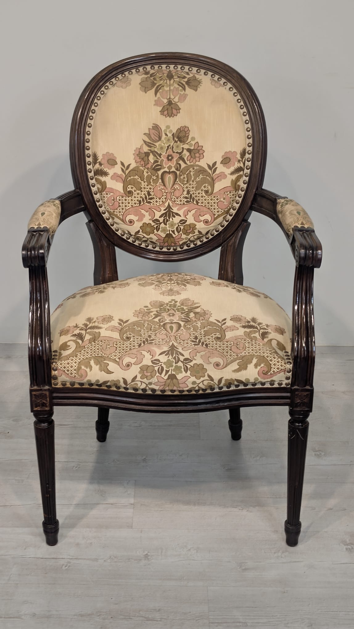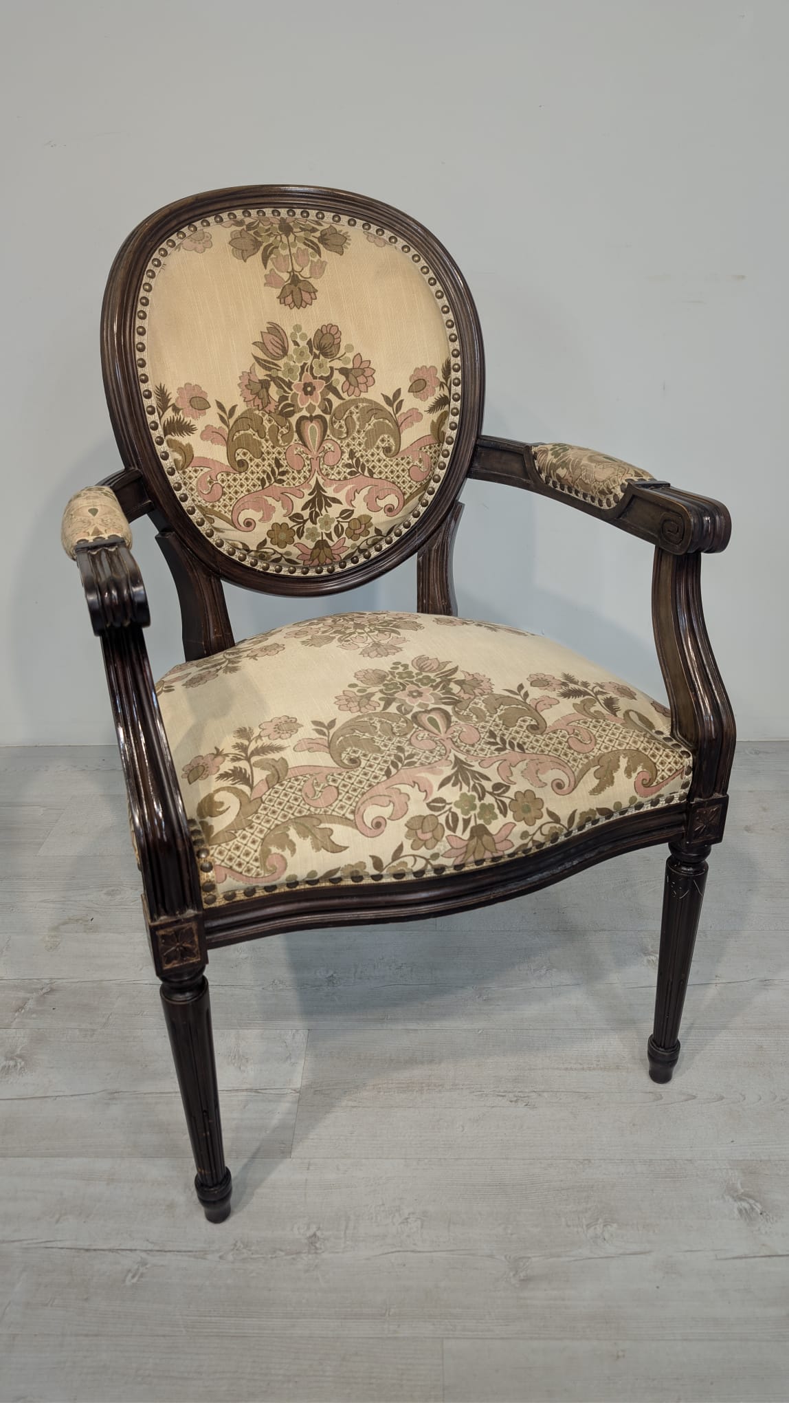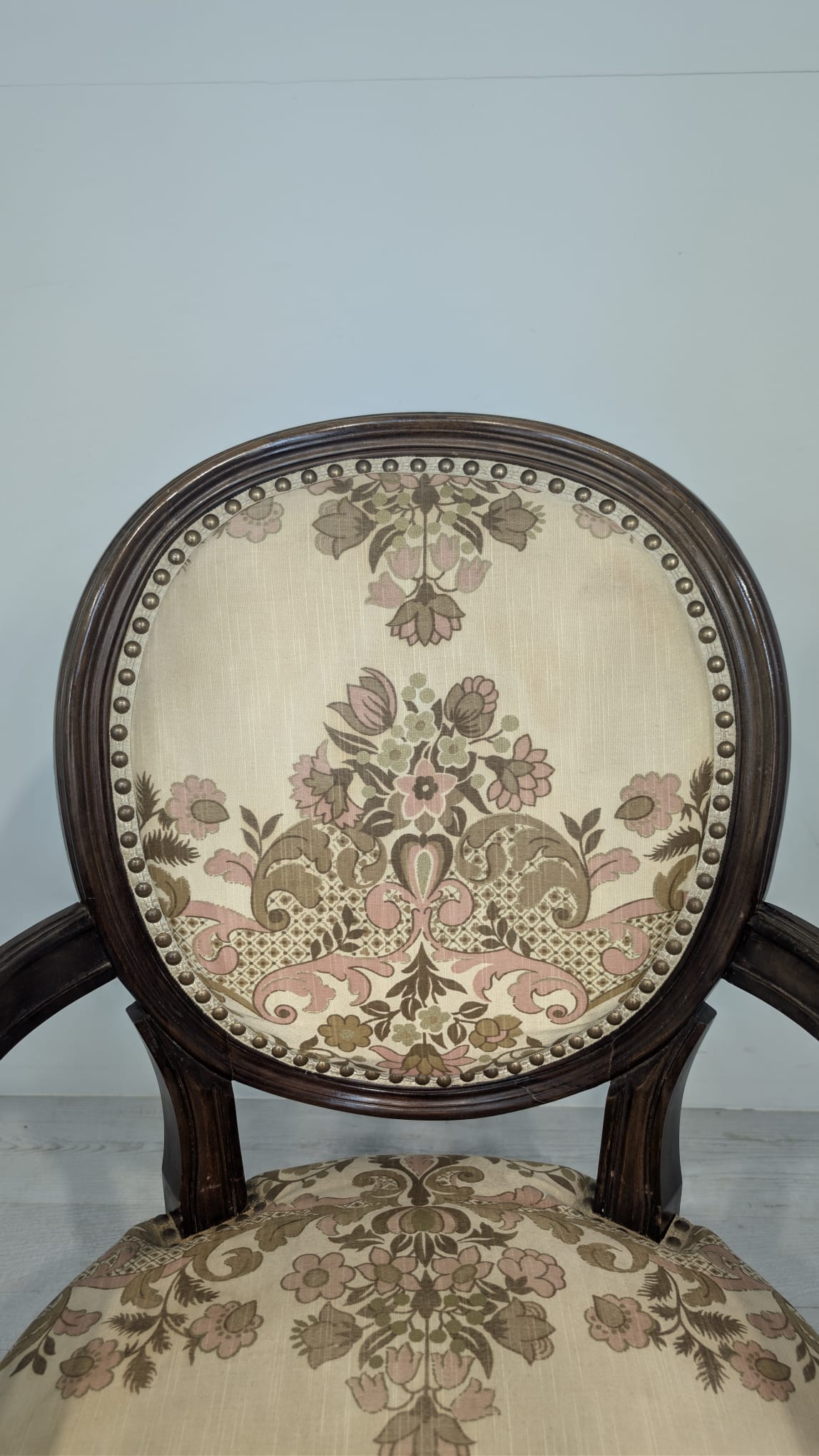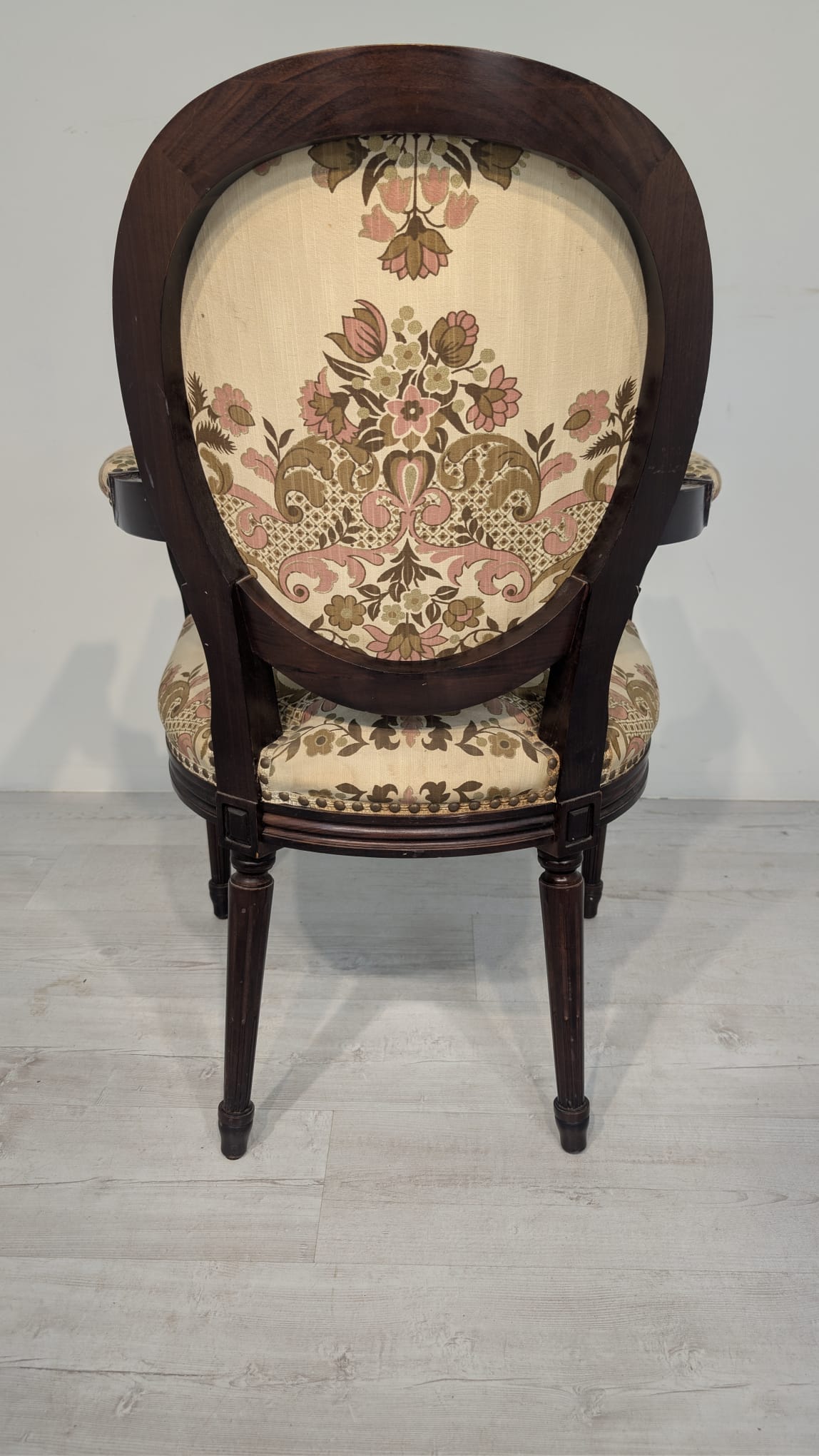 Stylowy fotel w stylu Ludwika XVI, wykonany z drewna orzechowego. Posiada okrągły, wytłaczany wzór na oparciu oraz tapicerkę w kwiatowy wzór. Mebel jest używany, ale w dobrym stanie. Idealny do uzupełnienia klasycznego wystroju wnętrza.