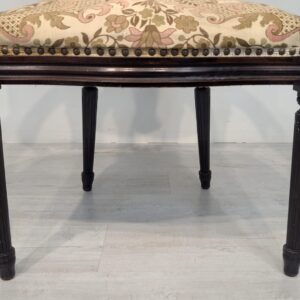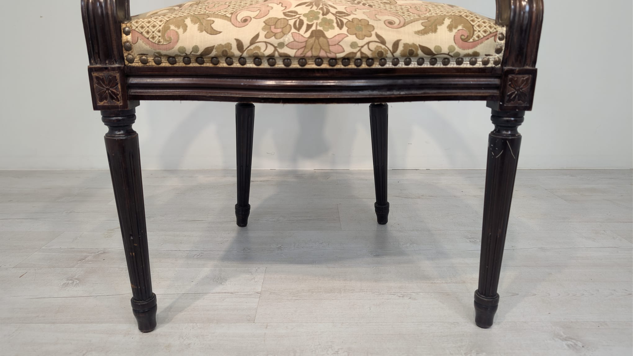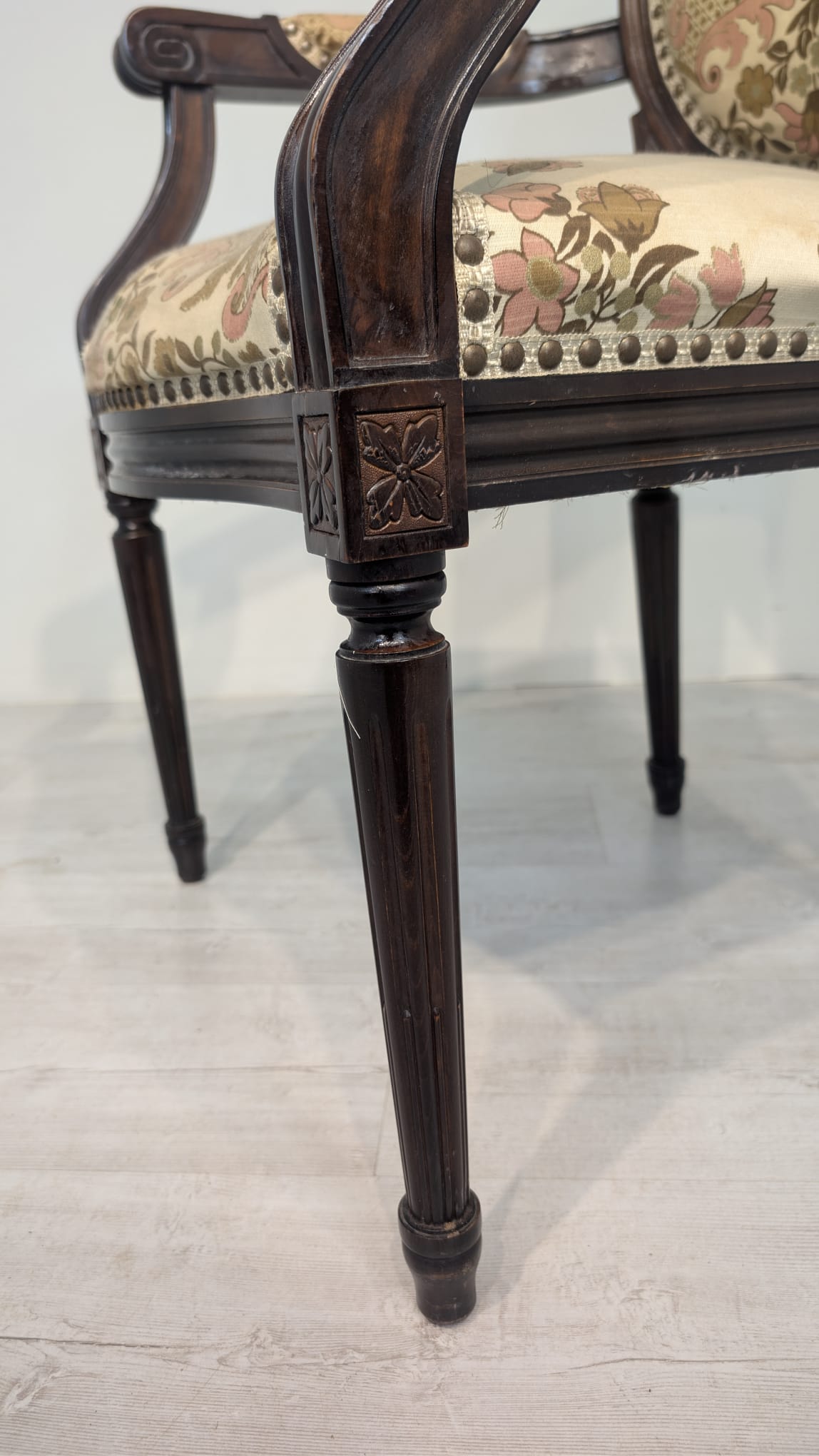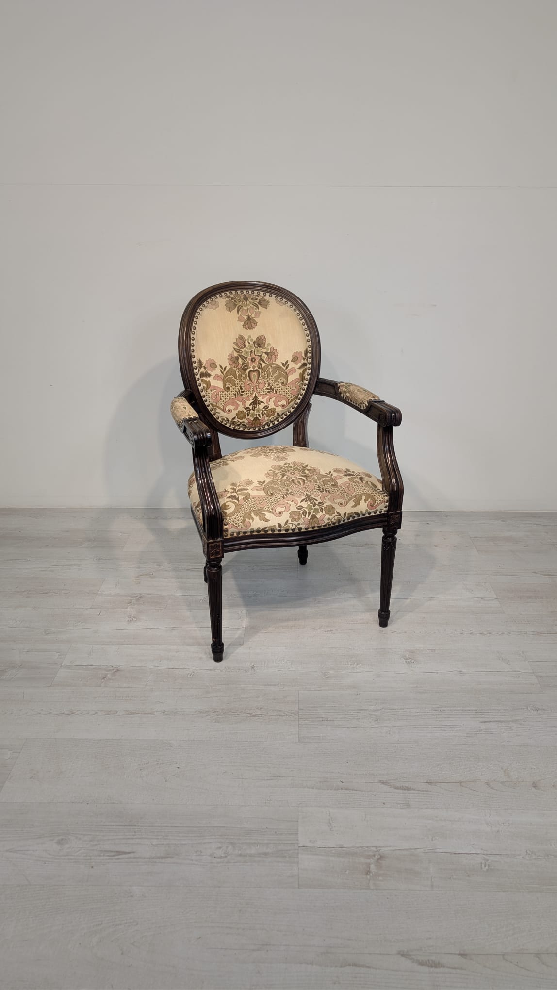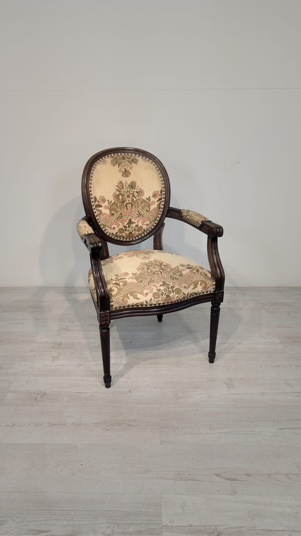 Stylowy fotel w stylu Ludwika XVI, wykonany z drewna orzechowego. Posiada okrągły, wytłaczany wzór na oparciu oraz tapicerkę w kwiatowy wzór. Mebel jest używany, ale w dobrym stanie. Idealny do uzupełnienia klasycznego wystroju wnętrza.