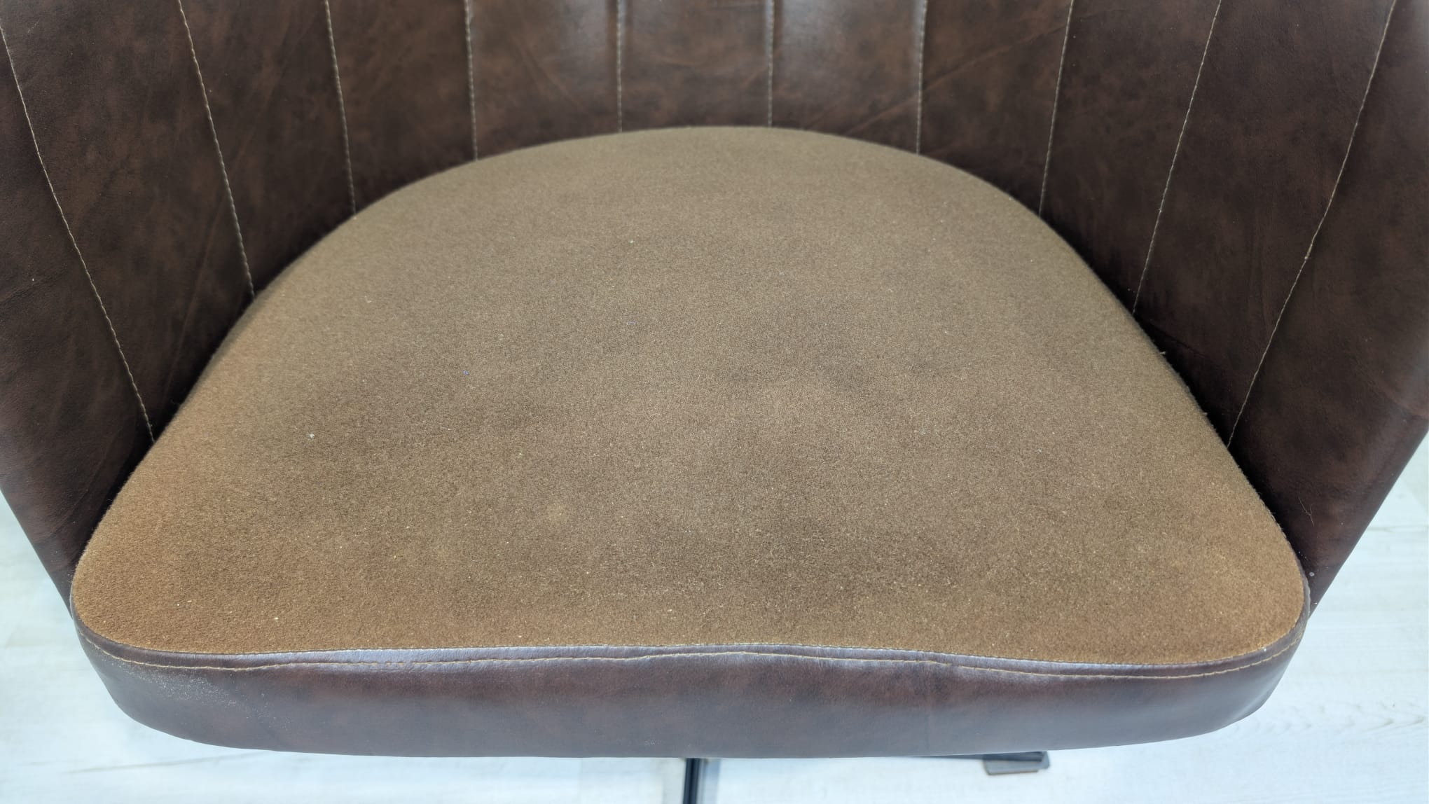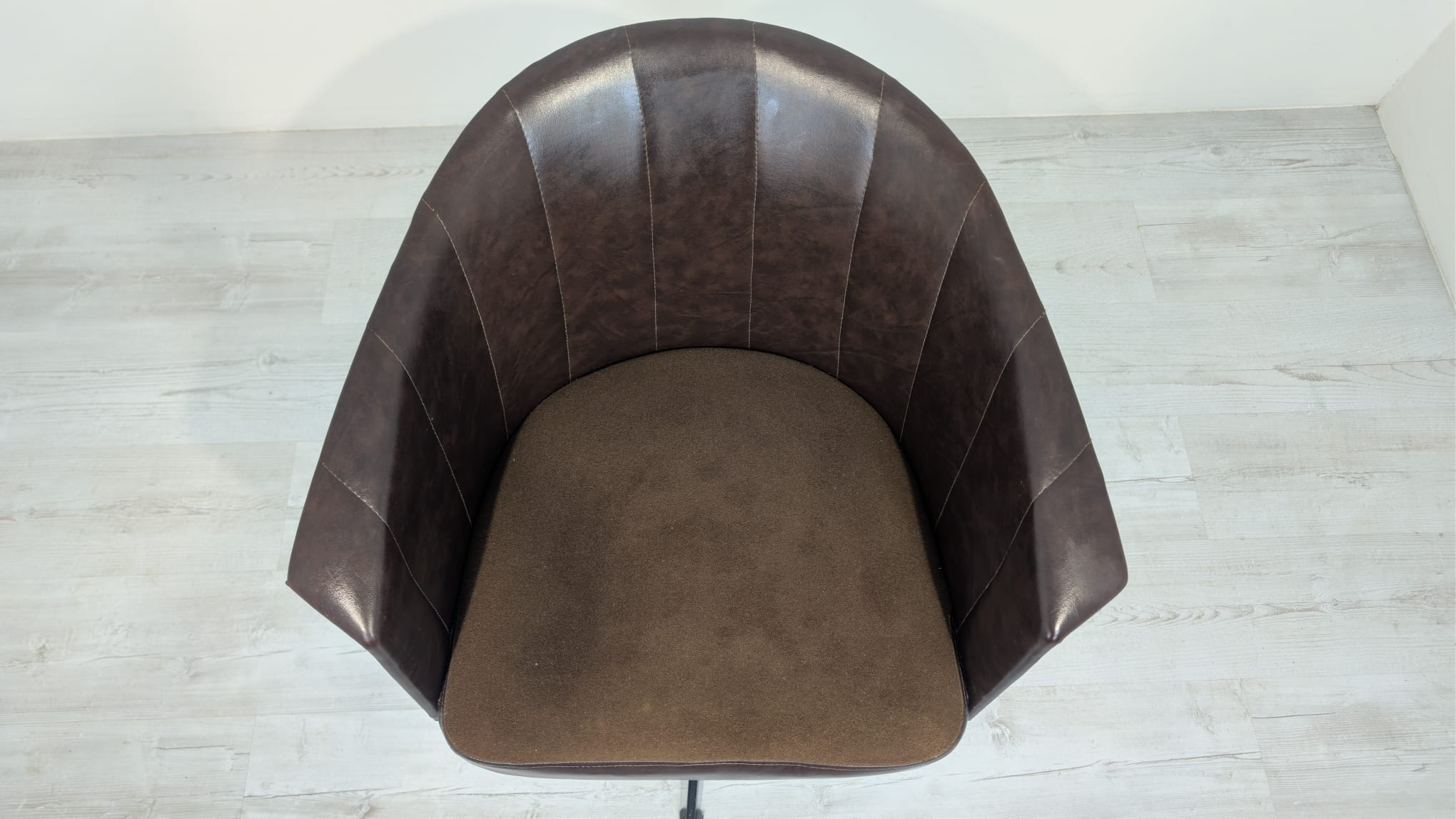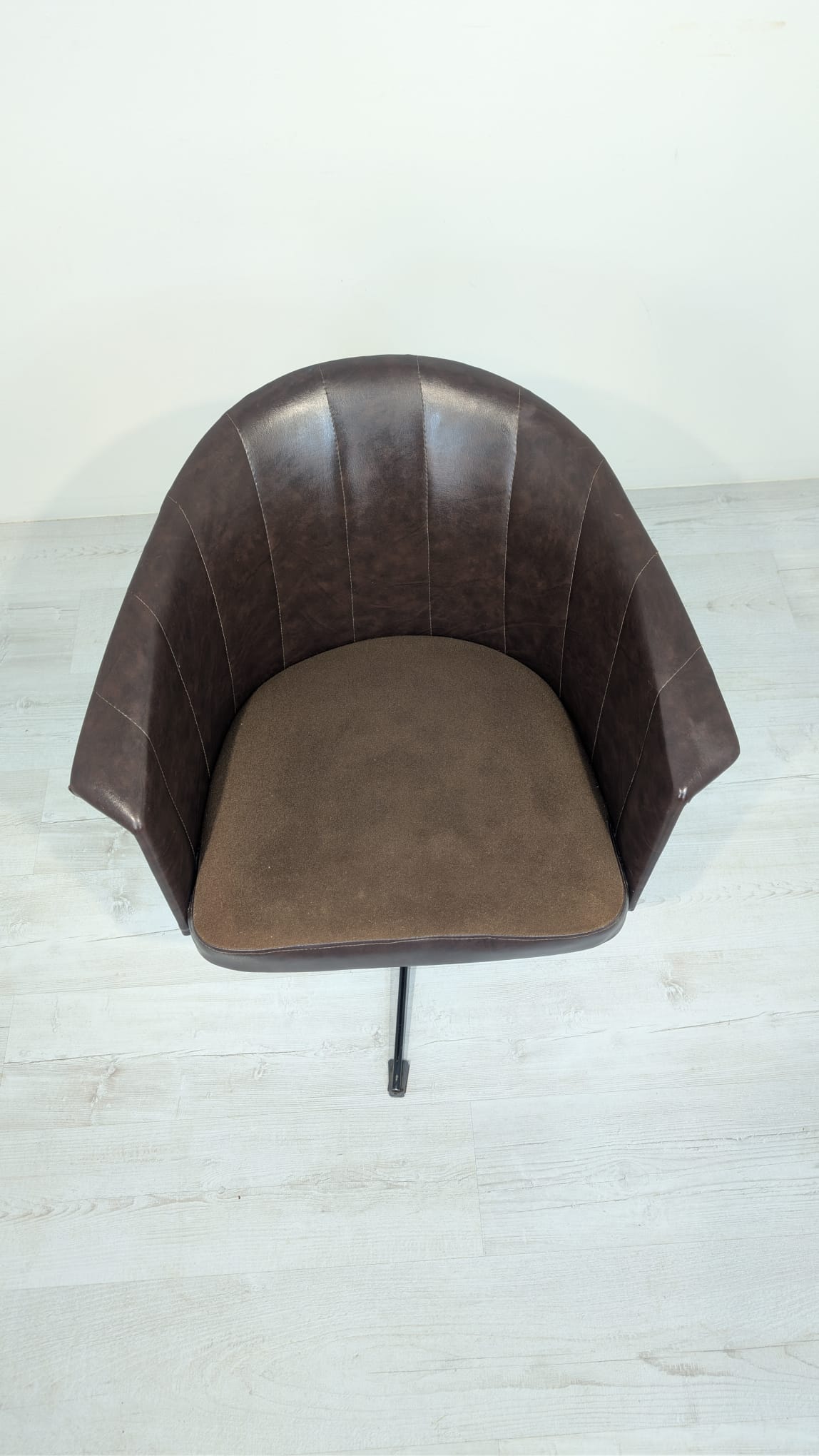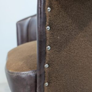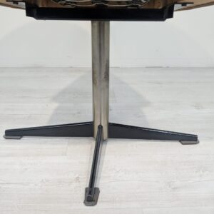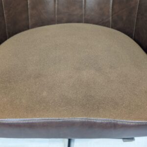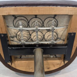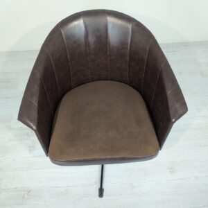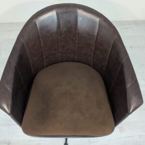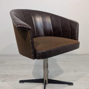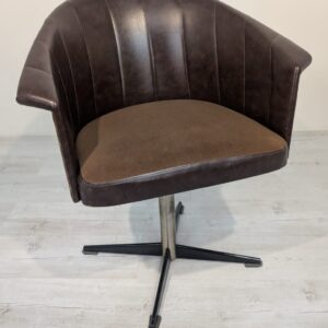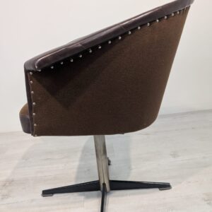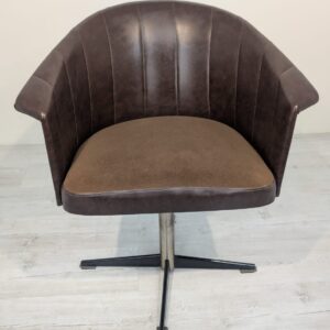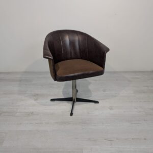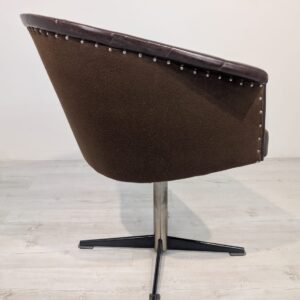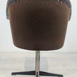 Designerski fotel obrotowy tapicerowany skórą naturalna w kolorze brązowym. Posiada charakterystyczny kształt z lat 60-tych oraz siedzisko na sprężynach, które zapewniają wygodę i komfort siedzenia.