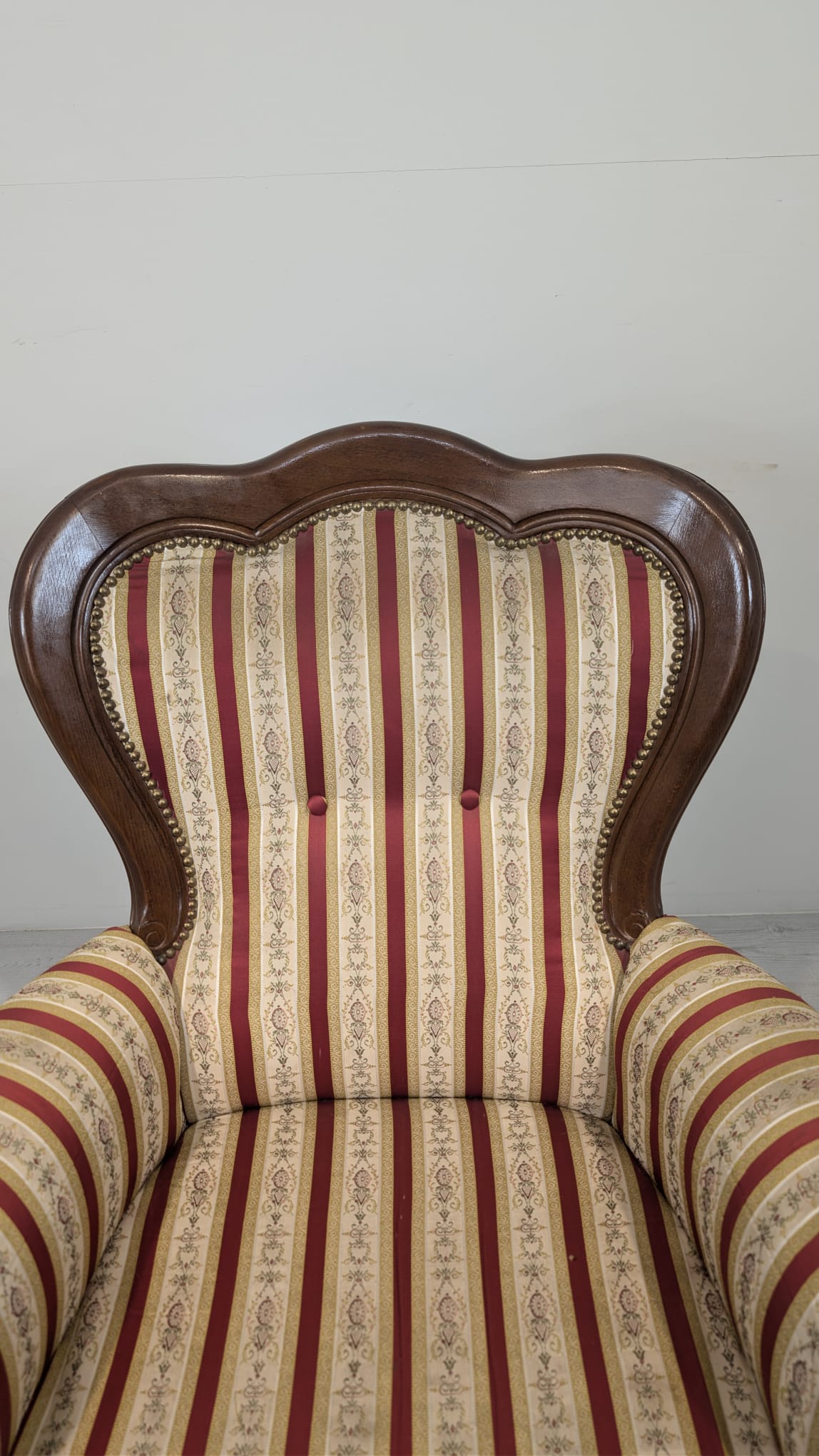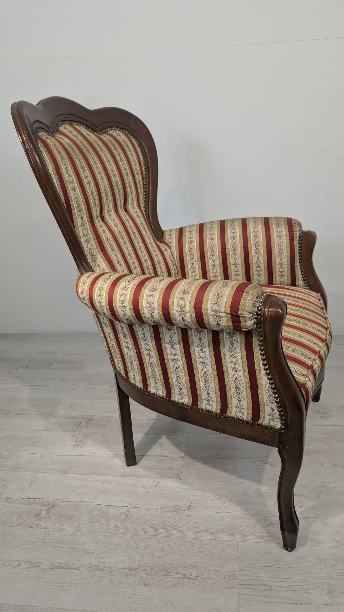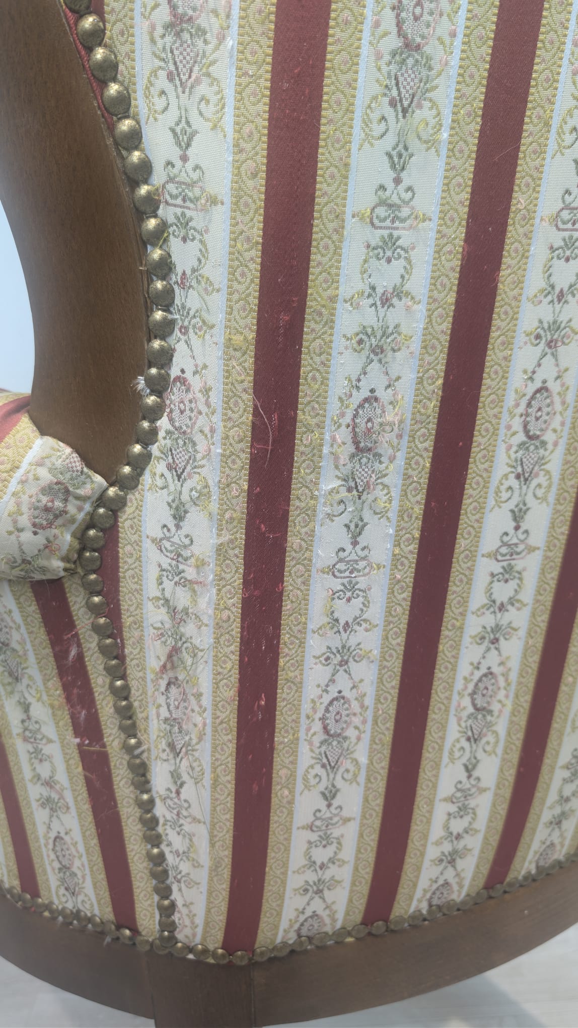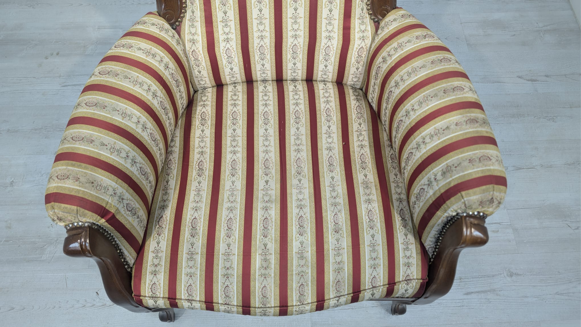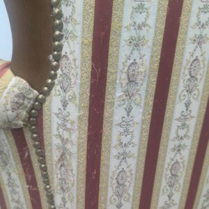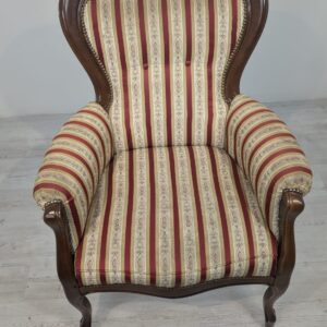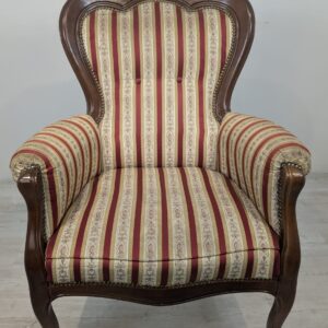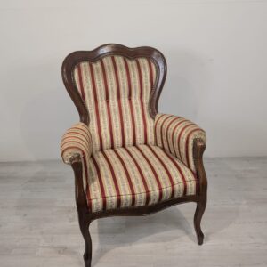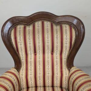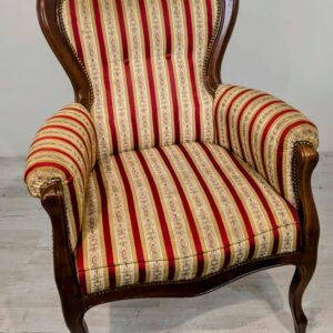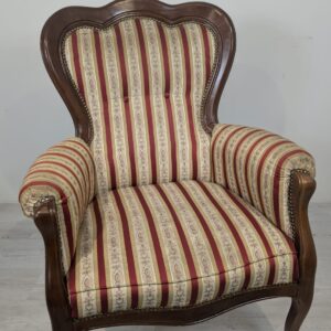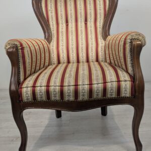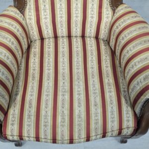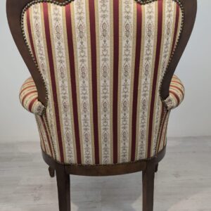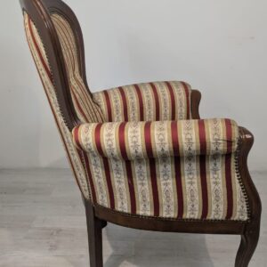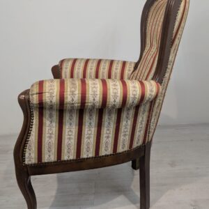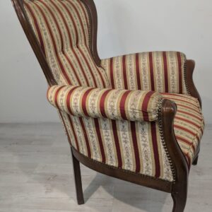 Stylowy fotel w stylu Ludwika XV, na sprężynach, z drewnianą, rzeźbioną ramą w ciemnym odcieniu. Tapicerka w pionowe pasy w kolorach czerwieni i beżu, dodająca elegancji temu meblu.