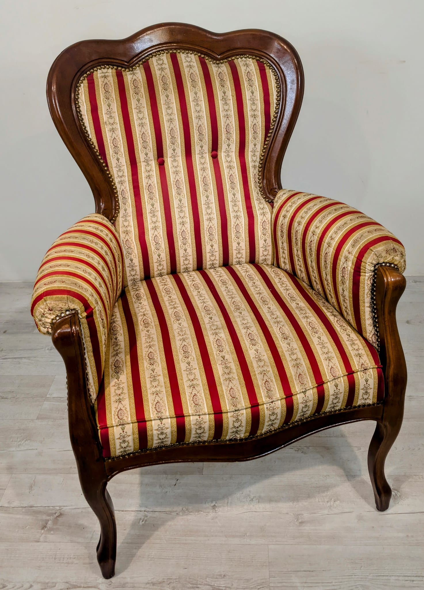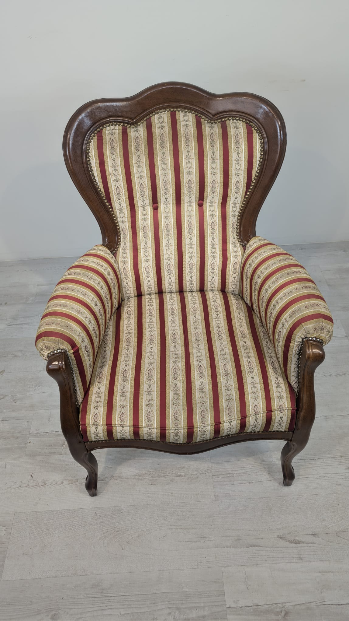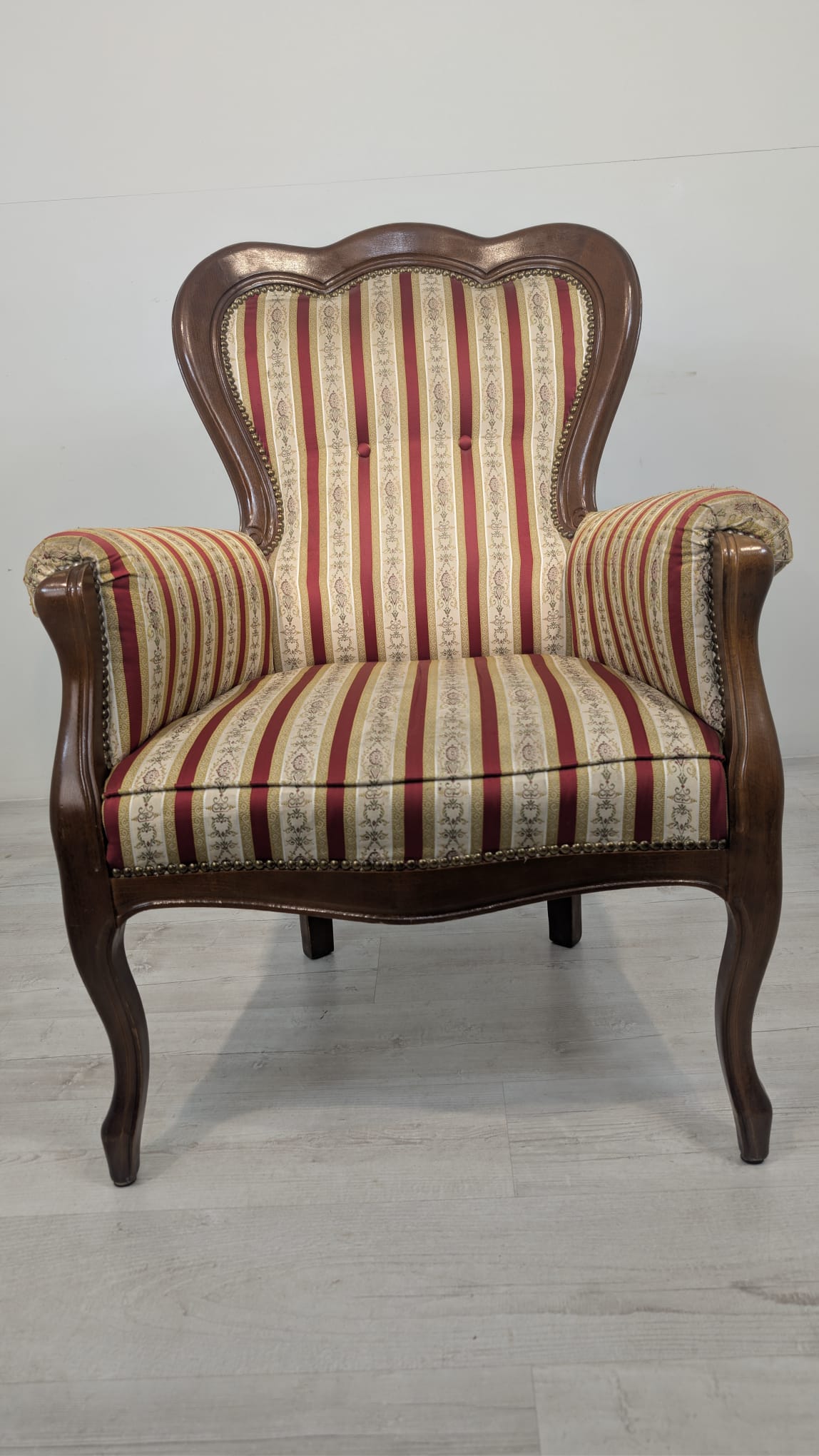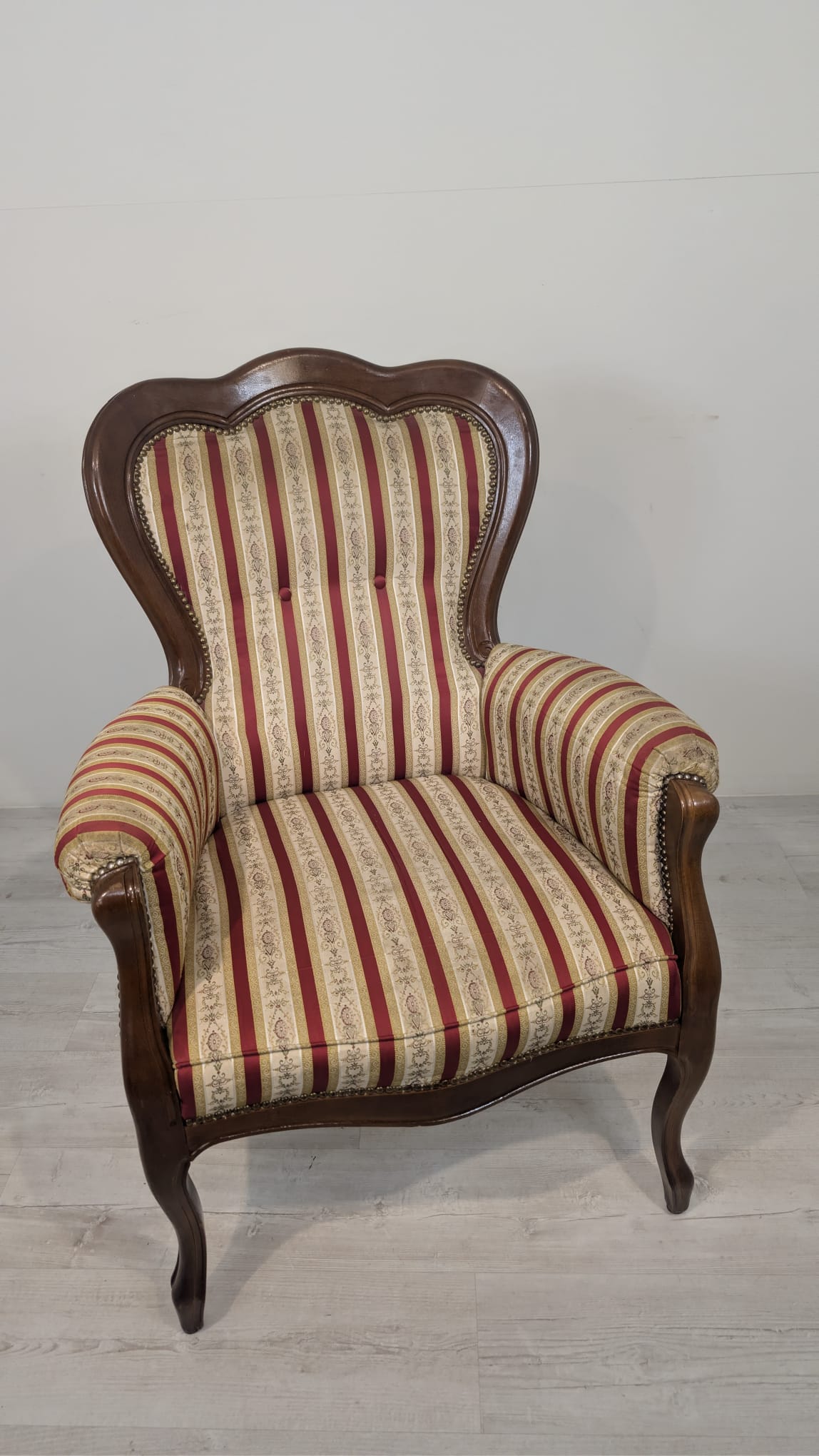 Stylowy fotel w stylu Ludwika XV, na sprężynach, z drewnianą, rzeźbioną ramą w ciemnym odcieniu. Tapicerka w pionowe pasy w kolorach czerwieni i beżu, dodająca elegancji temu meblu.