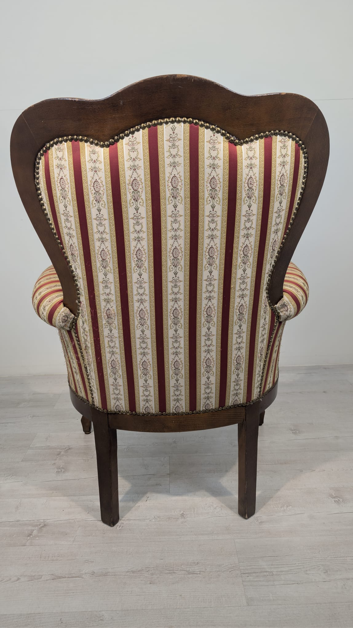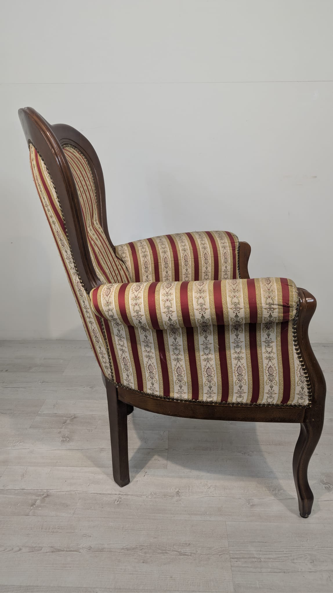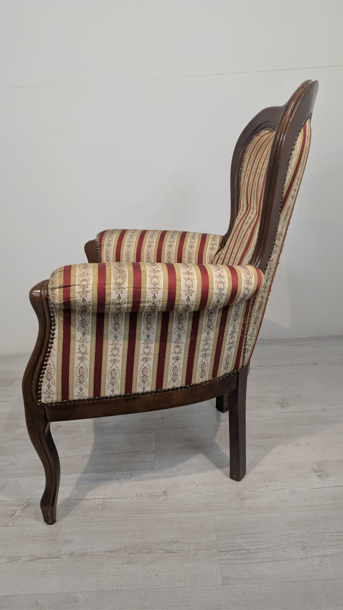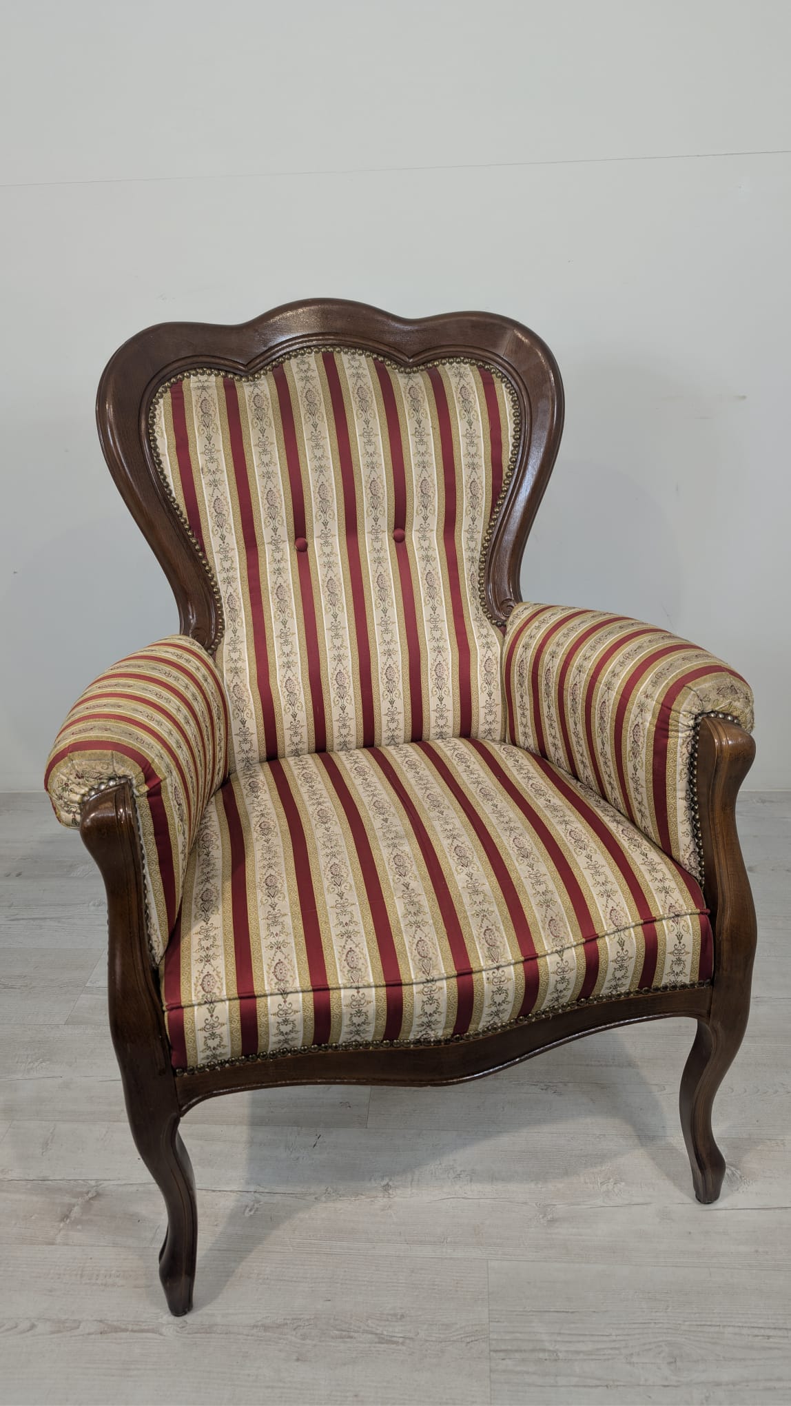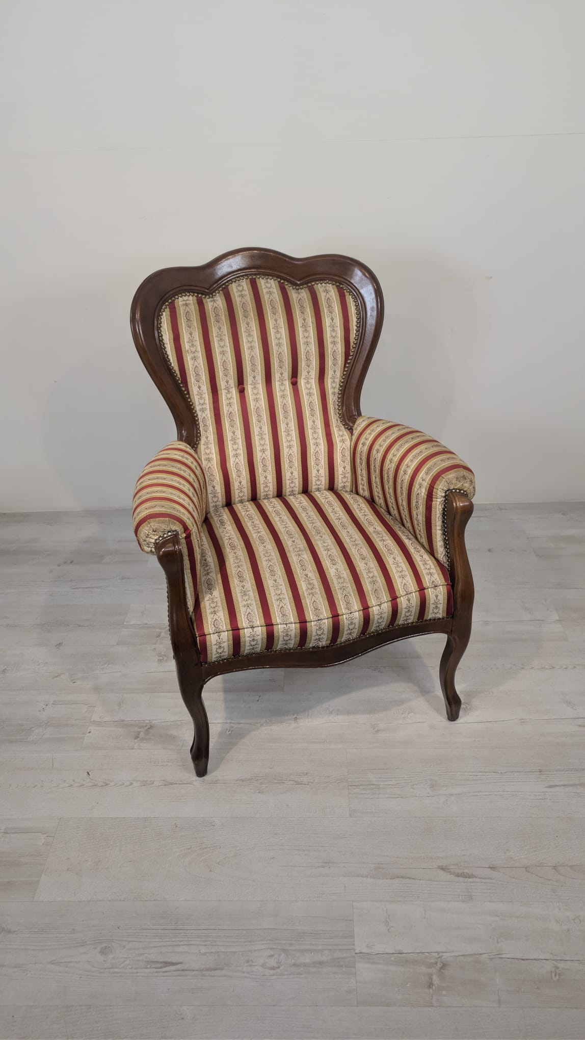 Stylowy fotel w stylu Ludwika XV, na sprężynach, z drewnianą, rzeźbioną ramą w ciemnym odcieniu. Tapicerka w pionowe pasy w kolorach czerwieni i beżu, dodająca elegancji temu meblu.
