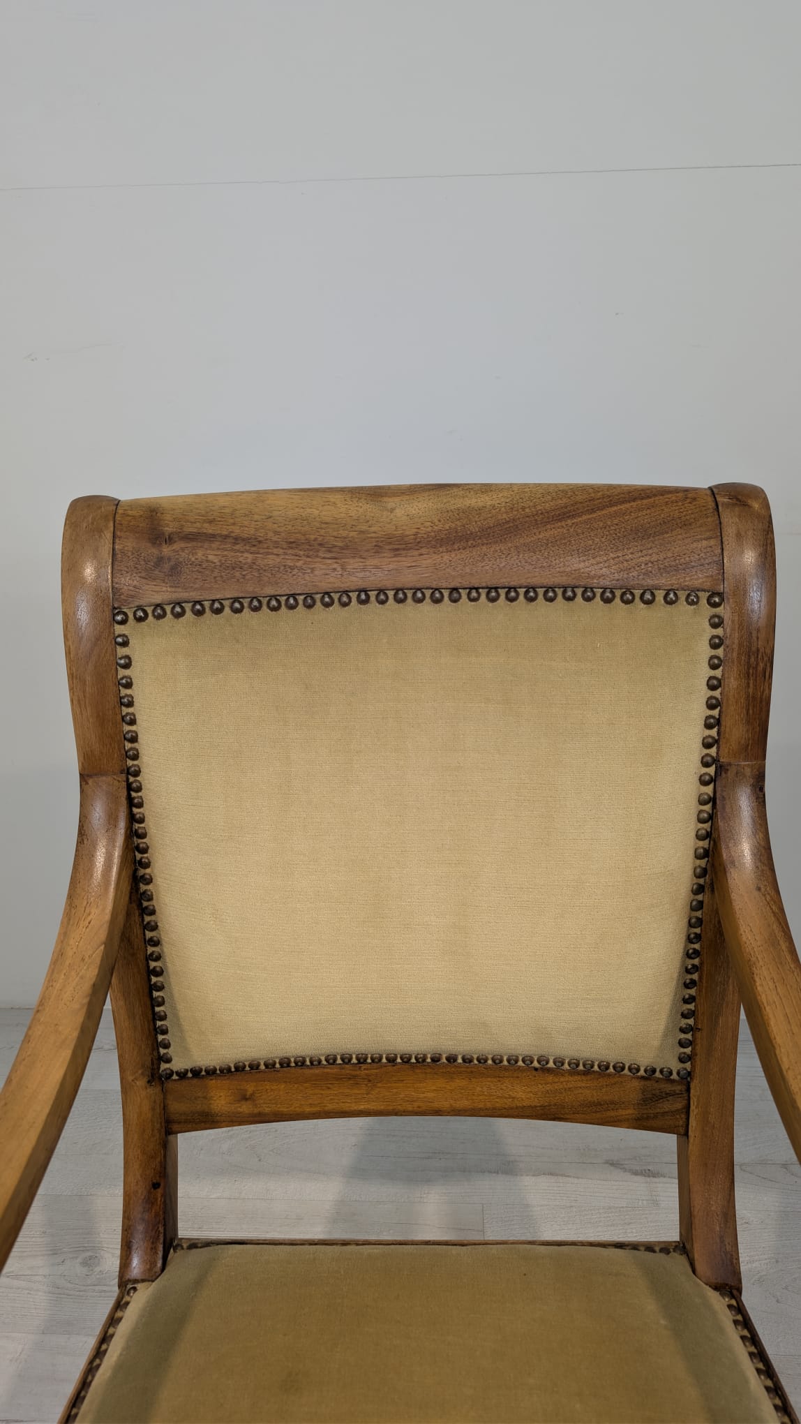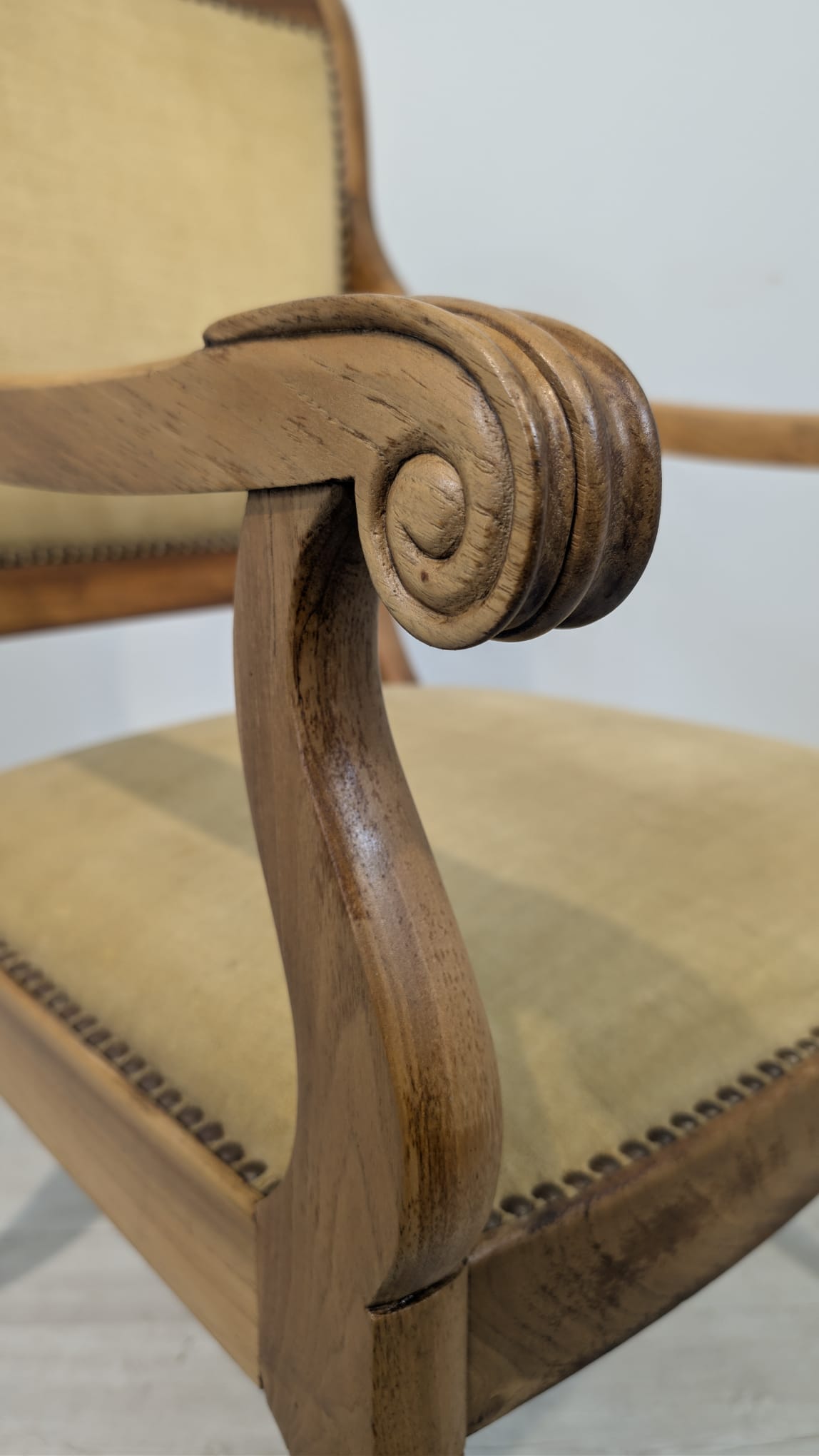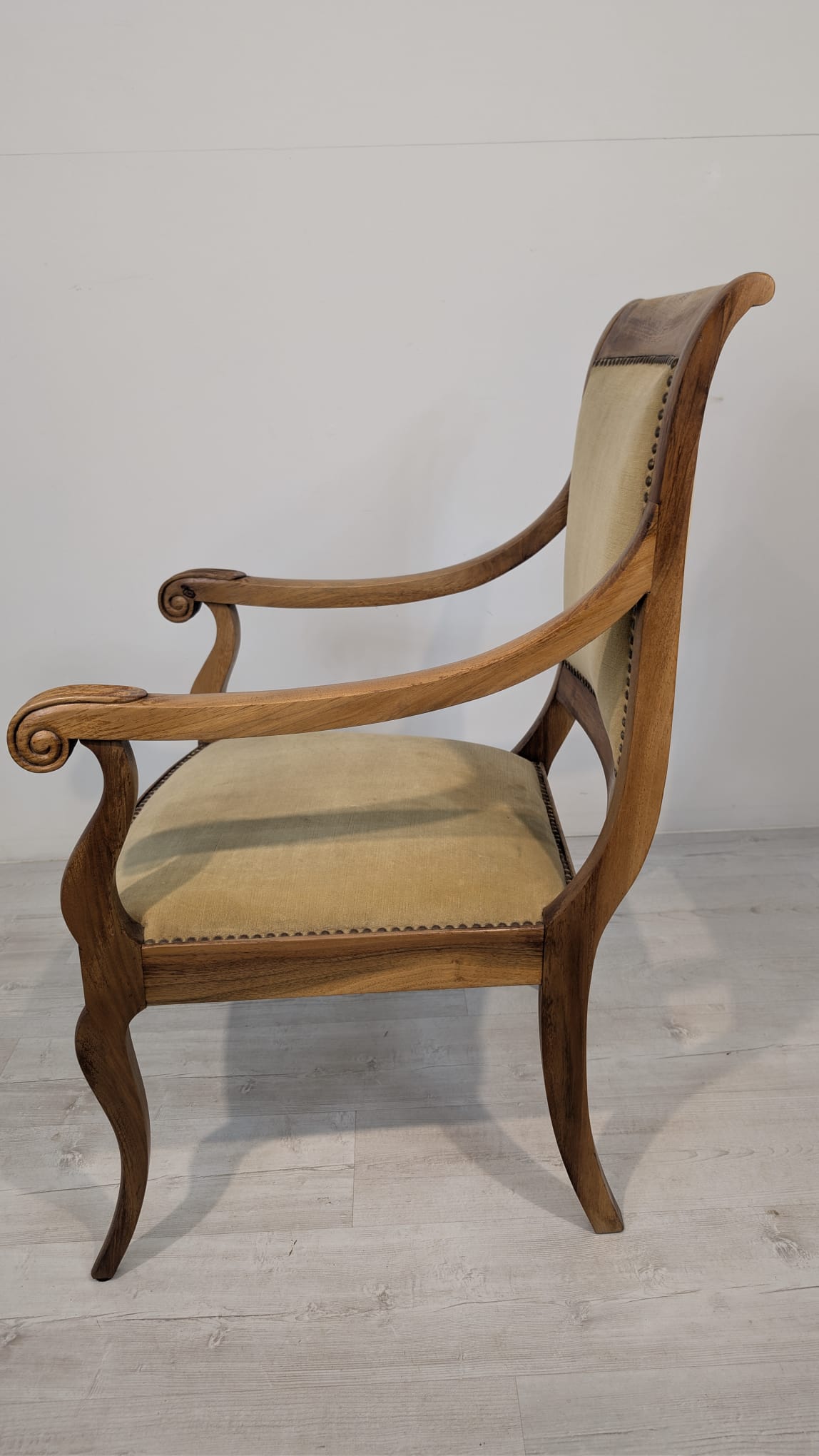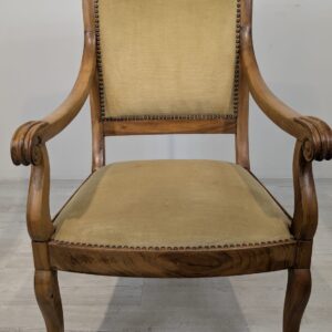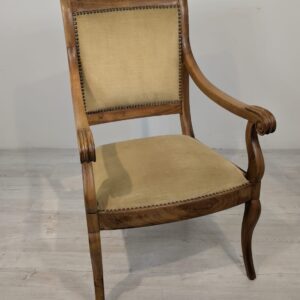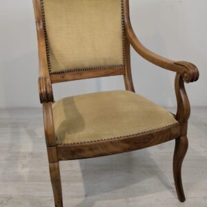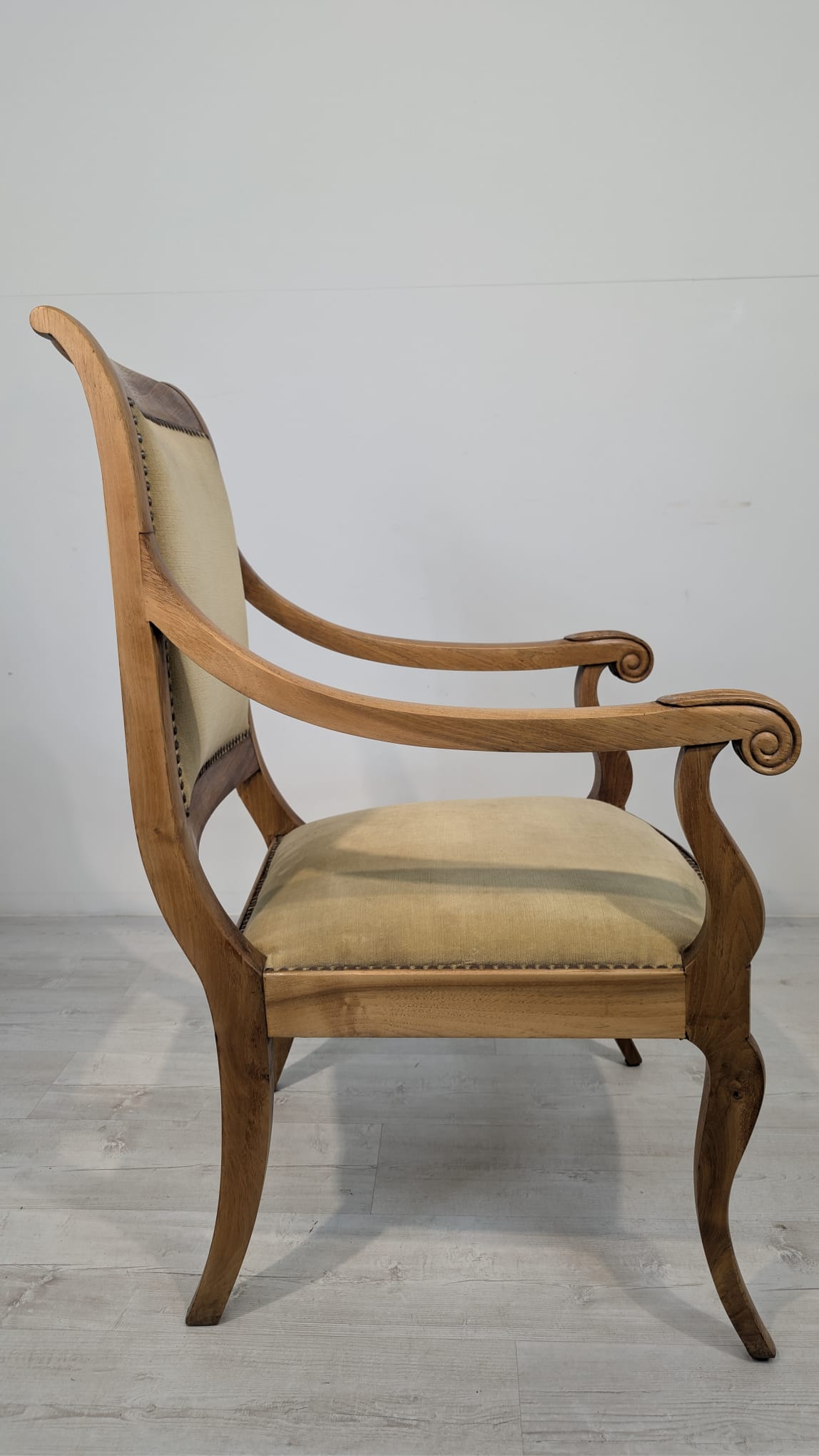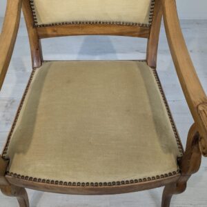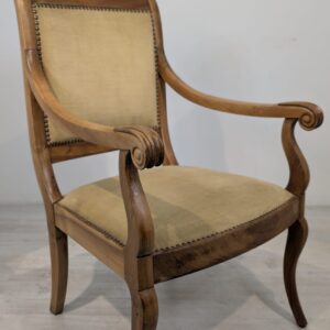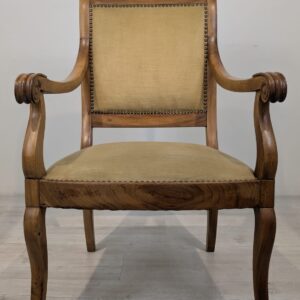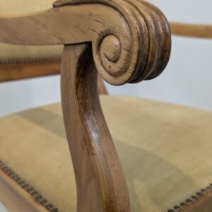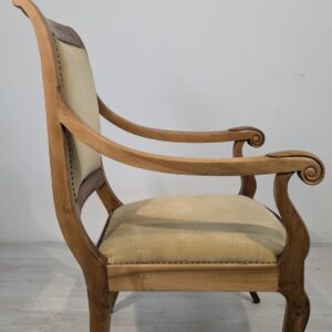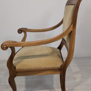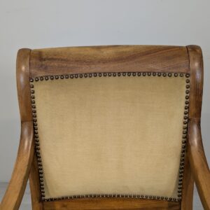 Solidny fotel z litego drewna palisandrowego. Klasyczny design z ozdobnymi elementami nadaje mu elegancki wygląd. Tapicerka w kolorze beżowym jest w dobrym stanie. Fotel będzie doskonałym dodatkiem do każdego wnętrza.