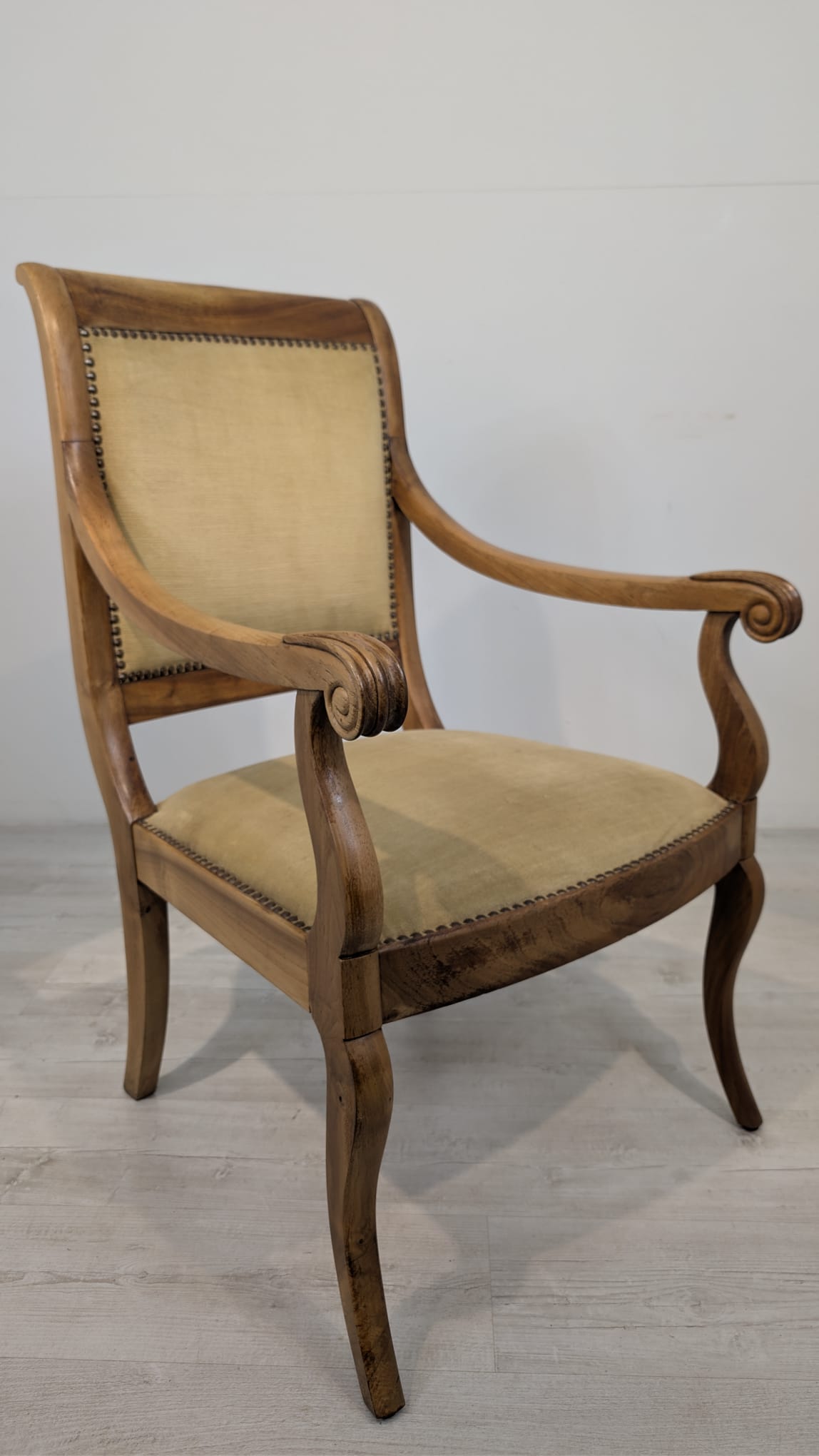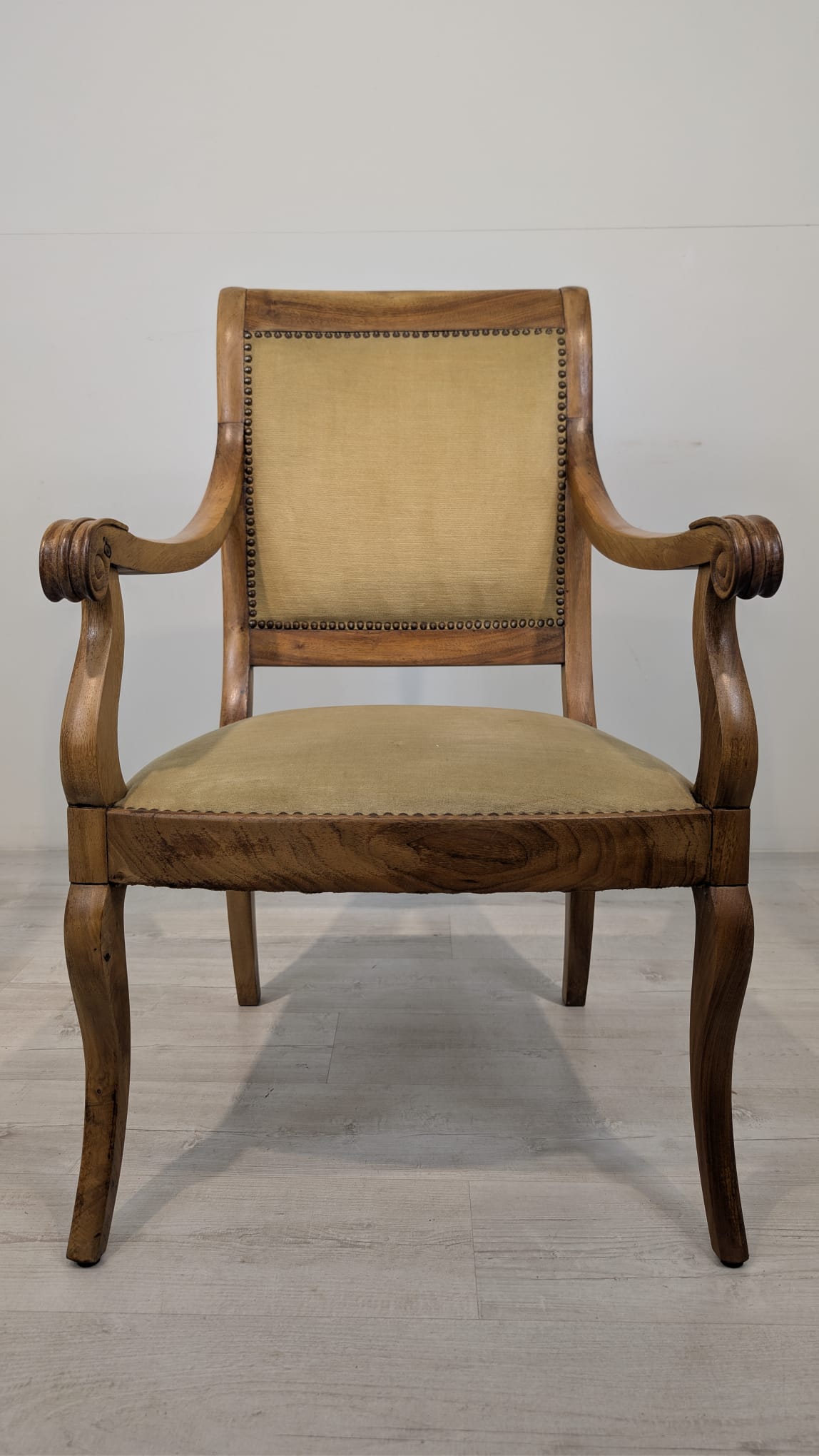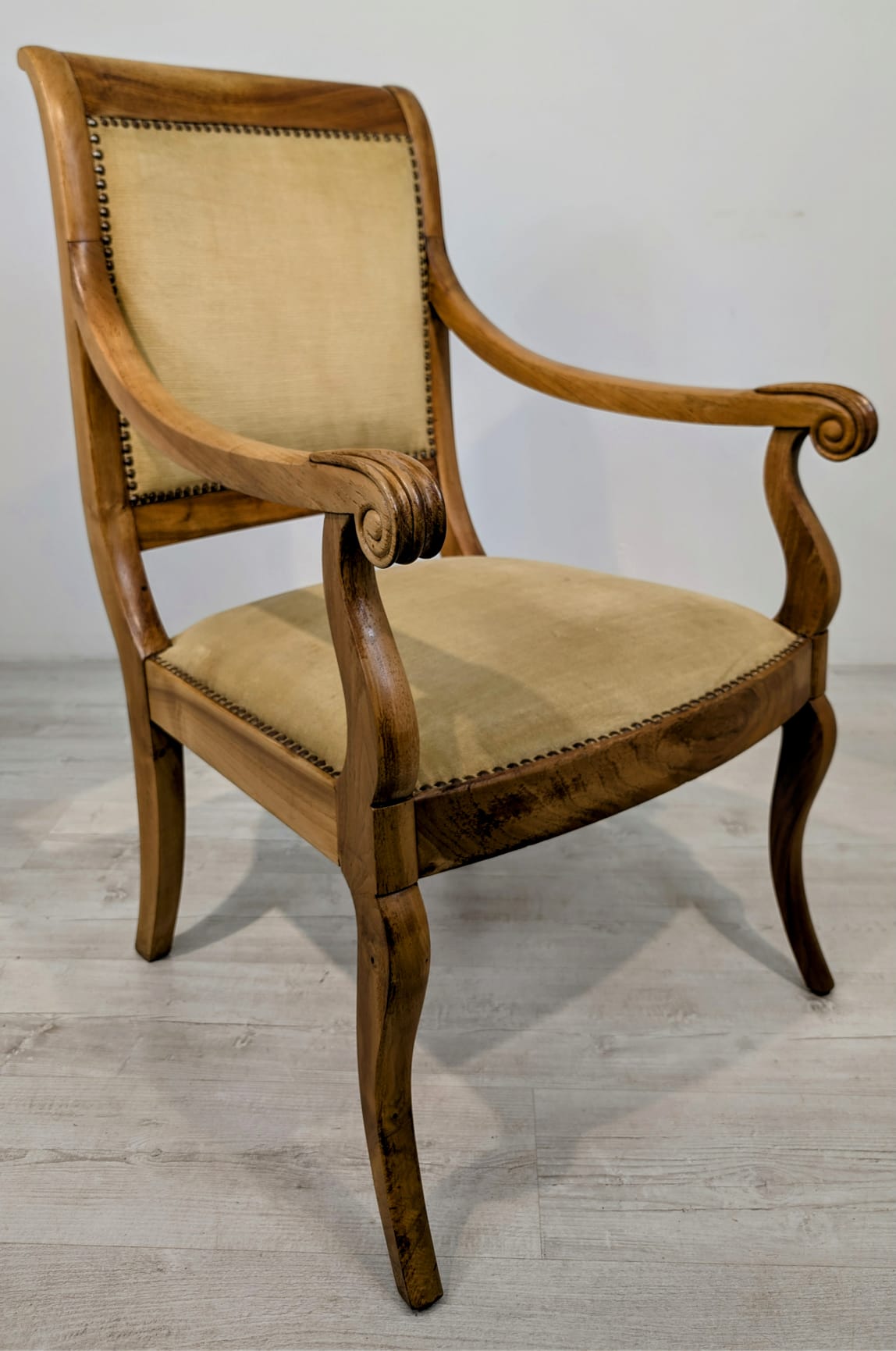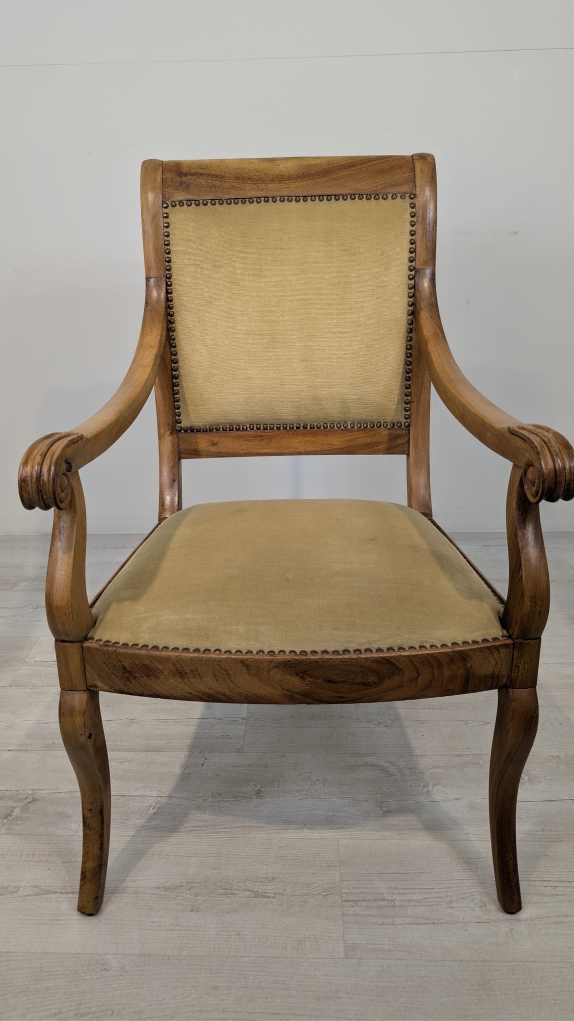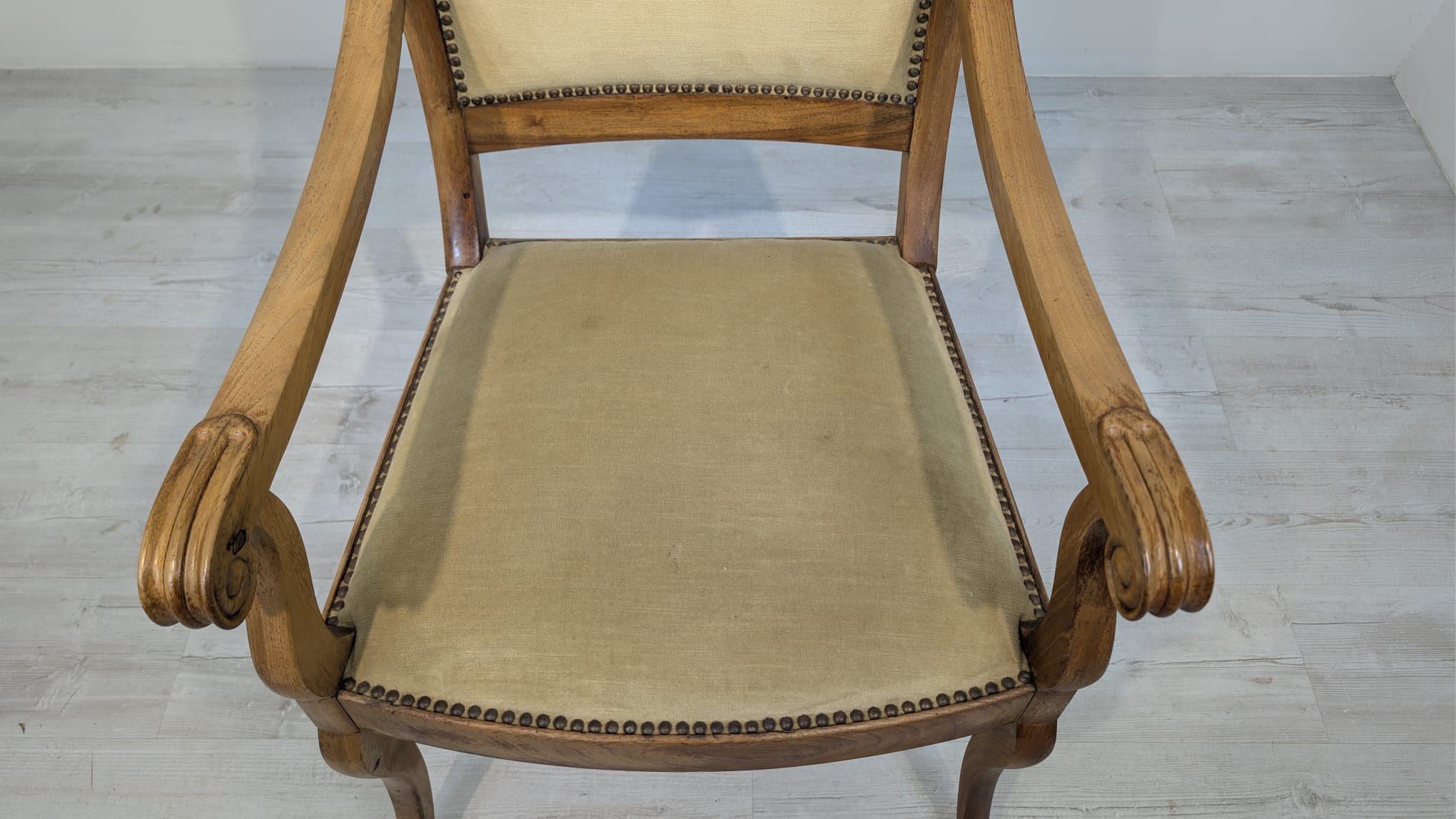 Solidny fotel z litego drewna palisandrowego. Klasyczny design z ozdobnymi elementami nadaje mu elegancki wygląd. Tapicerka w kolorze beżowym jest w dobrym stanie. Fotel będzie doskonałym dodatkiem do każdego wnętrza.