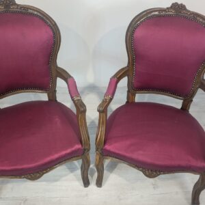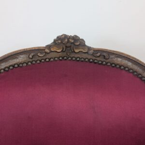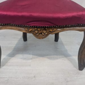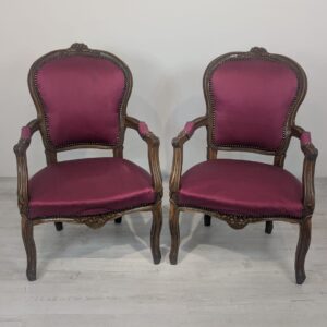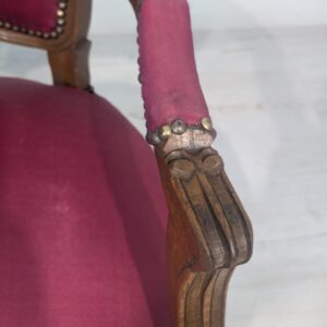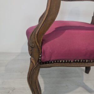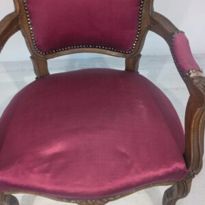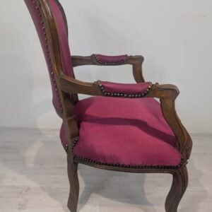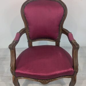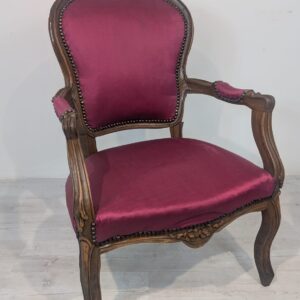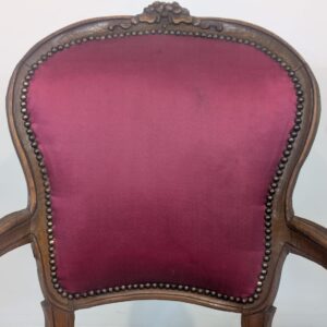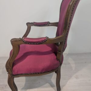 Elegancki fotel w stylu Ludwika XV, wykonany z litego drewna w kolorze orzecha. Tapicerka w kolorze bordowym, dodająca całości charakteru i elegancji. Fotel jest w dobrym stanie, idealnie nadaje się do uzupełnienia aranżacji w stylu vintage lub klasycznym.